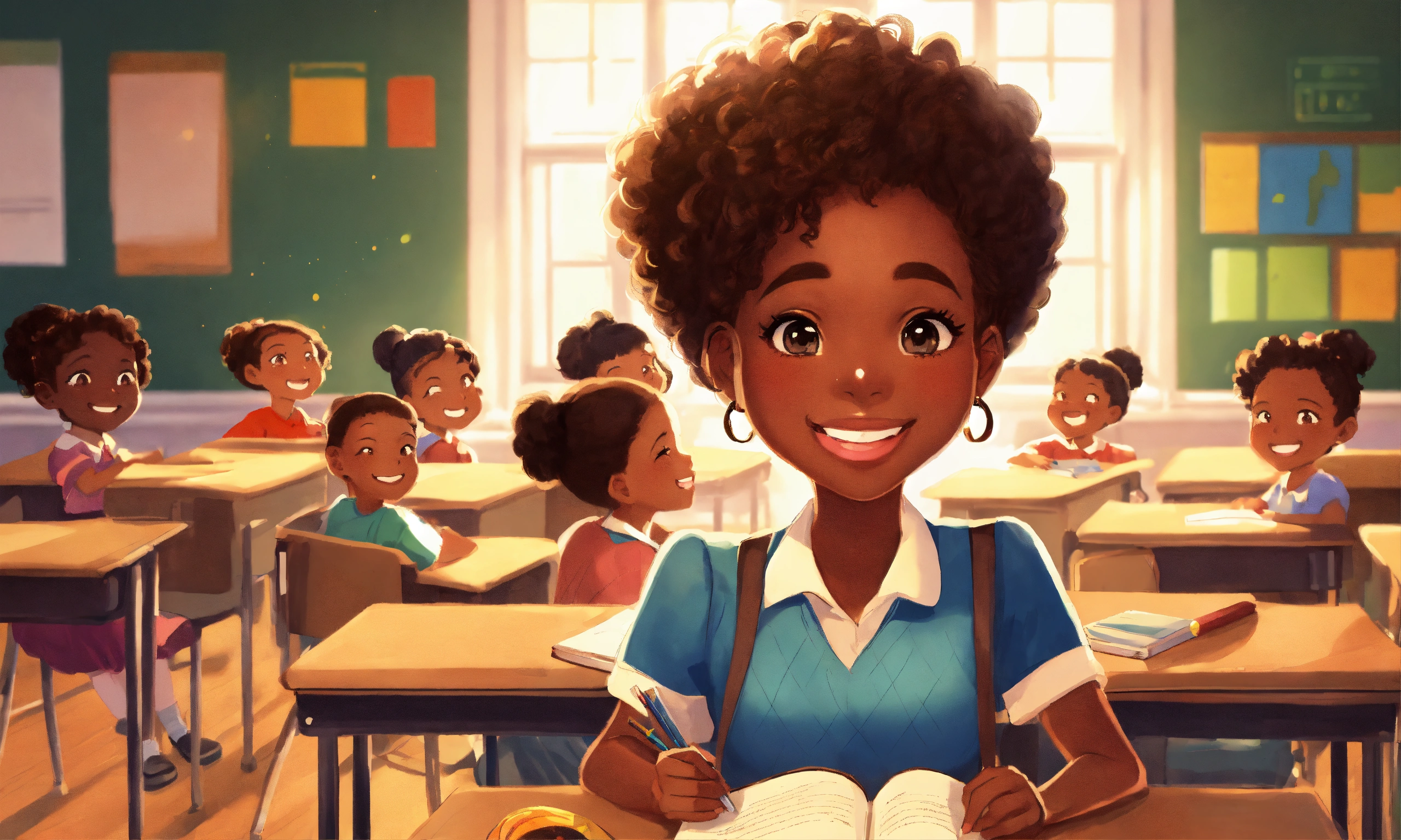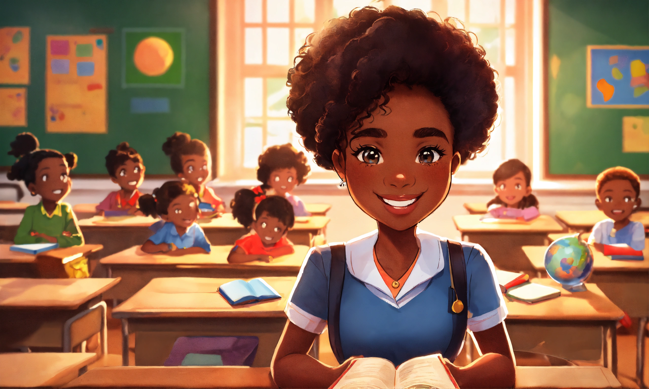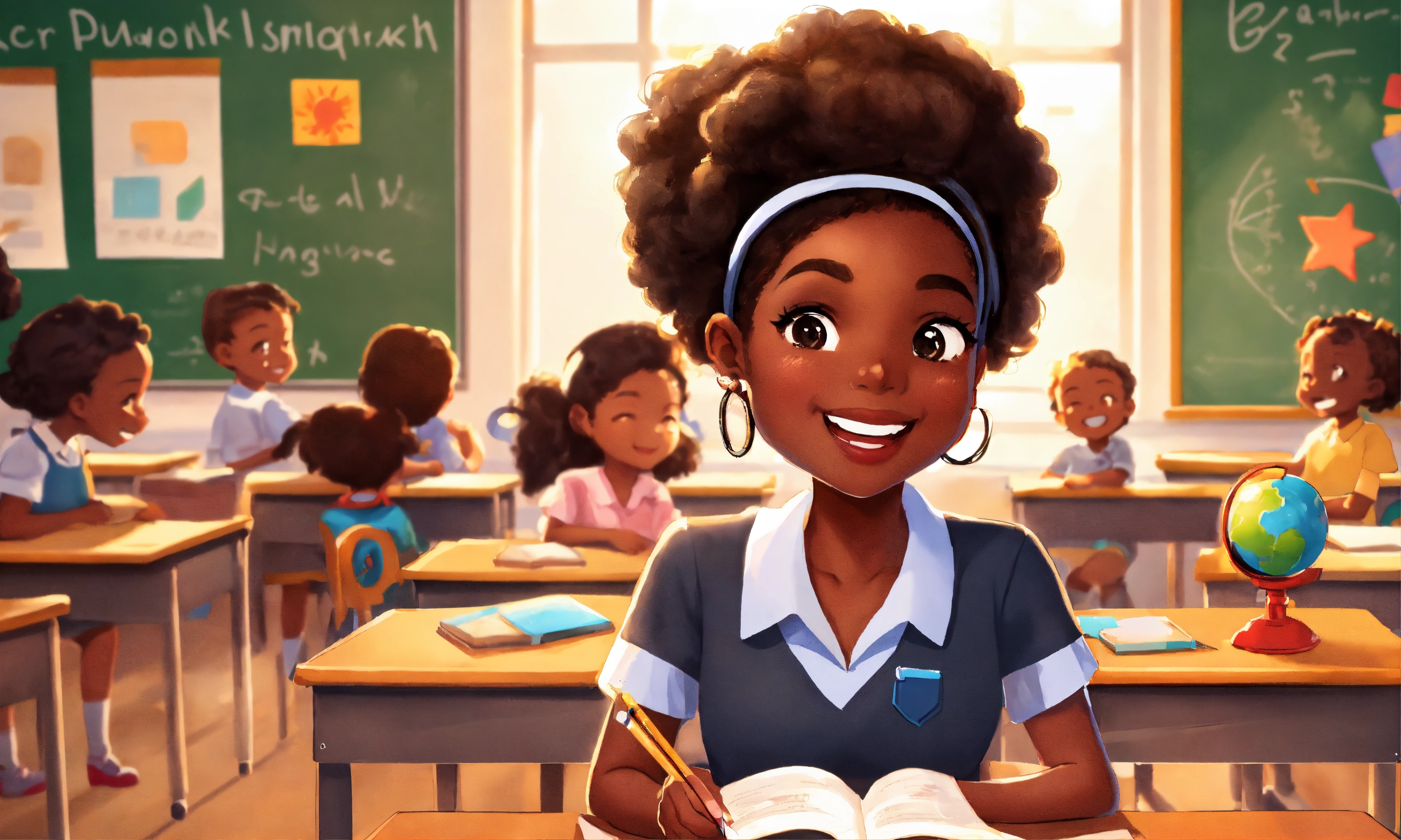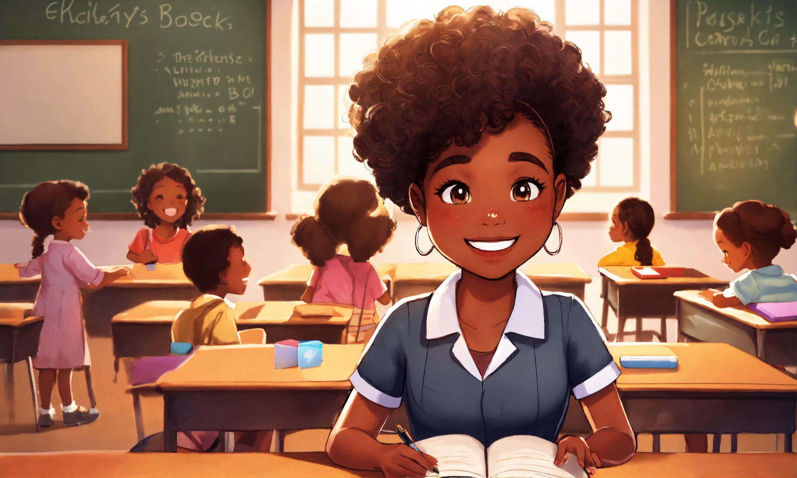 Smiling black woman, as a teacher, classroom, blackboard, award winning children's book illustration style, 2d illustration, white background, front view