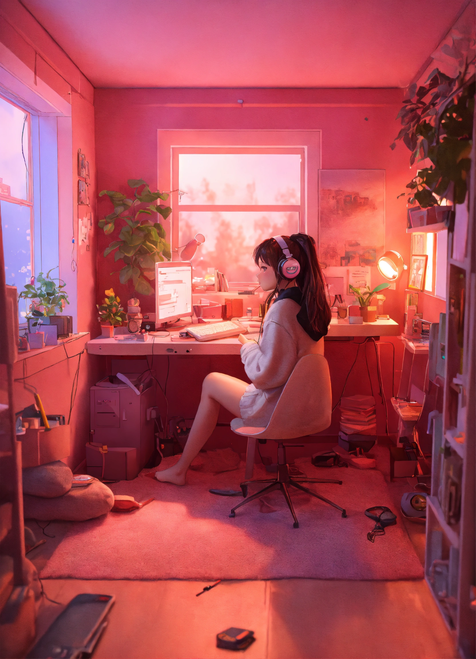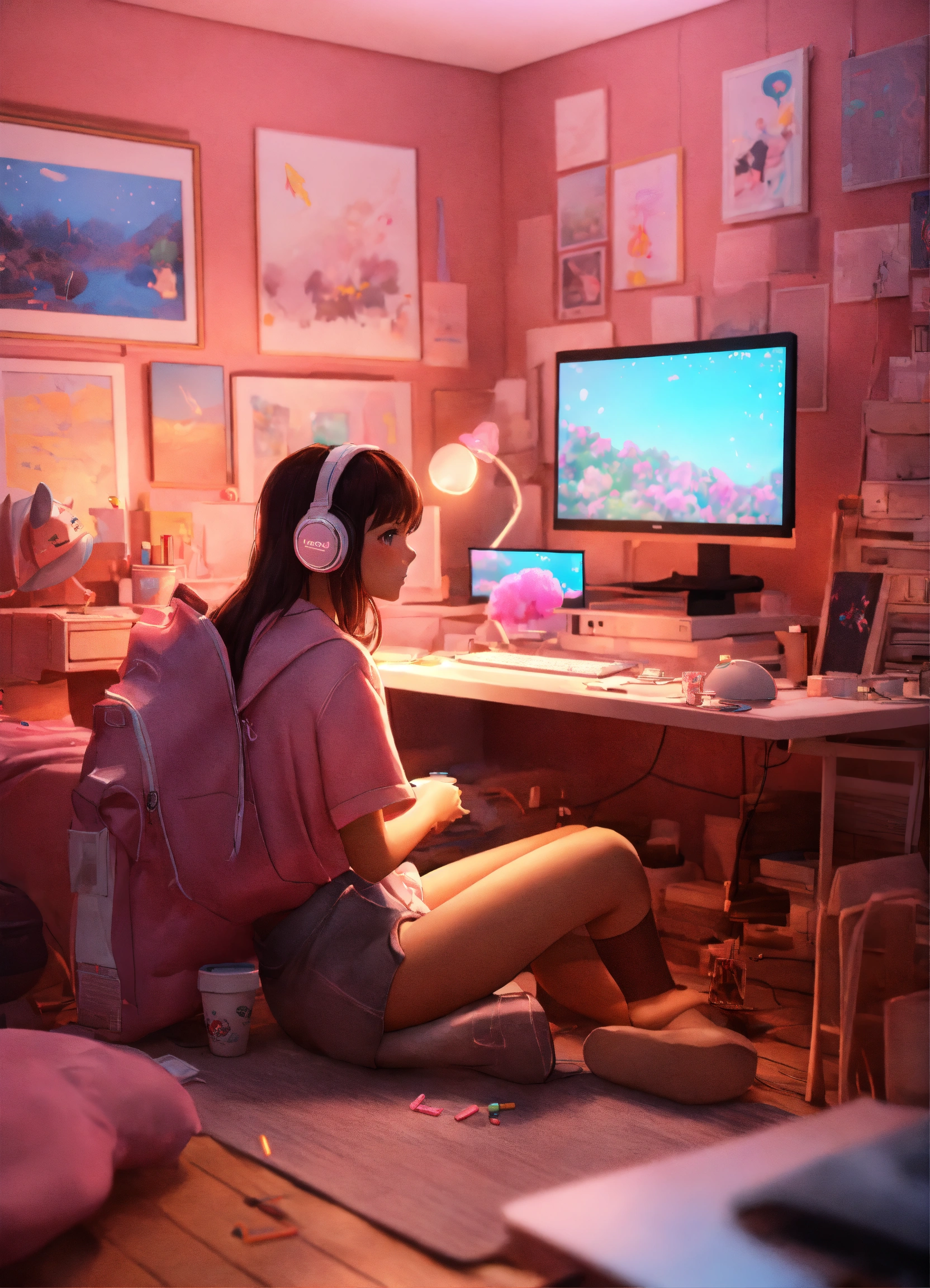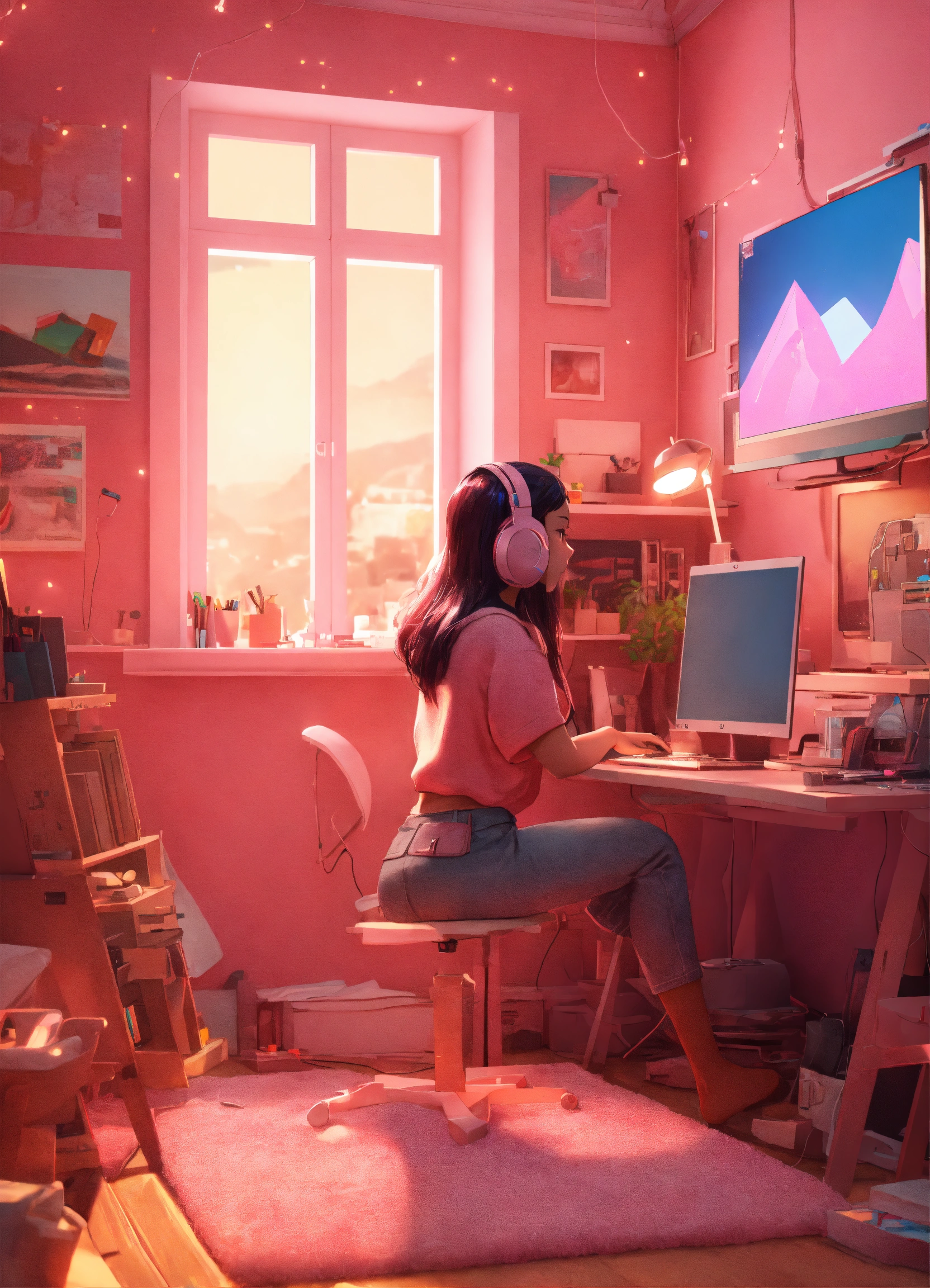 Cute lofi girl in front of his computer in her cozy and messy room, unreal engine 5 render, gorgeous lighting, pastel pink hues, 8k render, award-winning art