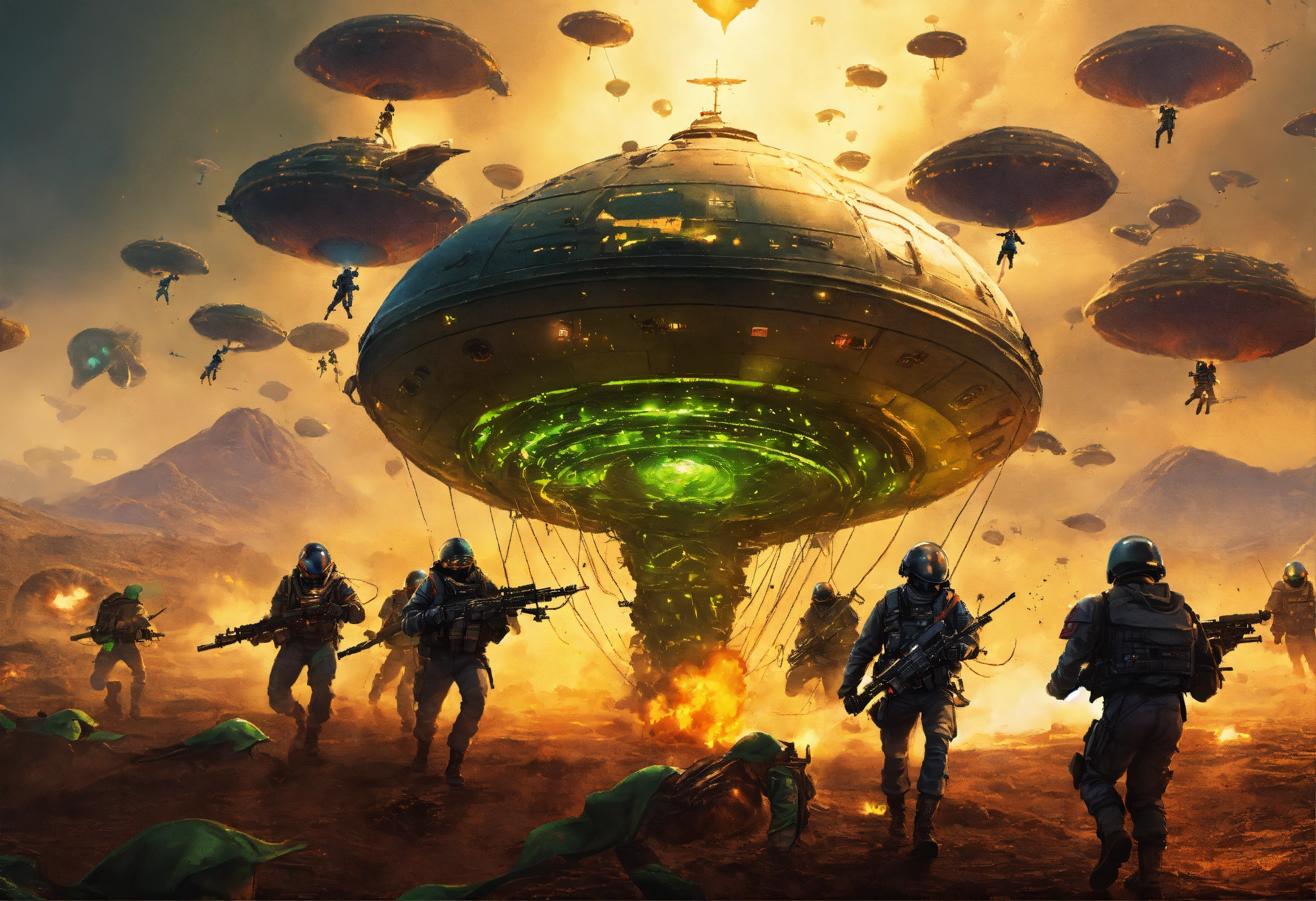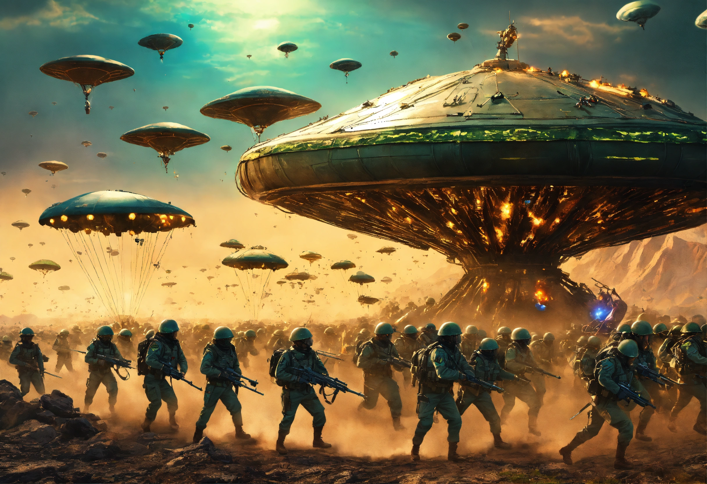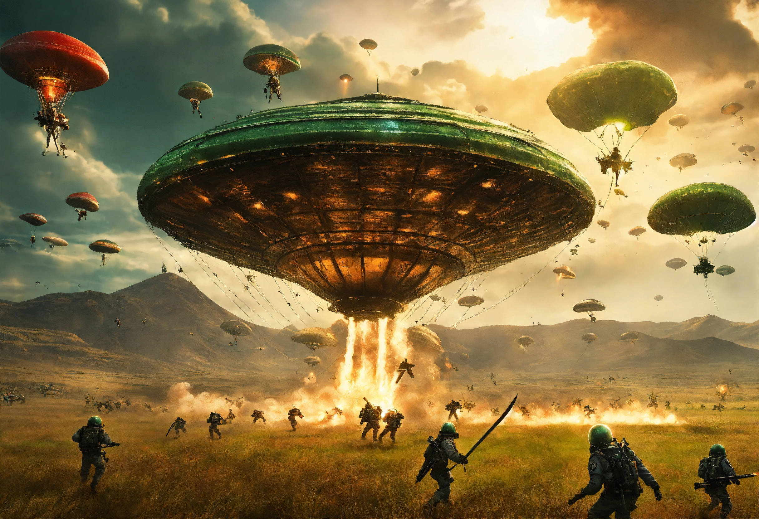 Big army of men charging at aliens attacking earth the men are carrying sword and the aliens are parachuting from their alien ship