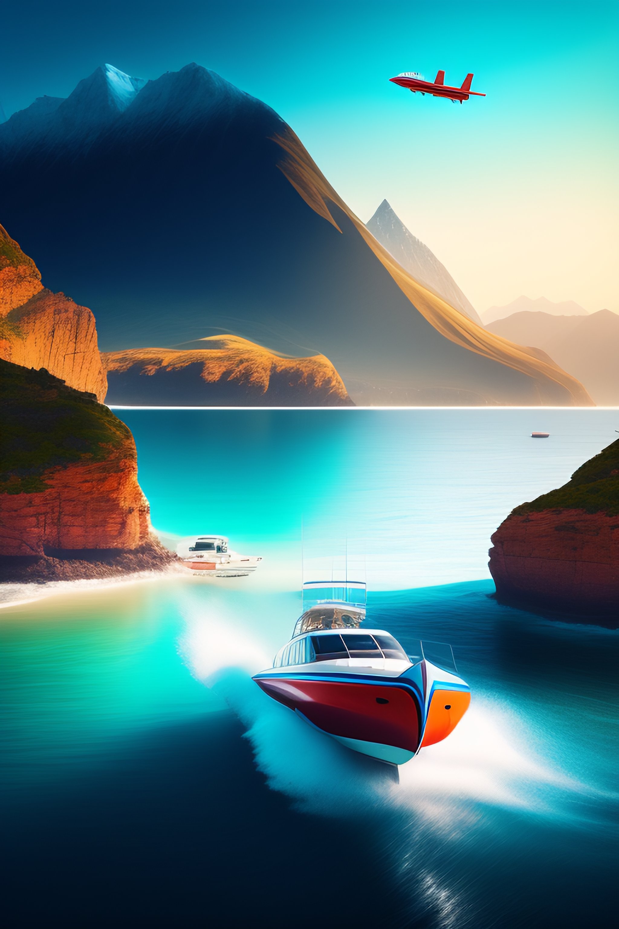 Speedboat with dogface with an airplane in the background and mountains