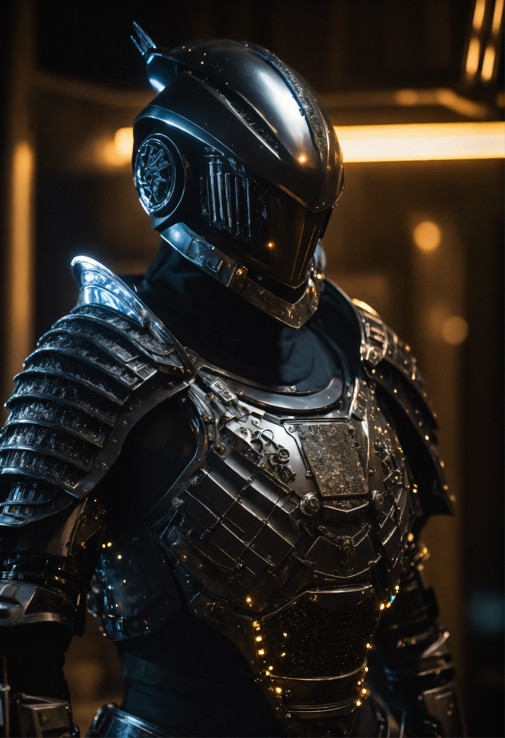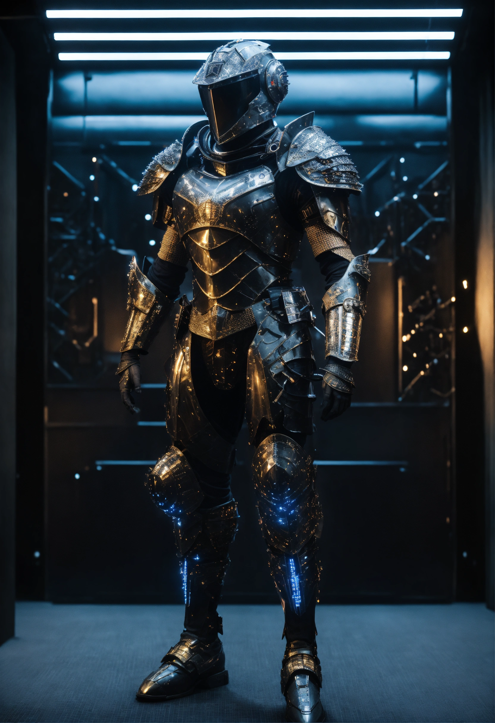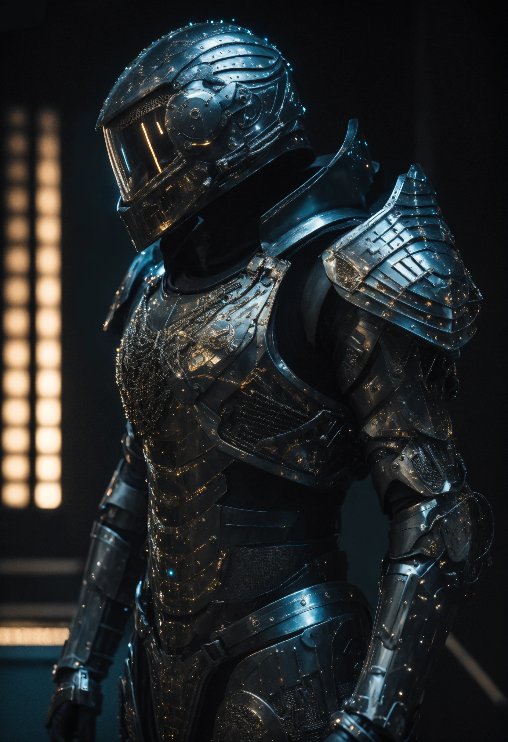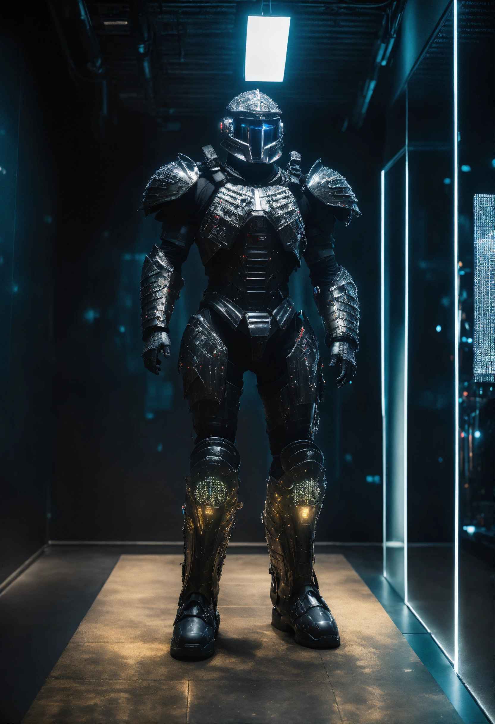 An ultrarealistic photograph of a highly detailed futuristic full body armor, made of black mate metal and polymer, full crystal hull, for a man, visible wires, imposing, elegant, dystopia, mysterious, godlike, scary, in a dark room with some lights, 8k