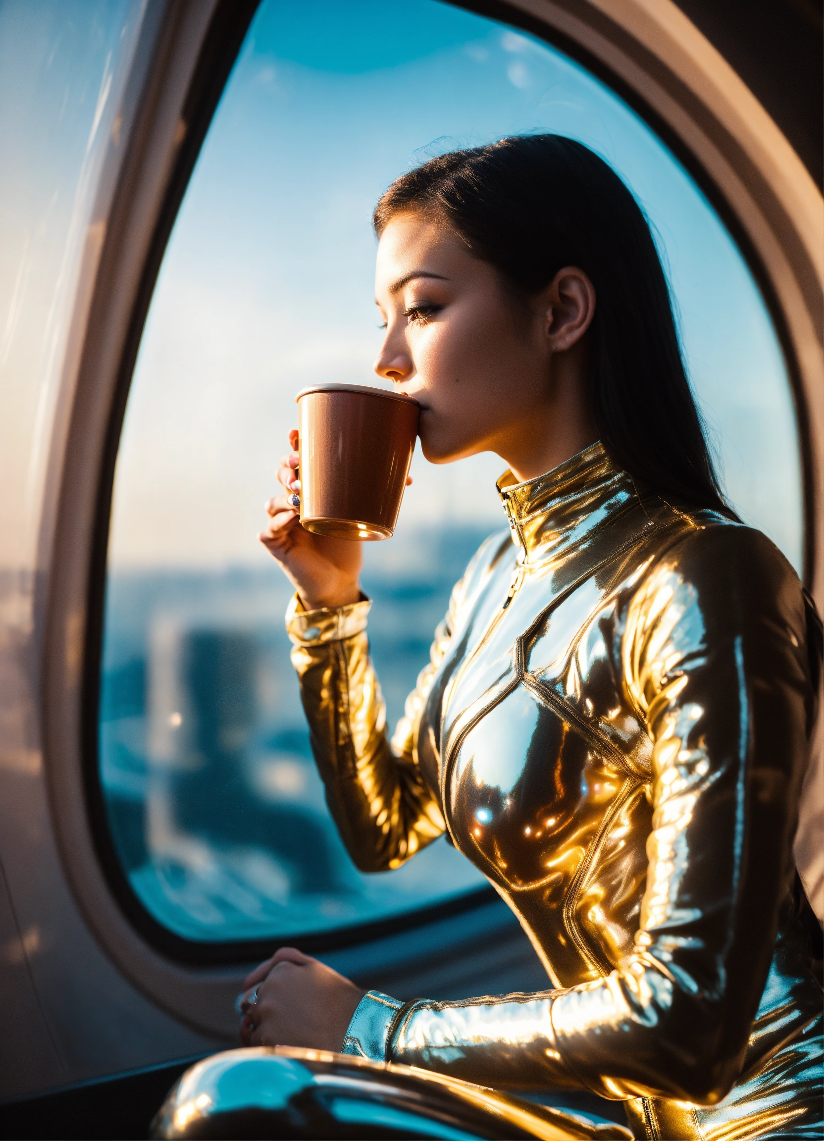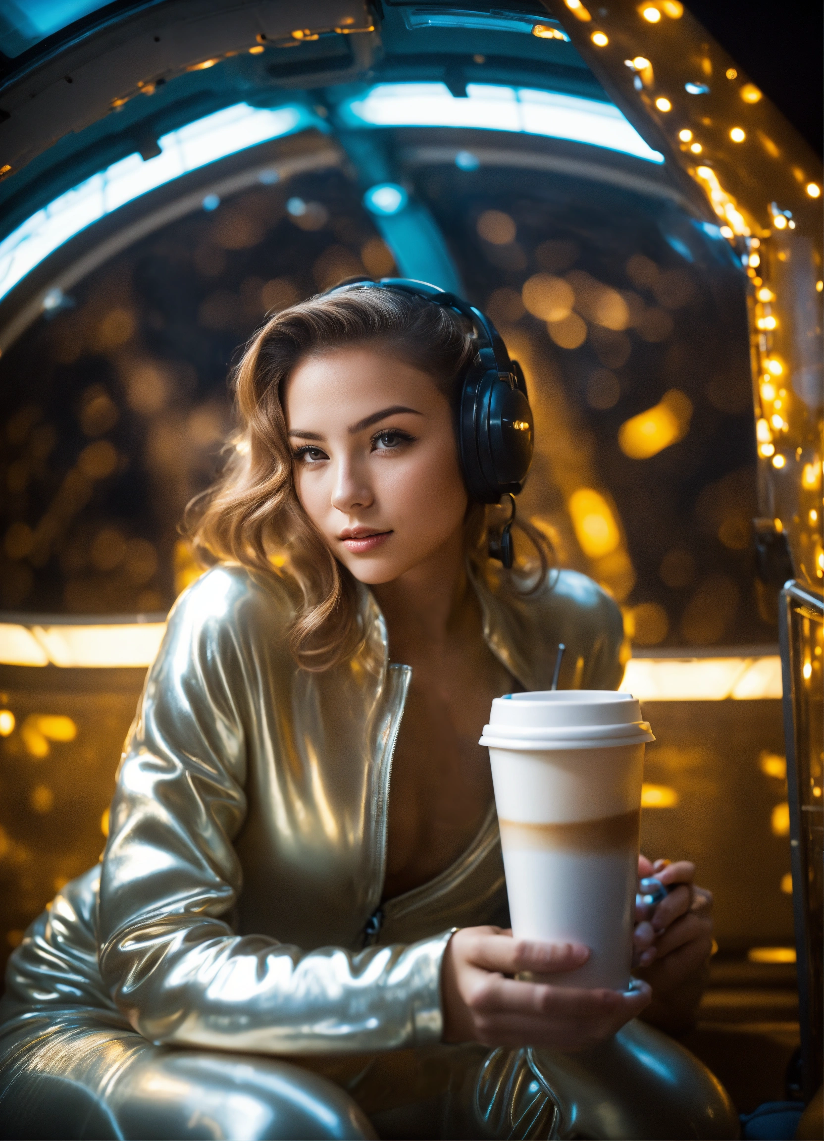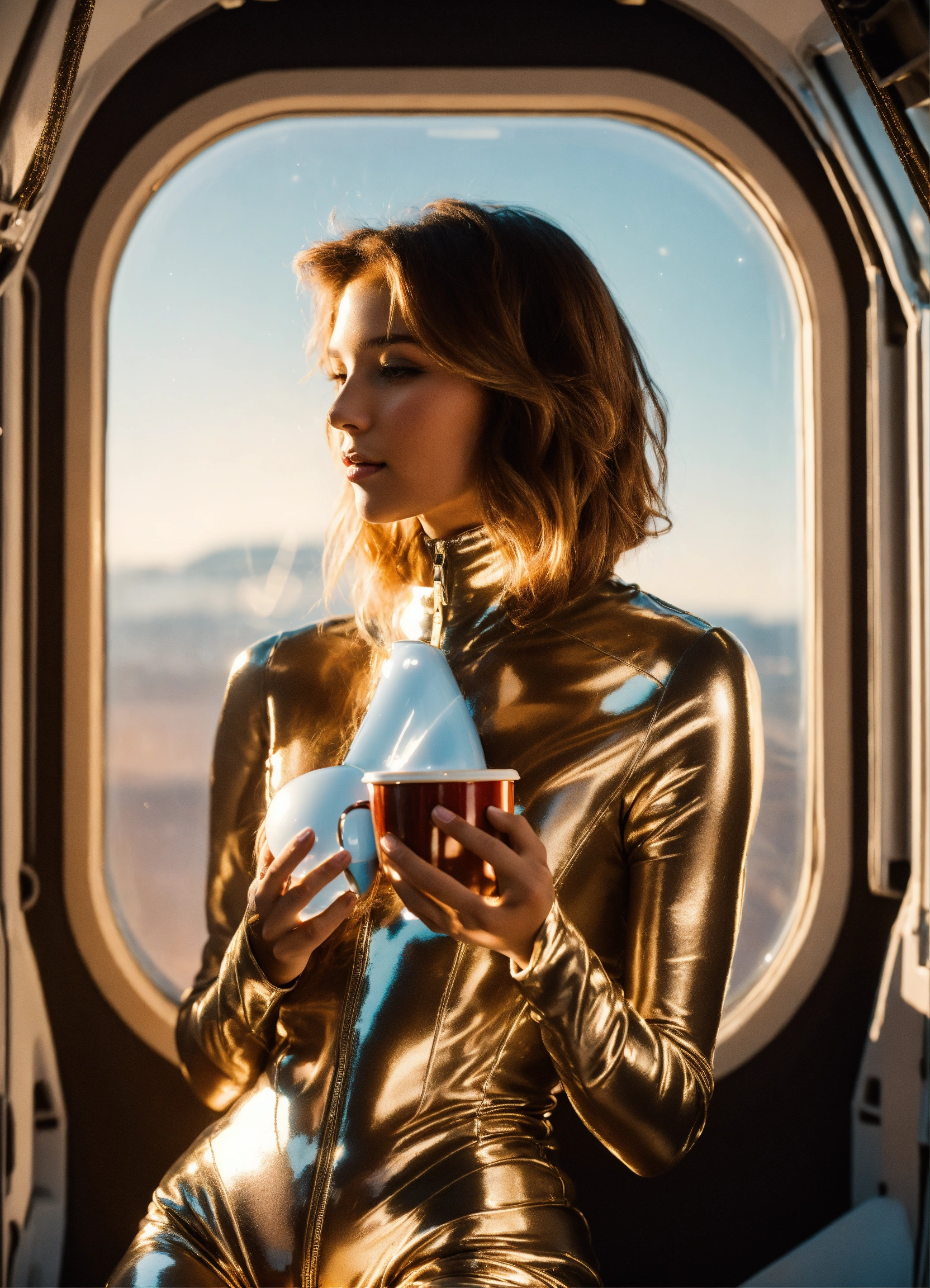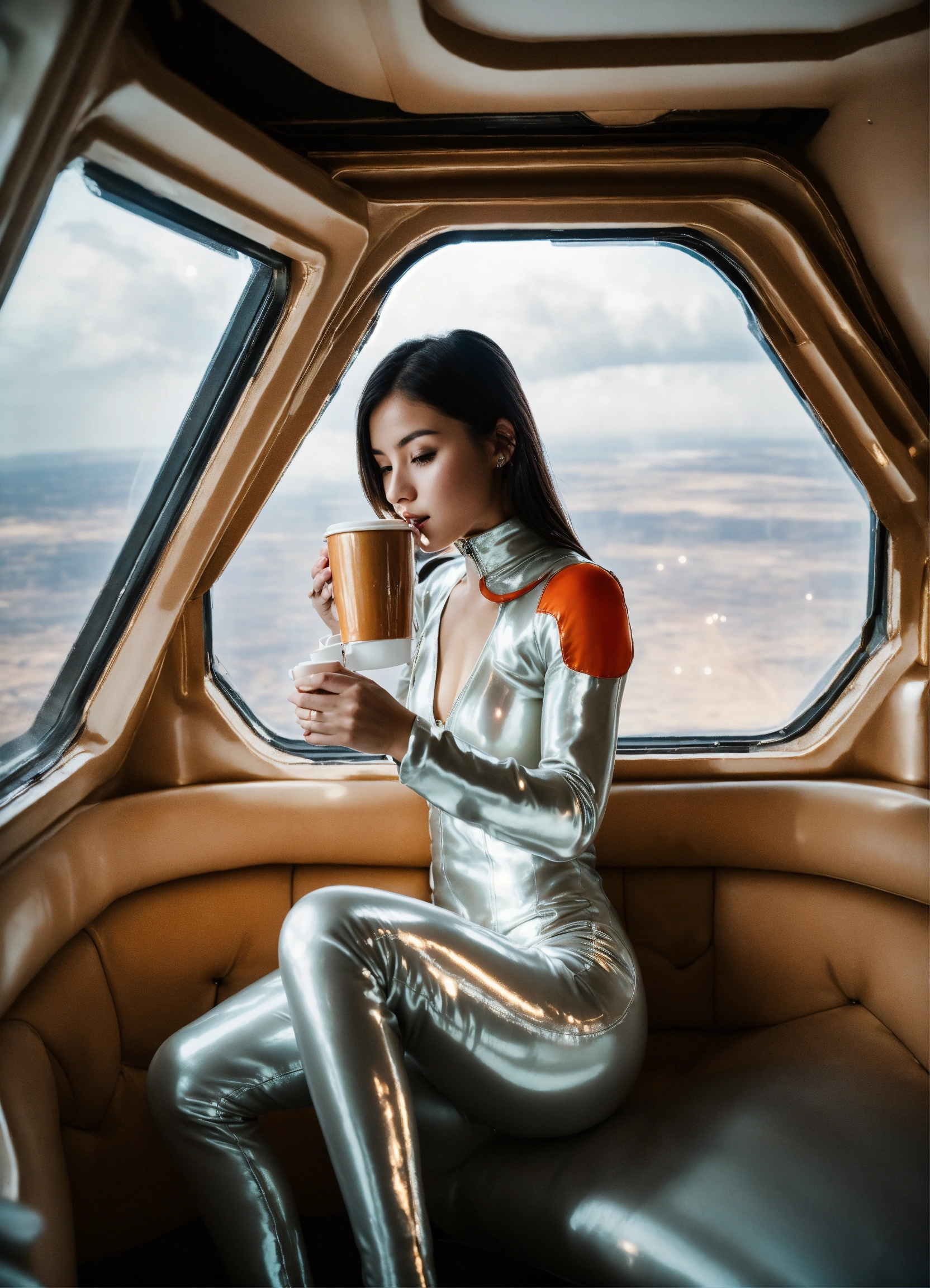 A real photo of a cute 22 year old very hot girl a light pearl silk catsuit drinking coffee, inside of a spaceship. through a window we see space.
