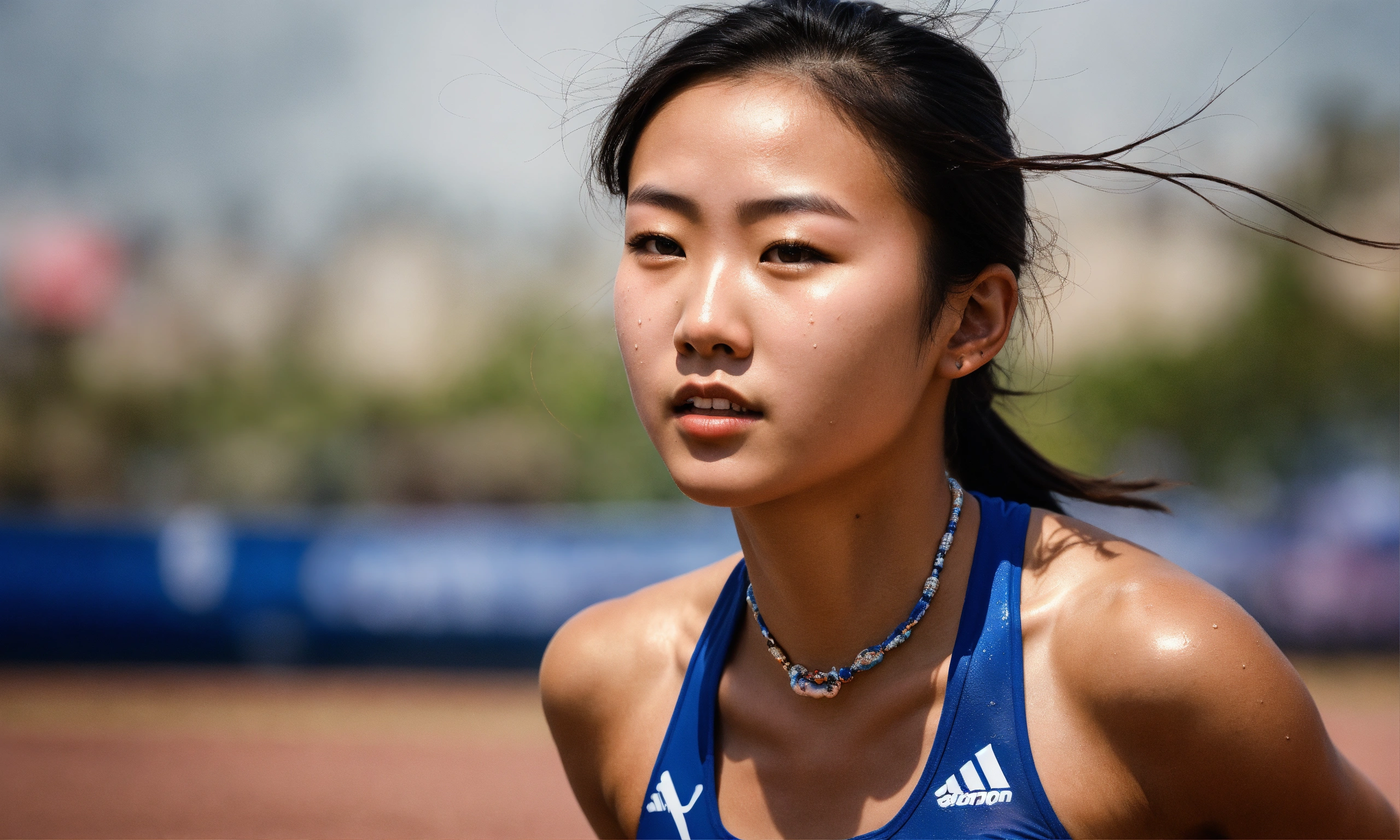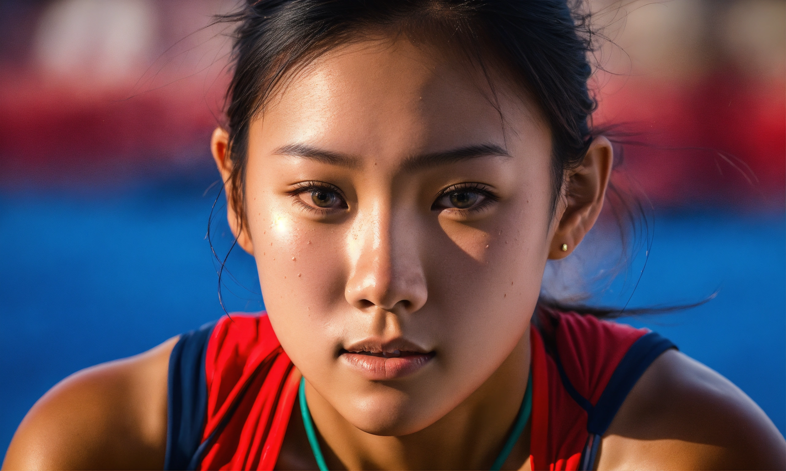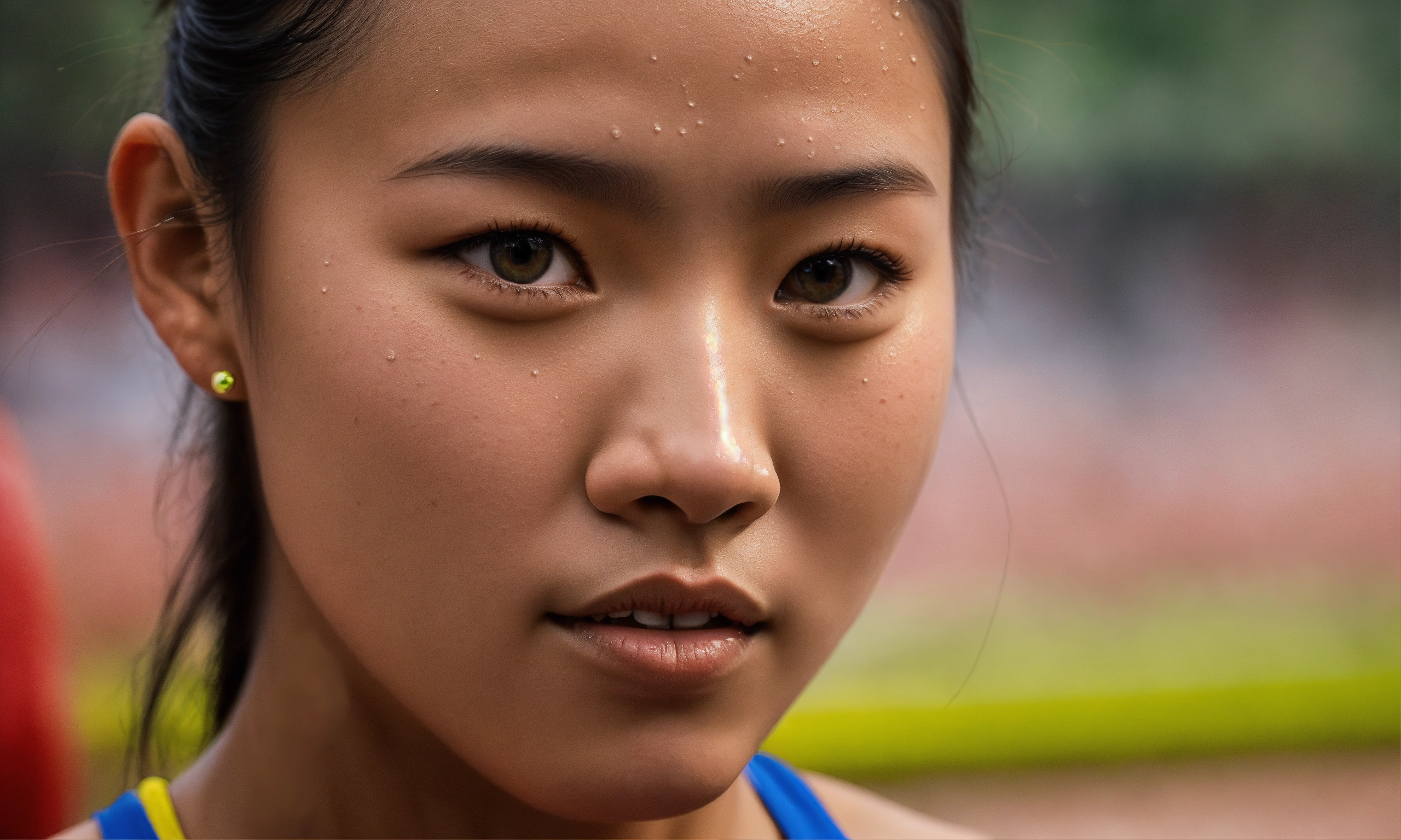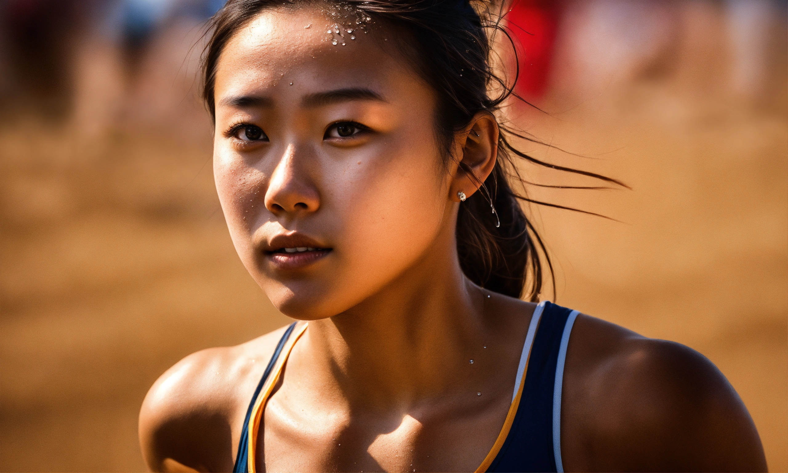 Mid-day at a world championship track event. ultra close-up frontal shot of an 18-year-old tanned and athletic chinese girl, a member of the national team, racing with unwavering determination. her bronzed, athletic skin serves as a canvas for beads of sweat, each glistening clearly under the intense mid-day sun, symbolizing her effort and dedication. her eyes, locked onto the camera, radiate ambition, resilience, and a deep focus. captured with a nikon d850, 85mm f/1.4 lens, the ultra-shallow depth of field ensures every droplet of sweat is in sharp focus while slightly blurring the distant backdrop. the photograph is given a touch of watercolor rendering for added depth, making her the undeniable centerpiece of the image.