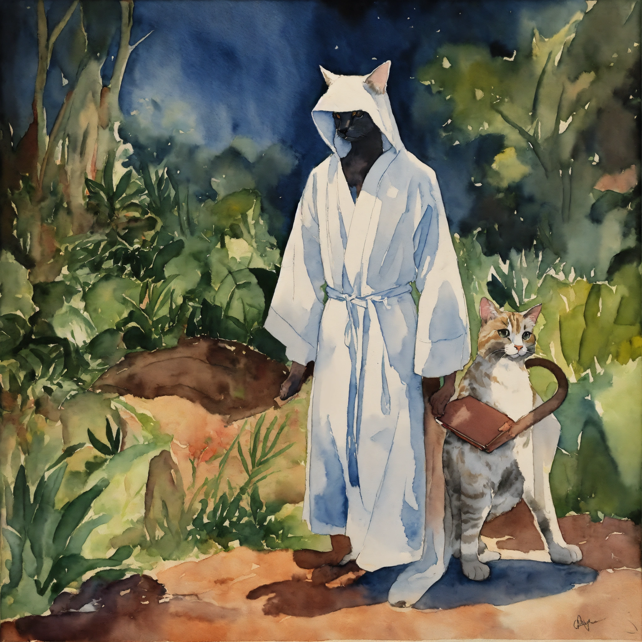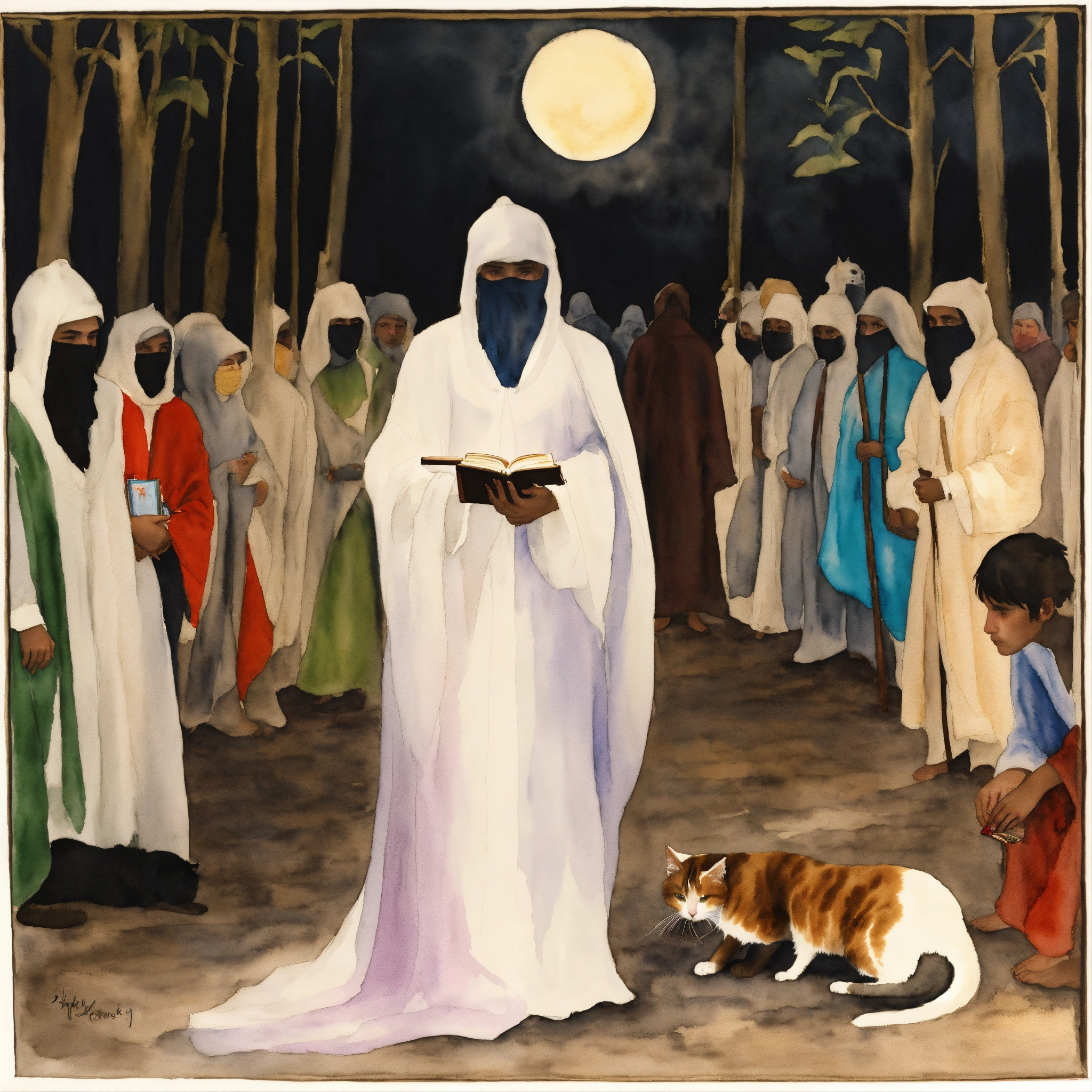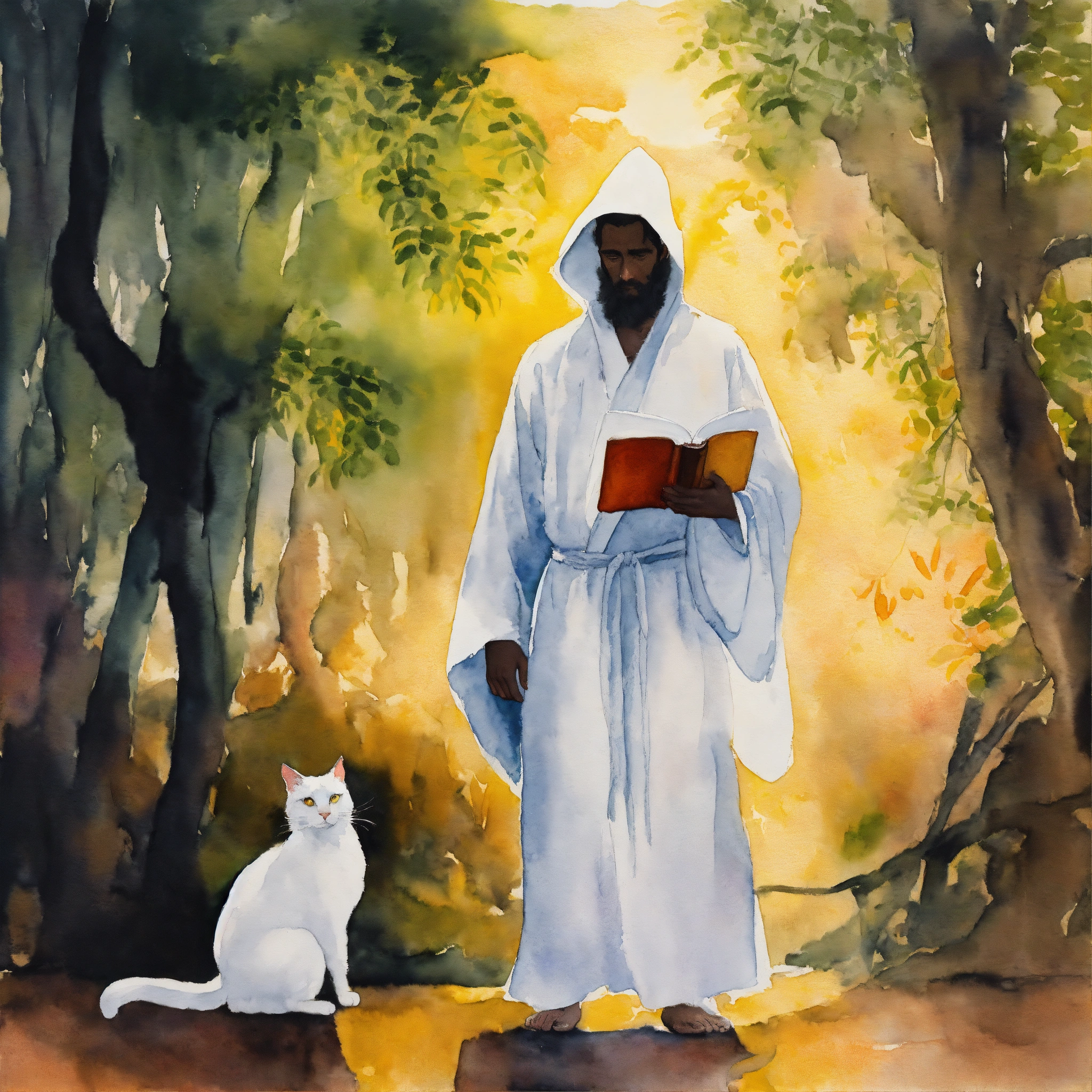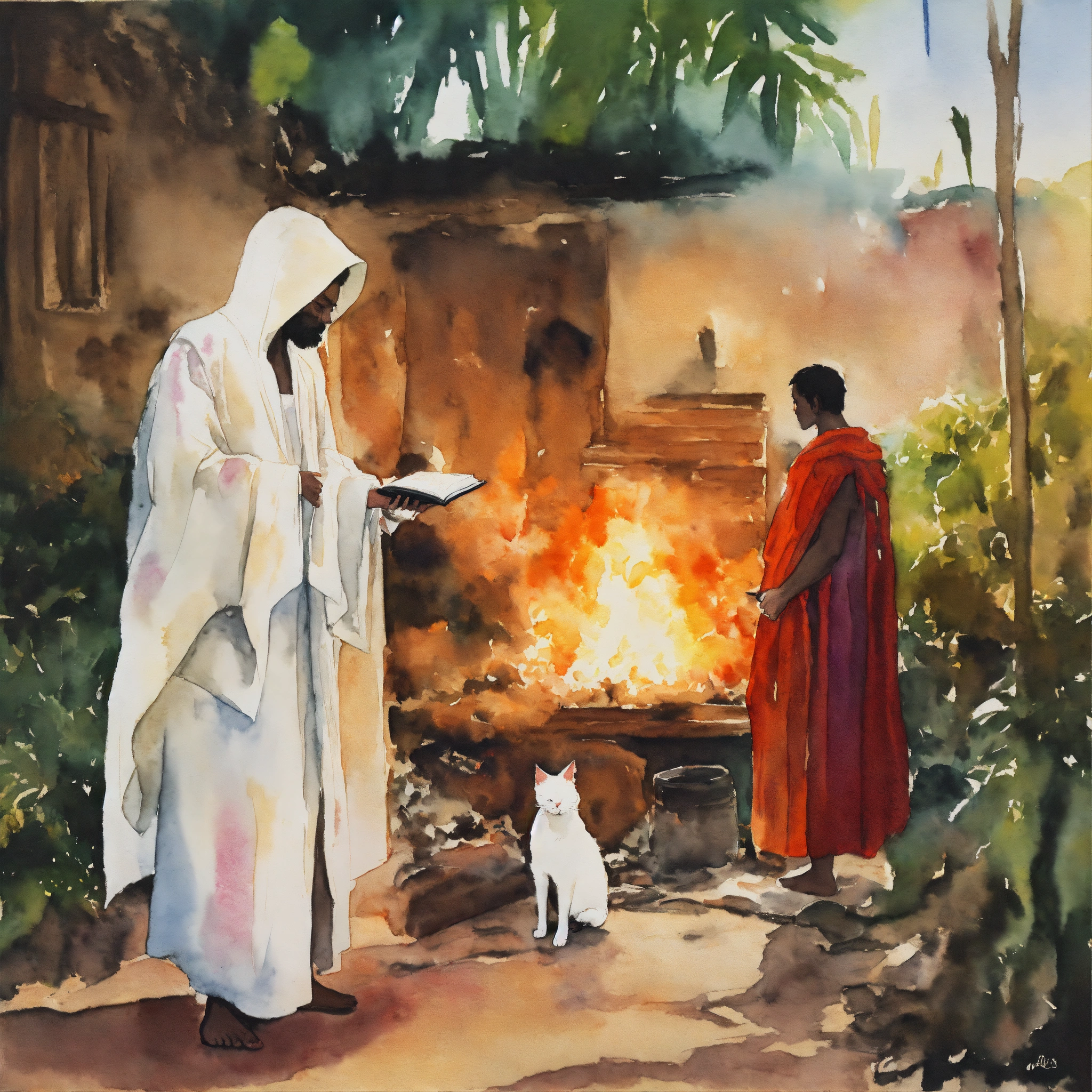 Watercolor painting, simple, basic, soft glow, blur, simple colors, amateur watercolor, watercolor on canvas, bad art, high school art, vivid colors, bright colors, cat standing in white robes, cat holding a book and wearing silk white robes, white cat wearing white robes, humanoid cat face man with silk white robes standing centered, white cat with human body wearing silk robes of white, rainforest, jungle plants, huge crowd of medieval serfs, black smoke, deforestation, sad human faces, patched clothing, refugees, poverty, fist fight, hands out, grabbing, starving, weak, emaciated, horde, large group, faces of peasants, peasant faces, arguing, fighting, greedy, grubby, grimy