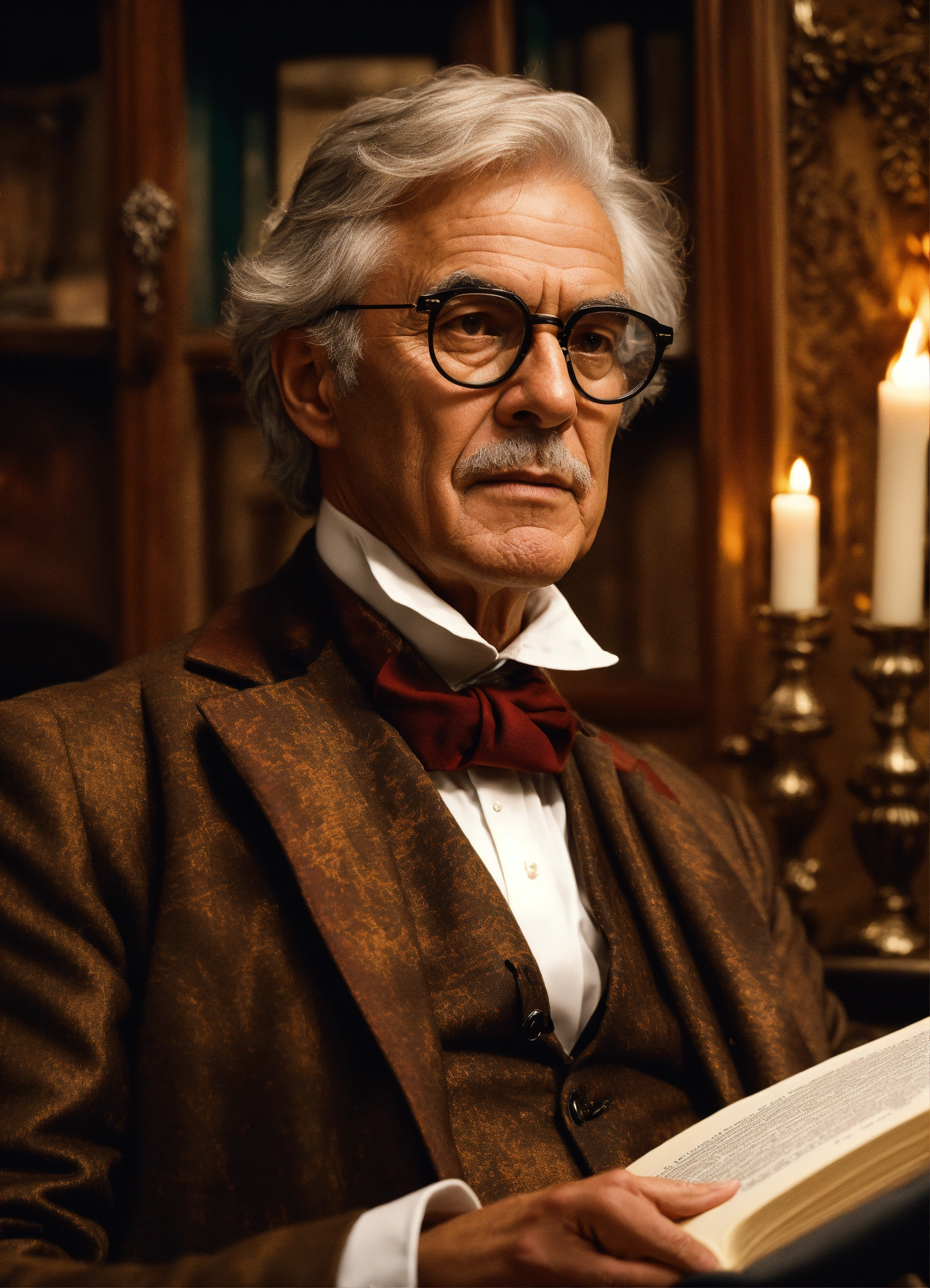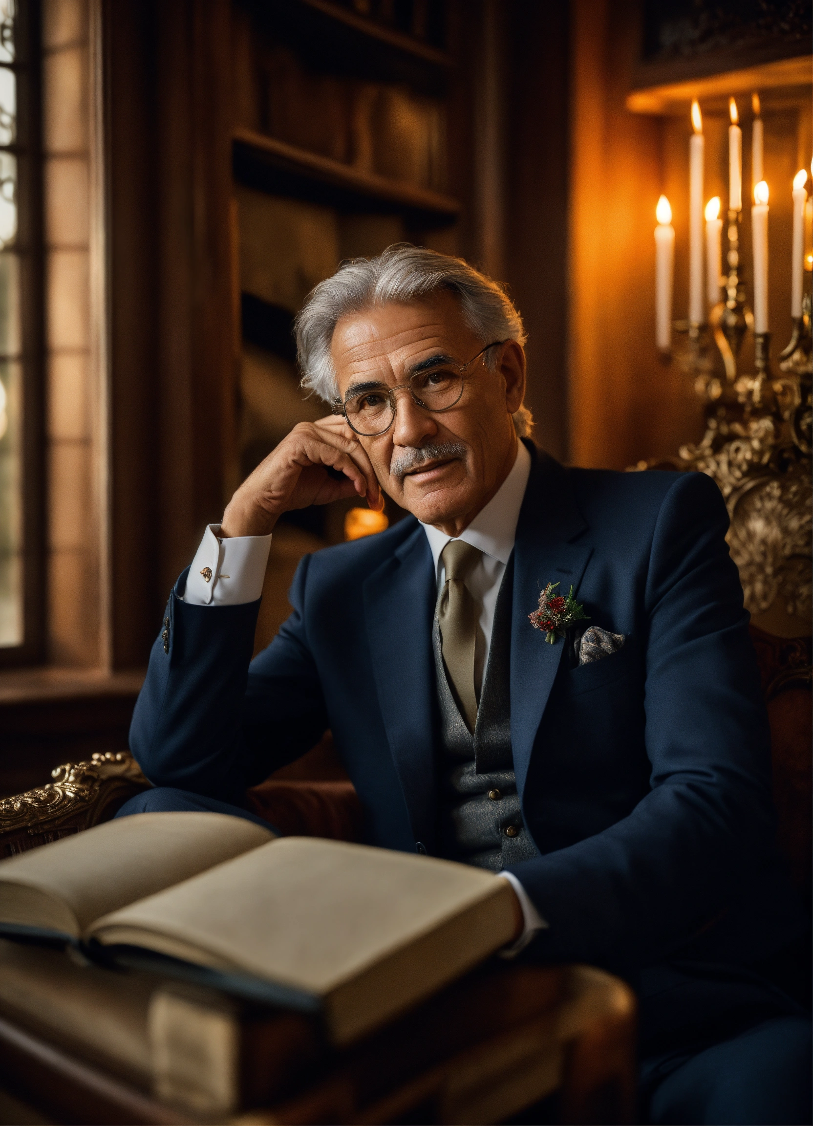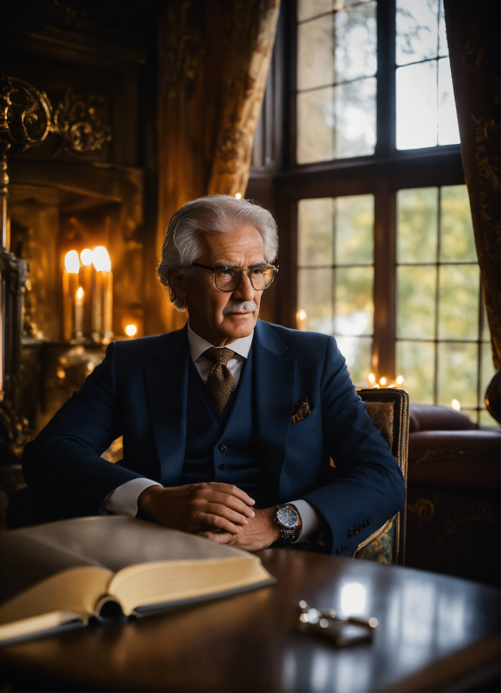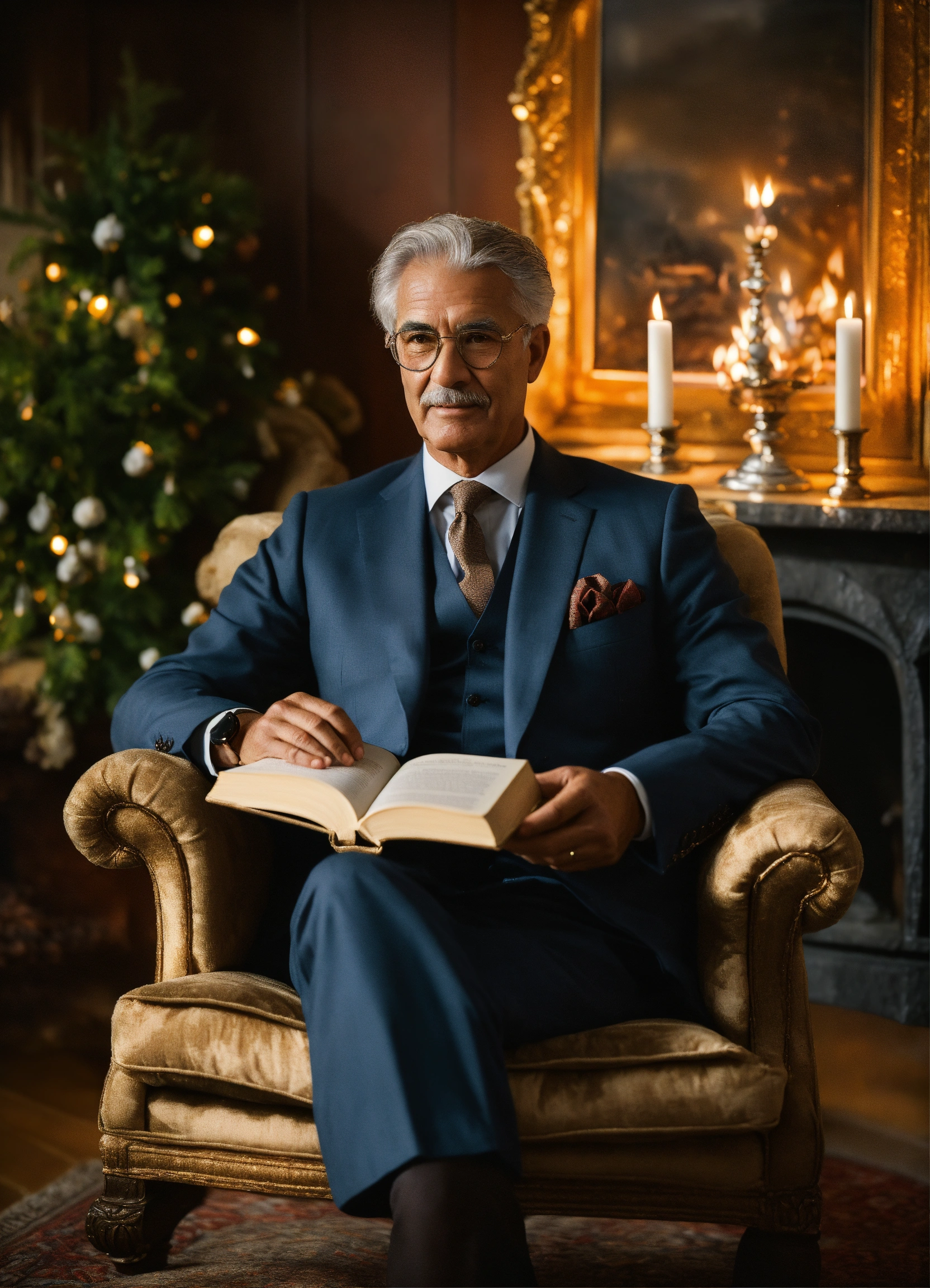 In a heavenly setting, a warm atmosphere reigns around a crackling fireplace, gently illuminating the room with a comforting glow. we see a close-up of the bust of a businessman aged around 65, dressed in an elegant three-piece suit, comfortably seated in an armchair near the fireplace. his face, with silver hair, is reminiscent of the professor in casa de papel, evoking a wisdom accumulated over the years. he wears transparent glasses with a black rim, adding to his air of wisdom. he holds a book in his hand, looking at it attentively. behind him, a bay window offers a view of an enchanting winter landscape. the winter sun caresses his confident face, while an elegant watch adorns his wrist, symbolising the precious time he has invested in reaching the summit. an aura of success and confidence emanates from him, an undisputed icon of accomplished entrepreneurship, ready to guide those who aspire to follow in his footsteps towards a bright future.