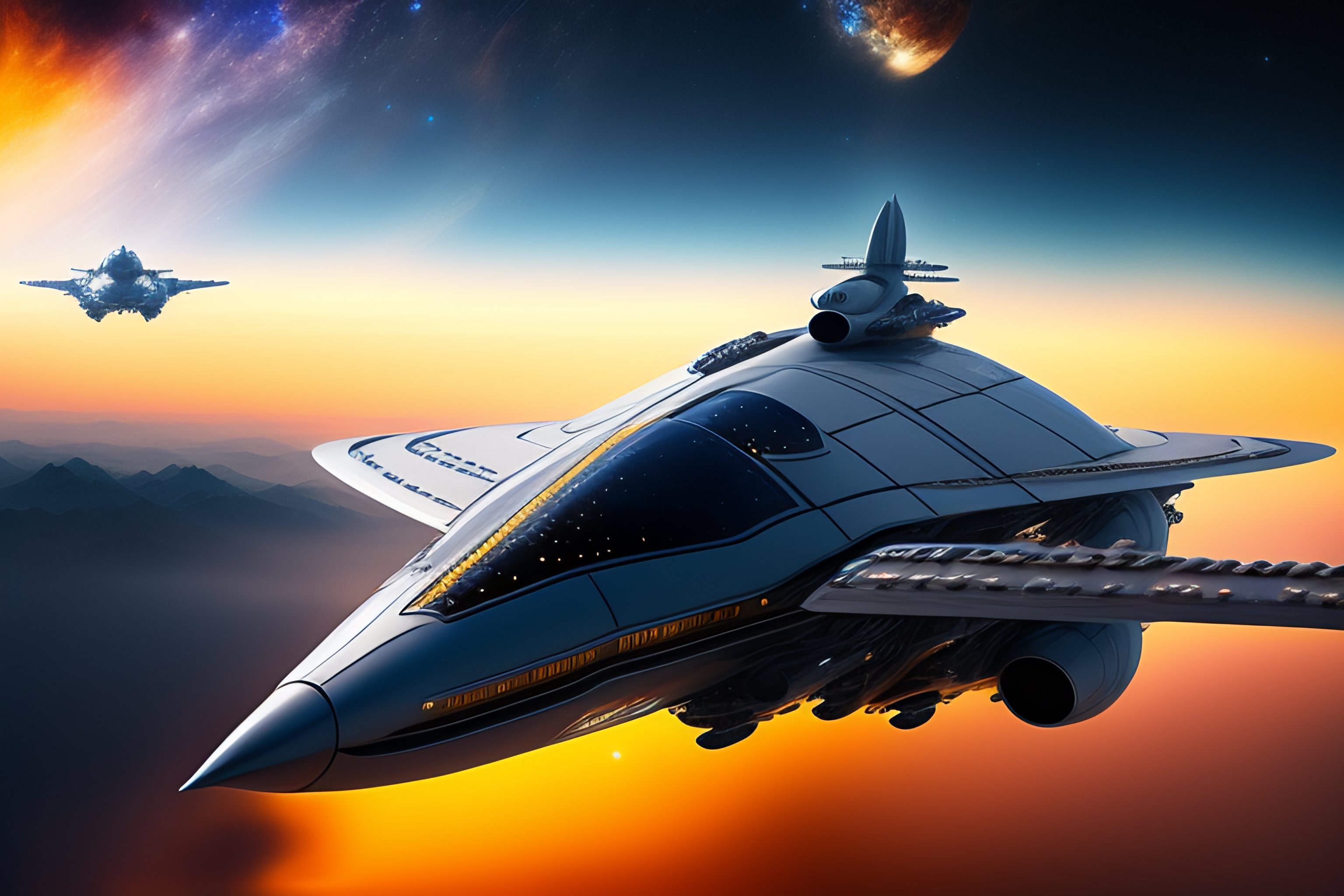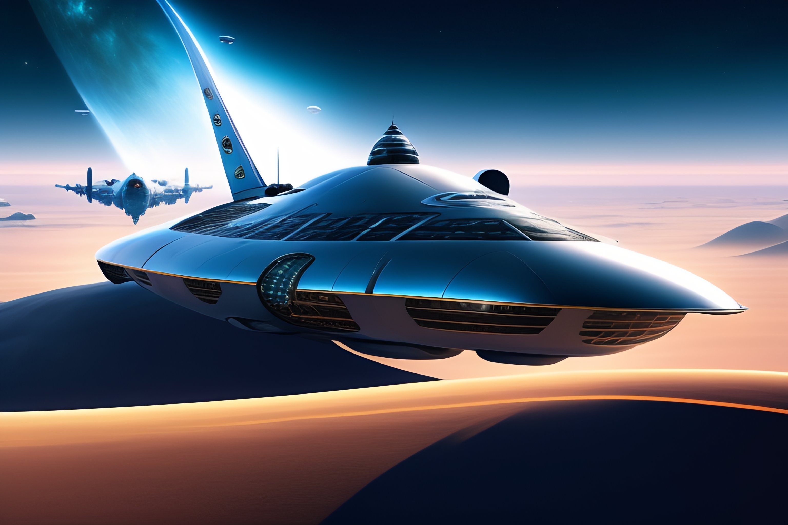 Shell-shaped silver spaceship fighting hundreds of enemy spaceships in the blue sky