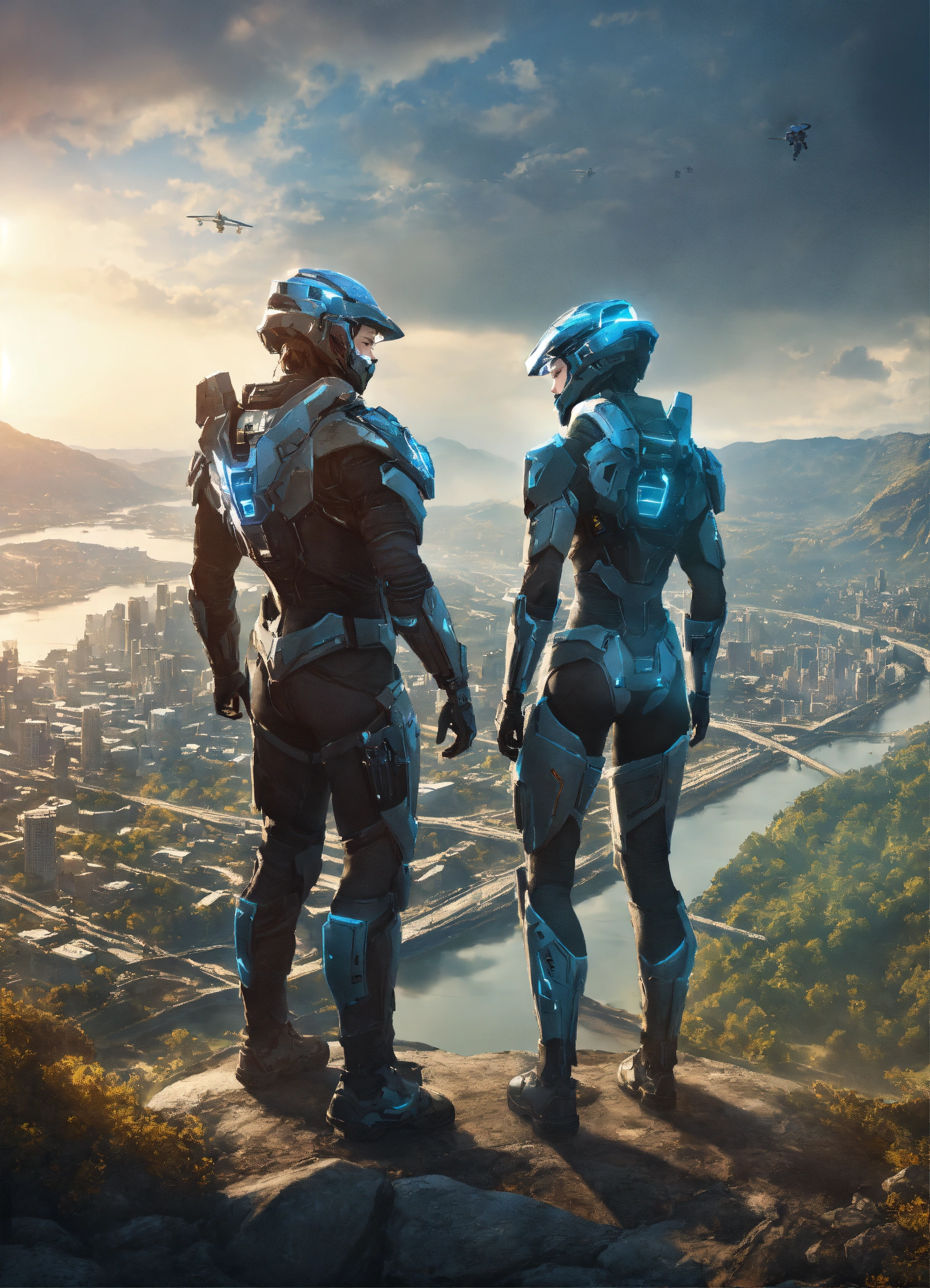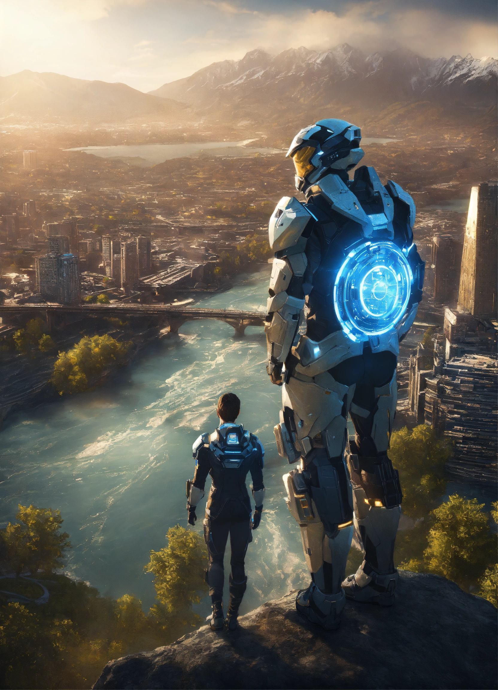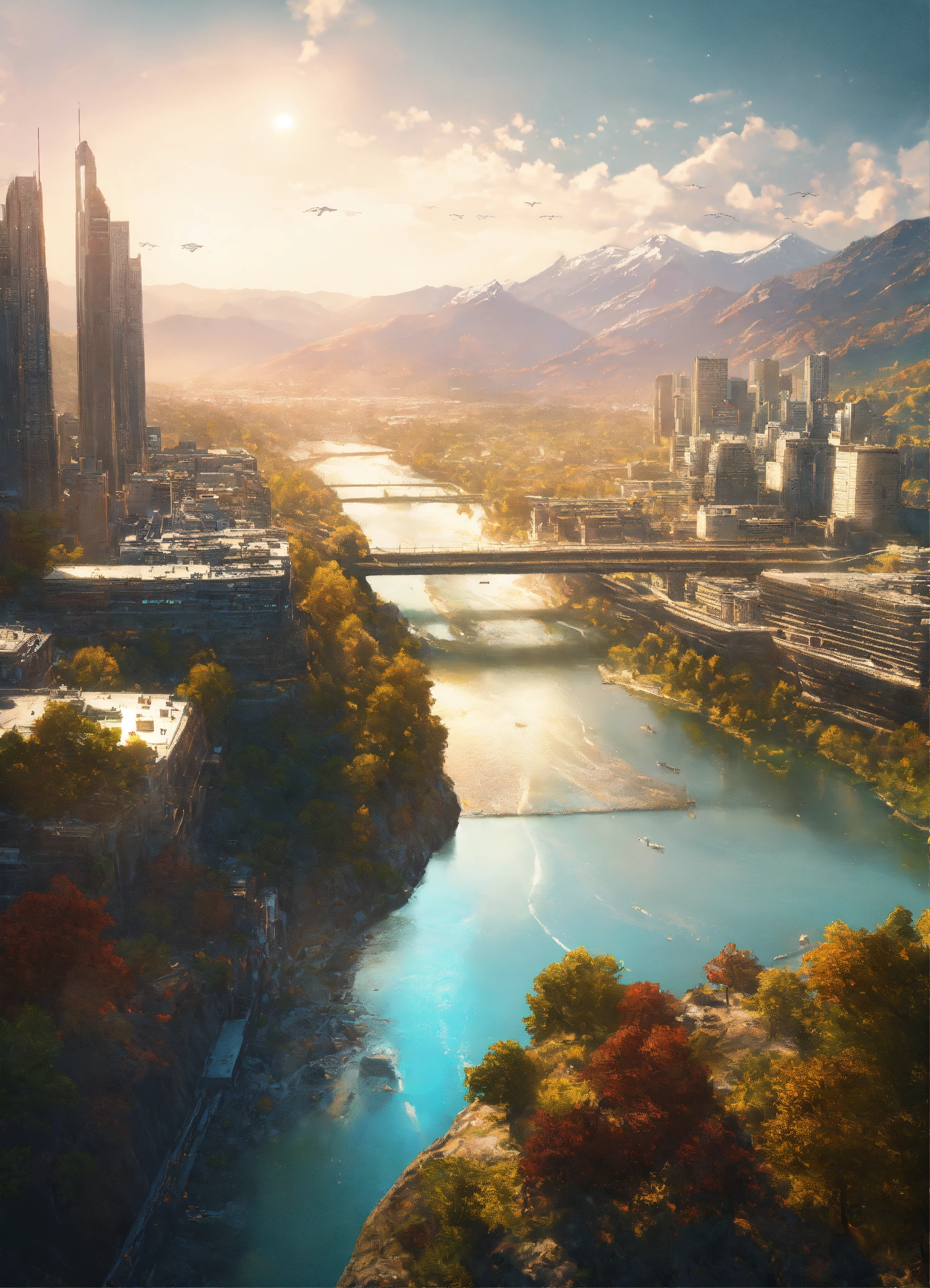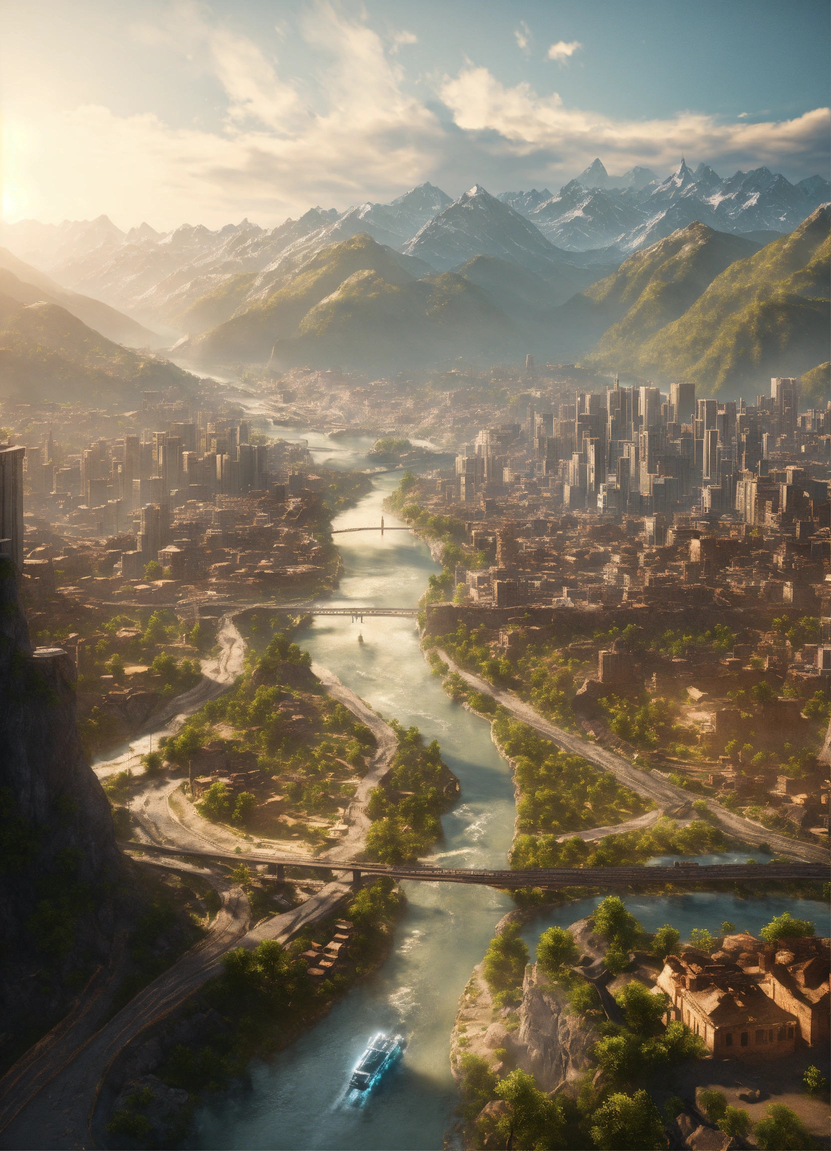 A cgi, highly detailed portrait of two figures. 1000 x 1600 pixels, 300 resolution. aerial view over a year 2100 city with a river running through it in the mountains in the background. it's daylight. halo video game feel