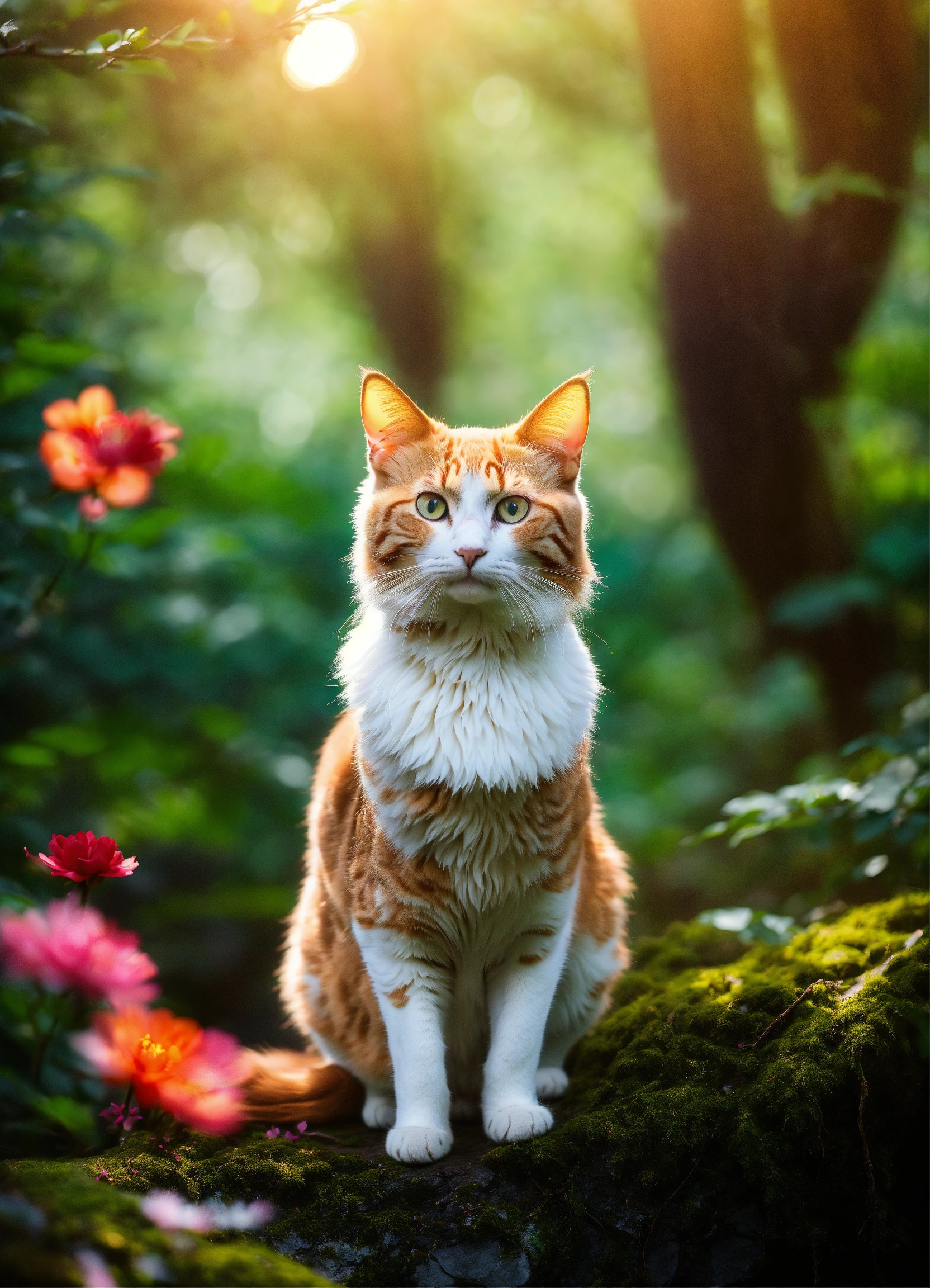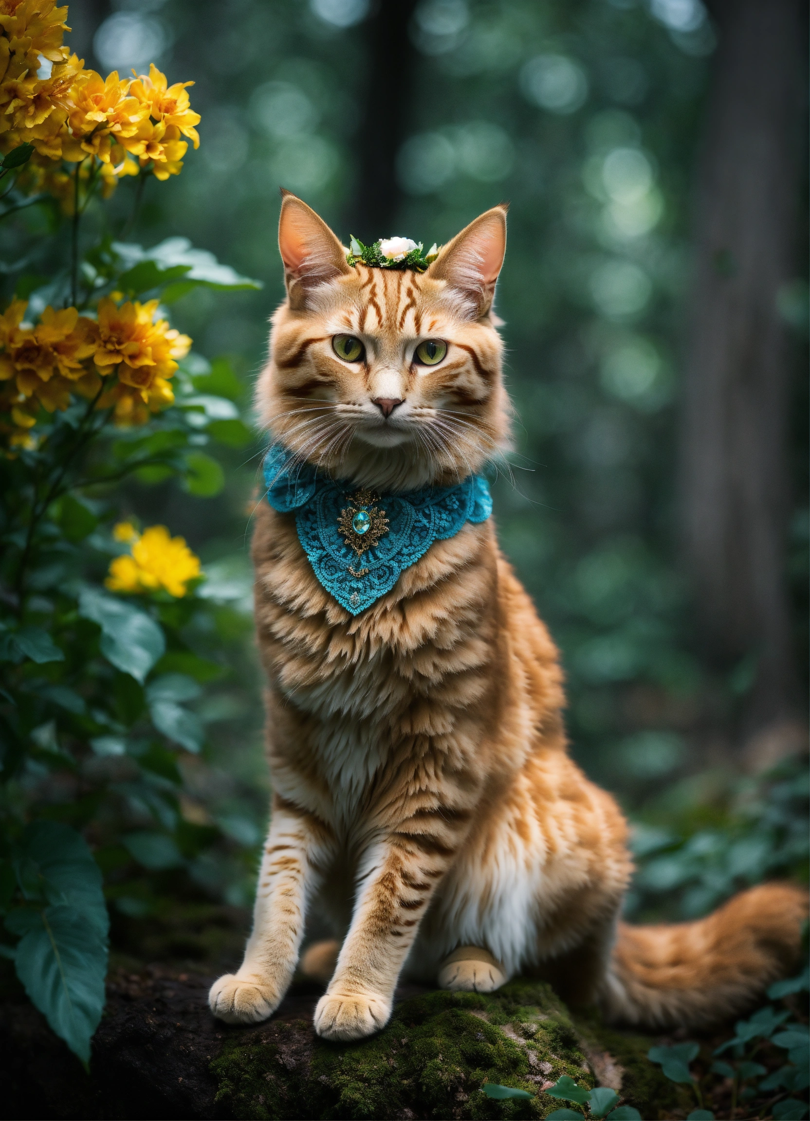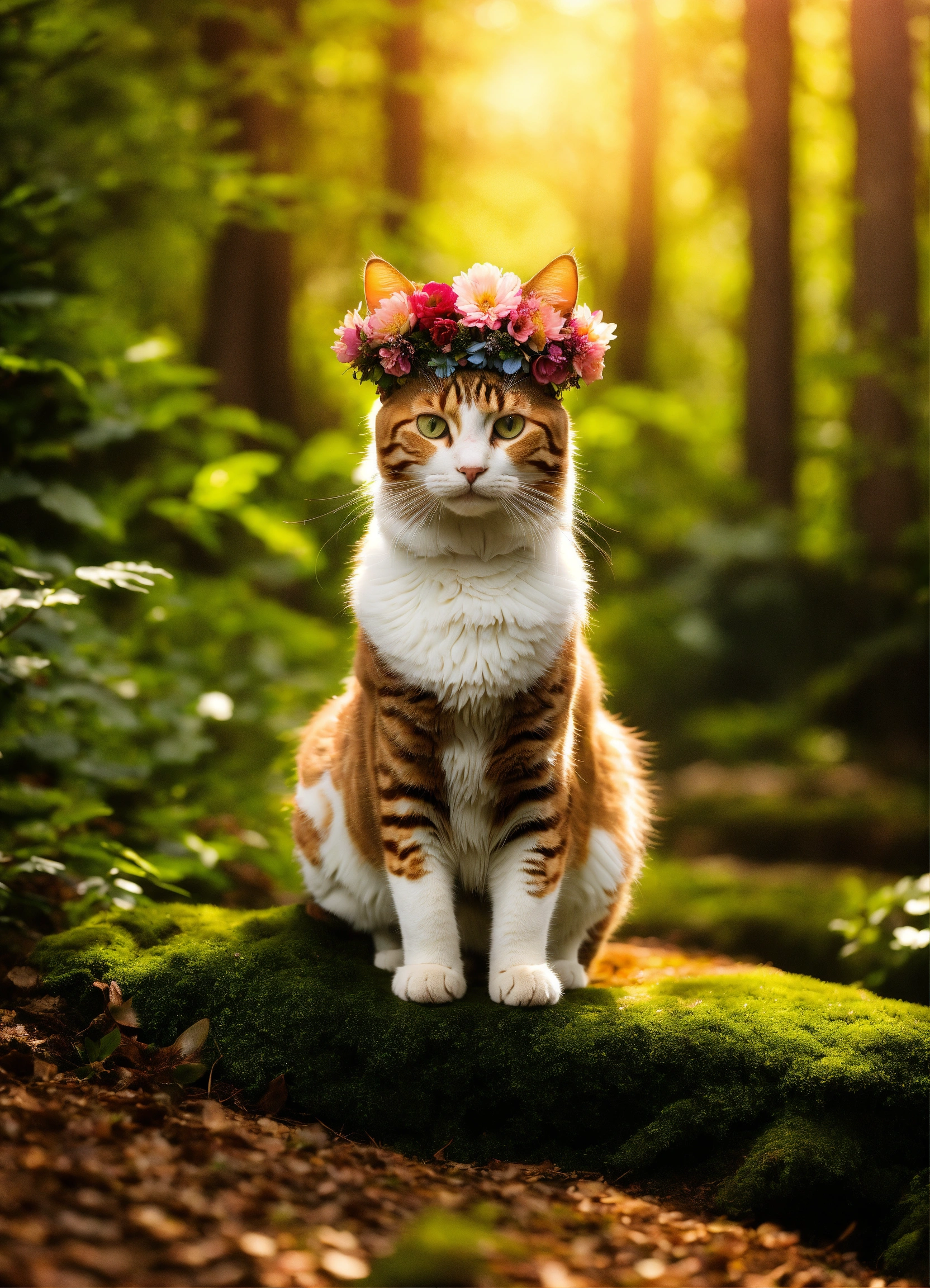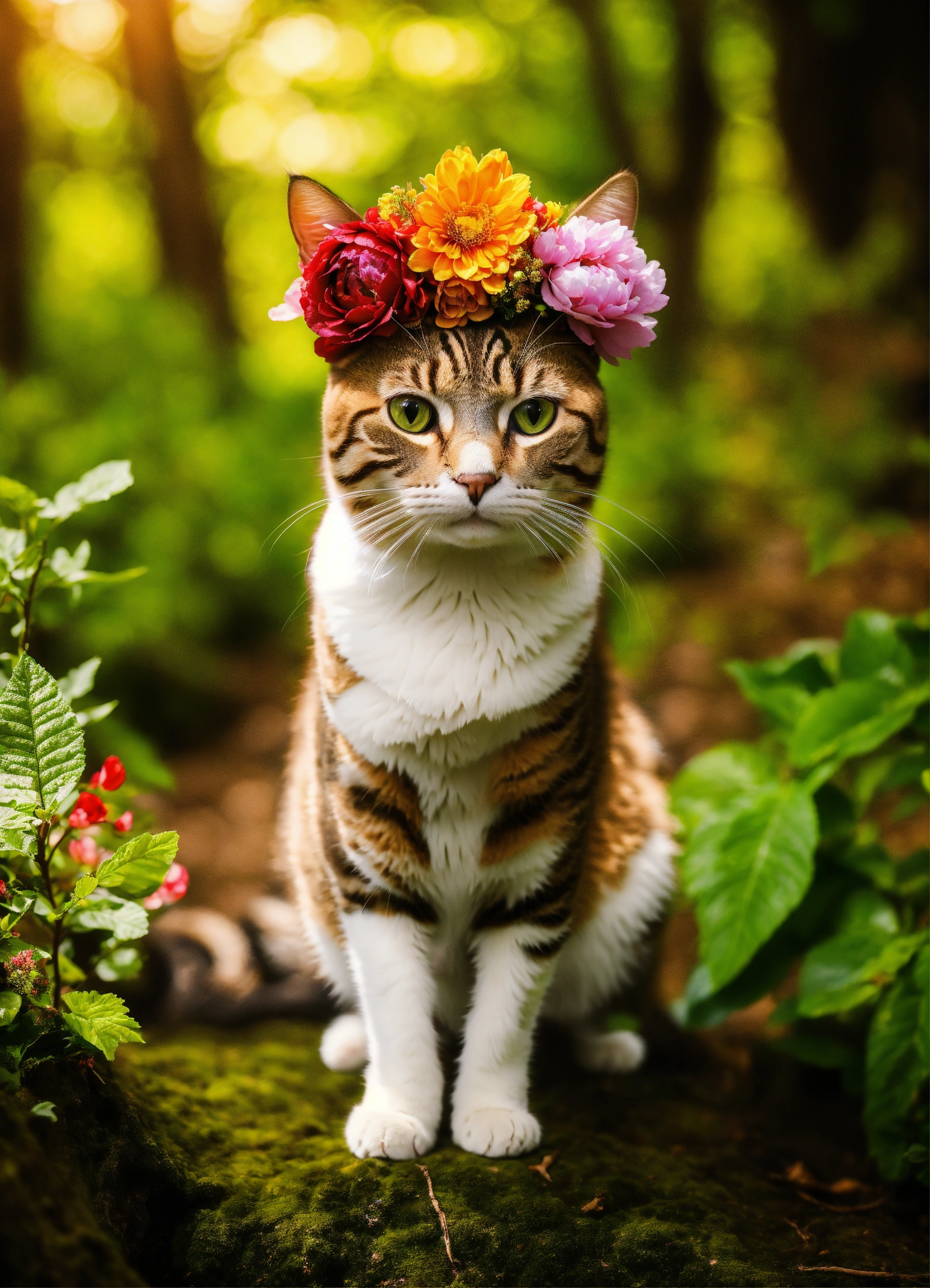 A mysterious cat model wearing a mythical flower crown, stands on two legs in a tranquil mystical forest, this mysterious cat model adorns a mythical flower crown, embodying the flower deity, while standing on two legs in a tranquil, mystical forest. its attire reflects the beauty described in myths,the cat model, playing a significant role in a mysterious ritual, exudes the blessings of a flower deity and enhances the beauty of nature