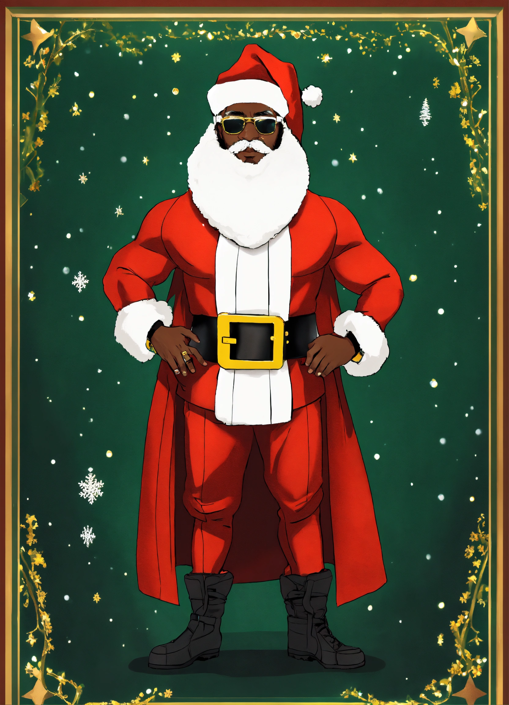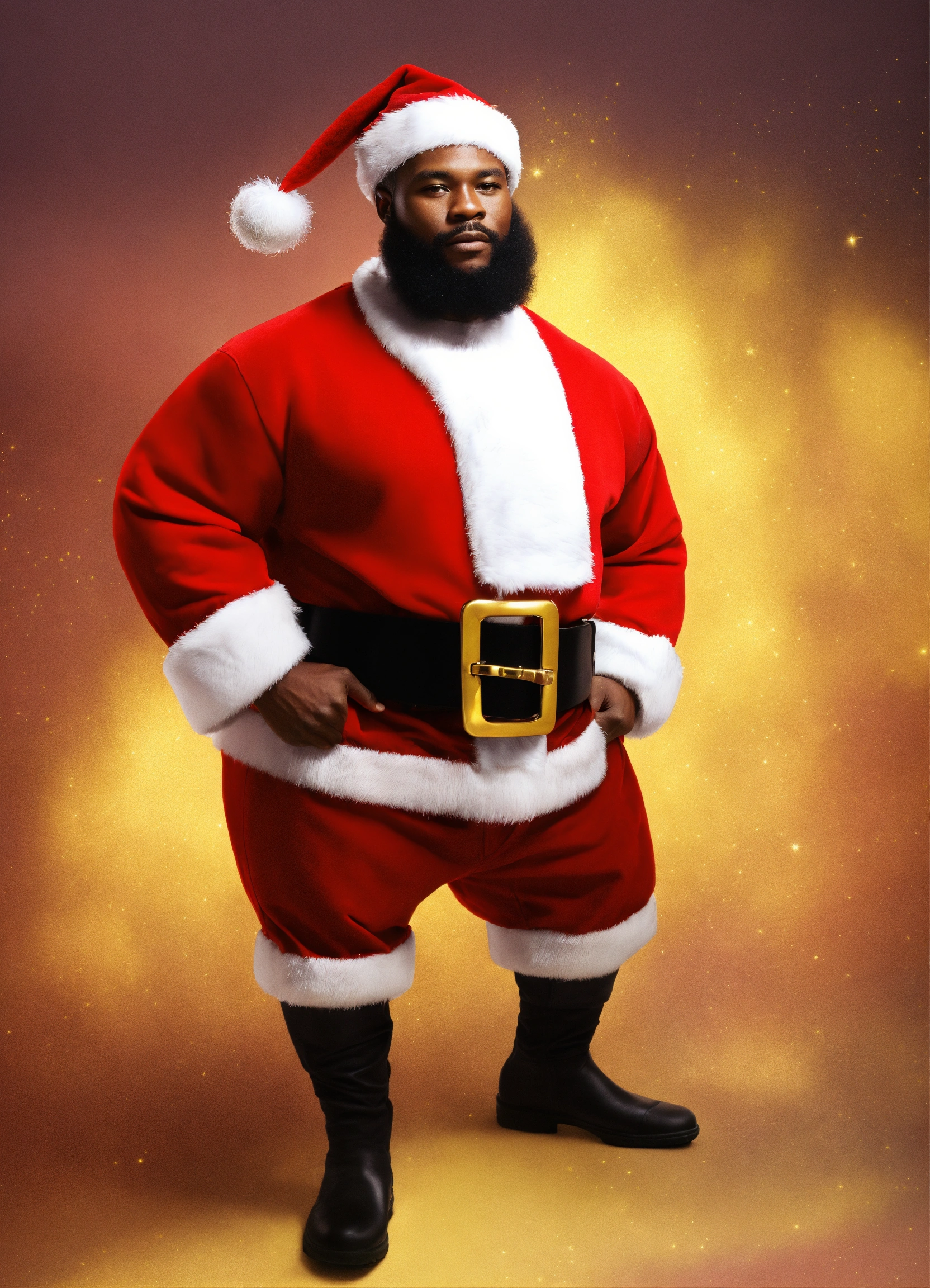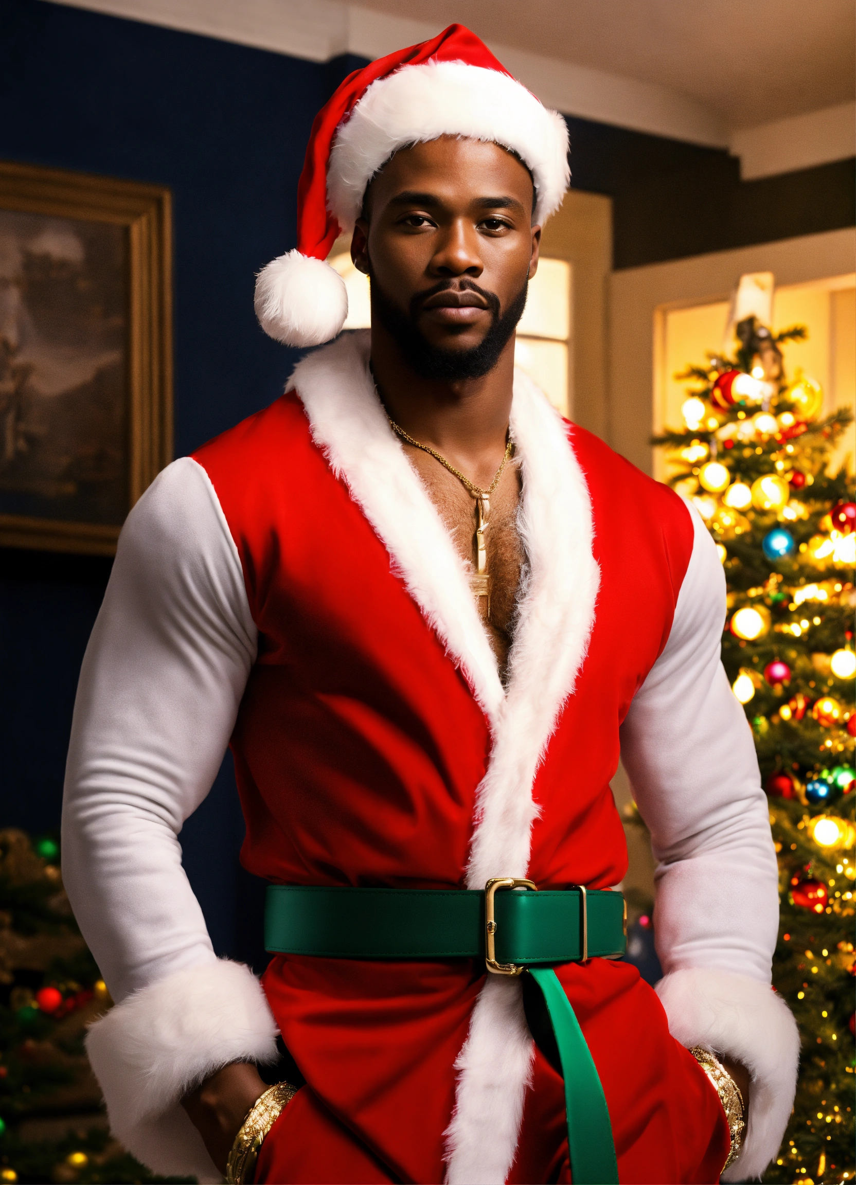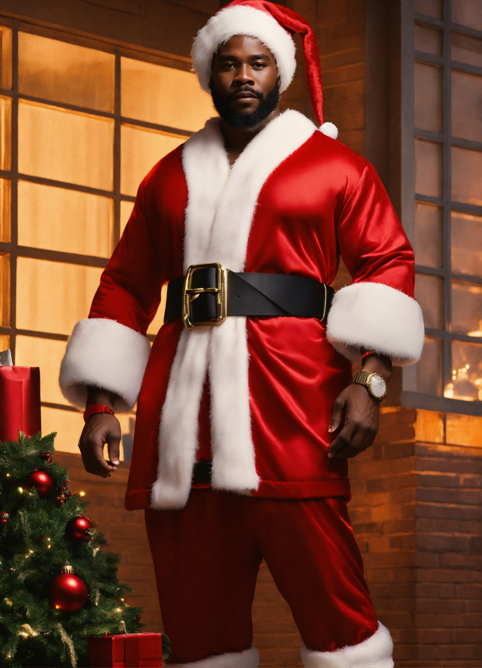 A extremely handsome modern african american santa claus, wearing a belt and athletic wear, inspired by balenciaga. --v 5.0