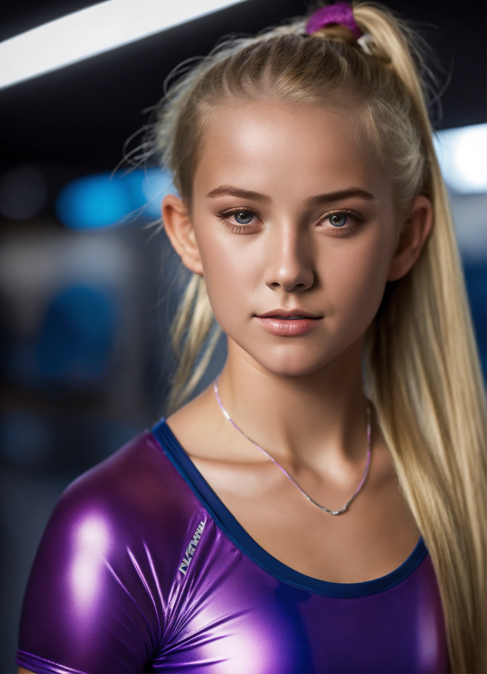 Blonde tween model, fashion photography, shiny lycra nike pro-style gym outfit, shiny lycra nike pro-style gym shorts, hyper realistic, 8k, no logos, varied angles, pigtails