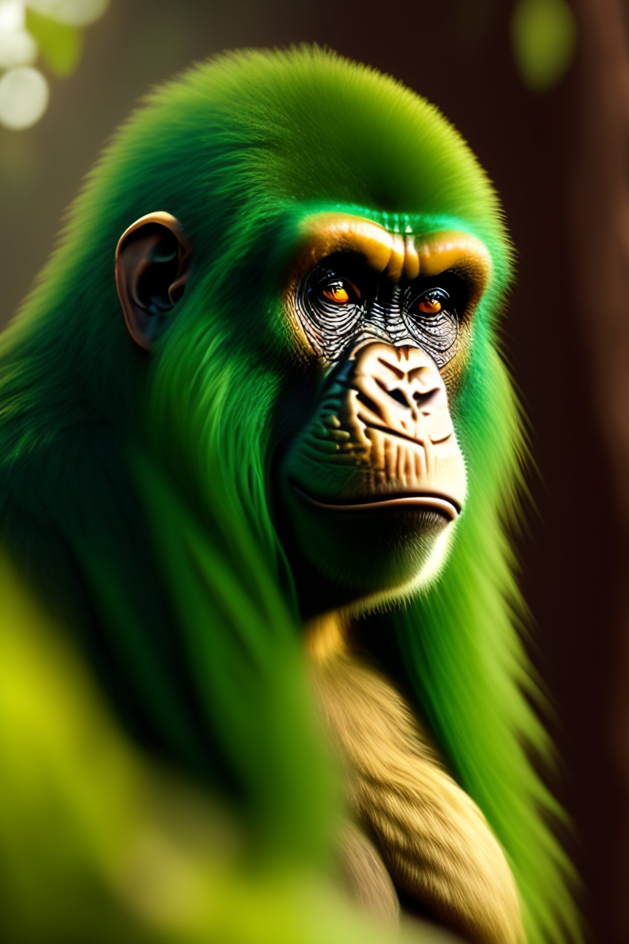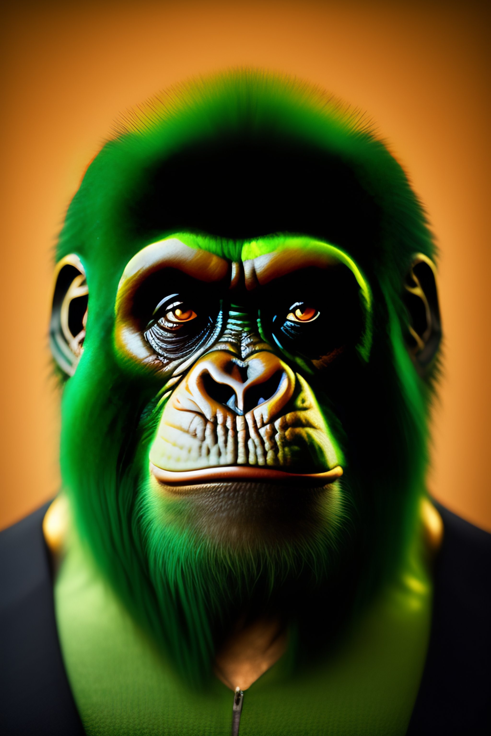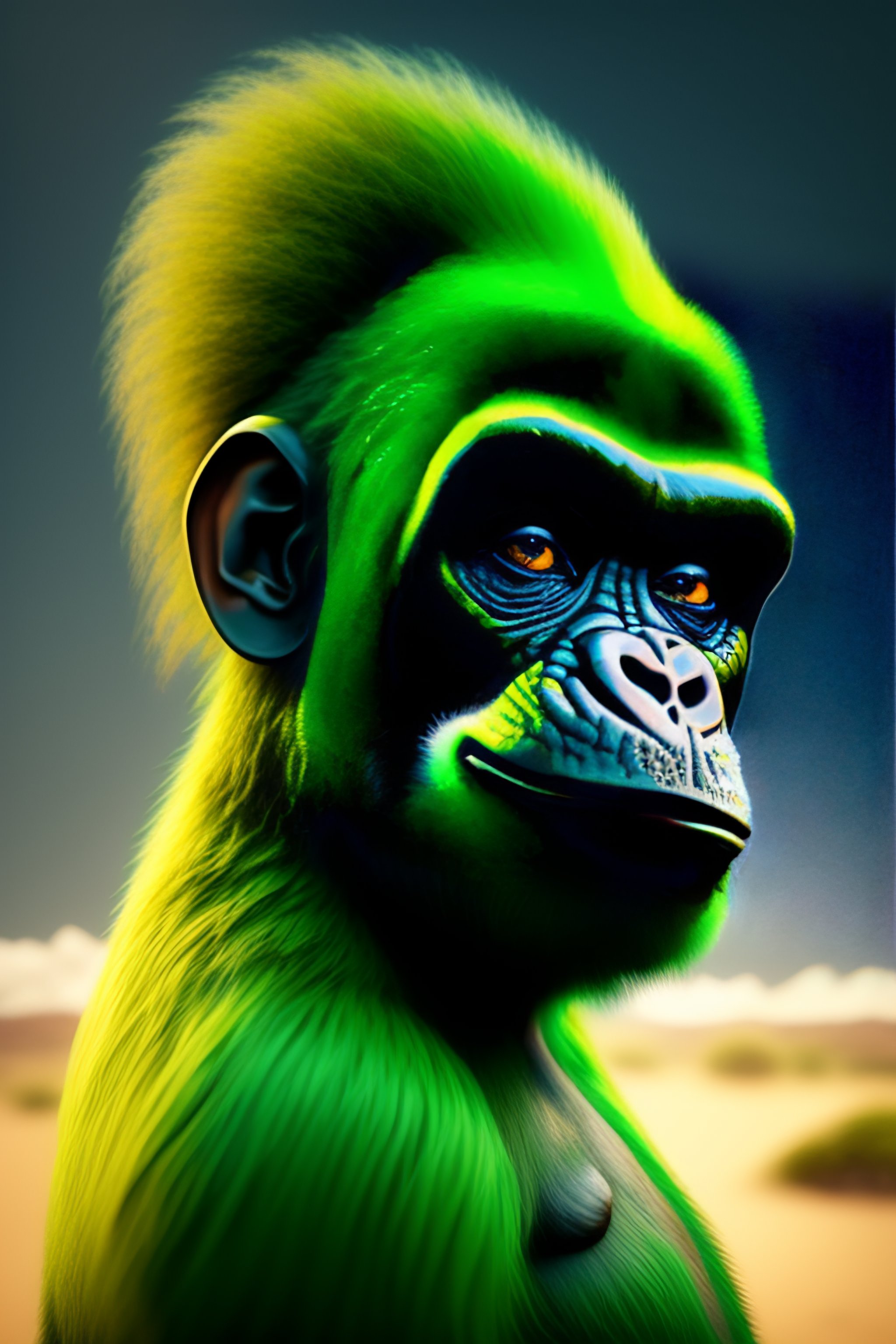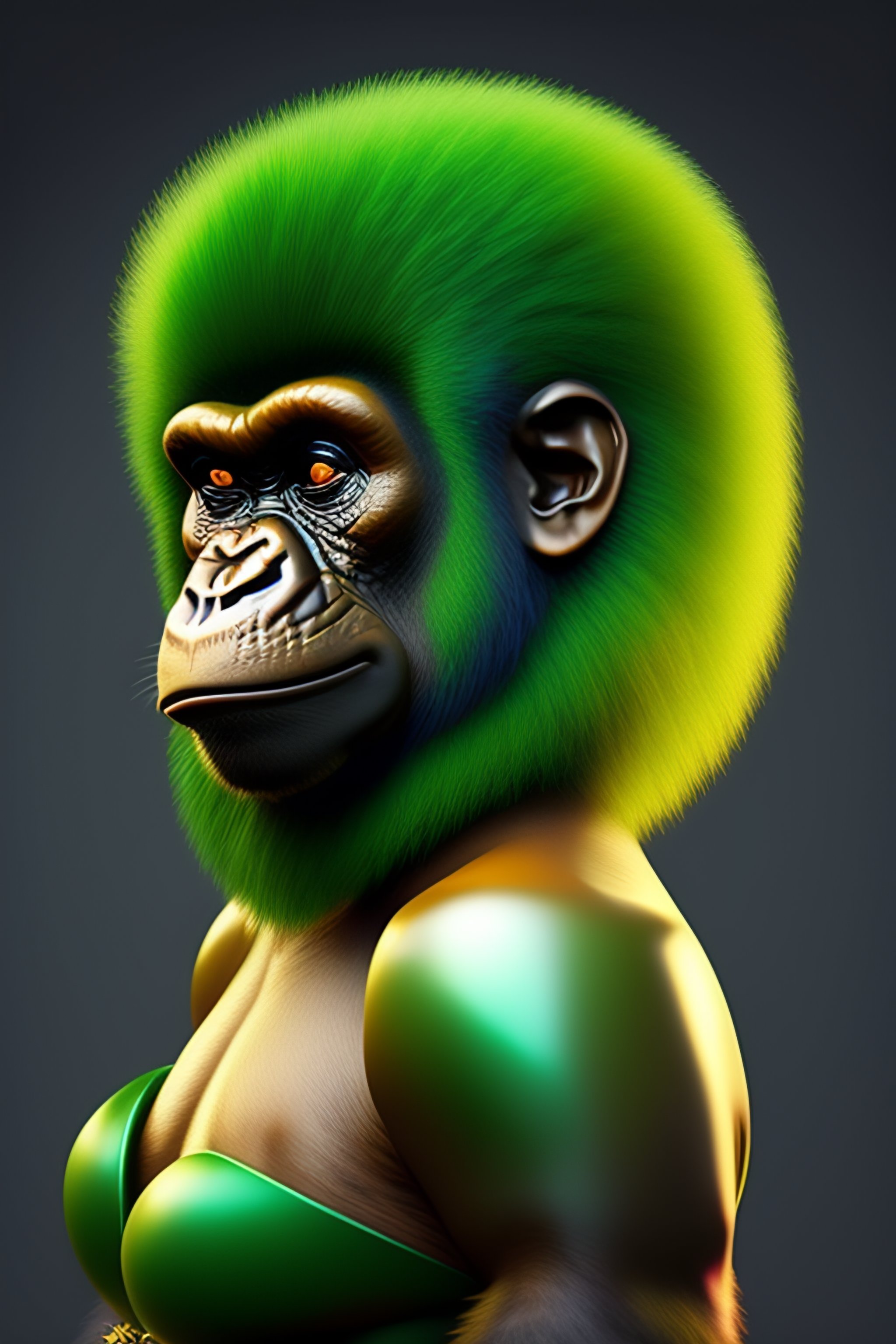 Retrato virtual de un gorila de pelo verde claro con una cresta rojiblanca con un fondo mágico