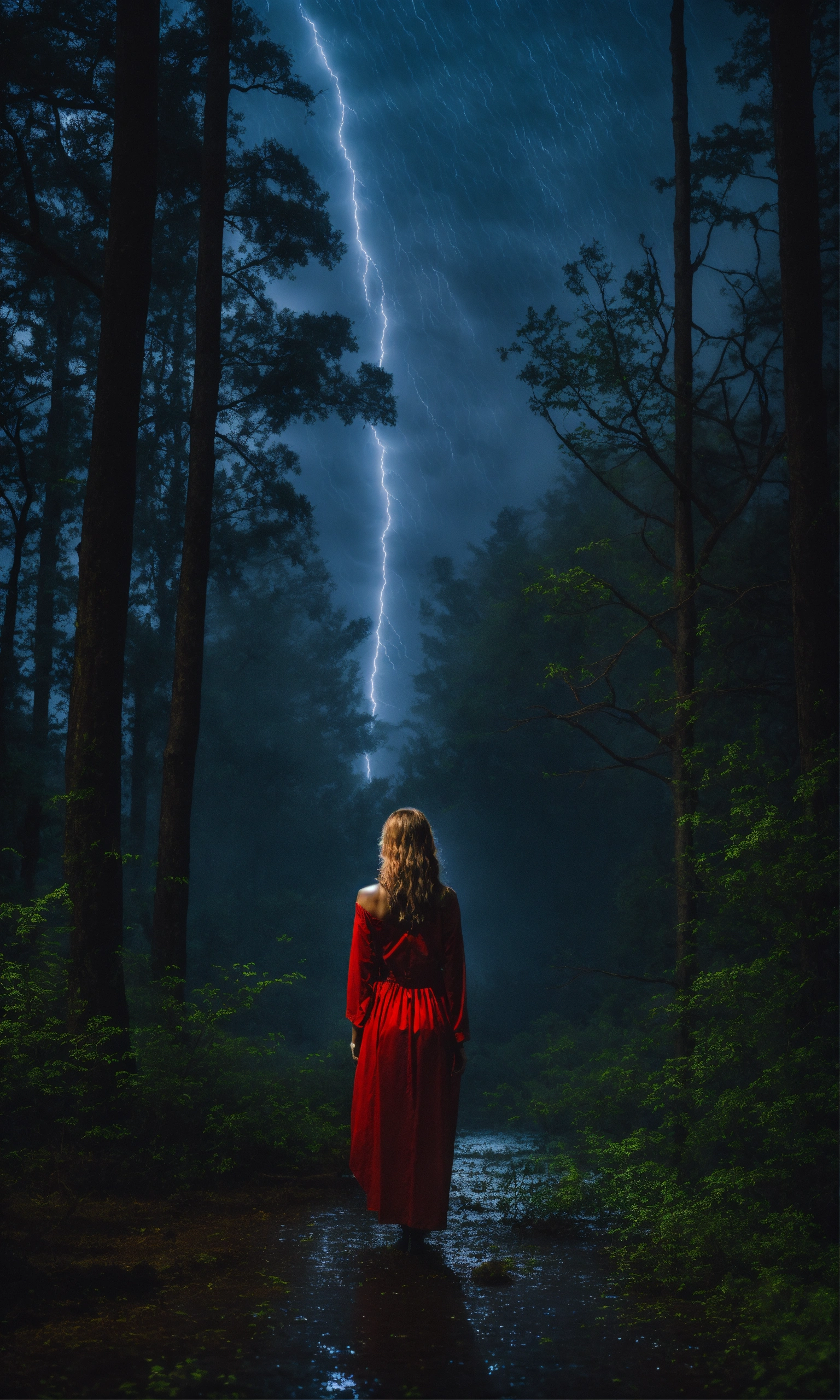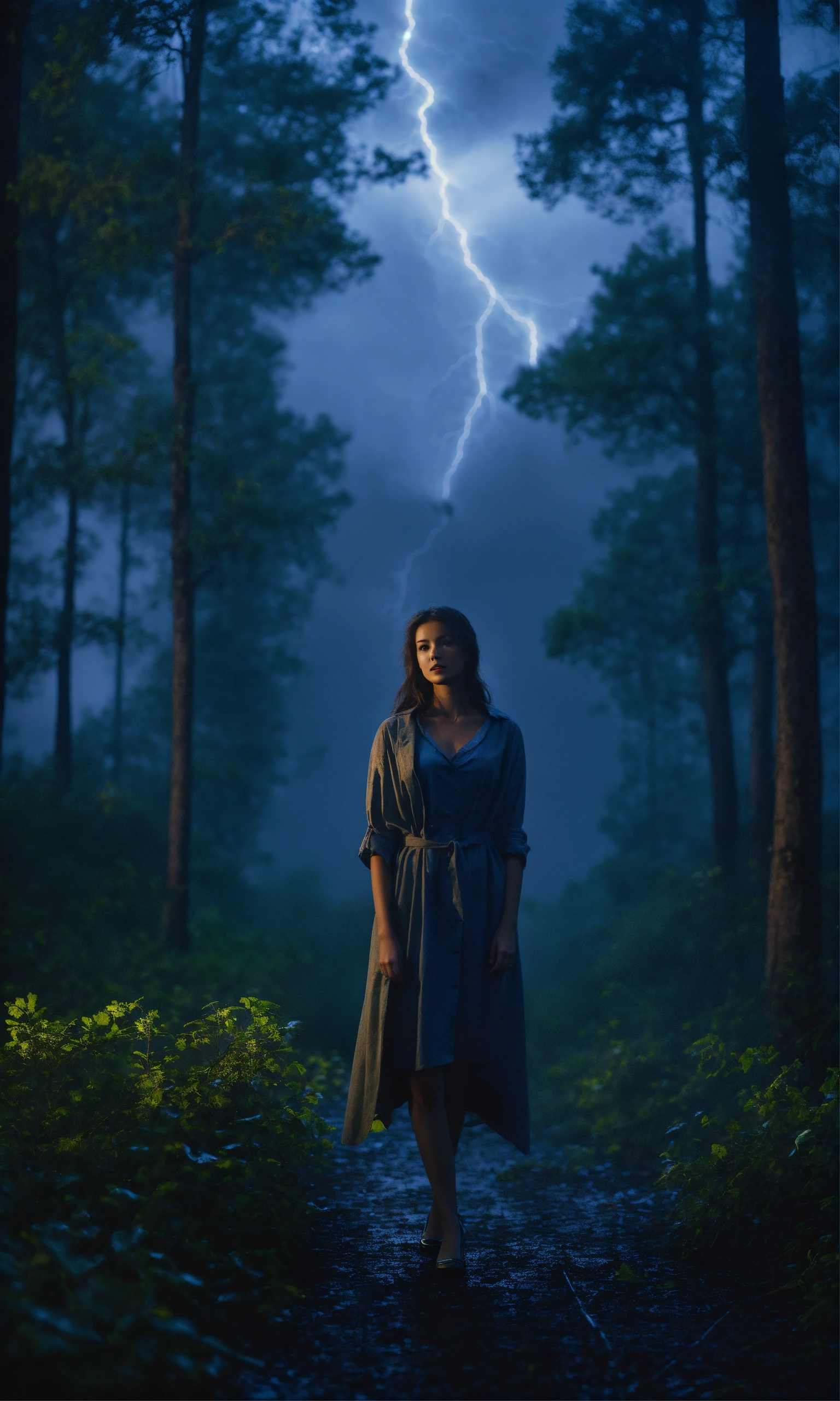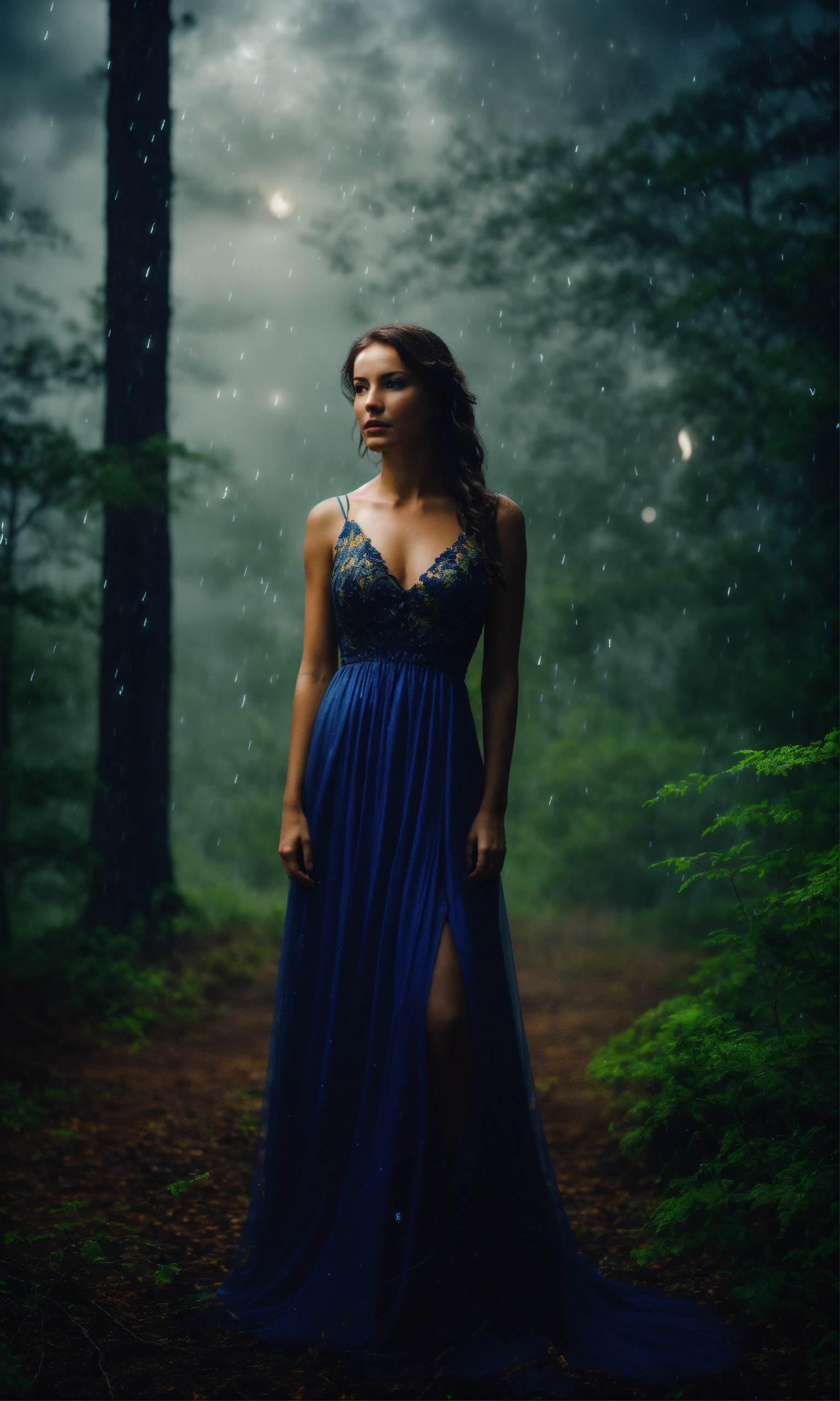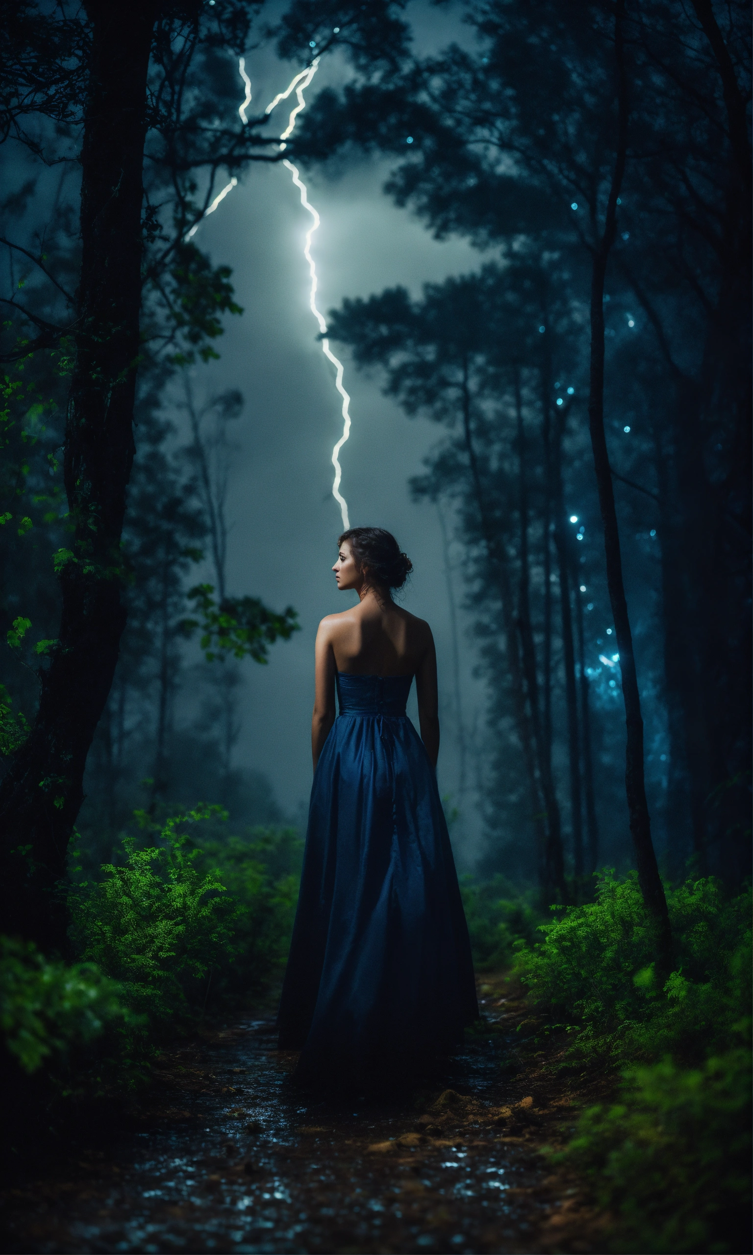 A photographic image of a beautiful woman in a thunderstorm, standing in a moonlit forest at midnight.
