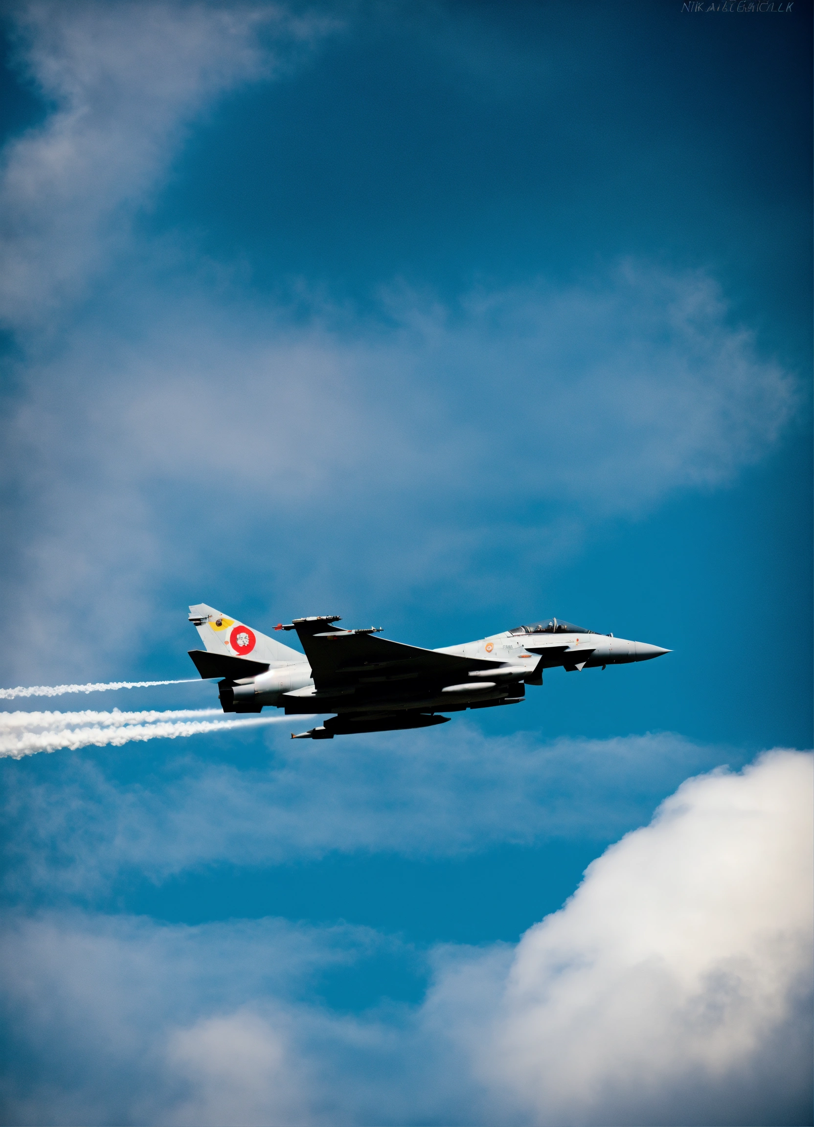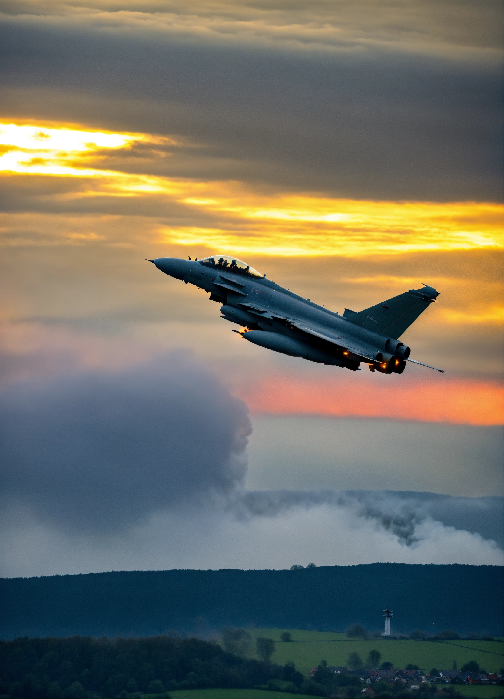 Ein eurofighter typhoon der durch die wolken jagt und einen feuerschweif hinter sich lässt im nikon look