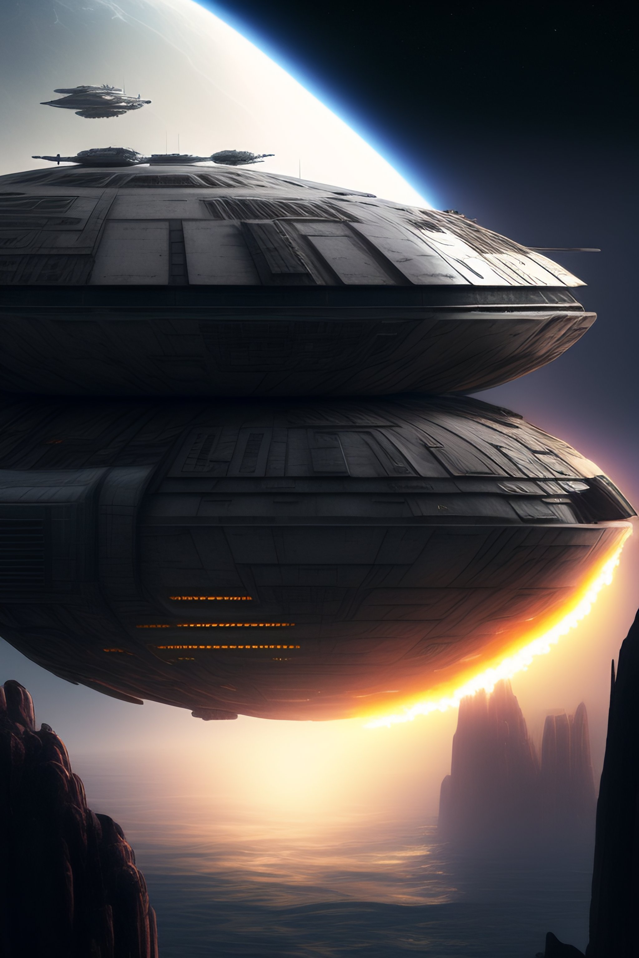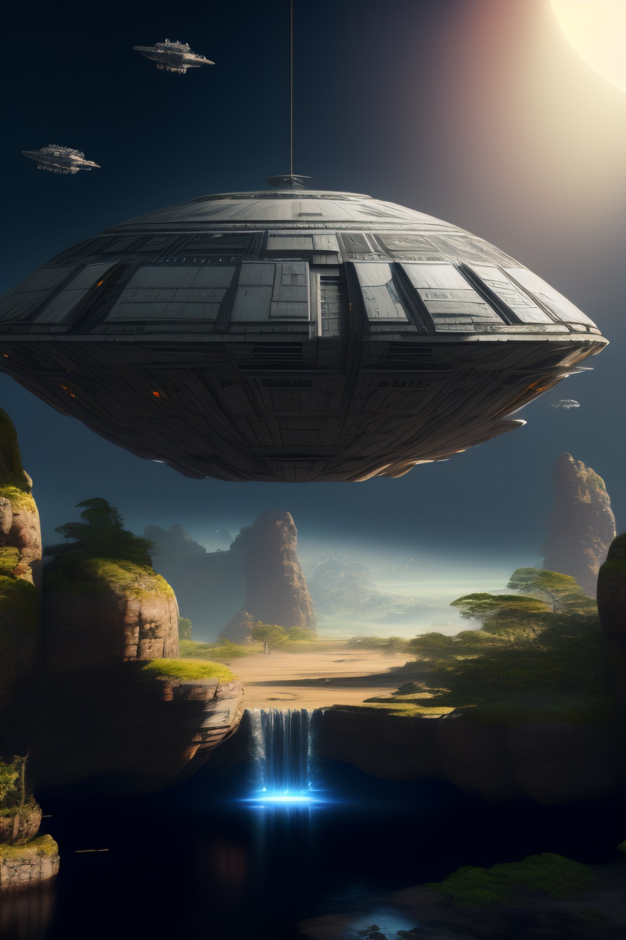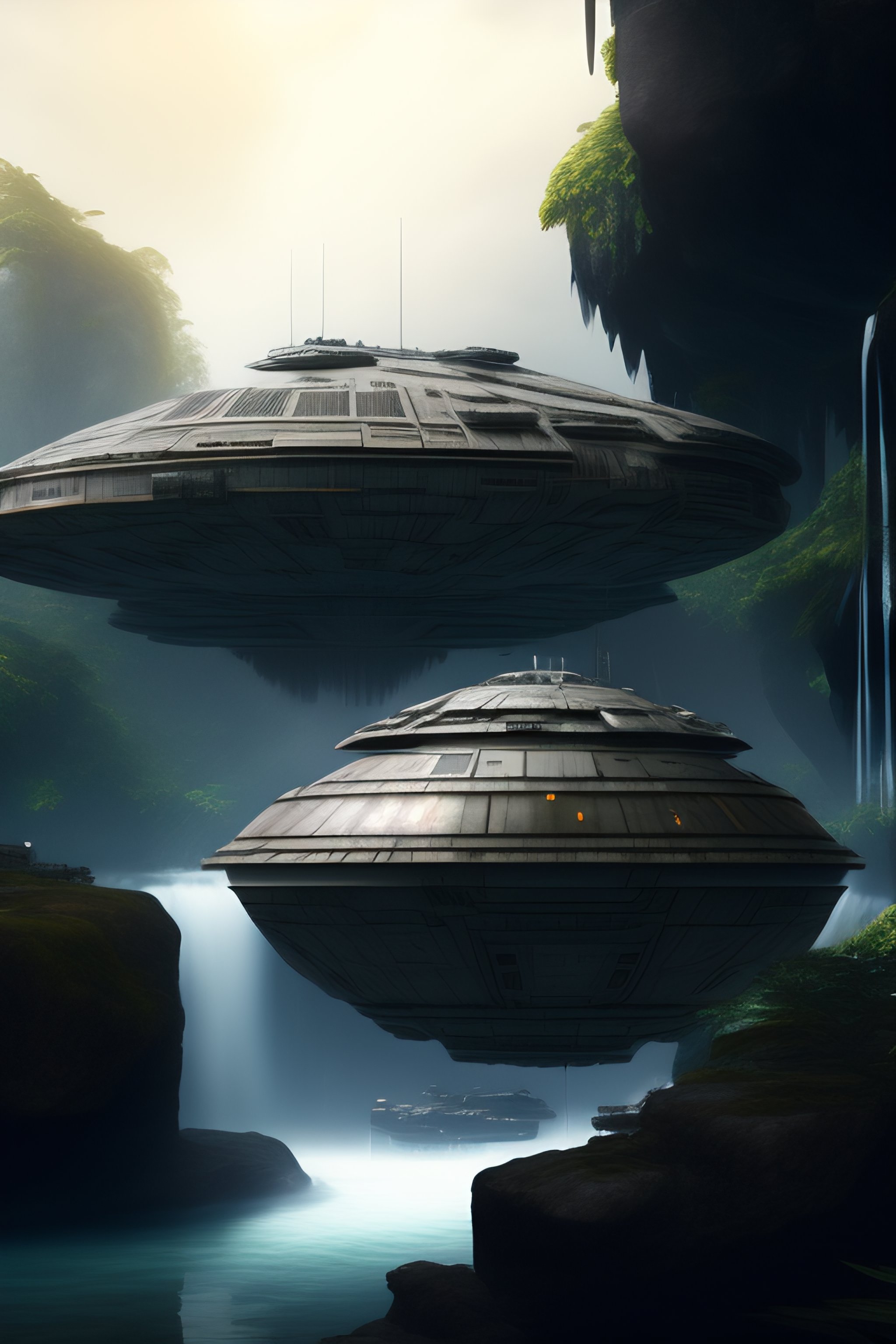 « millennium falcon from star wars, crashed, jungle, hyper realistic, dark styled, dramatic, extremely detailed, trending on artstation, cinematic view »