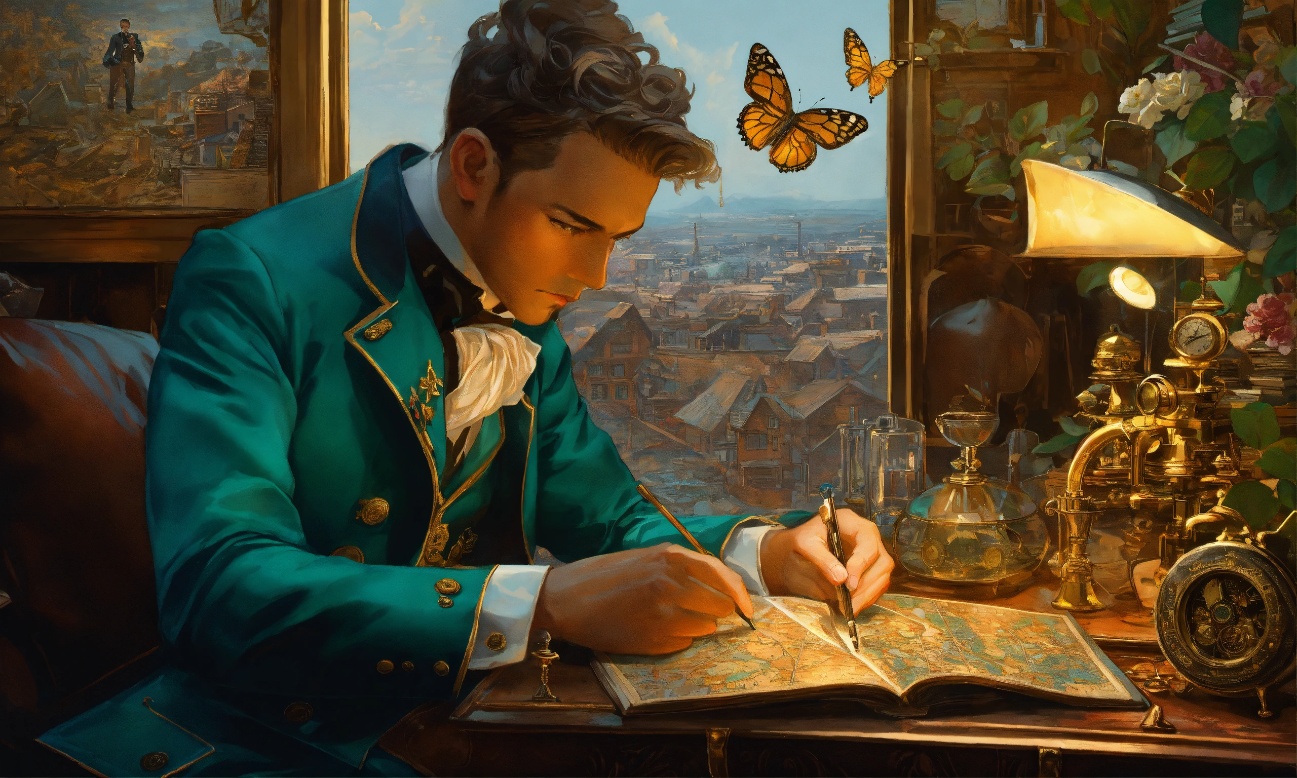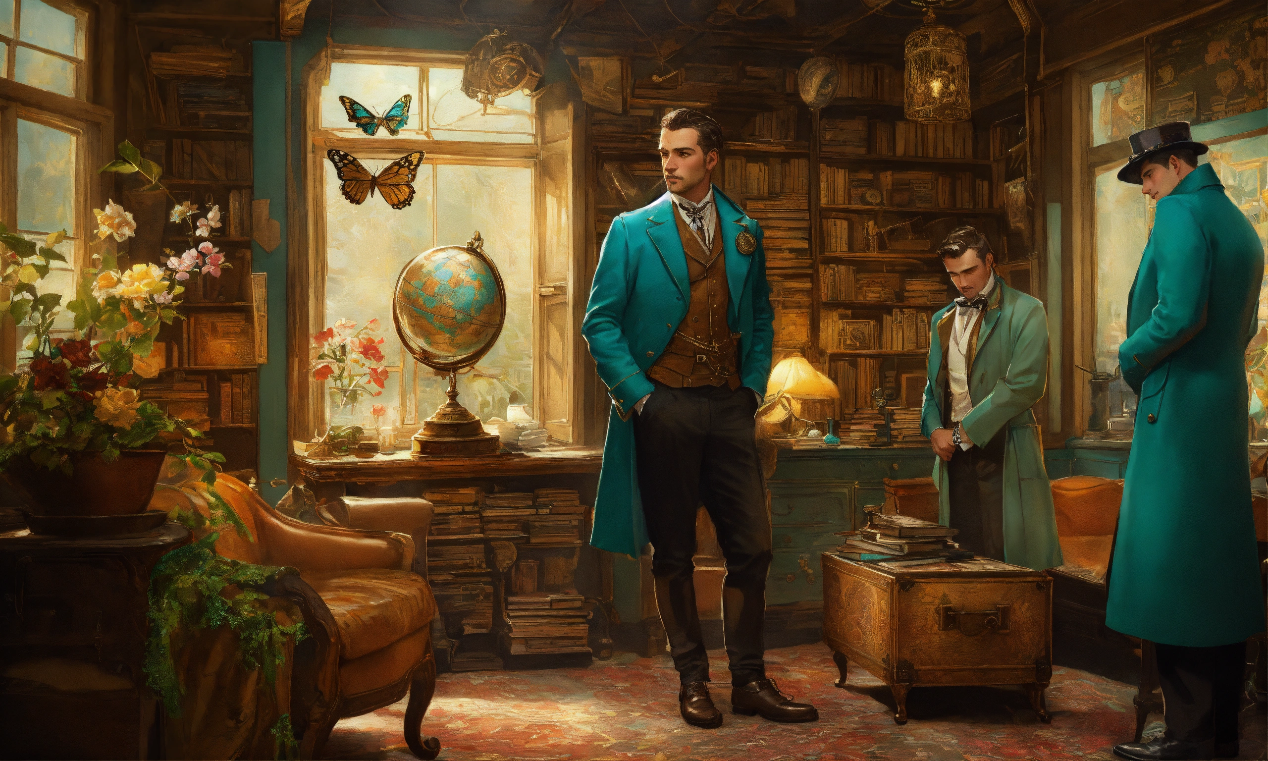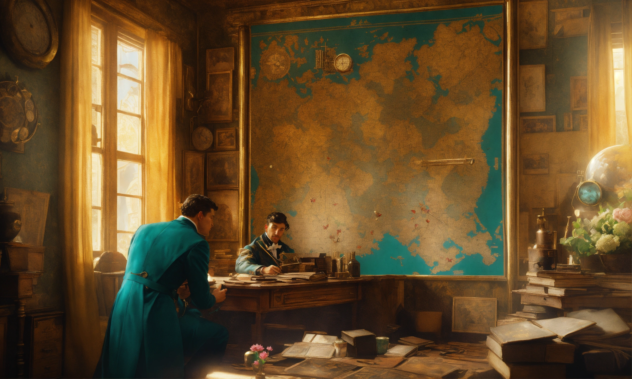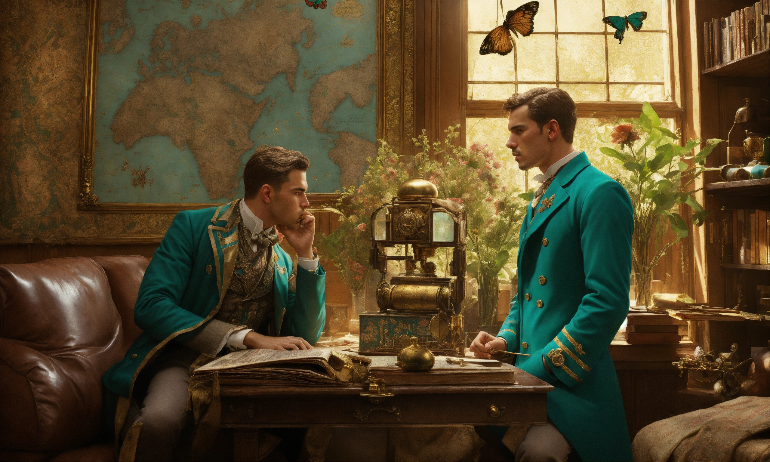 Stoic victorian gentleman in teal double breasted suit kissing handsome man, intense eye contact, daring treasure hunter, map and compass, standing in gold, emeralds, old books, old globe, desolate messy shack, chaotic shack in background. vibrant, photo realistic, realistic, dramatic, dark, sharp focus, 8k. gold, brass square and symbolic tapestry, adventurous, detailed, high detail, still-life flowers butterflies, j.c. leyendecker, men in solid wet oil rainwear kissing, looking into his tender eyes, beautiful french tapestry, technology-inspired living room with a unique twist. the centerpiece of the room is a striking circuit board interior wallpaper, the wallpaper features intricate circuit board diagrams, electronic symbols, and vibrant metallic tones, steampunk, perfectly detailed image, close-up, excellent lighting, photorealistic, digital illustration, realism, bastien lecouffe-deharme, norman rockwell, daniel ridgway knight, mike dargas, lucio amitrano, omar ortiz, disney