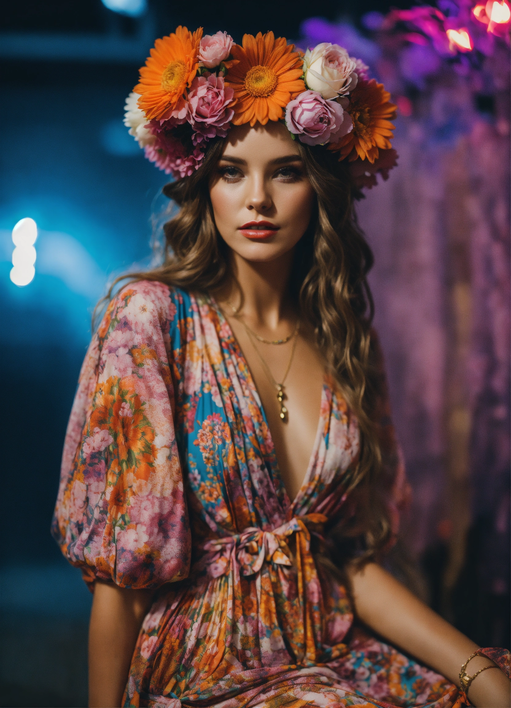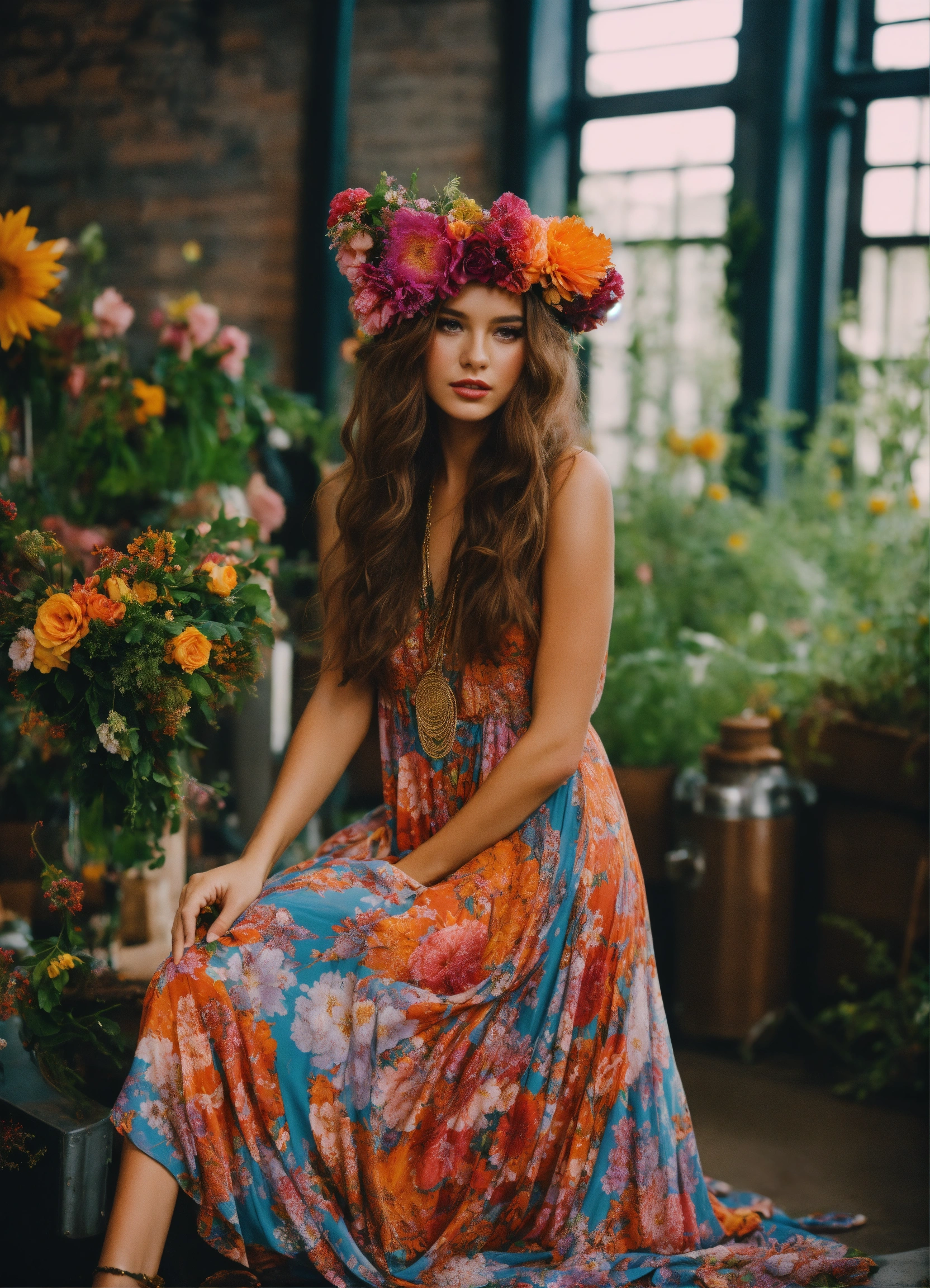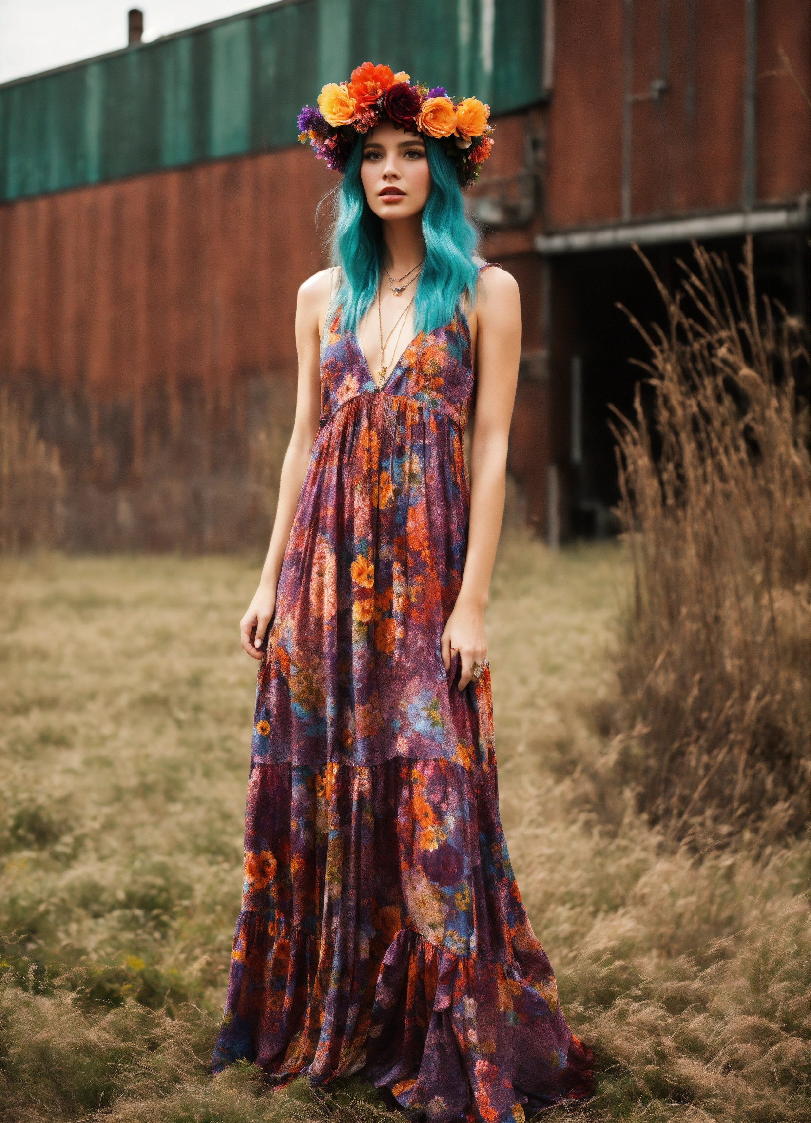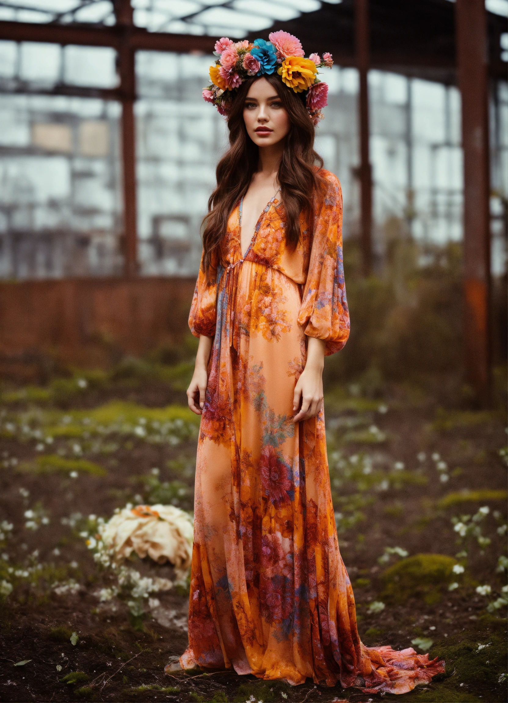 Location an industrial warehouse party model a bohemian 70's european muse outfit a flowing, psychedelic maxi dress with oversized flower crown