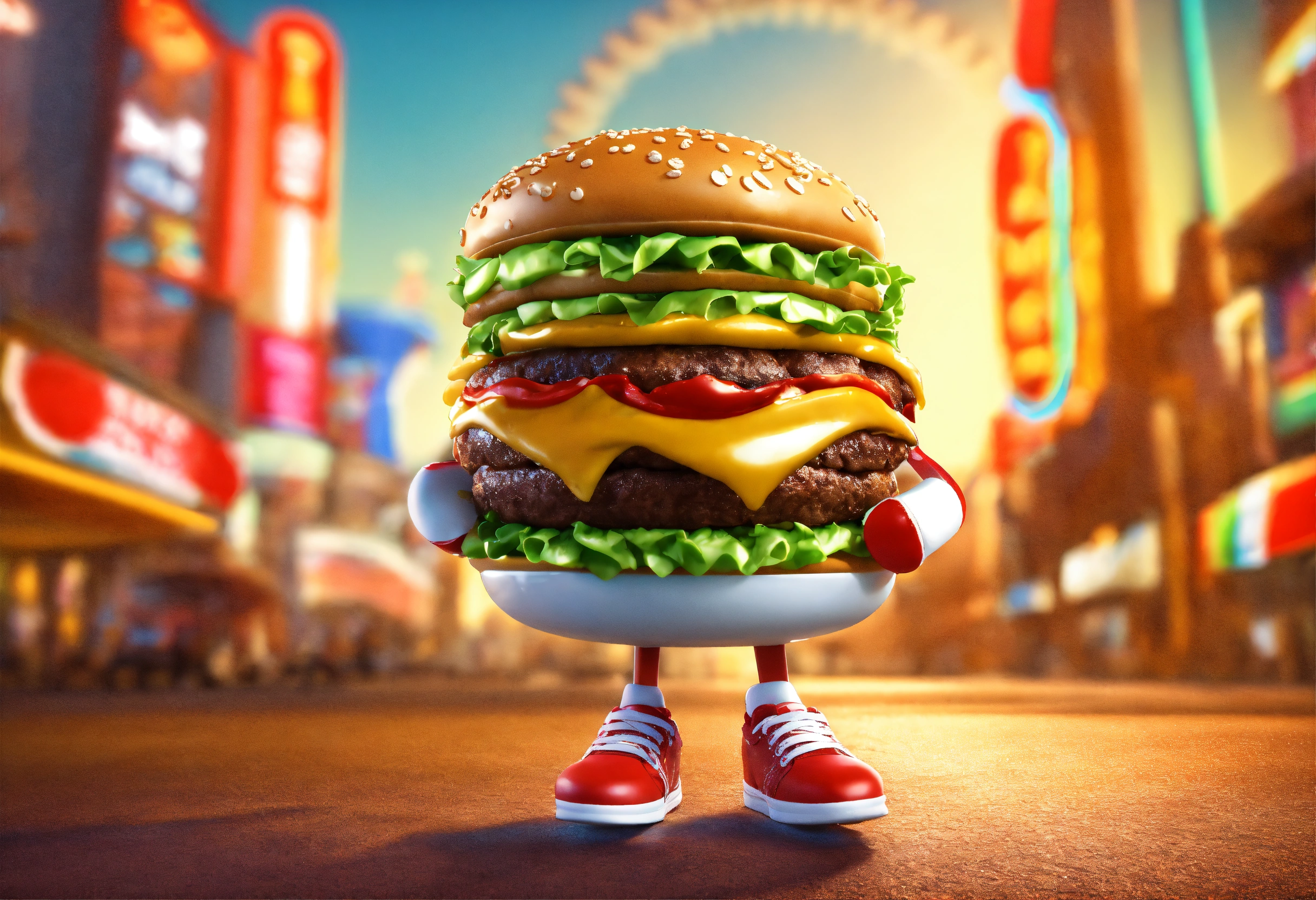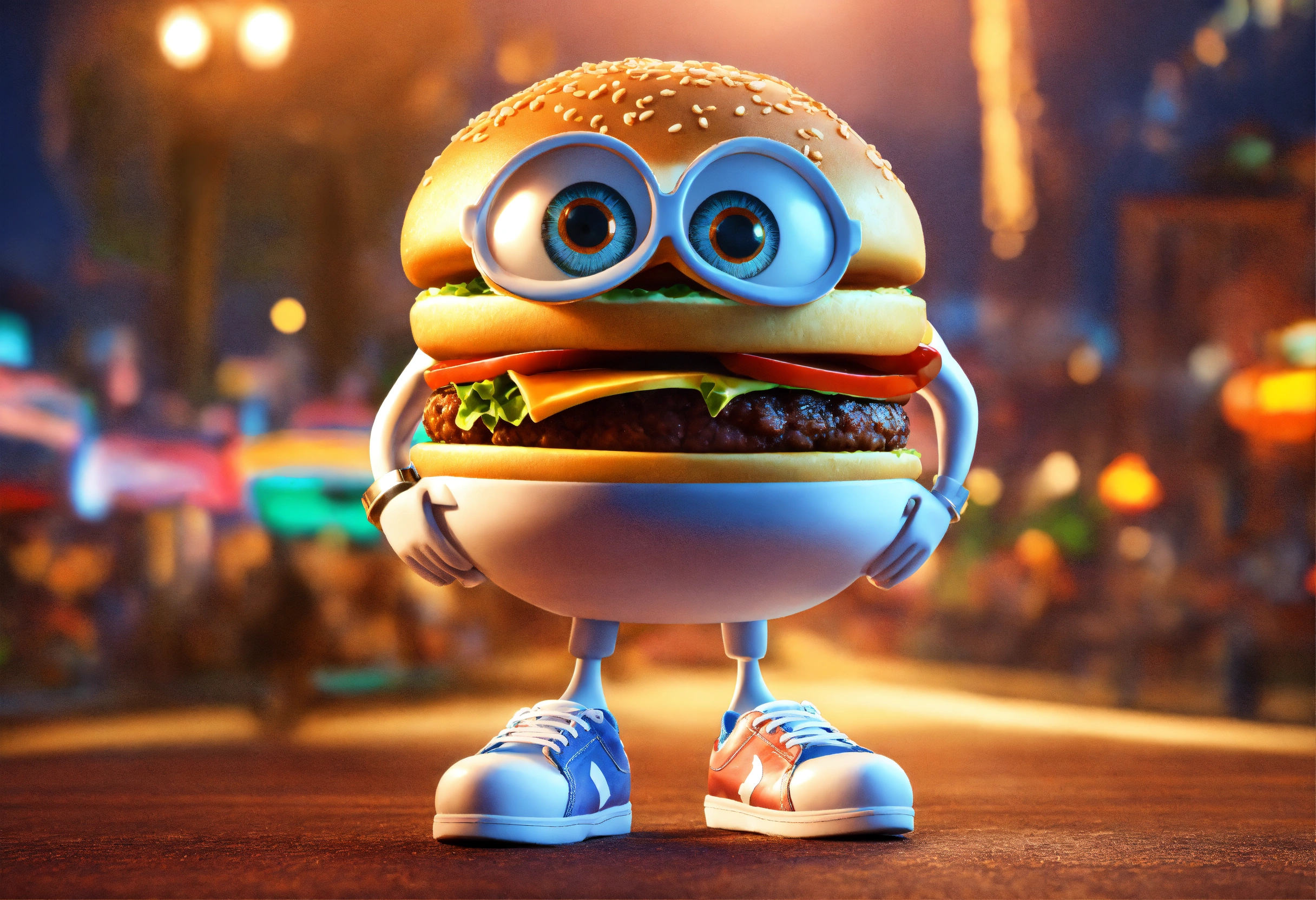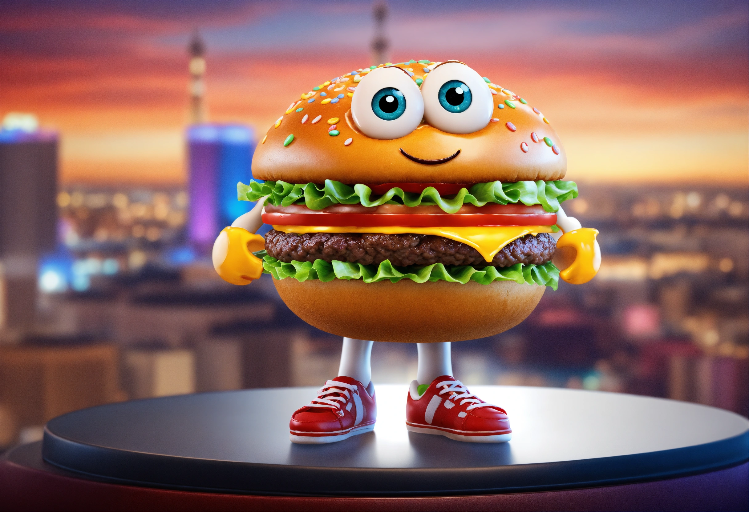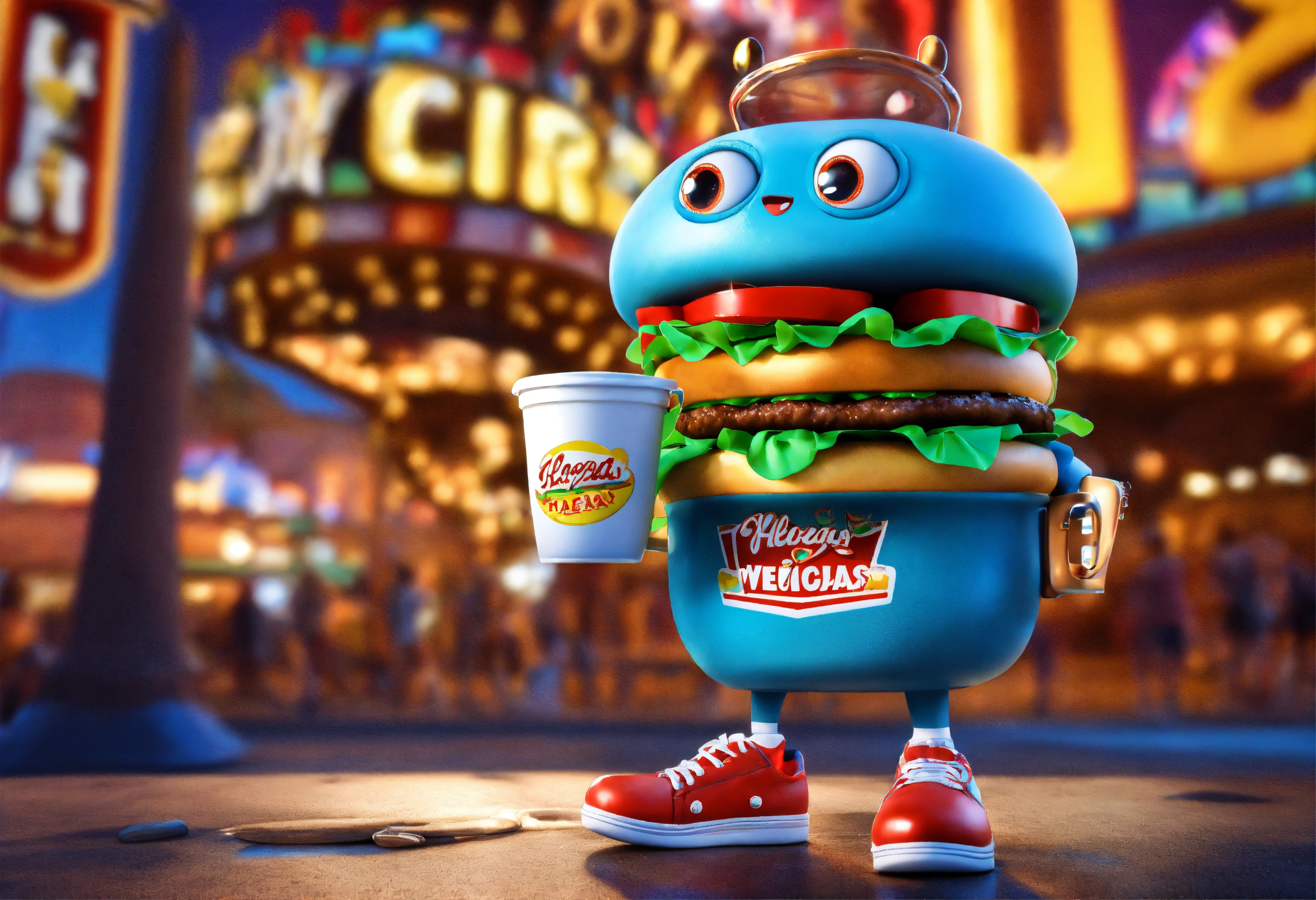 Cup in hand cartoon character hamburger with eyes and mouth, with feet in sneakers, holding cup breastplate on las vegas background, photorealistic, 3d