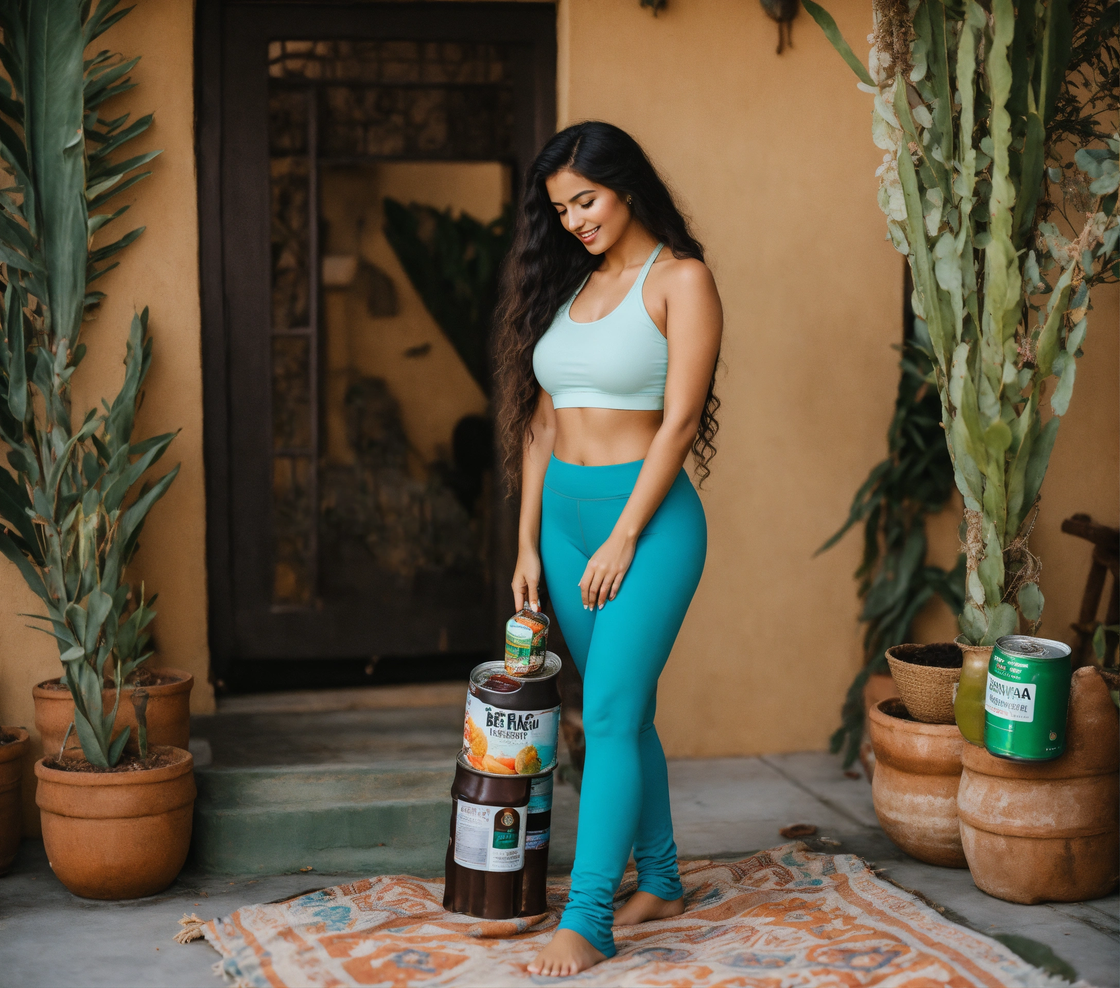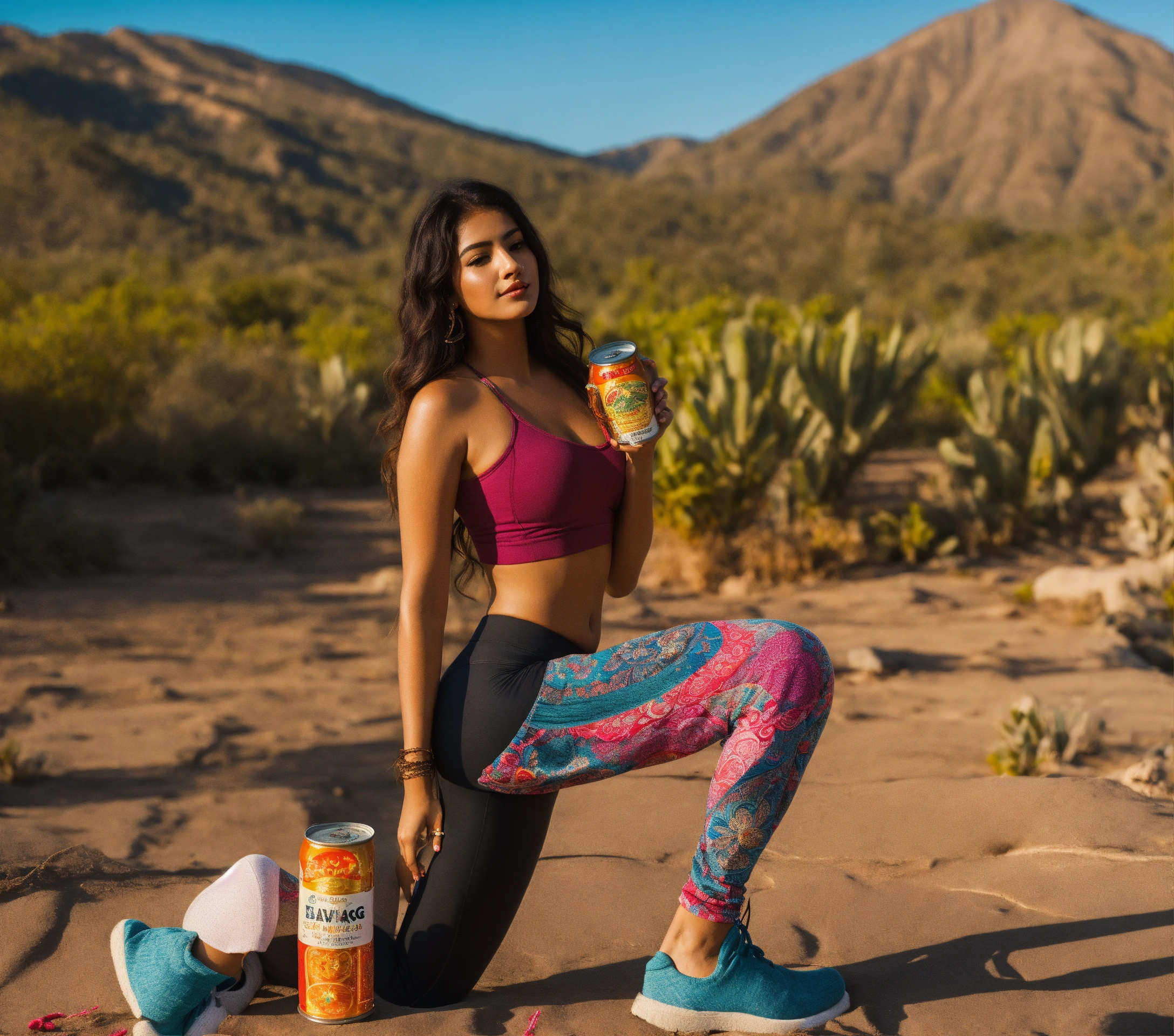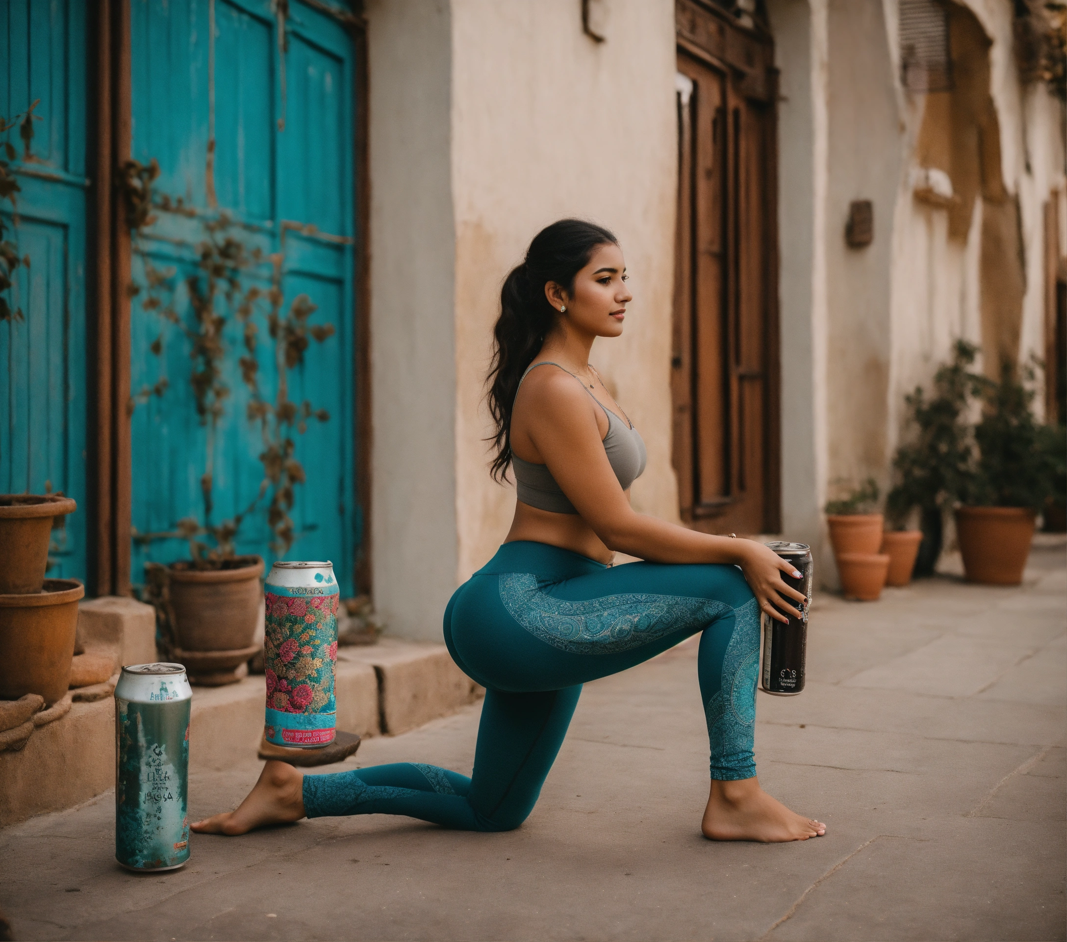 Latina girl in boho look wearing yoga pants having a canned bevarage with indian boyfriend