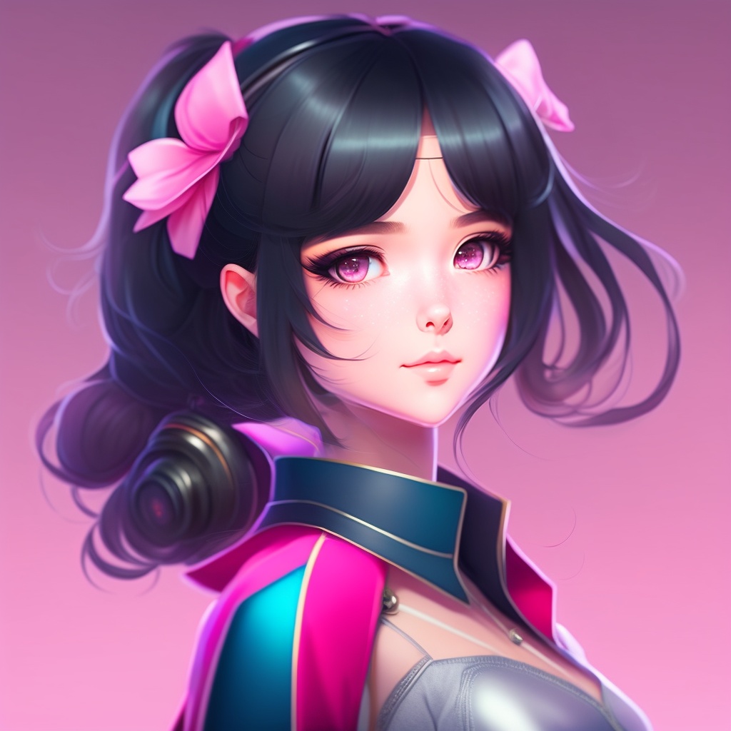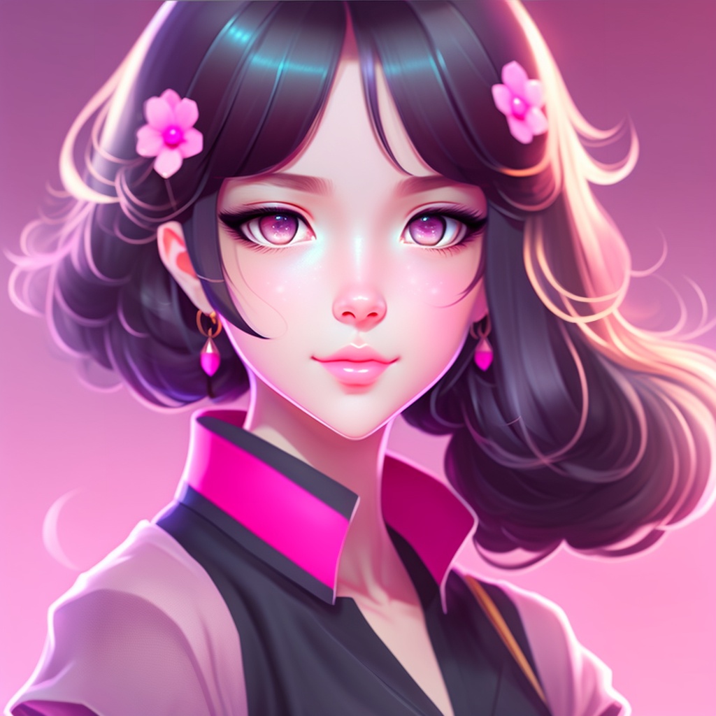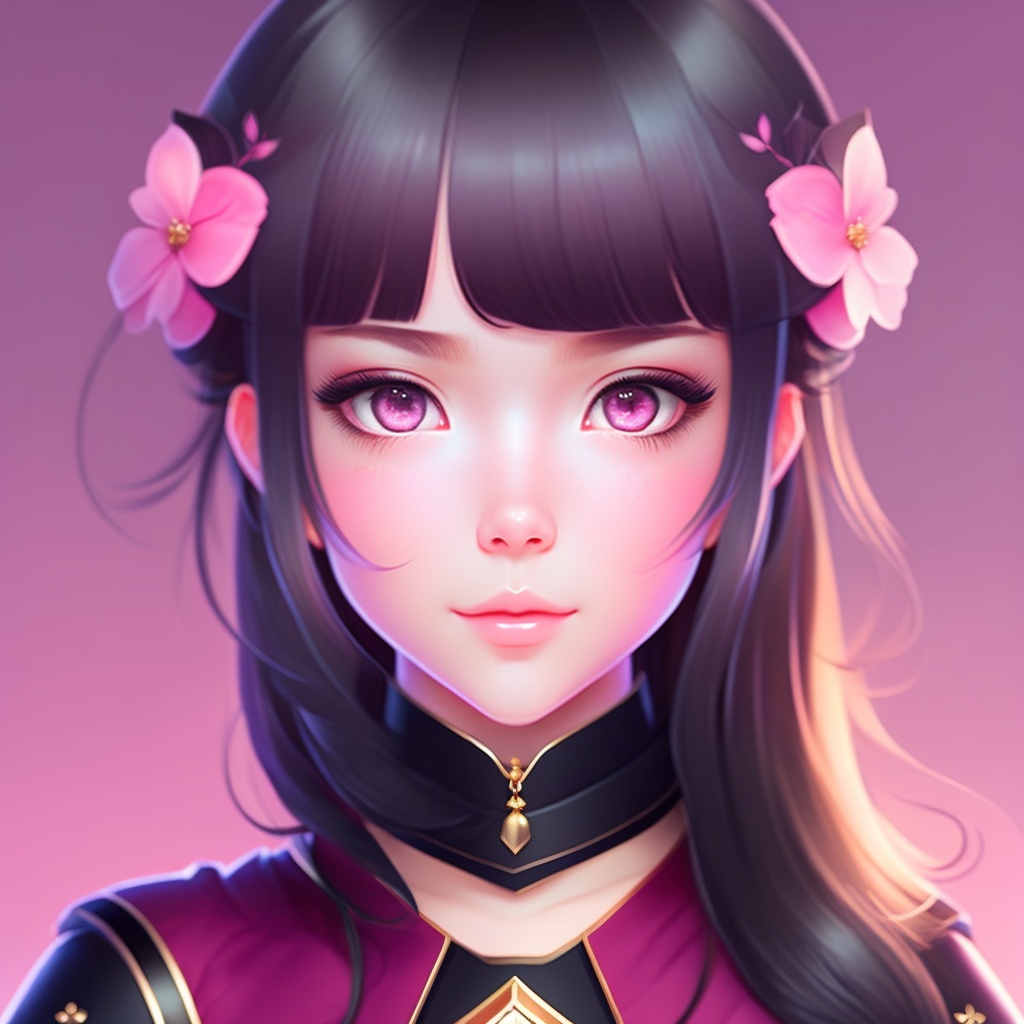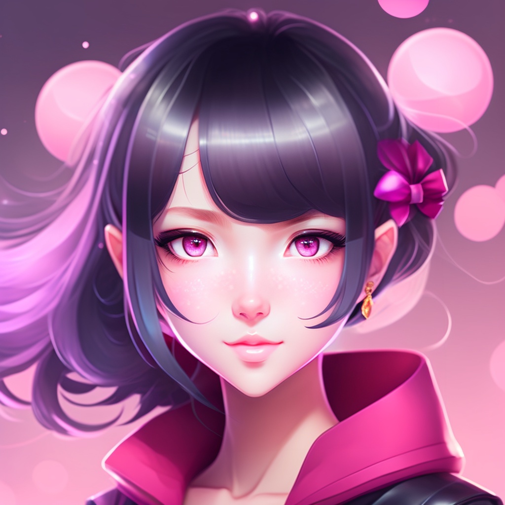 A cute anime girl, fair skinned, beautiful face, pretty eyes, pink lips, black hair, 8k, hd pink background