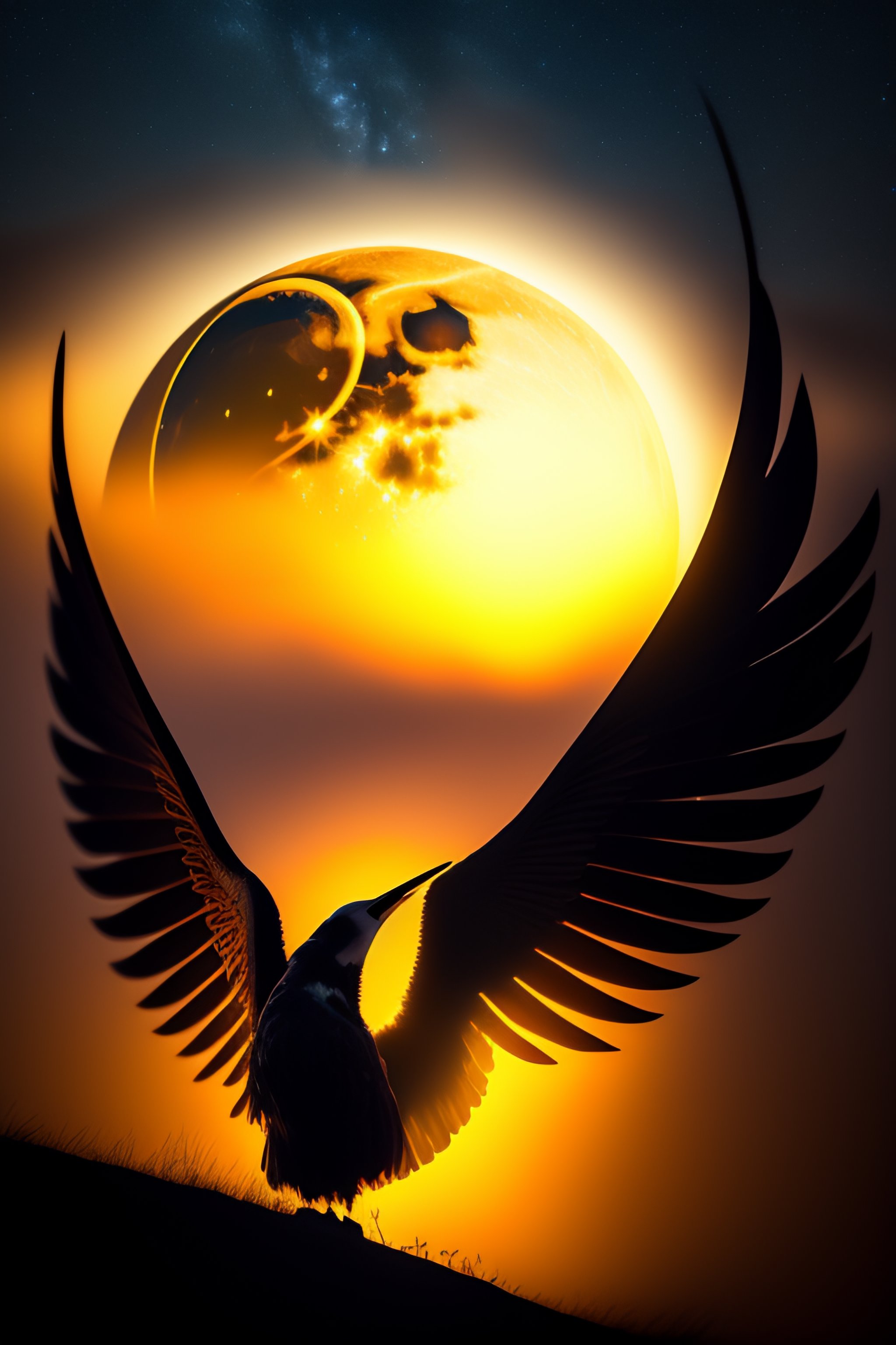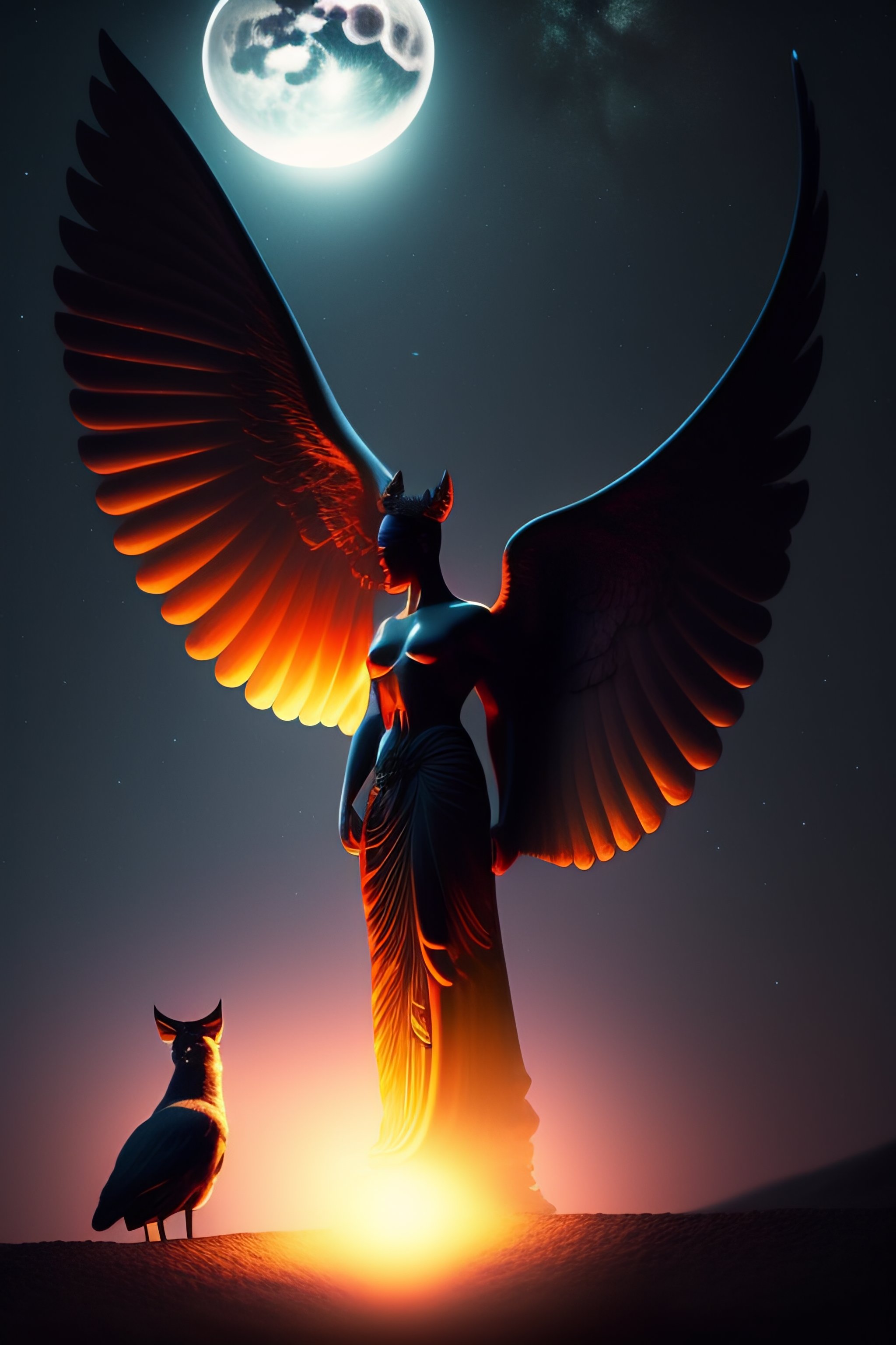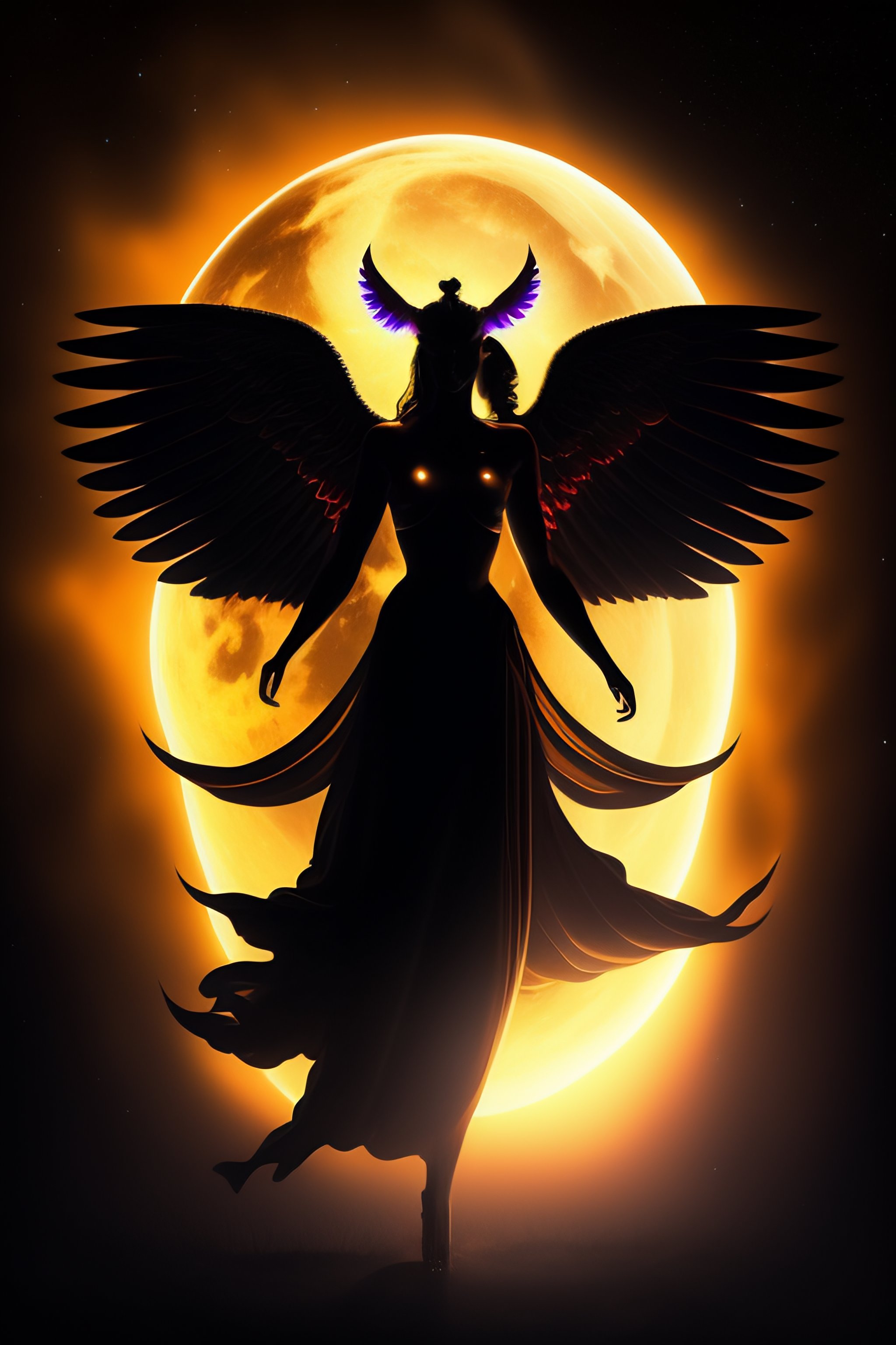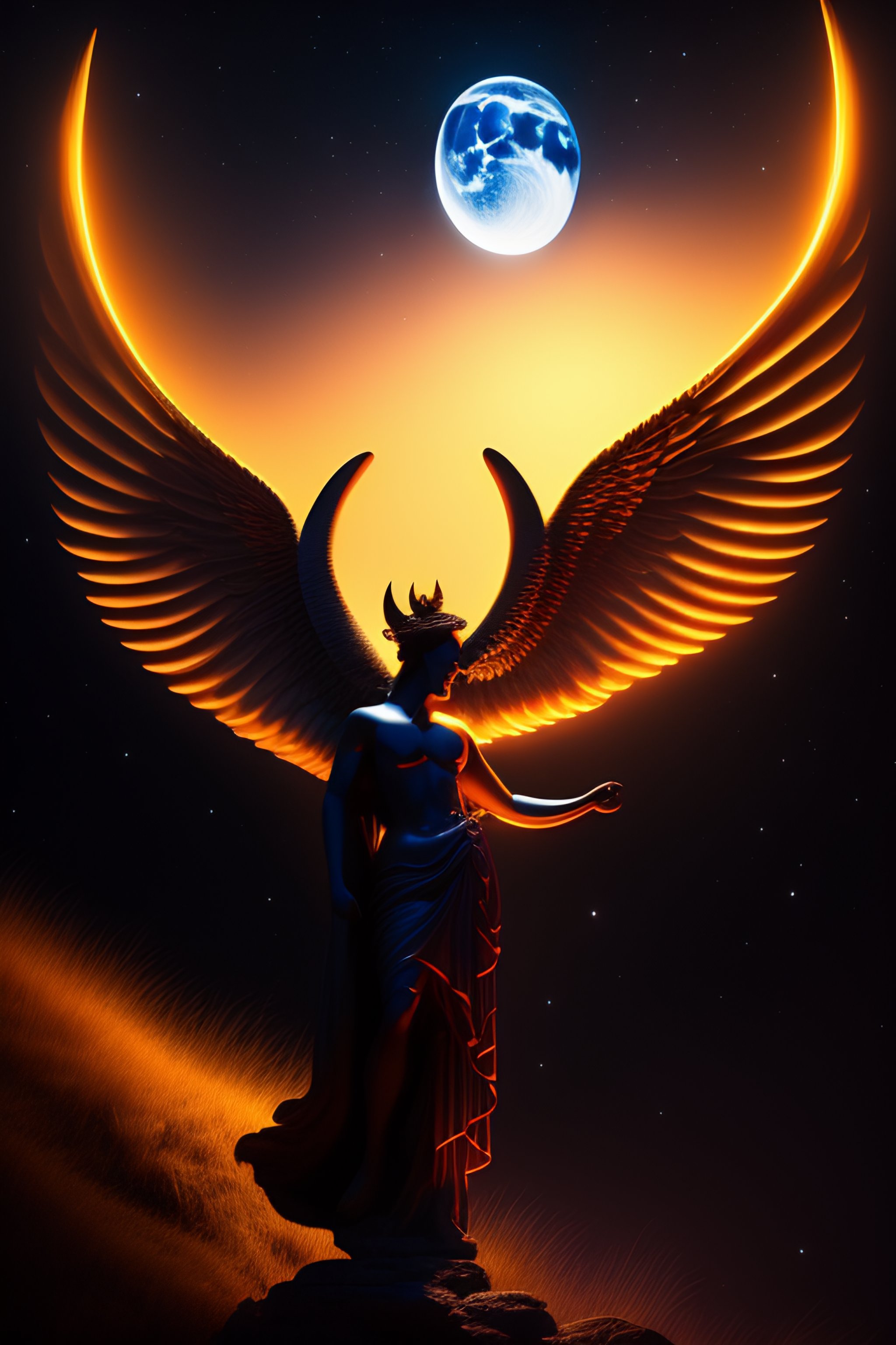 Lucifer con alas negras levitando a la luz de la luna en una noche estrellado bien iluminada intimidando