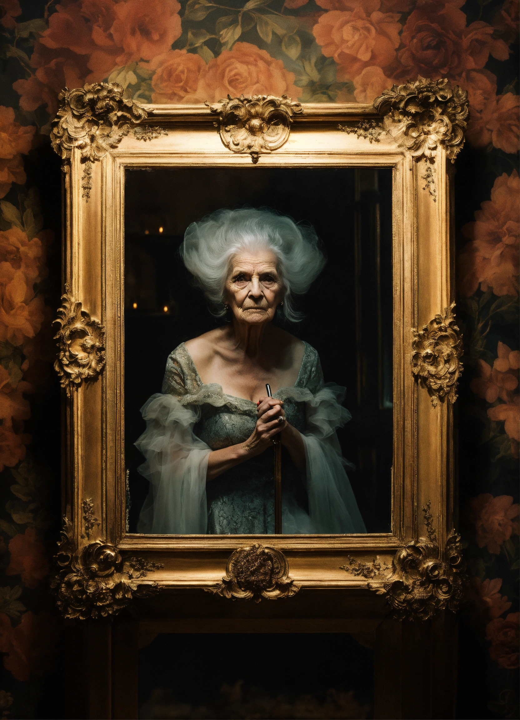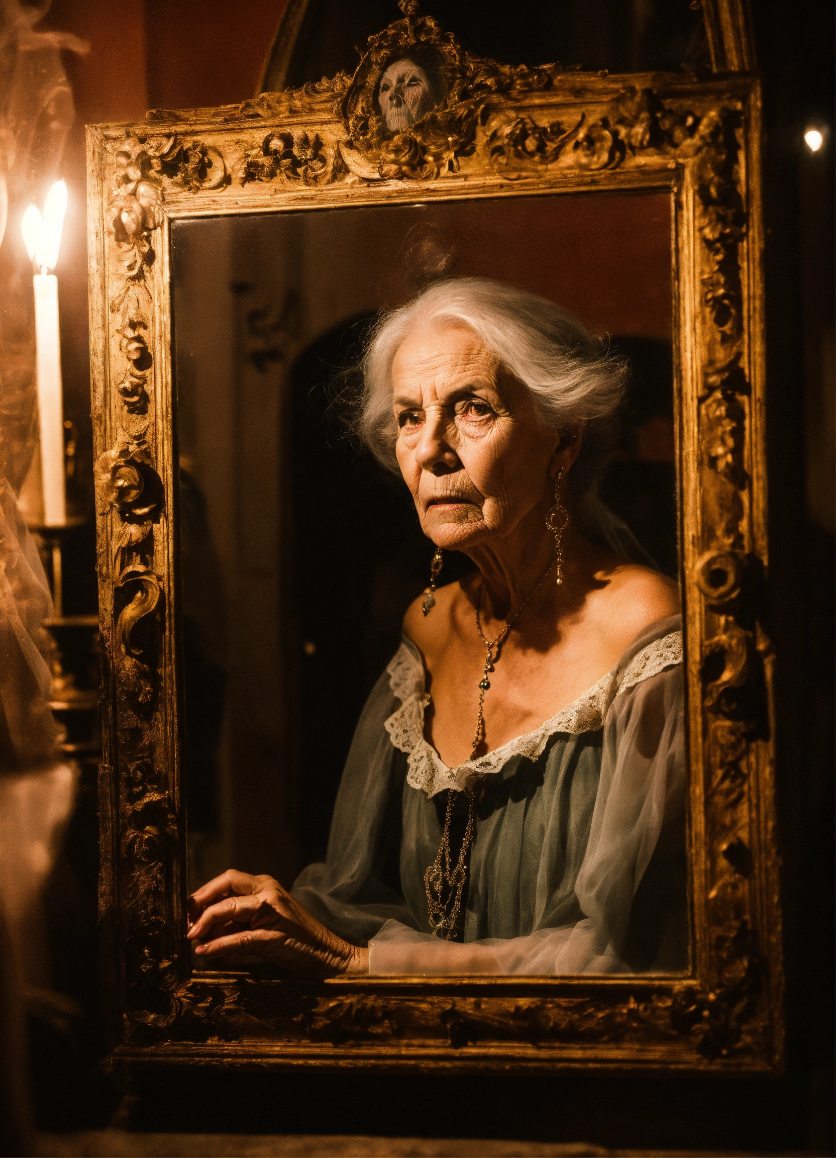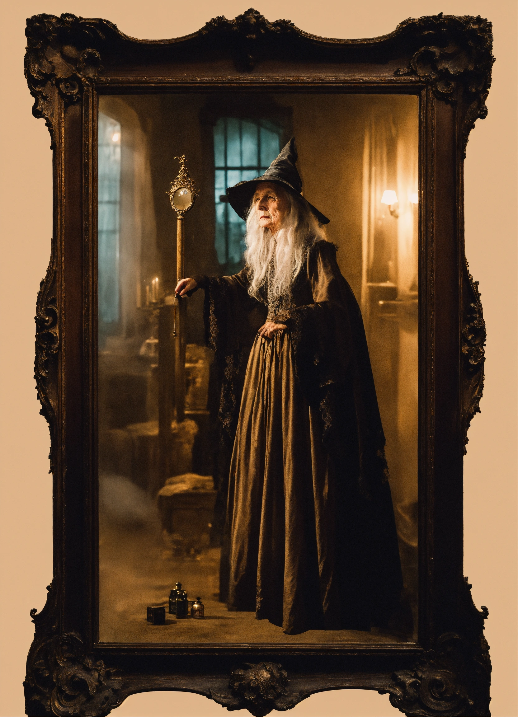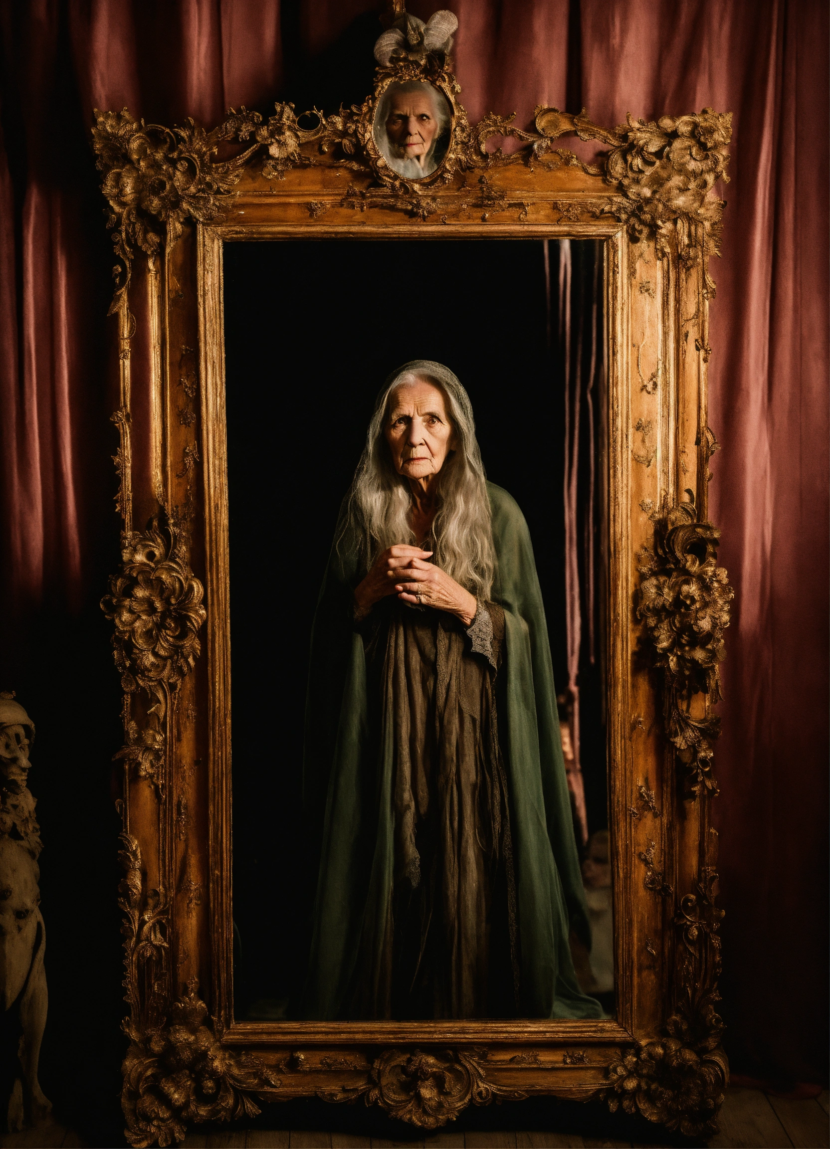 An image of a ghostly old witch looking outward in an antic mirror, embracing the mirrors frame, beckons onlookers into her realm
