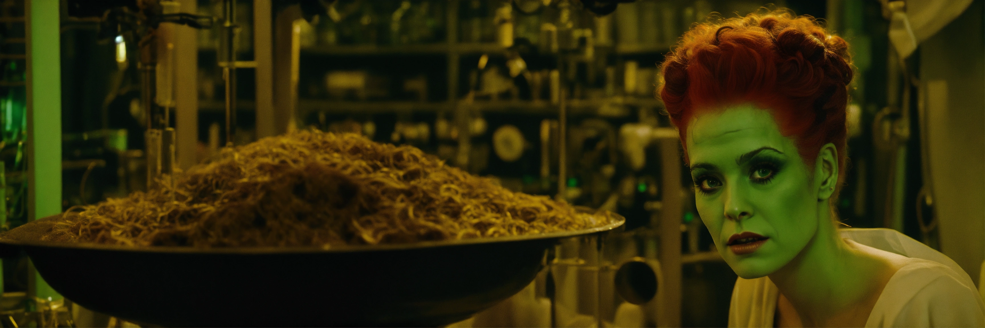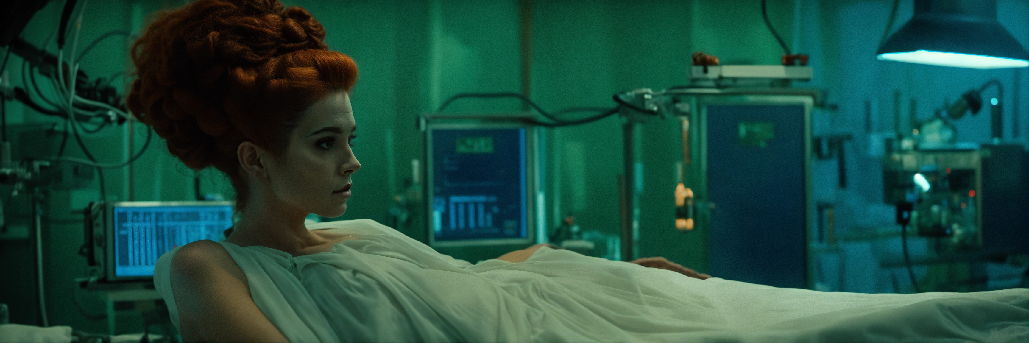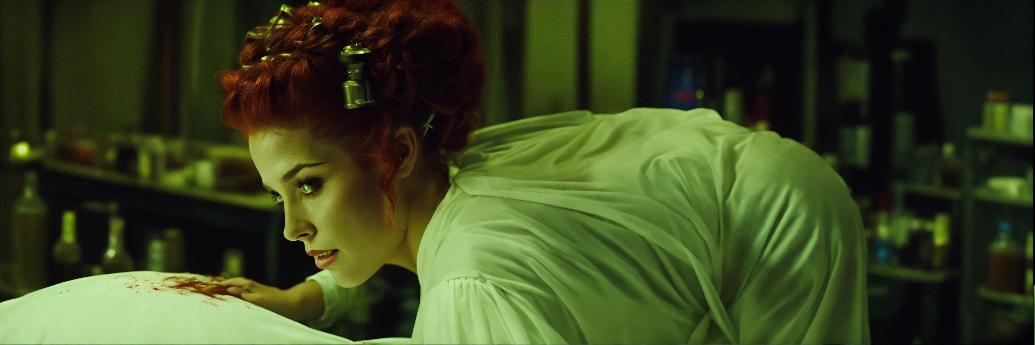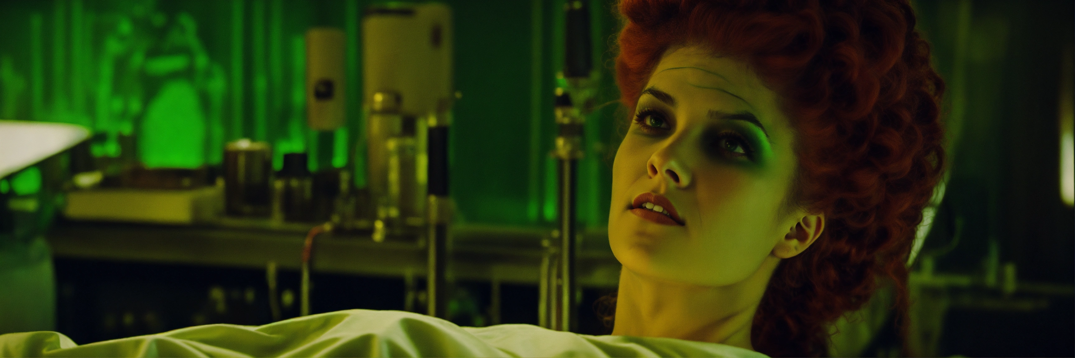 Redheaded green-eyed woman as the bride of frankenstein, rising up from the dead, off from on top of an operating table, from her back in a laboratory, she has white streaks through her hair, that run root to tip.