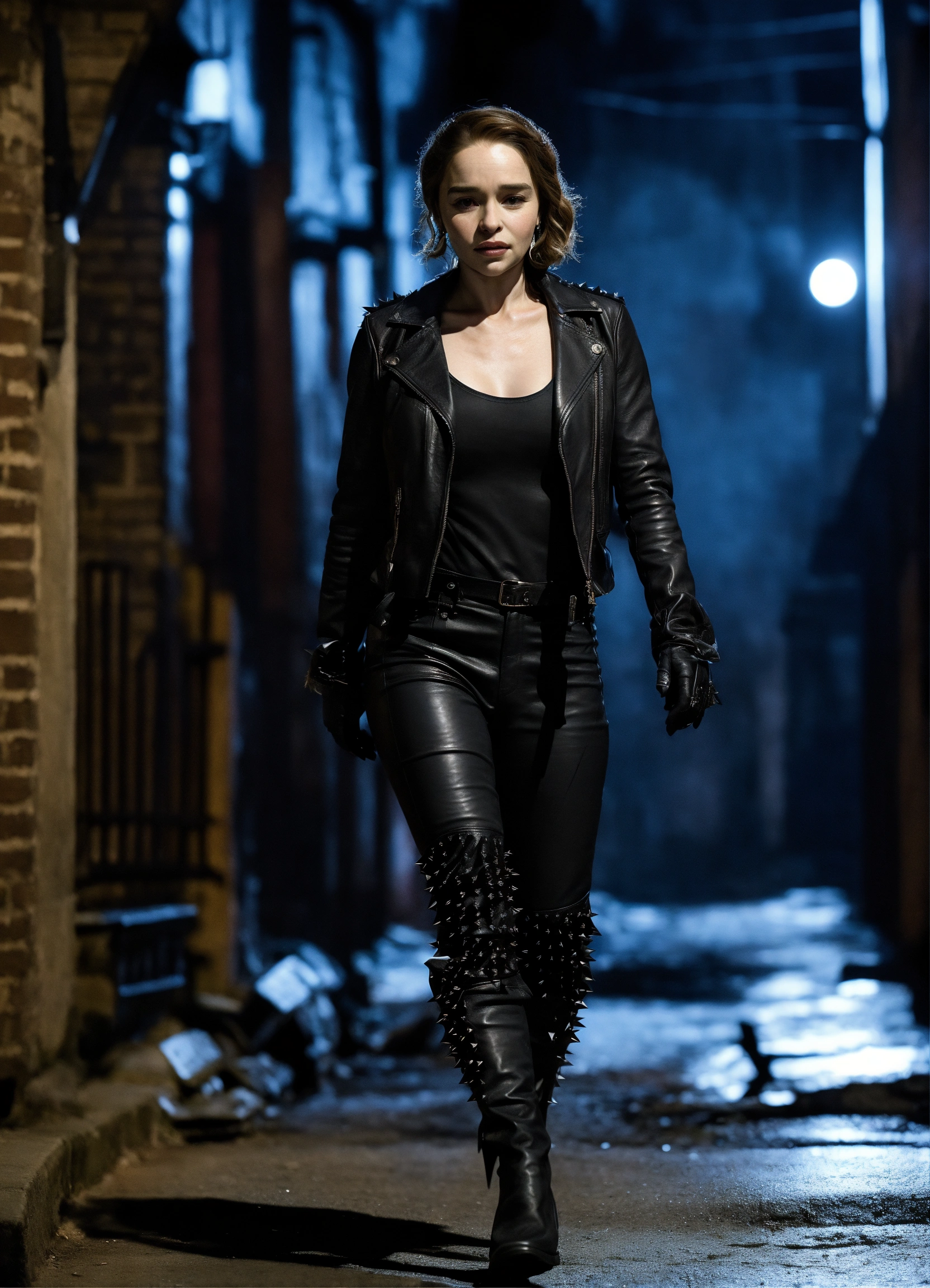 Emilia clarke gothic walking in a dark alley wearing black leather pants black leather jackets gloves spikes, hyper-realistic, photographic portrait at night