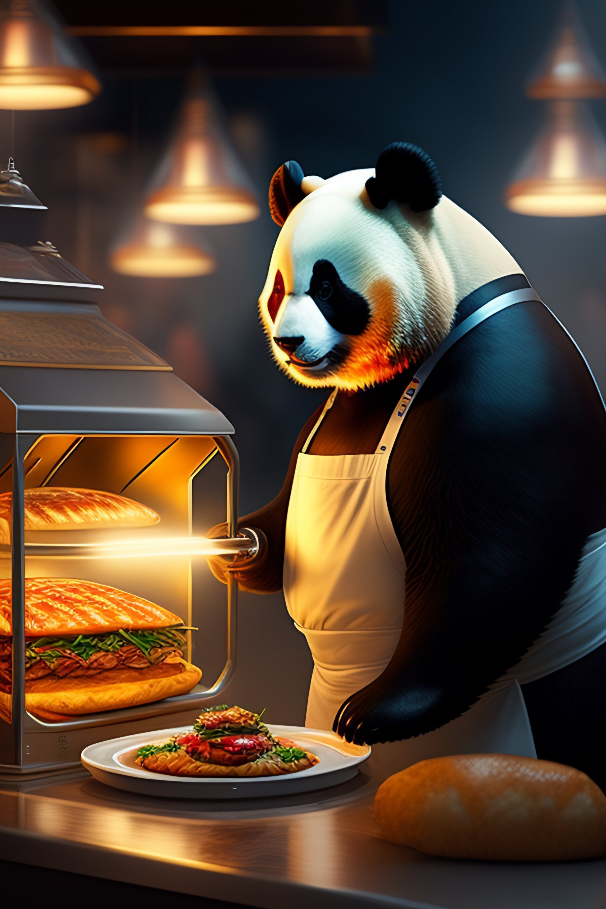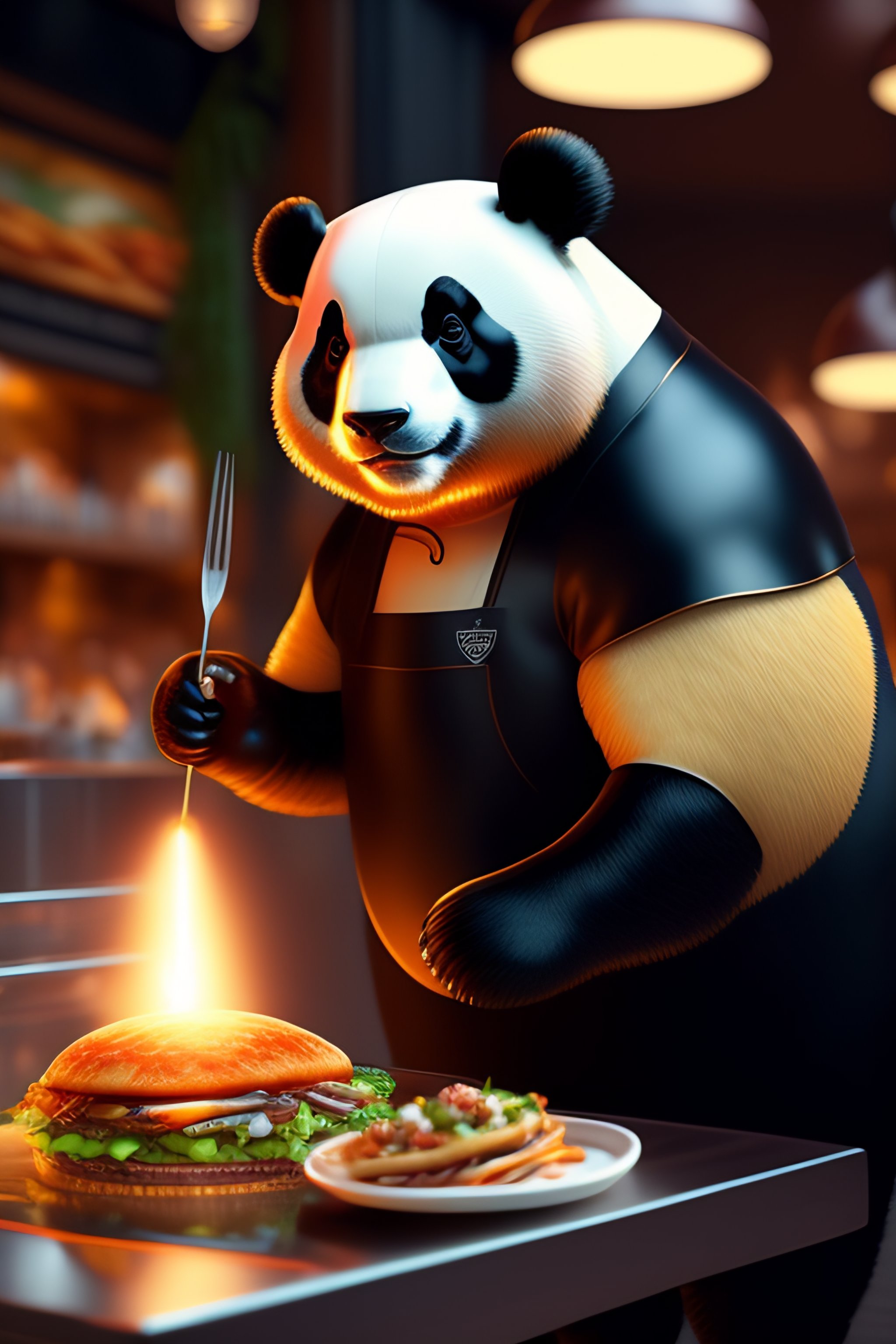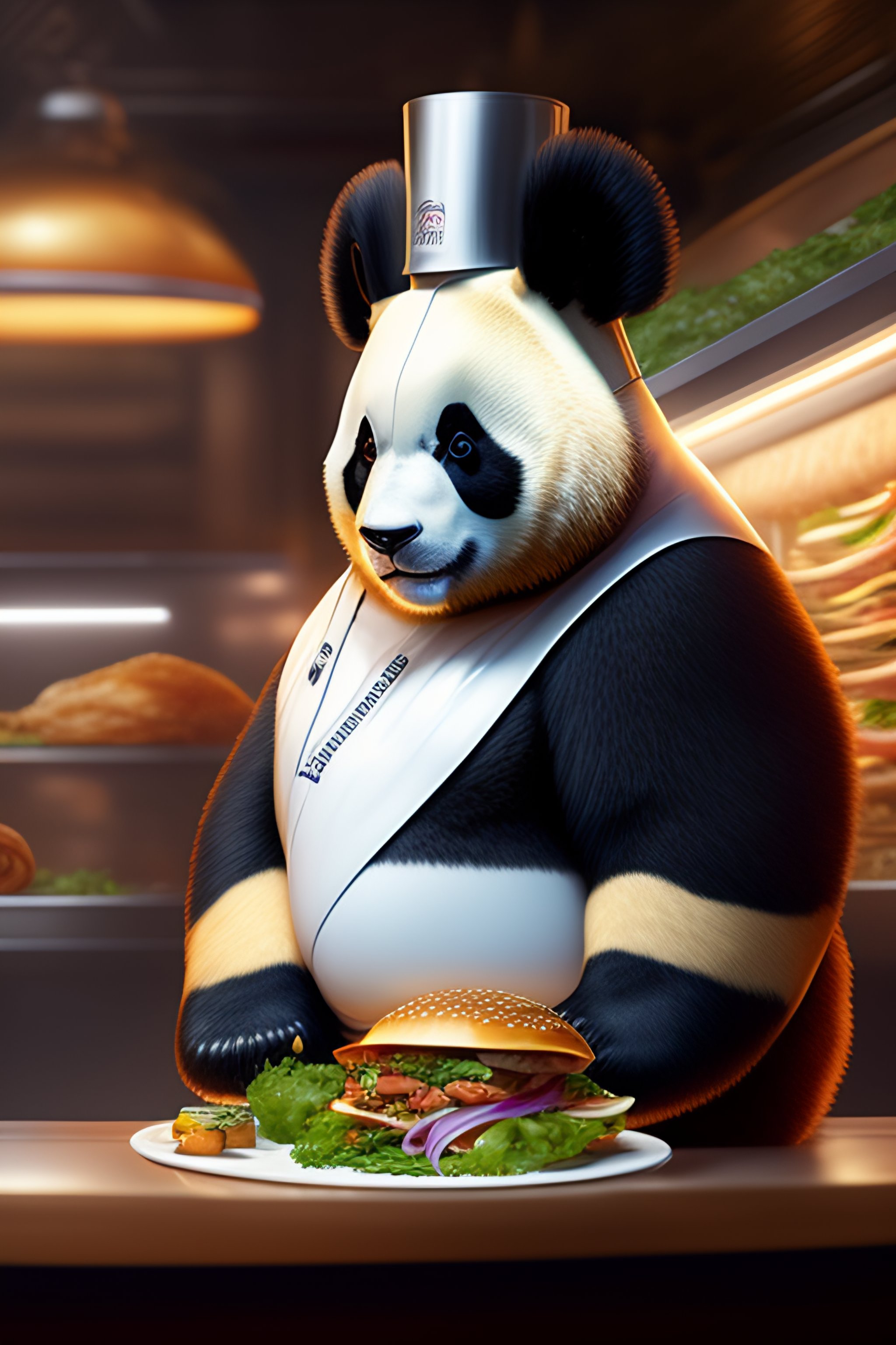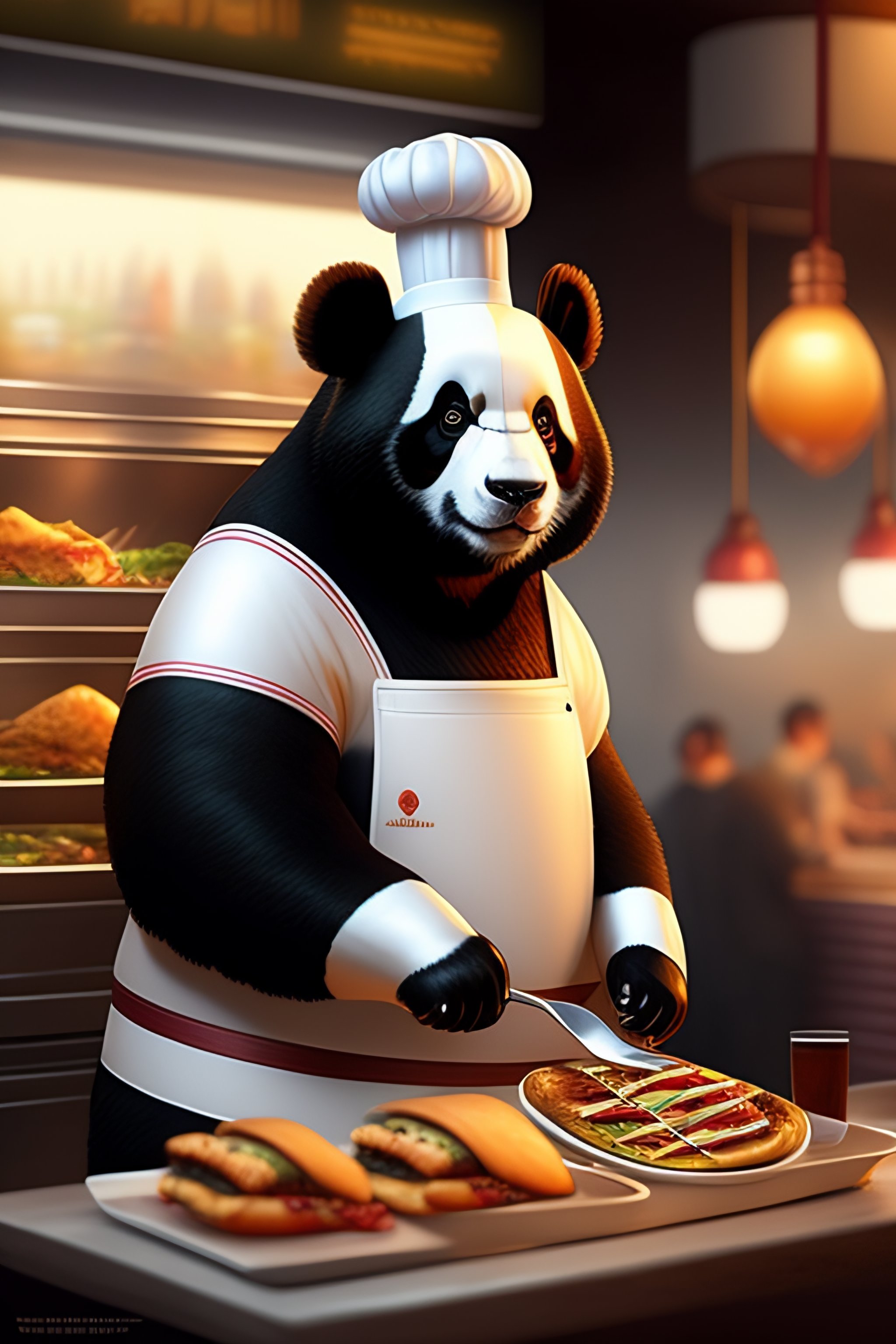 A panda bear wearing a chef hat and serving a kebab in a restaurant, sci-fi, extremely detailed, octane render, digital painting, concept art, smooth, sharp focus, illustration, incredible art by artgerm and greg rutkowski and alphonse mucha and simon stalenhag