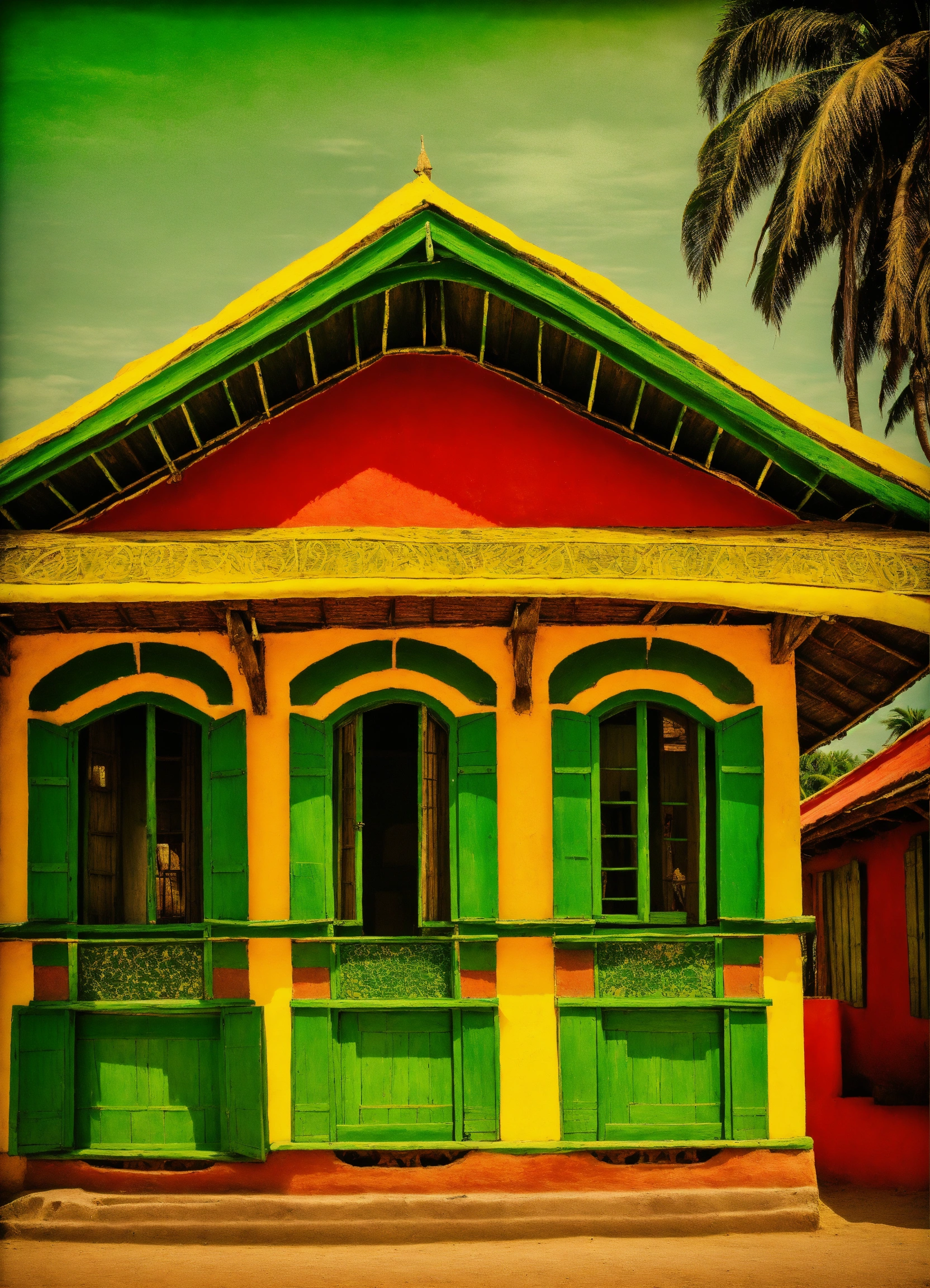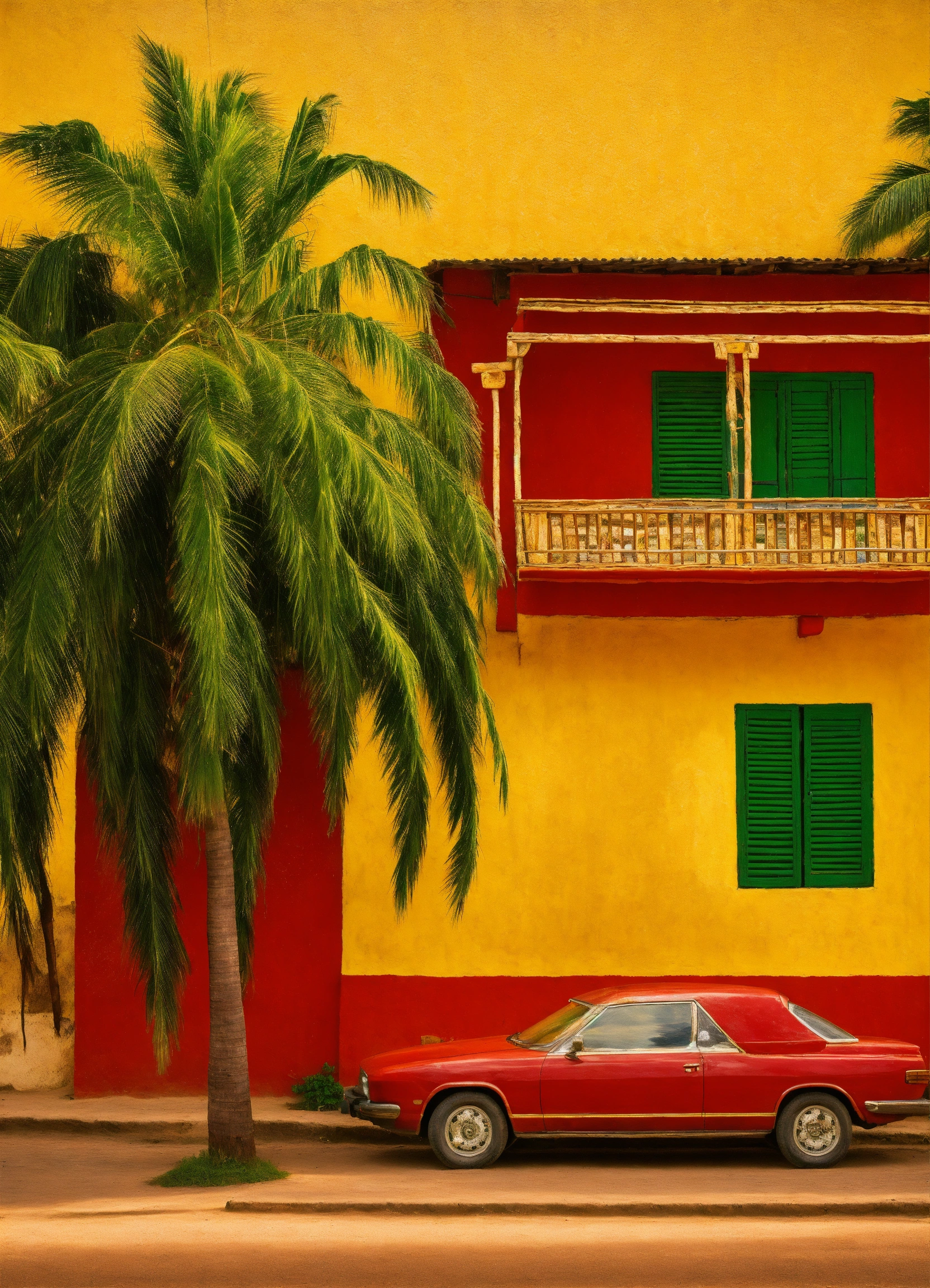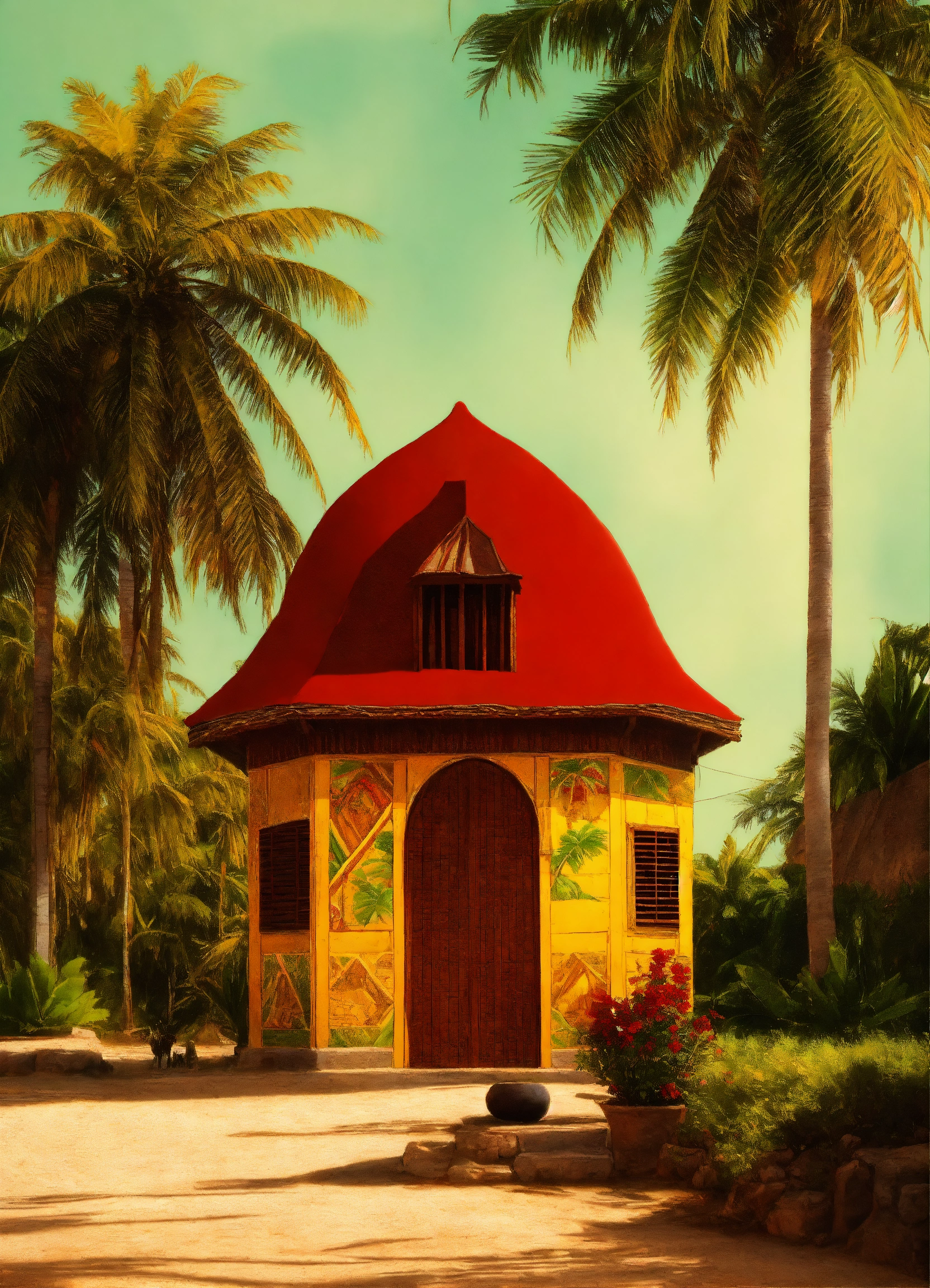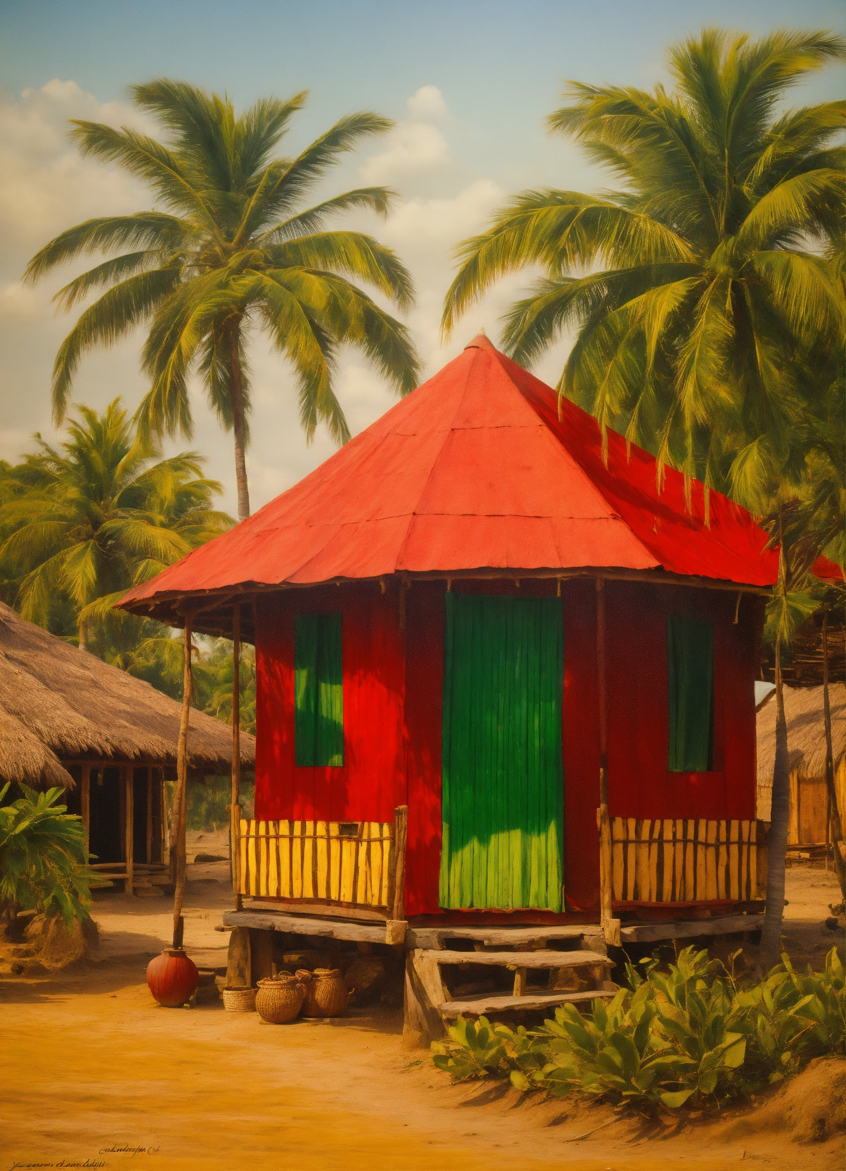 Red, yelow, green city, fine art, africa, styles, baroque, leonard da vinci, caravagio design, presence of african hut, coconut palm, tree