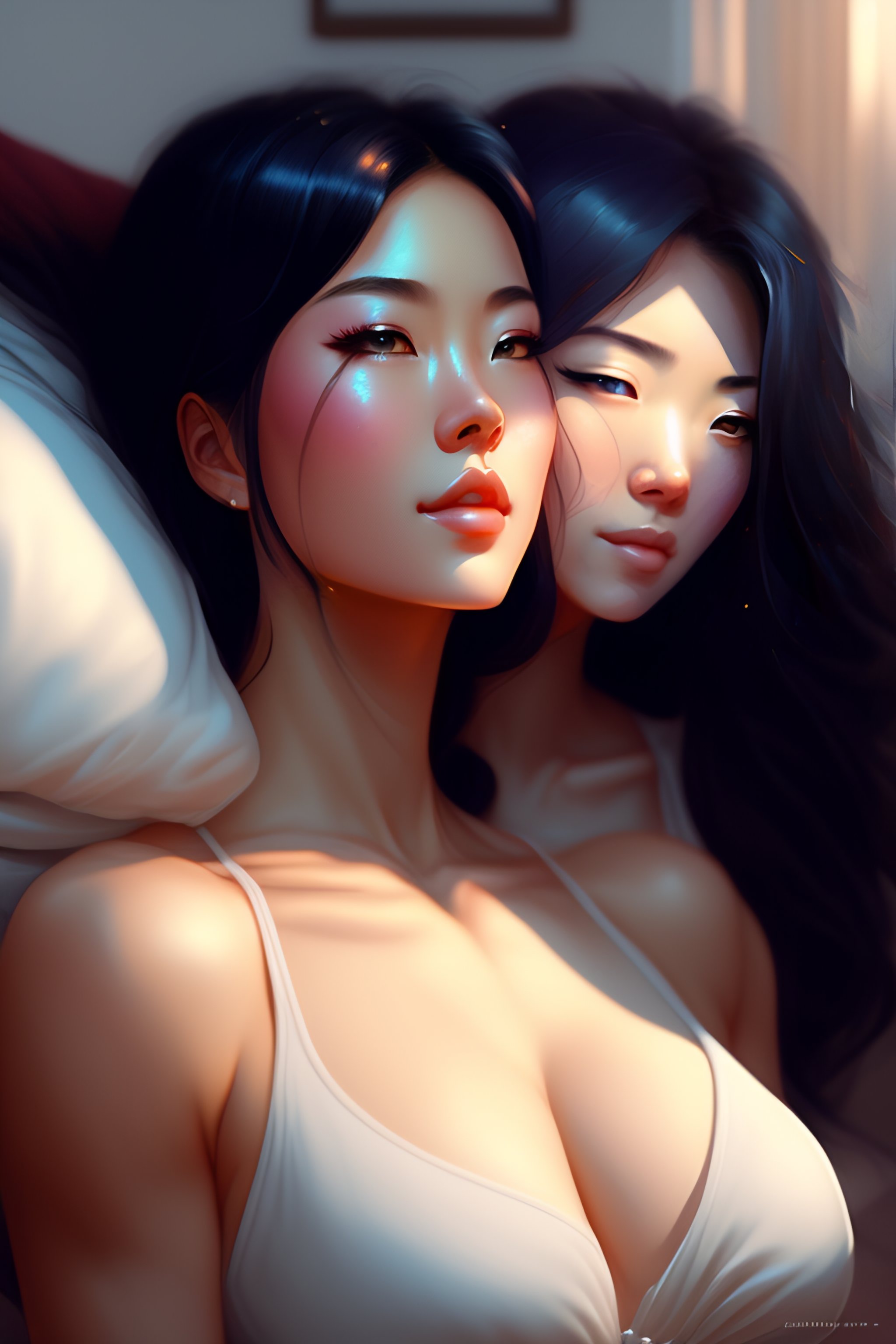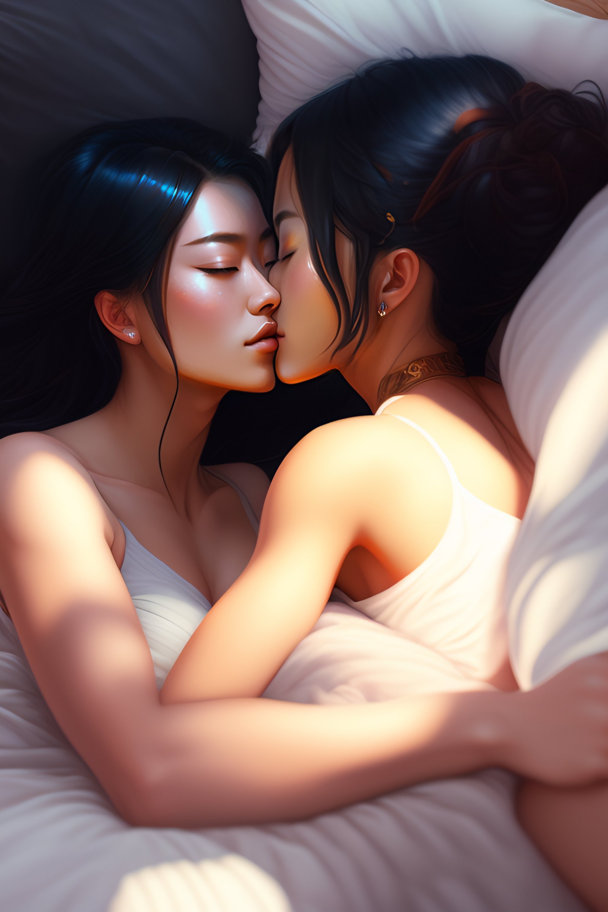 Two muscular girls kissing, clothed, laying in bed, sharp details, sharp focus, elegant, highly detailed, illustration, by jordan grimmer and greg rutkowski and pine ( ハイネ ) and 薯 子 imoko and 香 川 悠 作 and wlop and maya takamura, intricate, beautiful, trending artstation, pixiv, digital art