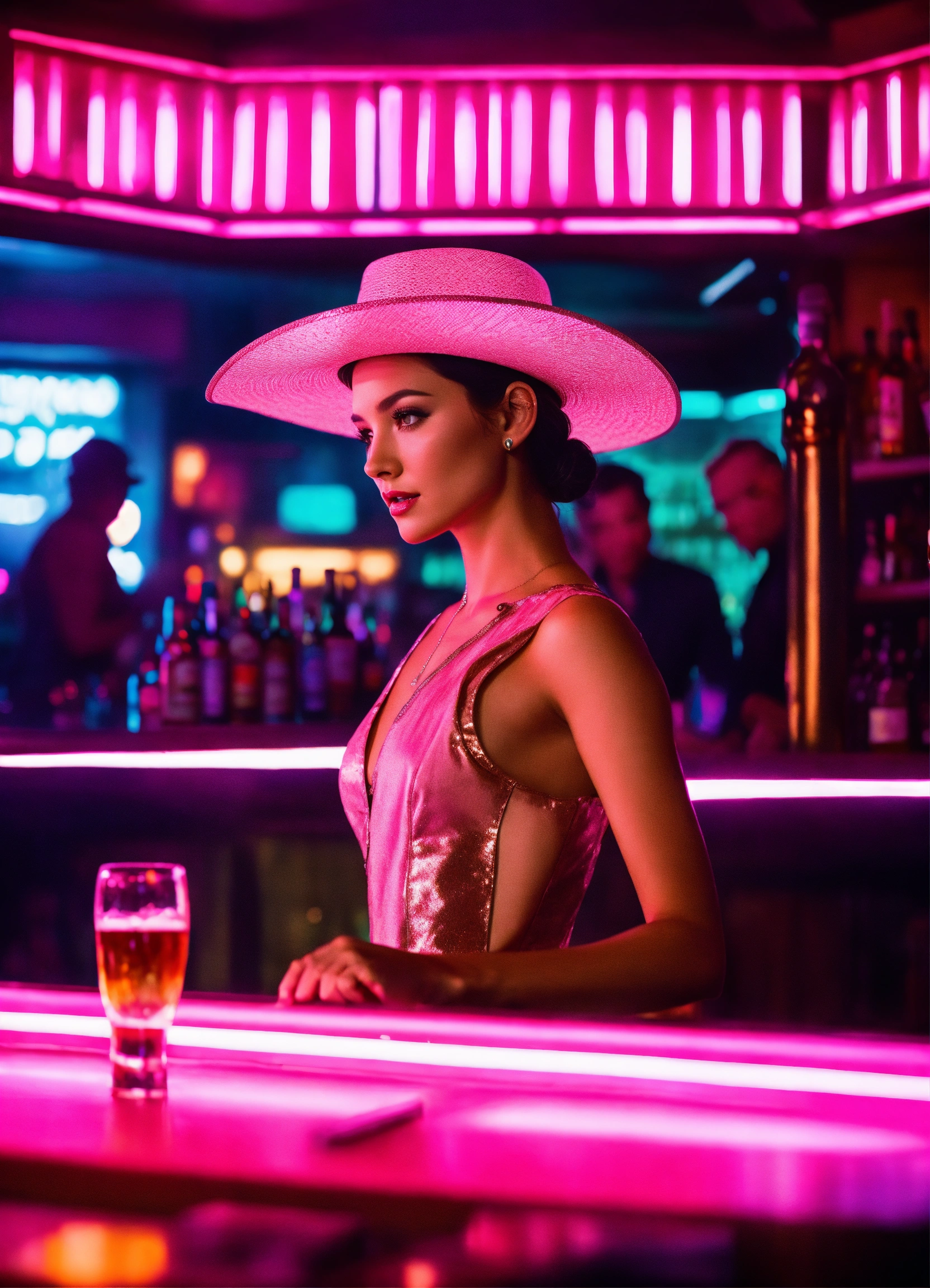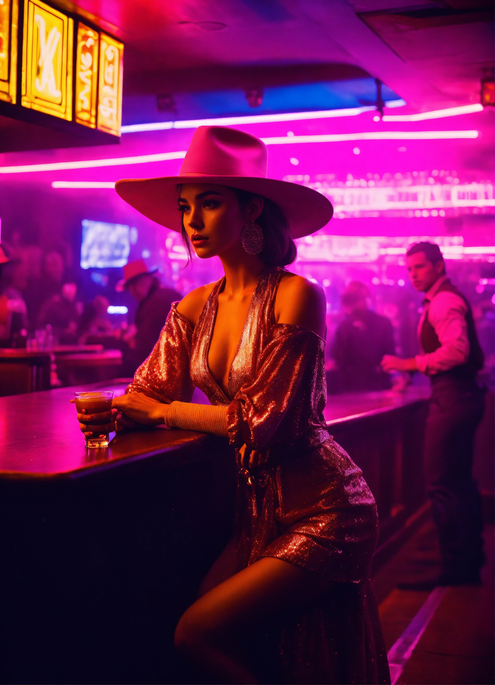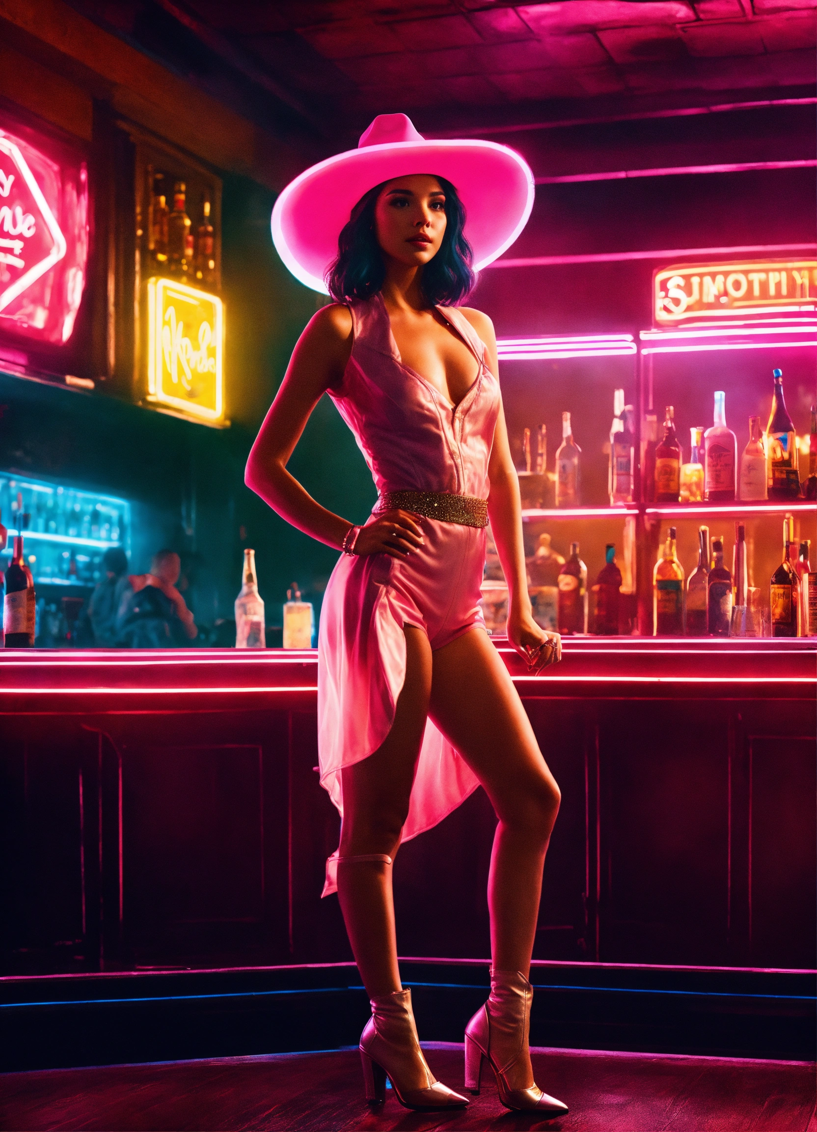 A southern beauty queen dancing in a dimly lit, dystopian bar. she wears a light pink cowboy hat. blade runner 2049.