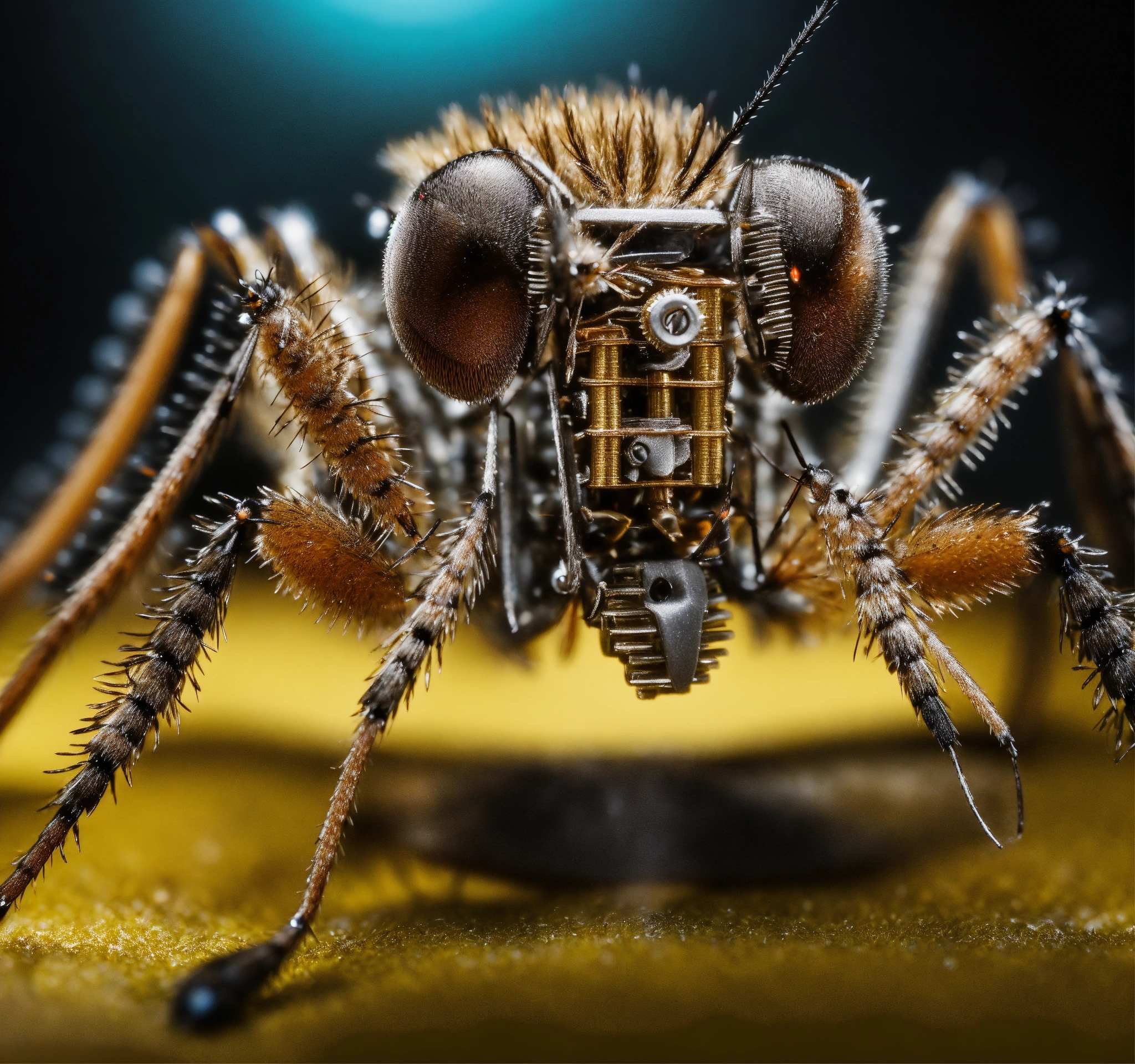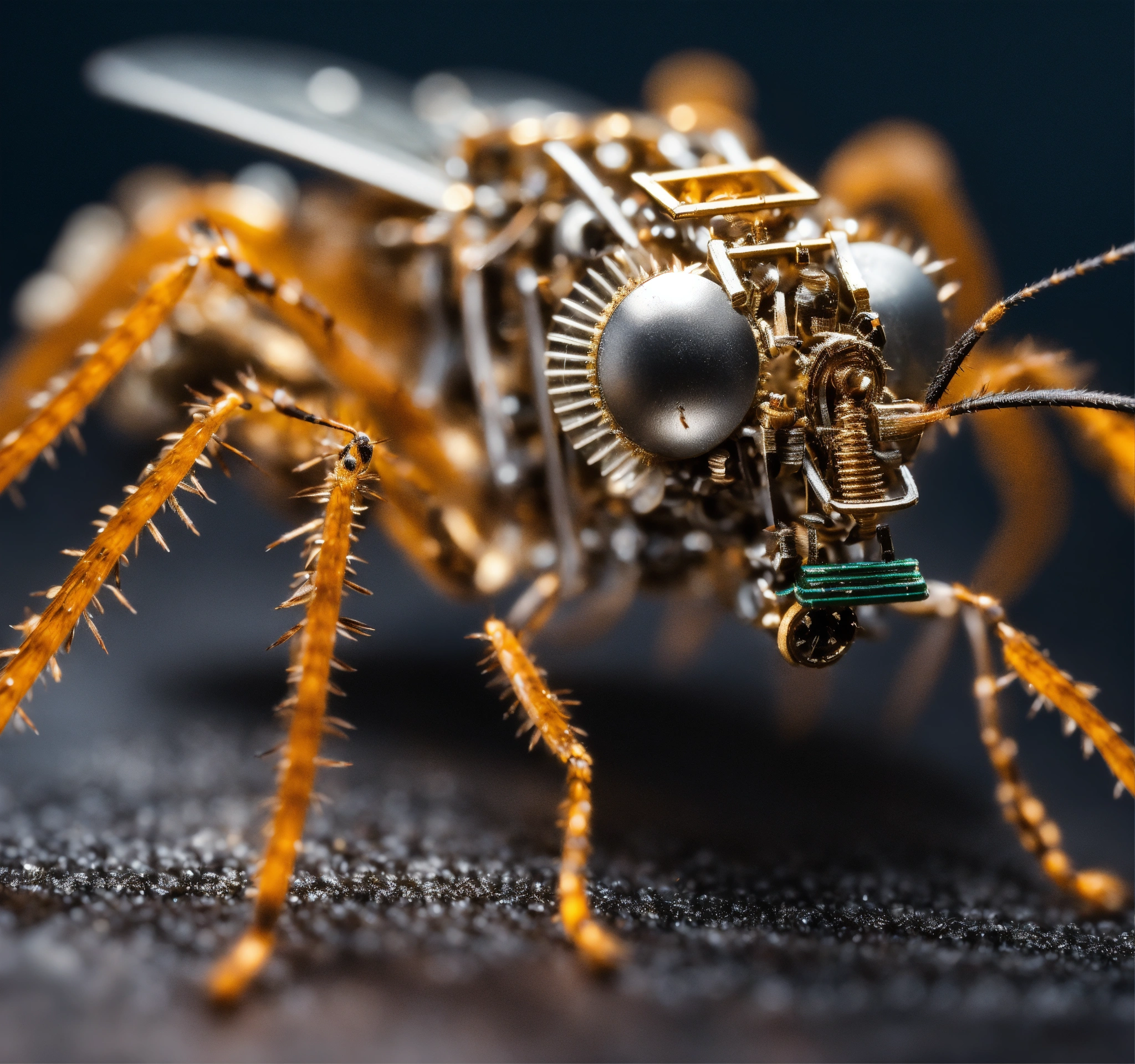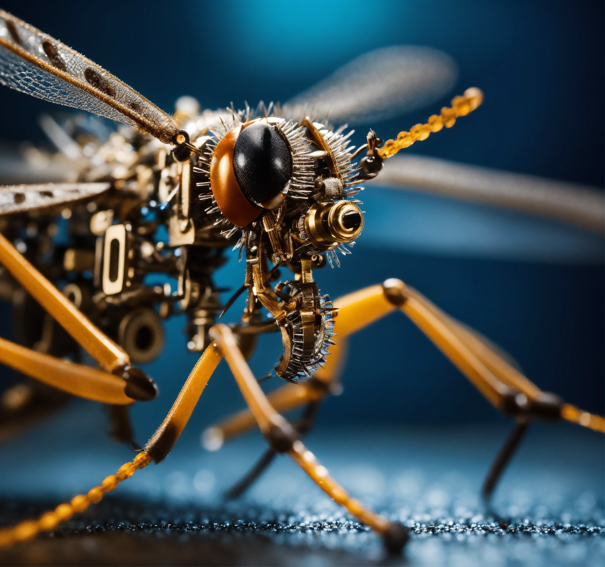 12k photo, no text, movie poster, macro shot of an intricate tiger mosquito made from tiny parts and mechanical watch gears, highly detailed, extremely close up view, studio lighting, dynamic, macro photography
