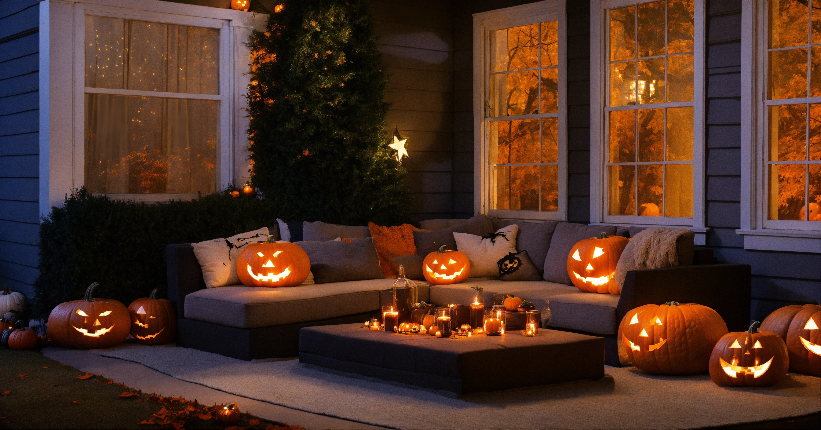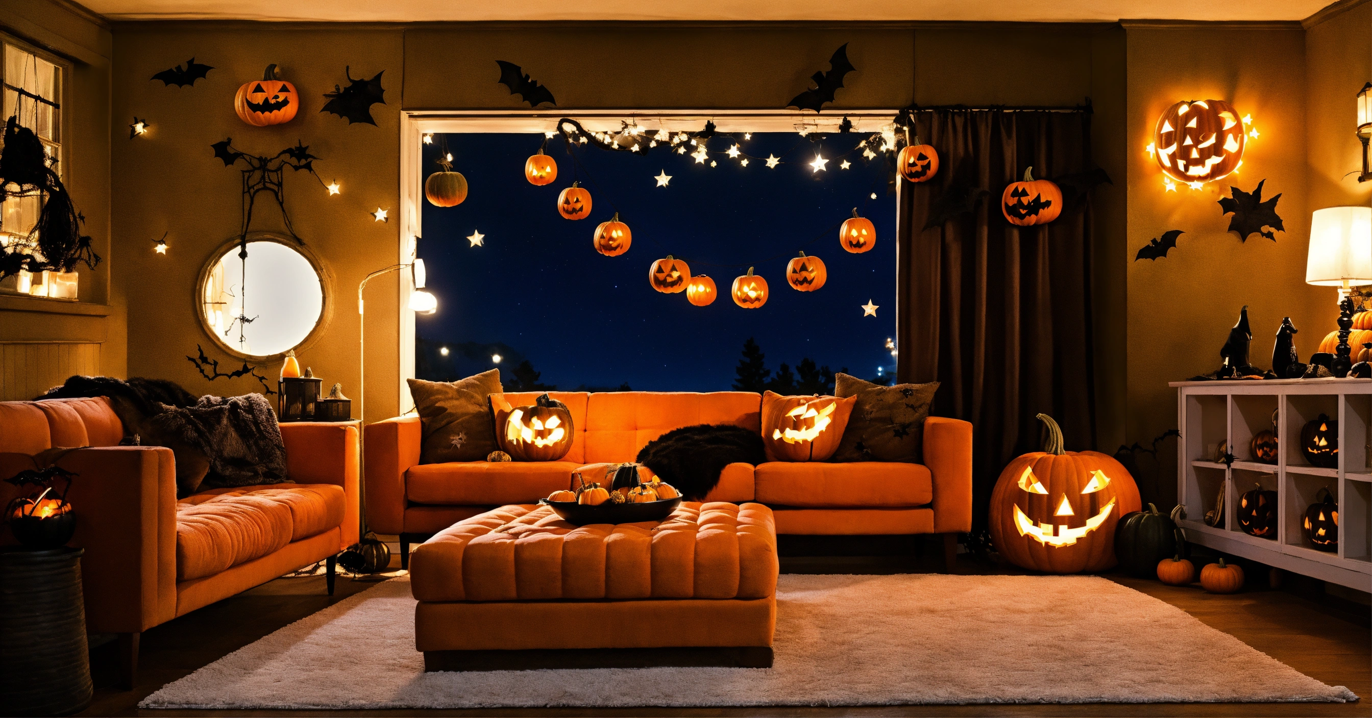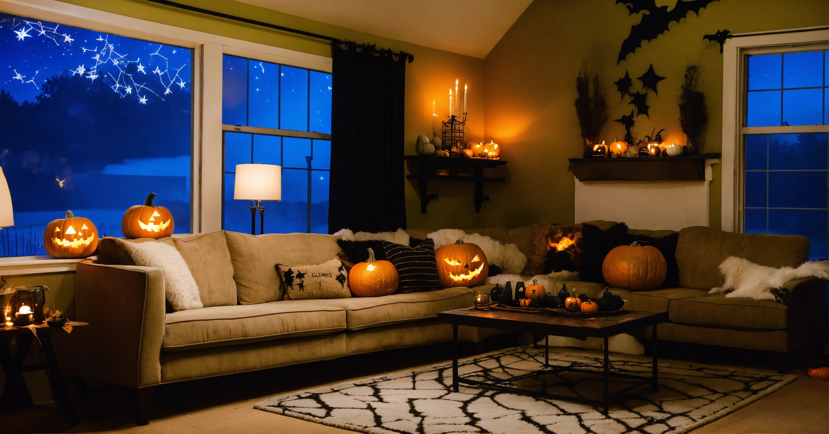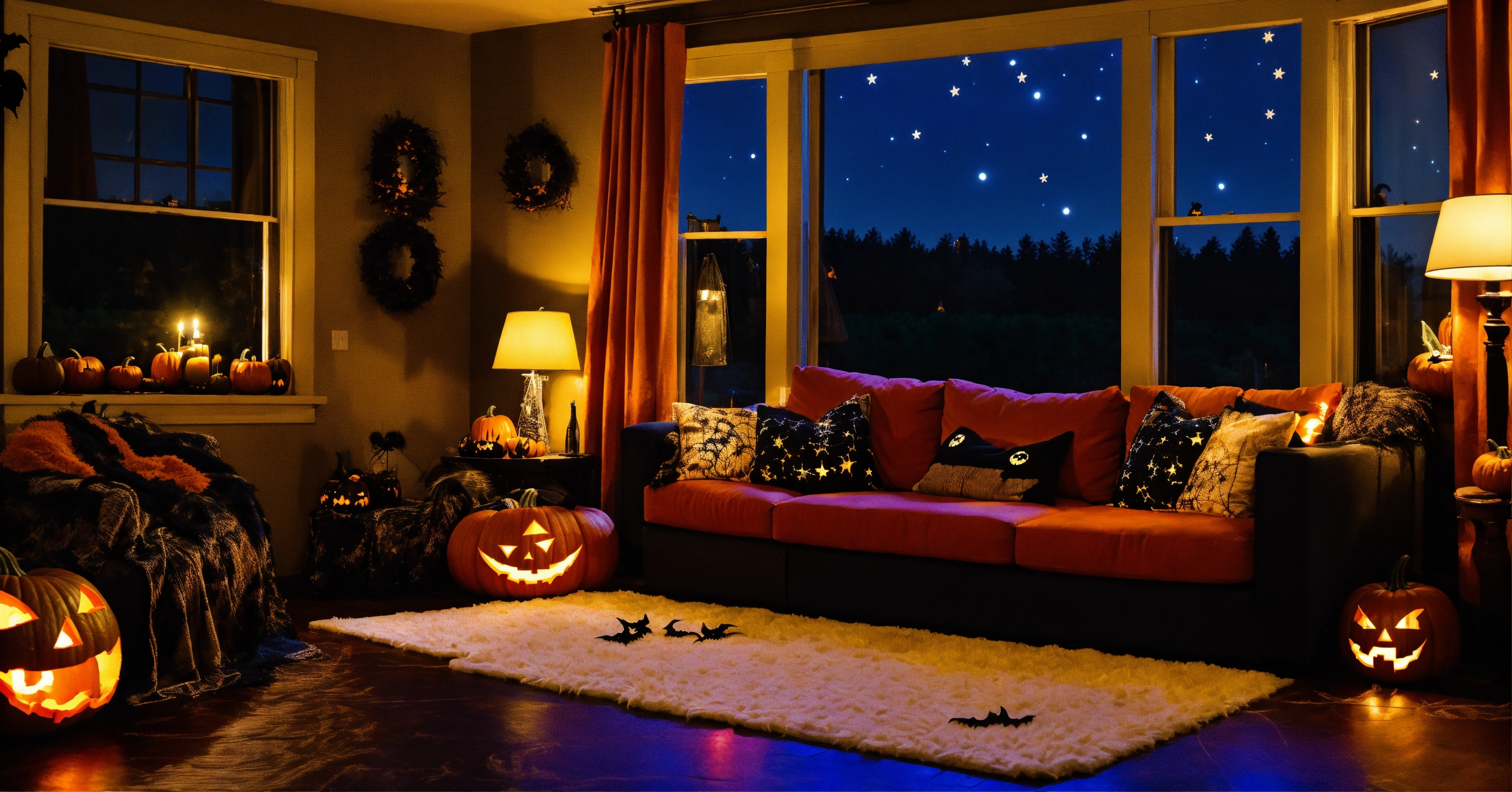 Living room halloween forest, halloween theme, big couch, fluffy rug, pumpkins, night time windows, stars, outdoor patio