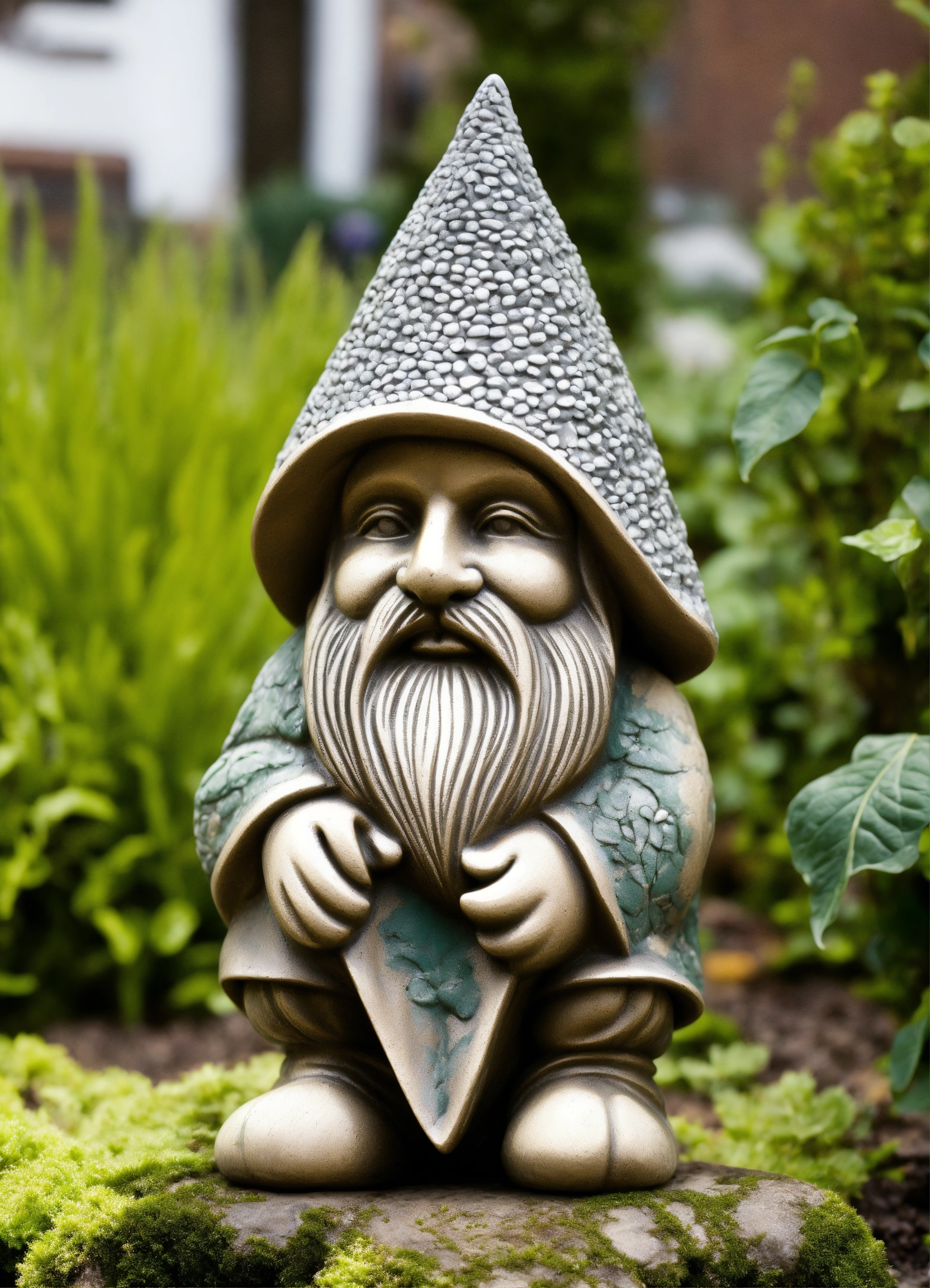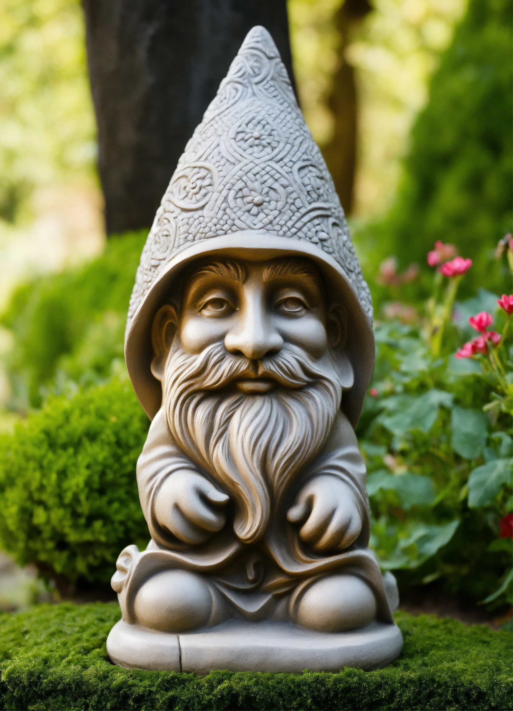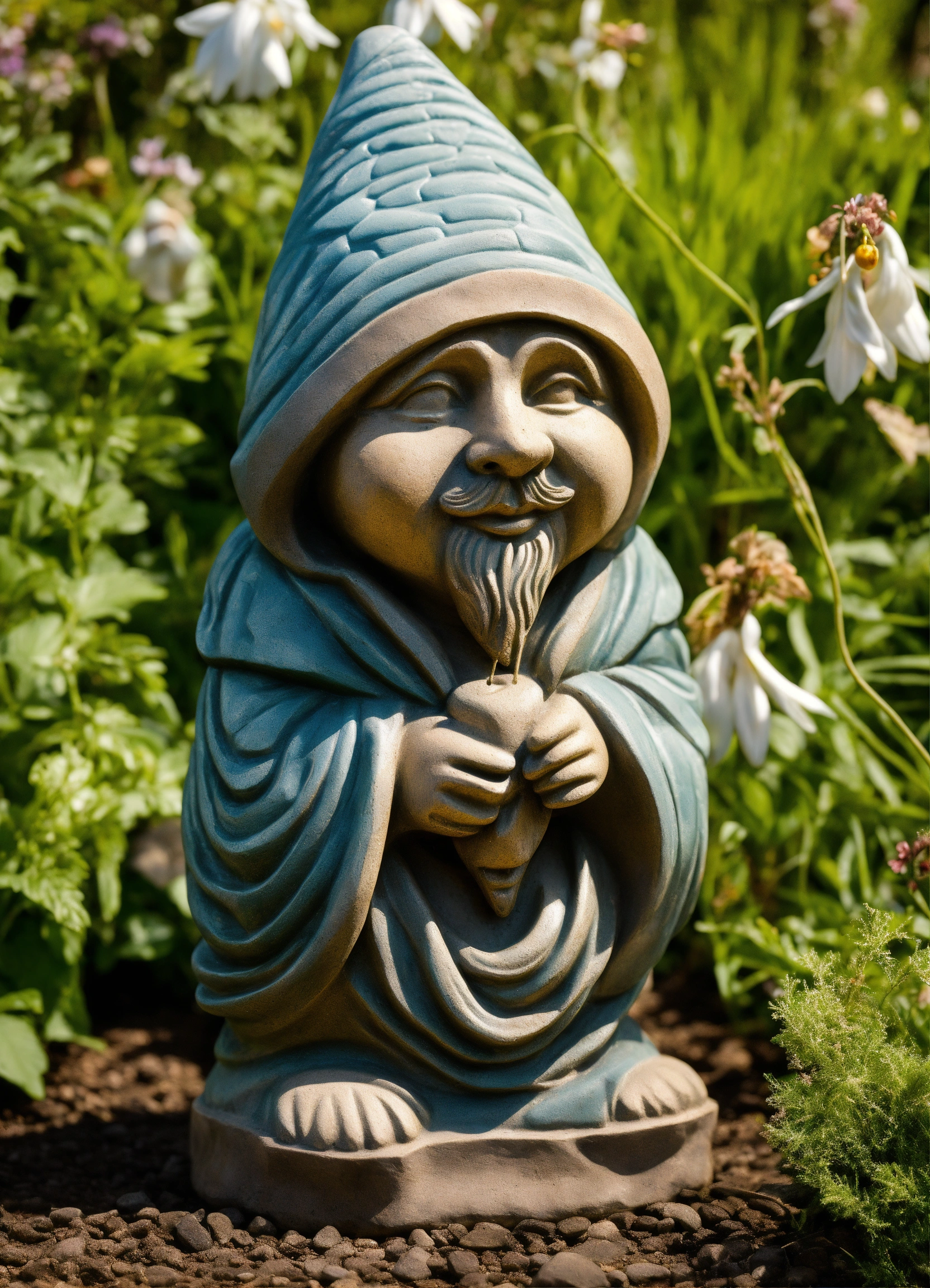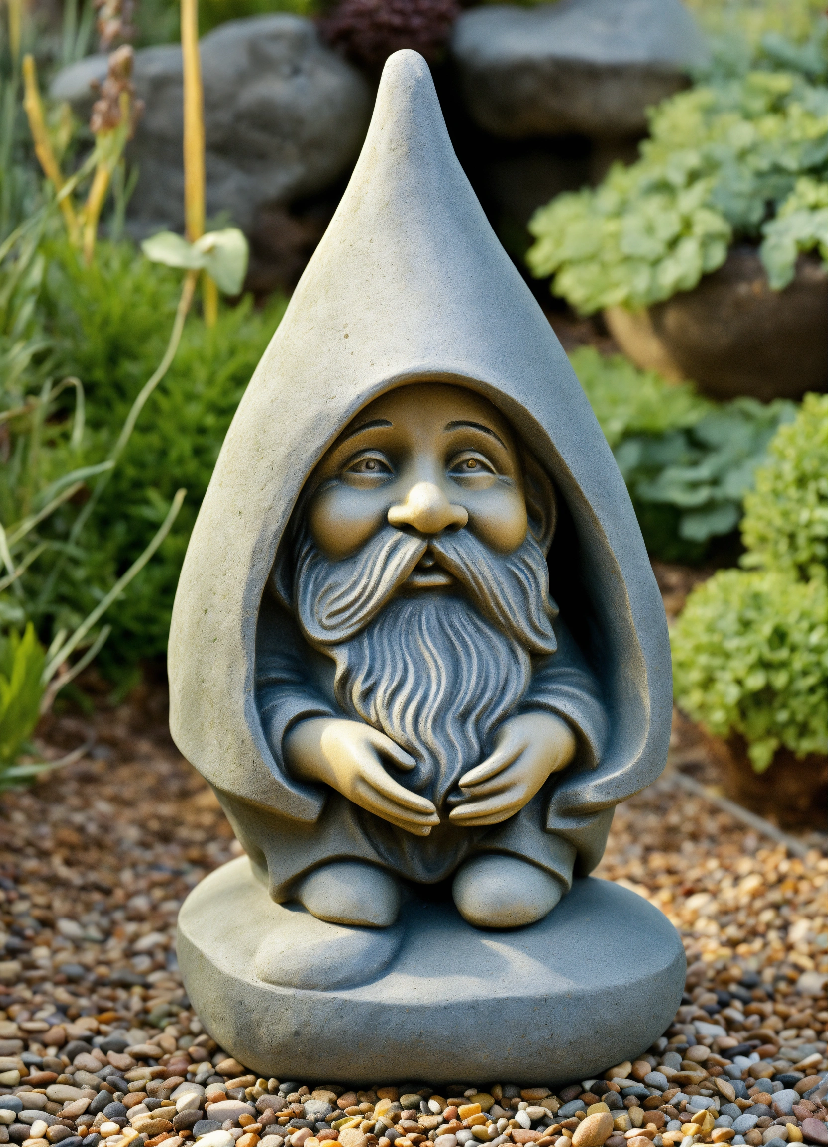 An ancient stone hooded sculptured garden gnome teardrop shaped