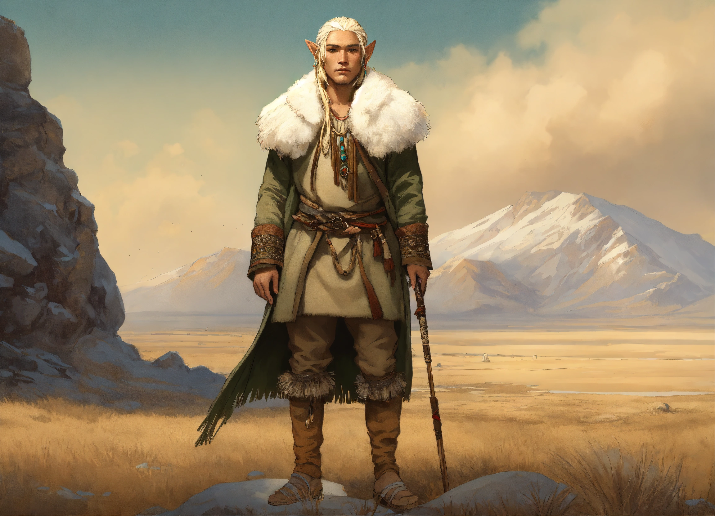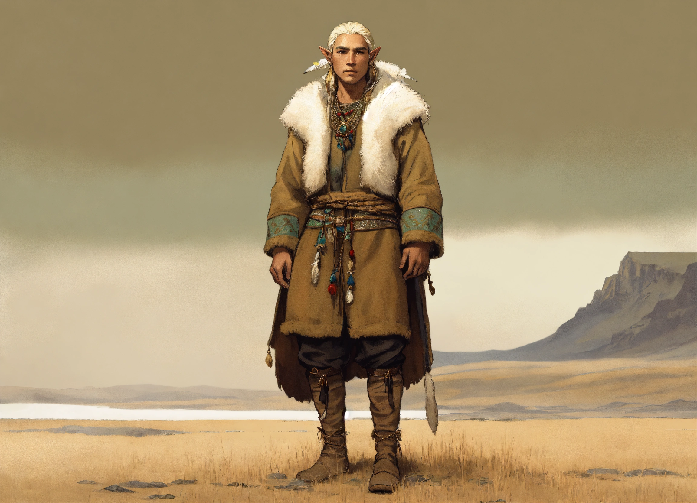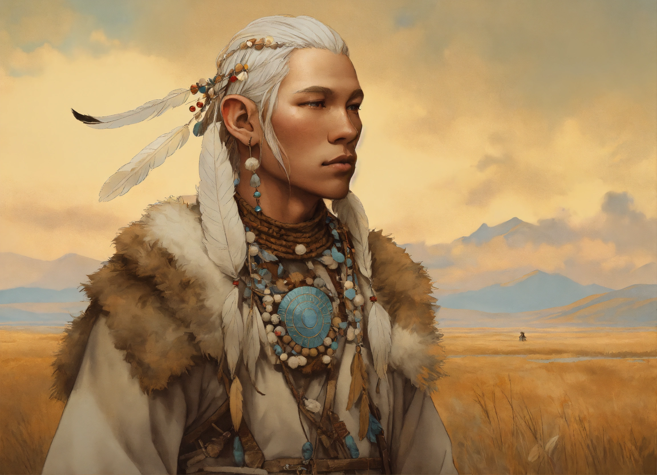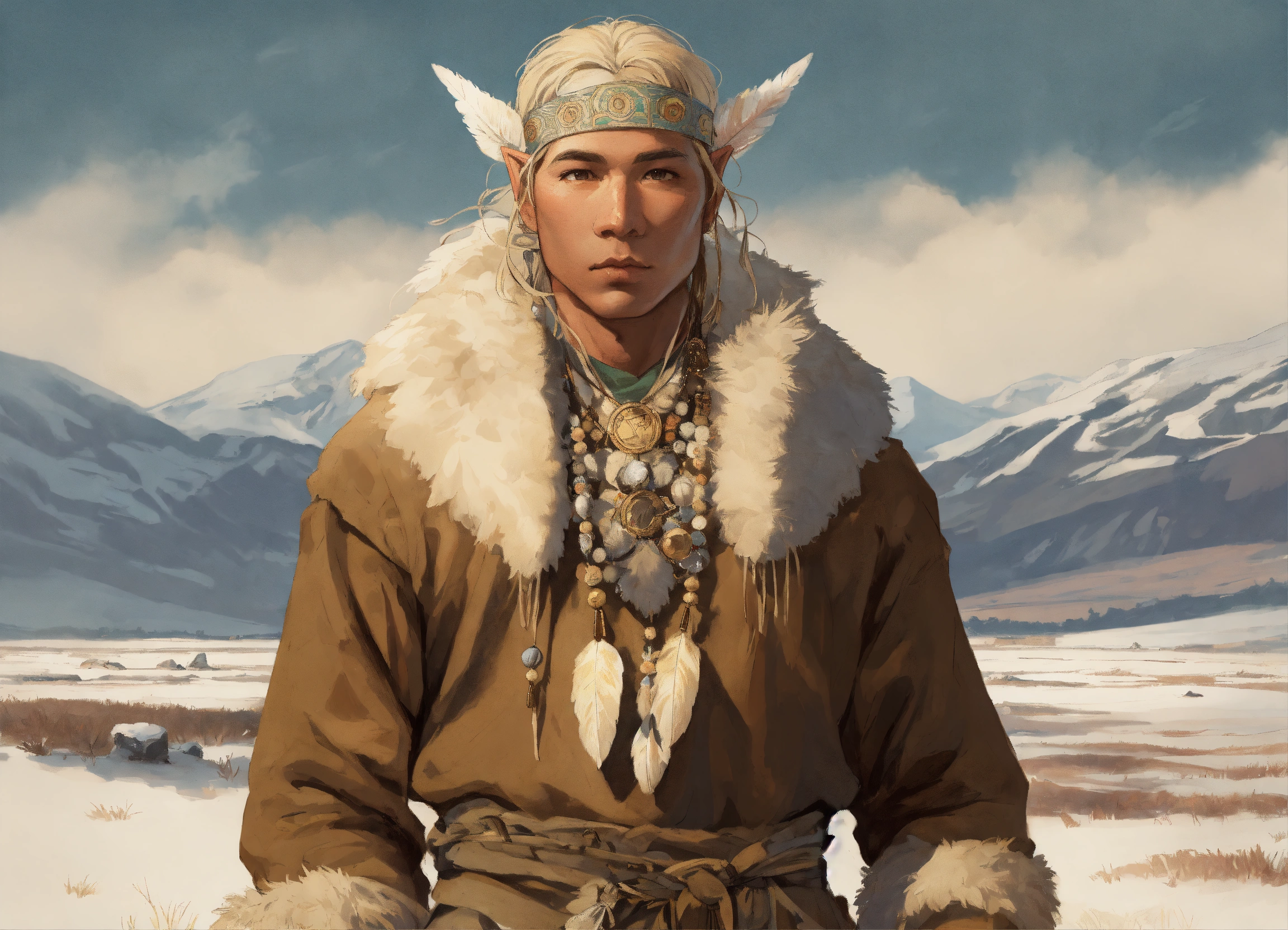 Full body illustration of an elf inuit man, native american phenotype with blonde hair and albino skin, wearing stone age warm clothing made from natural fabrics like linen, cotton, or furs, adorned with feathers, beads and shells, standing on the steppe tundra landscape, gloomy and depressing ambient, artwork by greg rutkowski, alphonse mucha, detailed face, detailed skin, highest detail quality