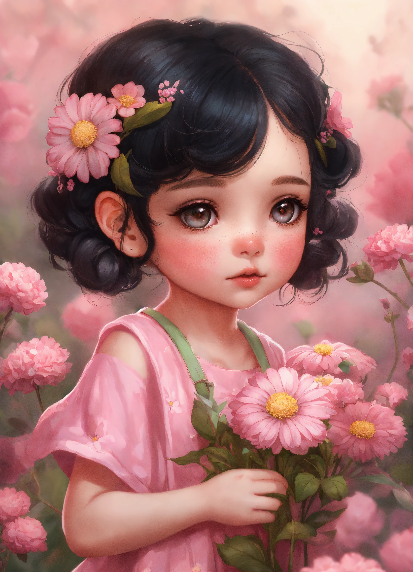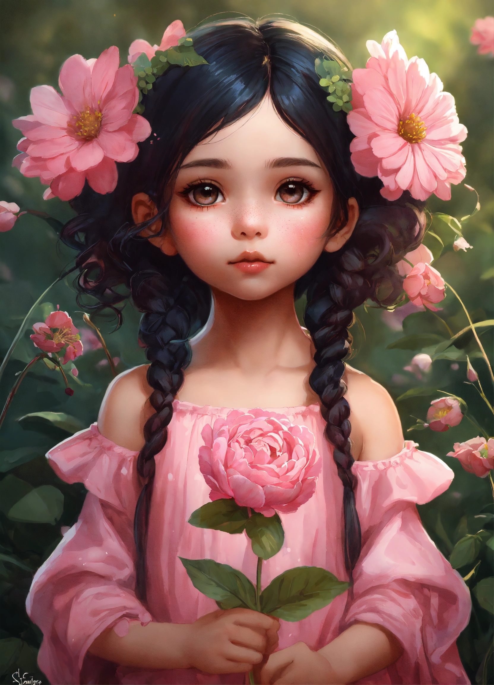 Portrait and shot full body of a sweetness pink baby fairy chibi girl freckled, two braids in her black hair, big eyes she puts her nose close to a flower to smell it, she is smelling a flower, clipart digital art style, very detailed, by stanley artgerm and tom bagshaw, 2k