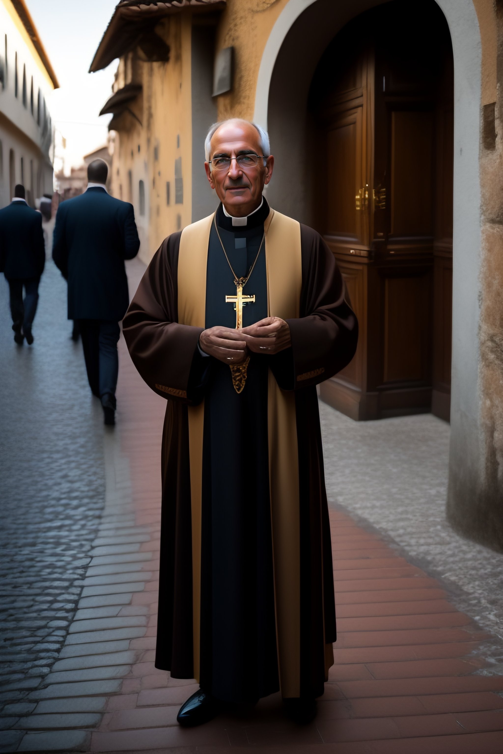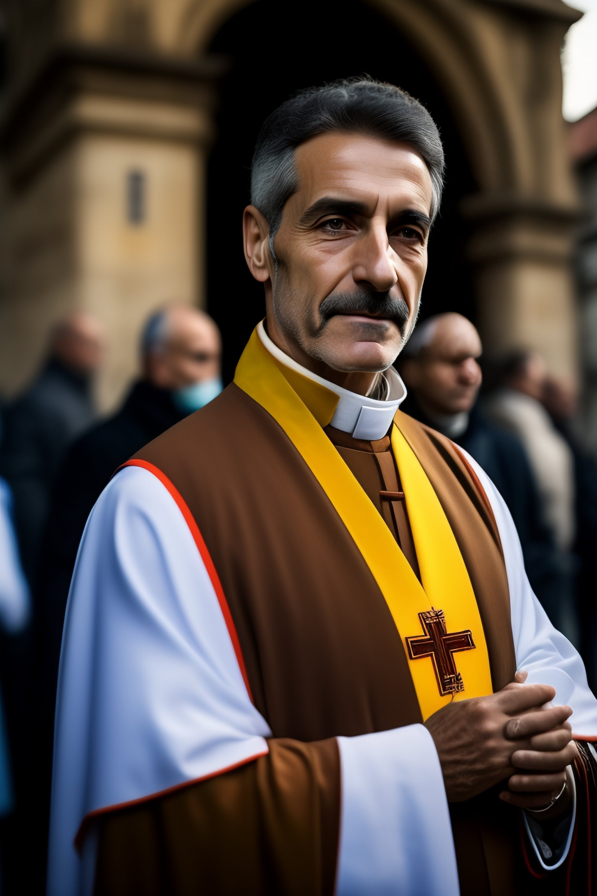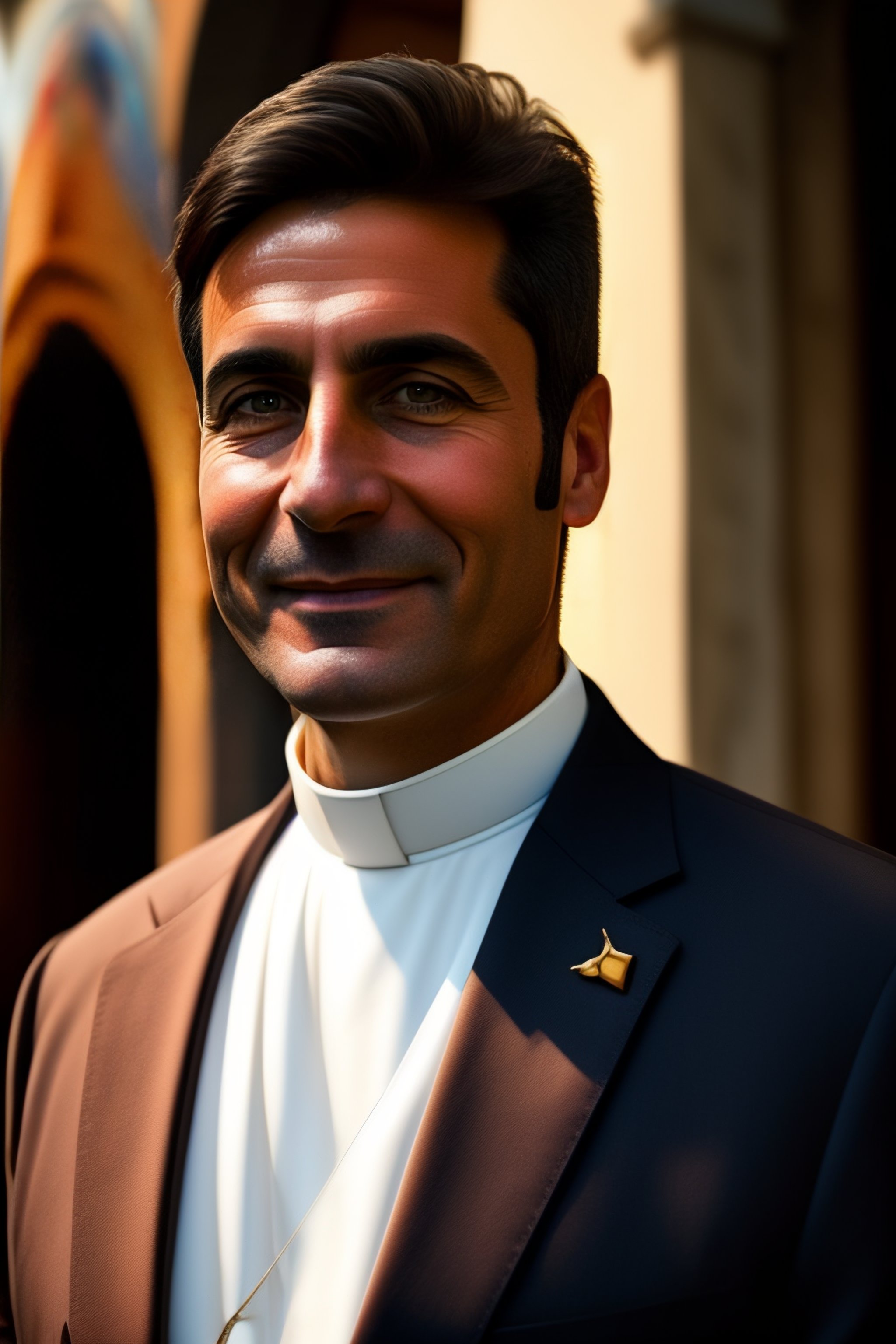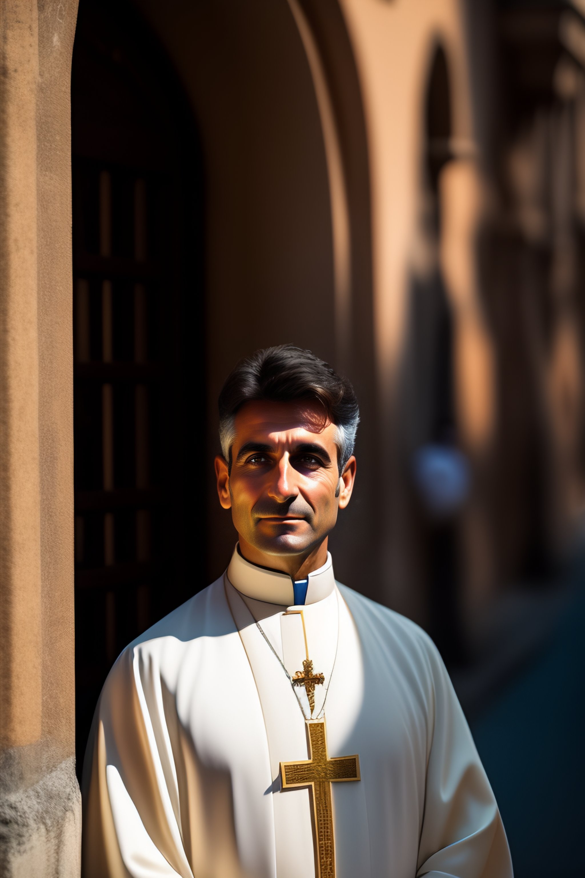 Italian priest with short brown hair, calm, with compassionate eyes, background outside italian church