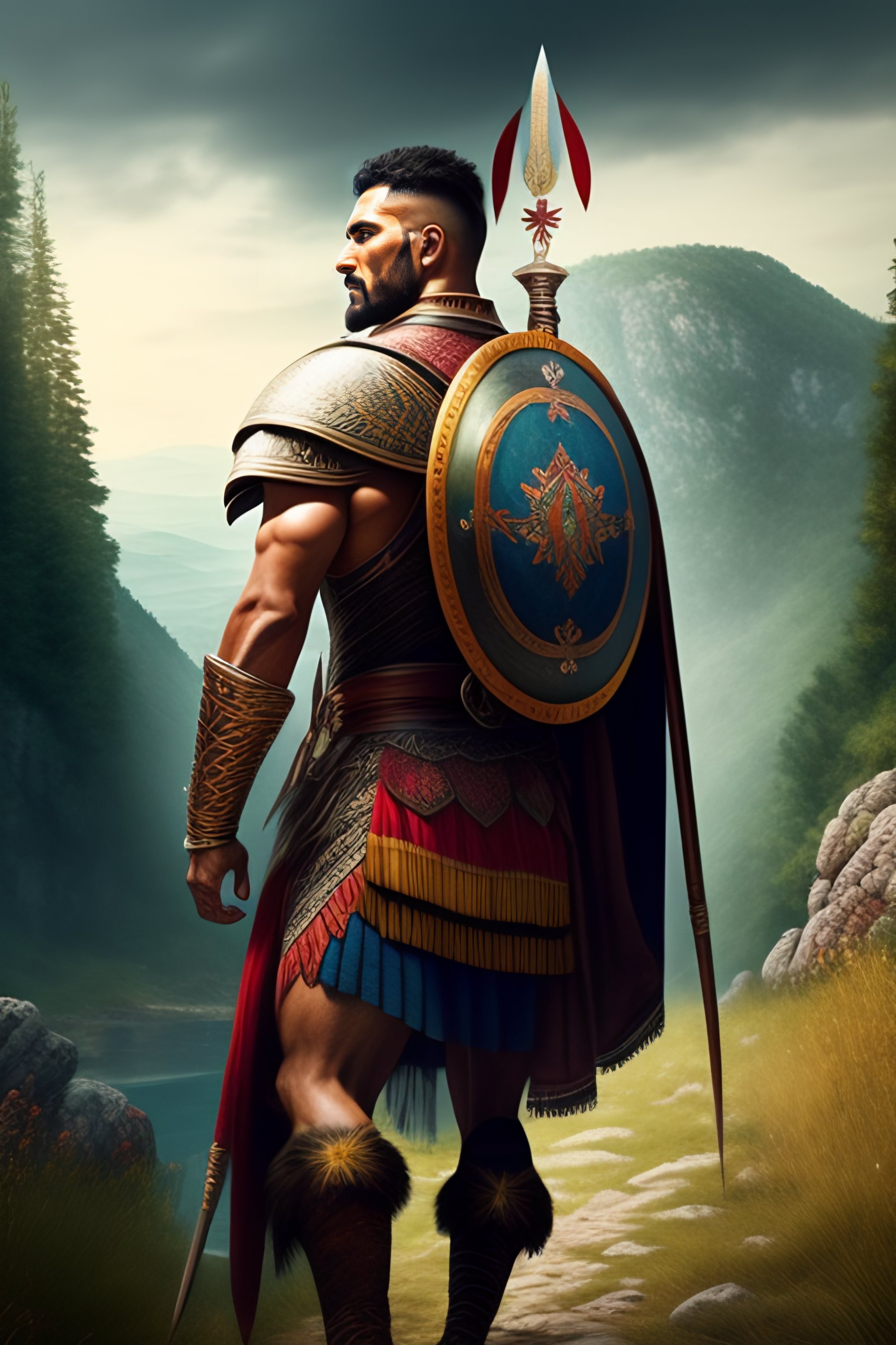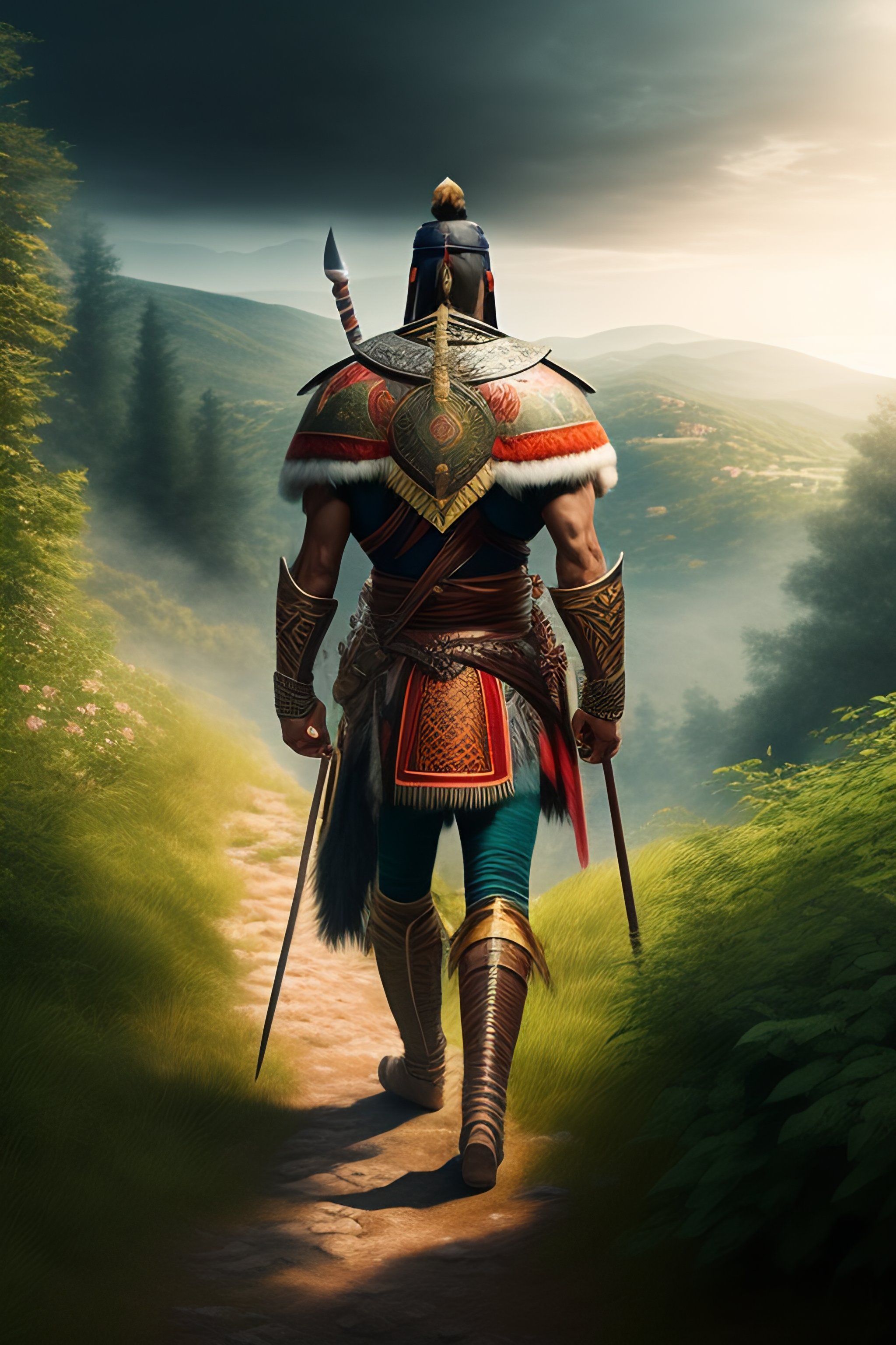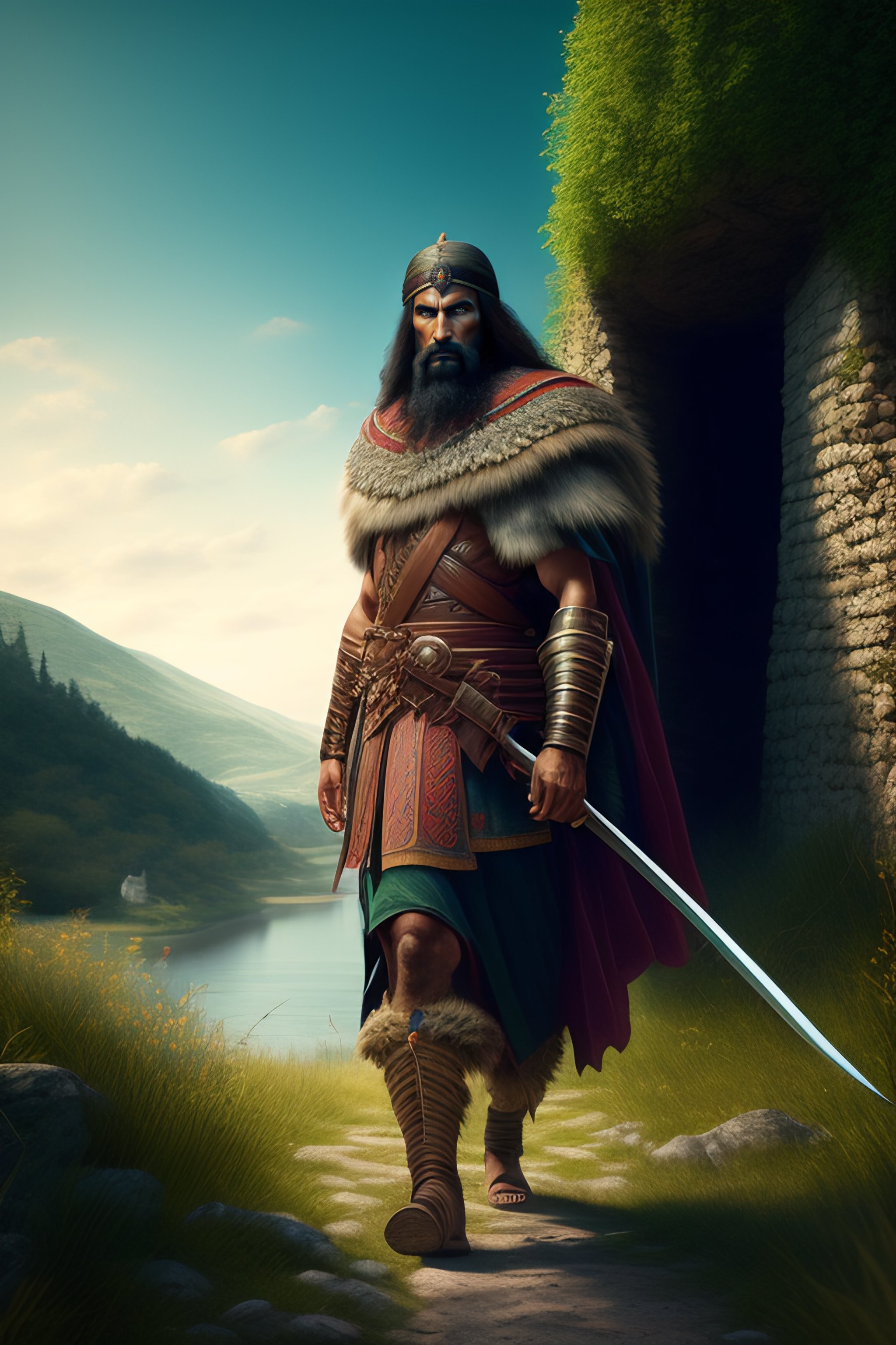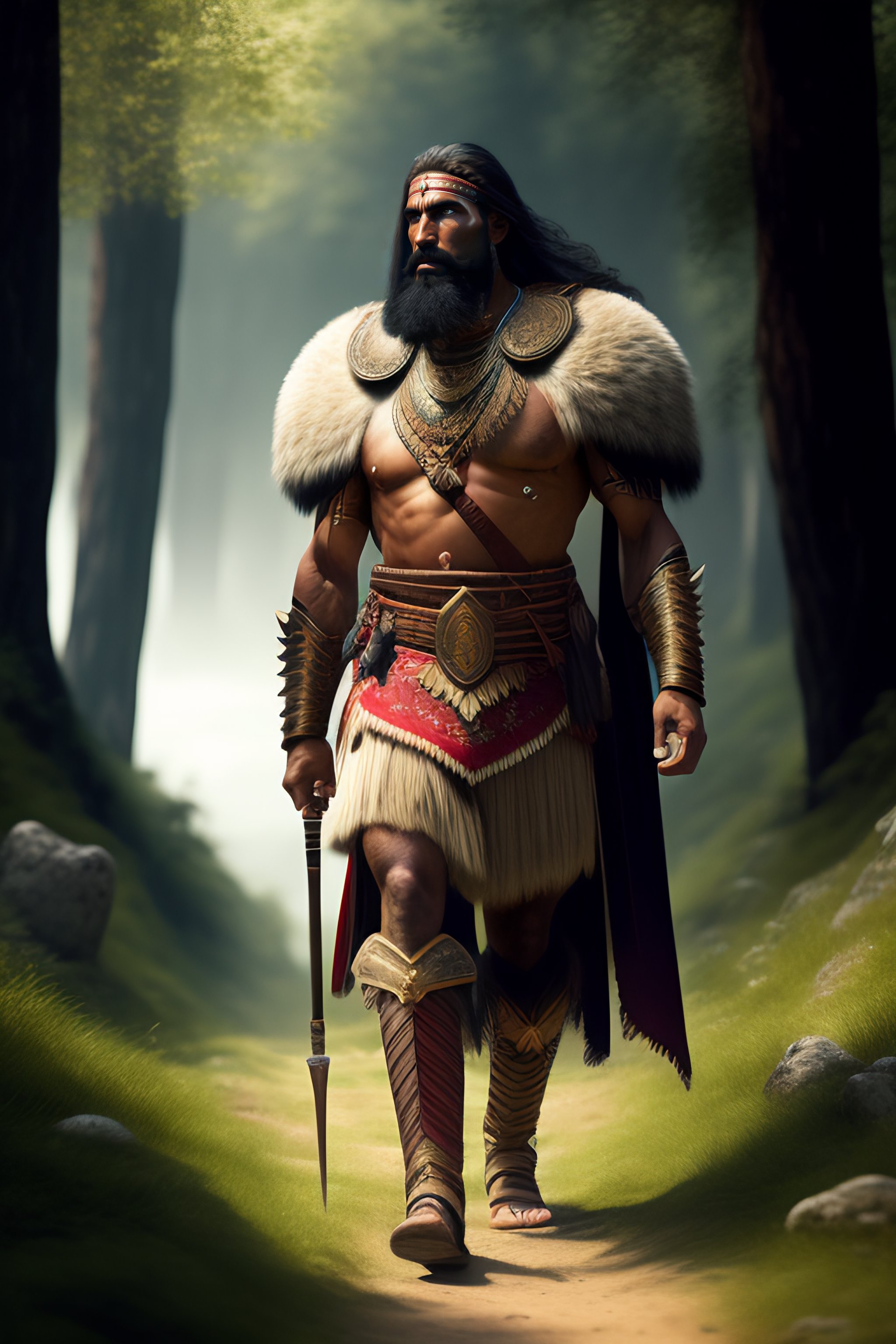 Portrait of a ancient bulgarian warrior walking into a balkan village from the wilderness in the background, centered, facing front, lush forest, hyper realistic, 8k