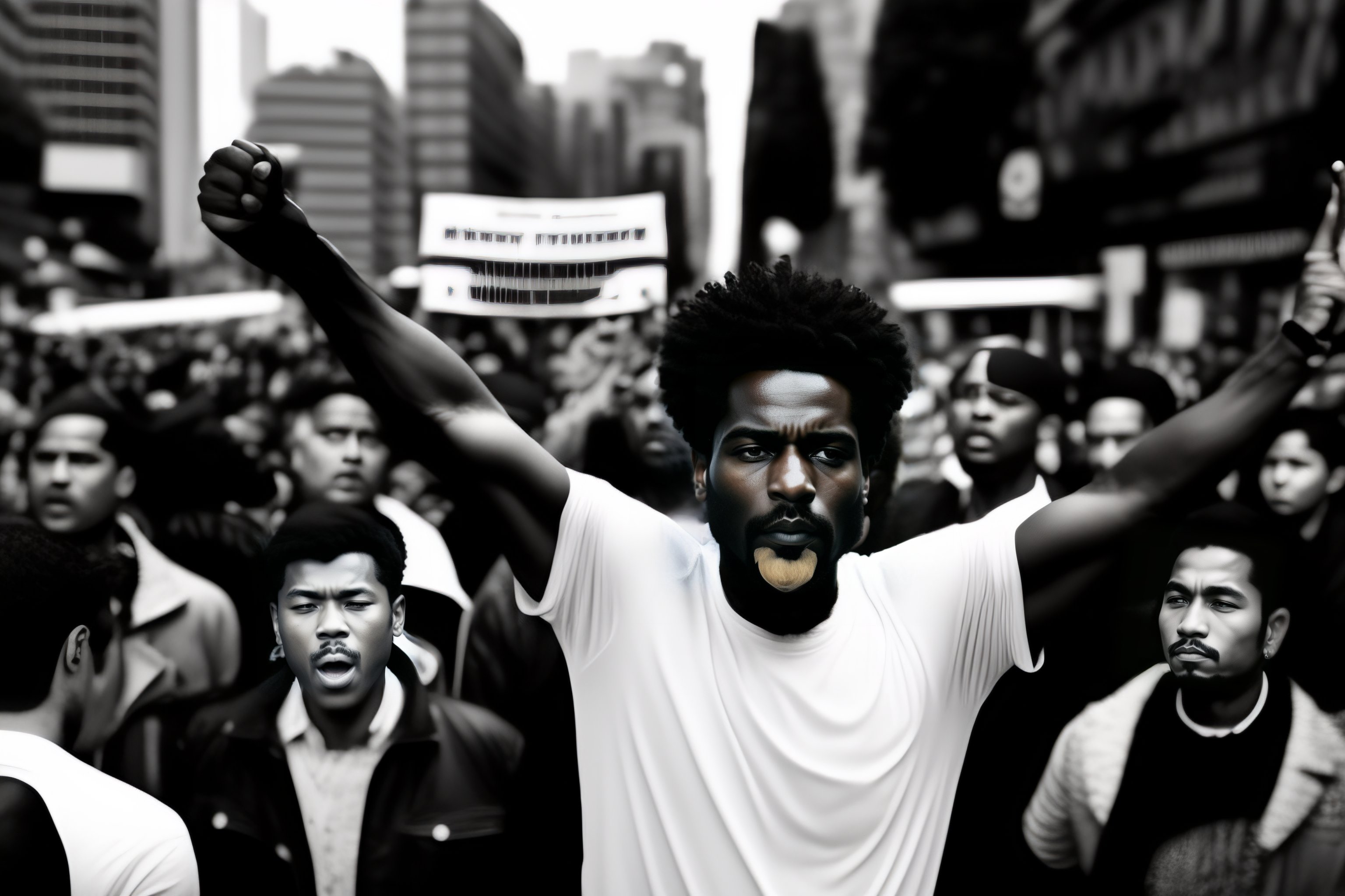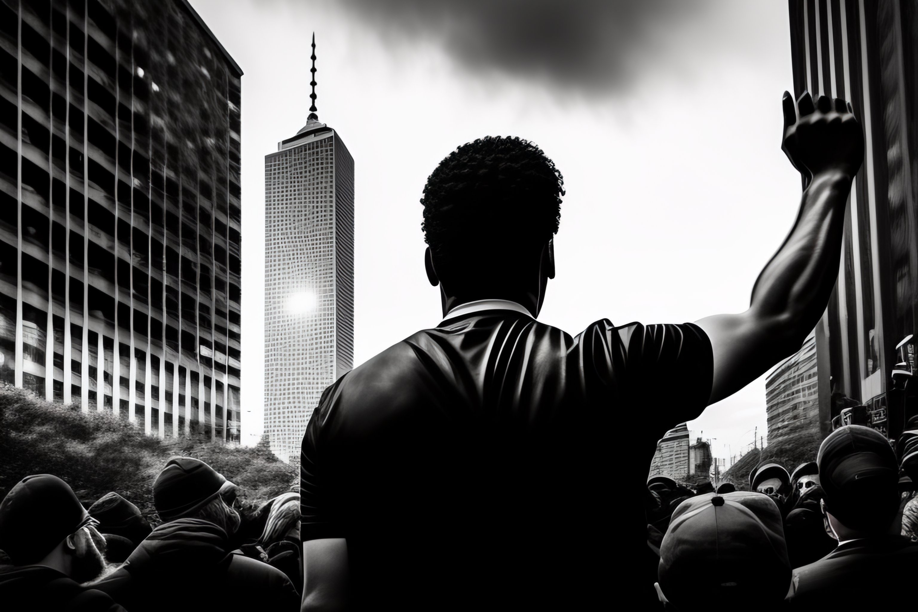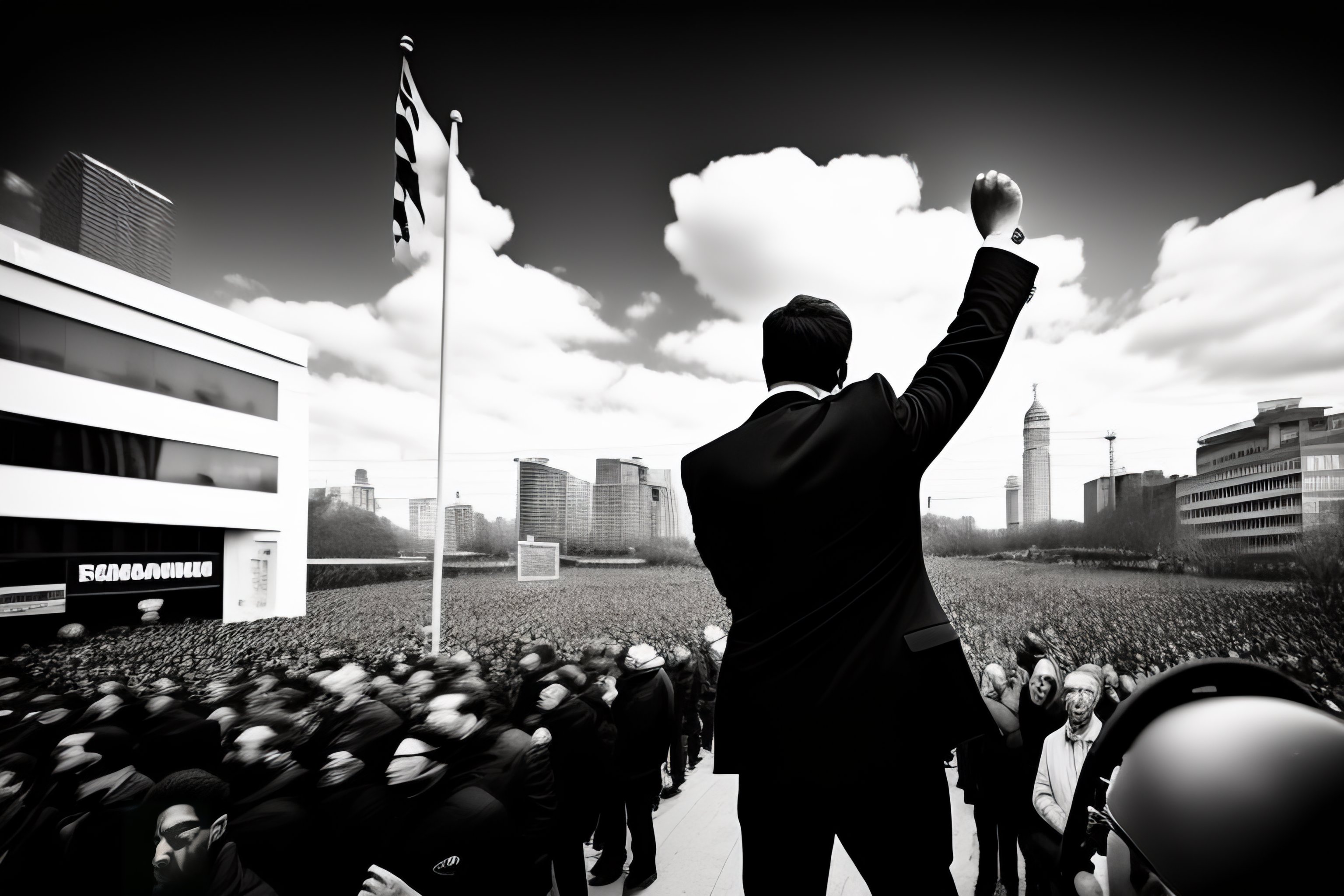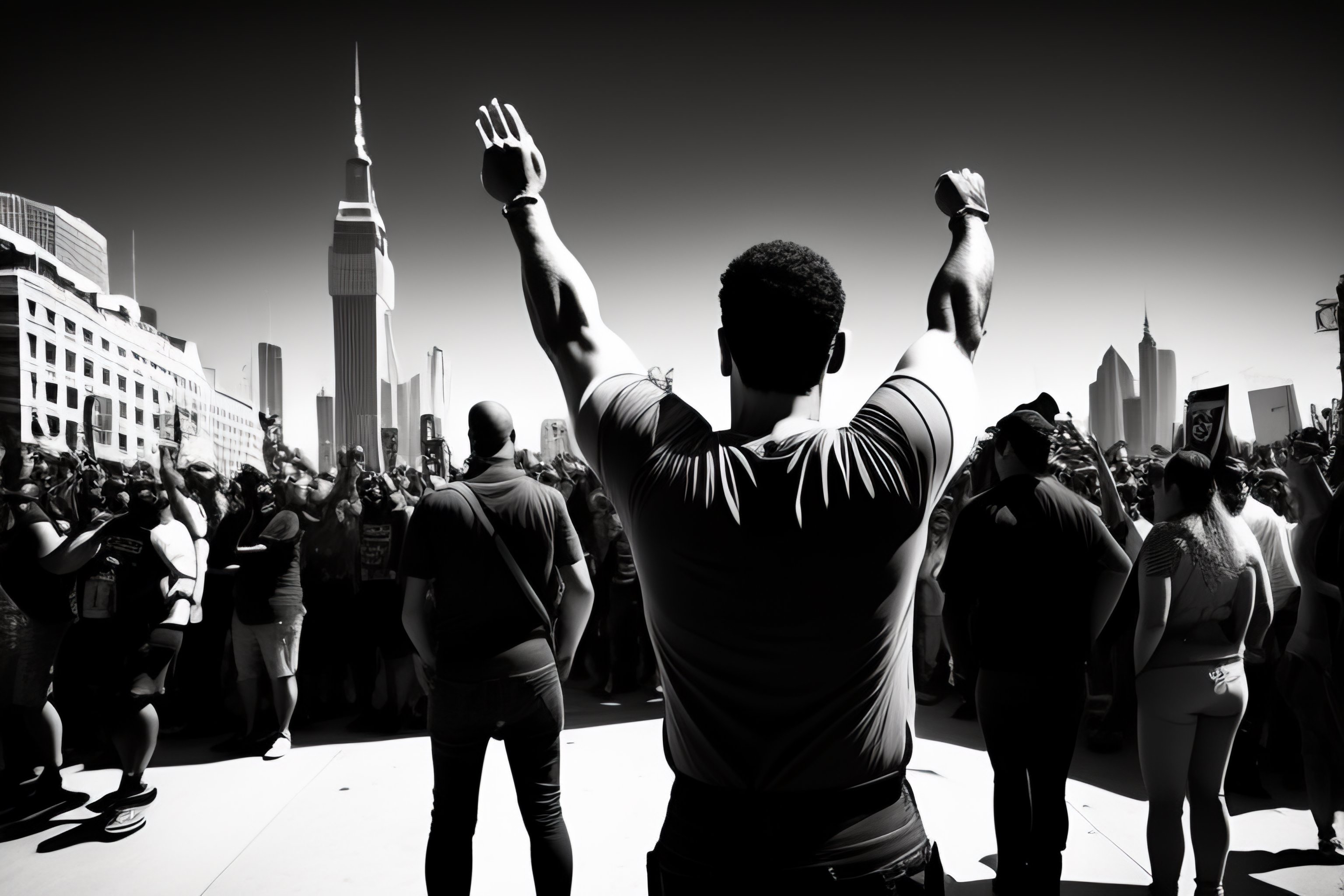 A revolutionary man with arms raised in front of a crowd, with his back to us, in an urban manifestation, banksy style, black and white