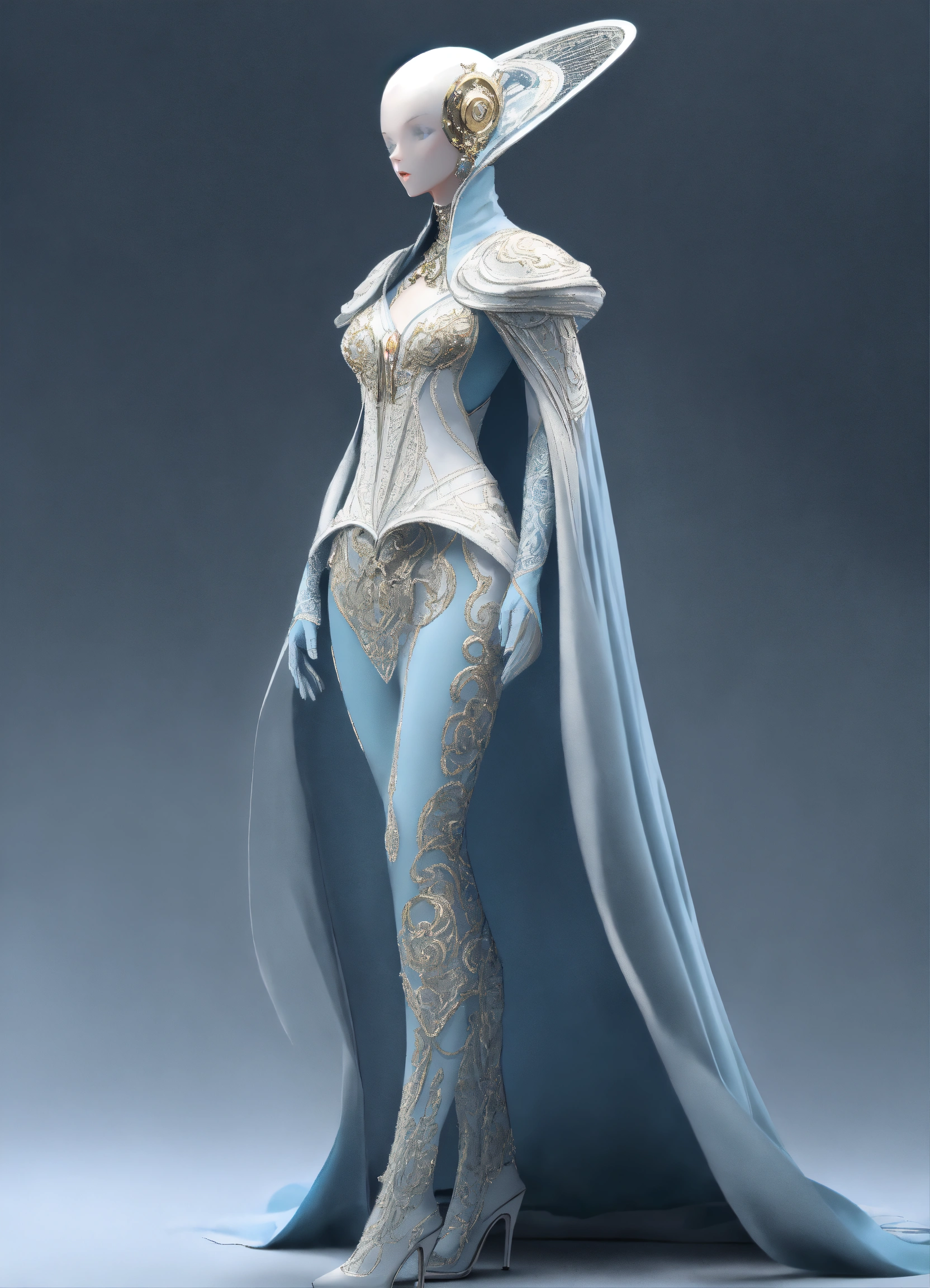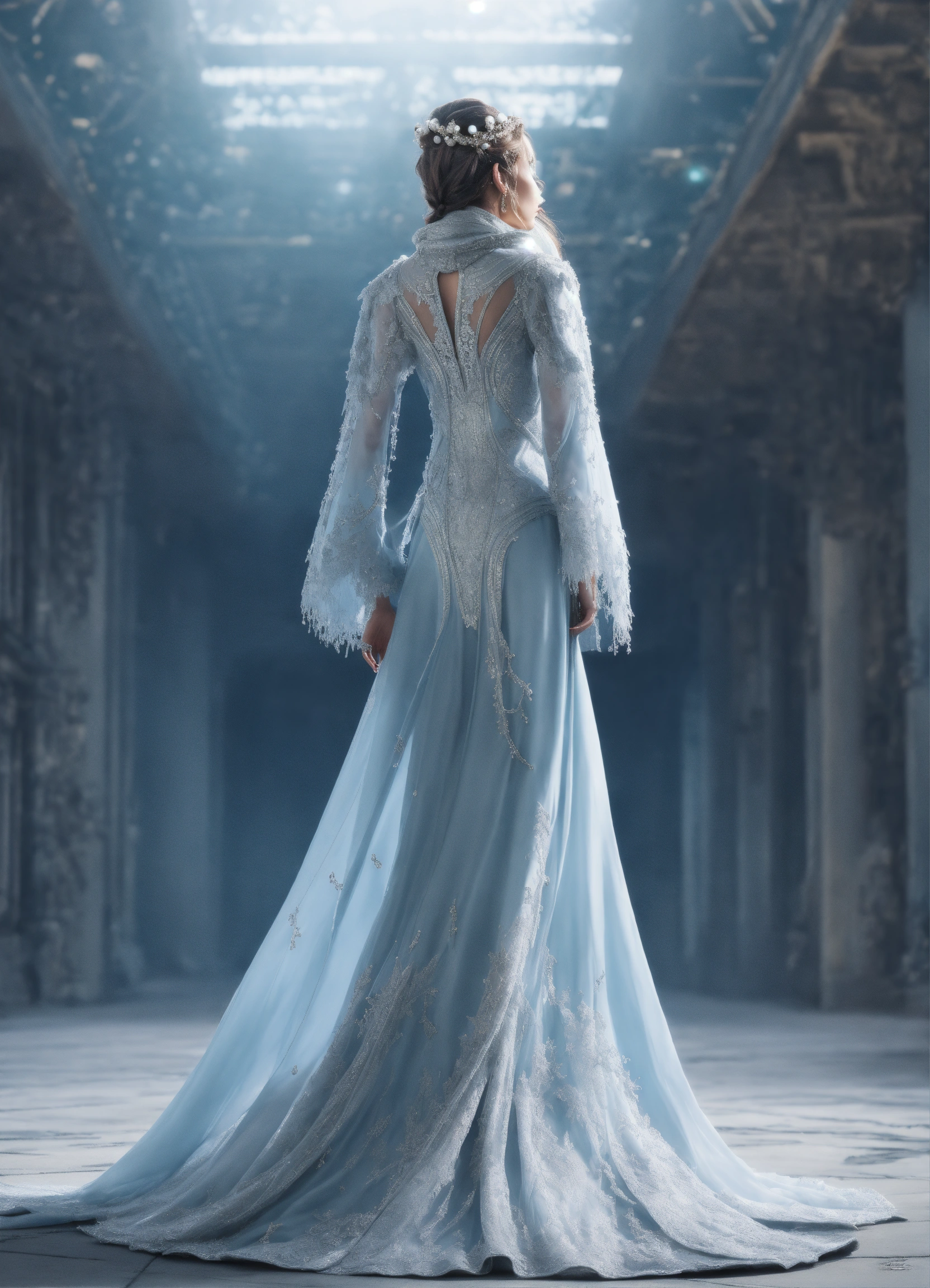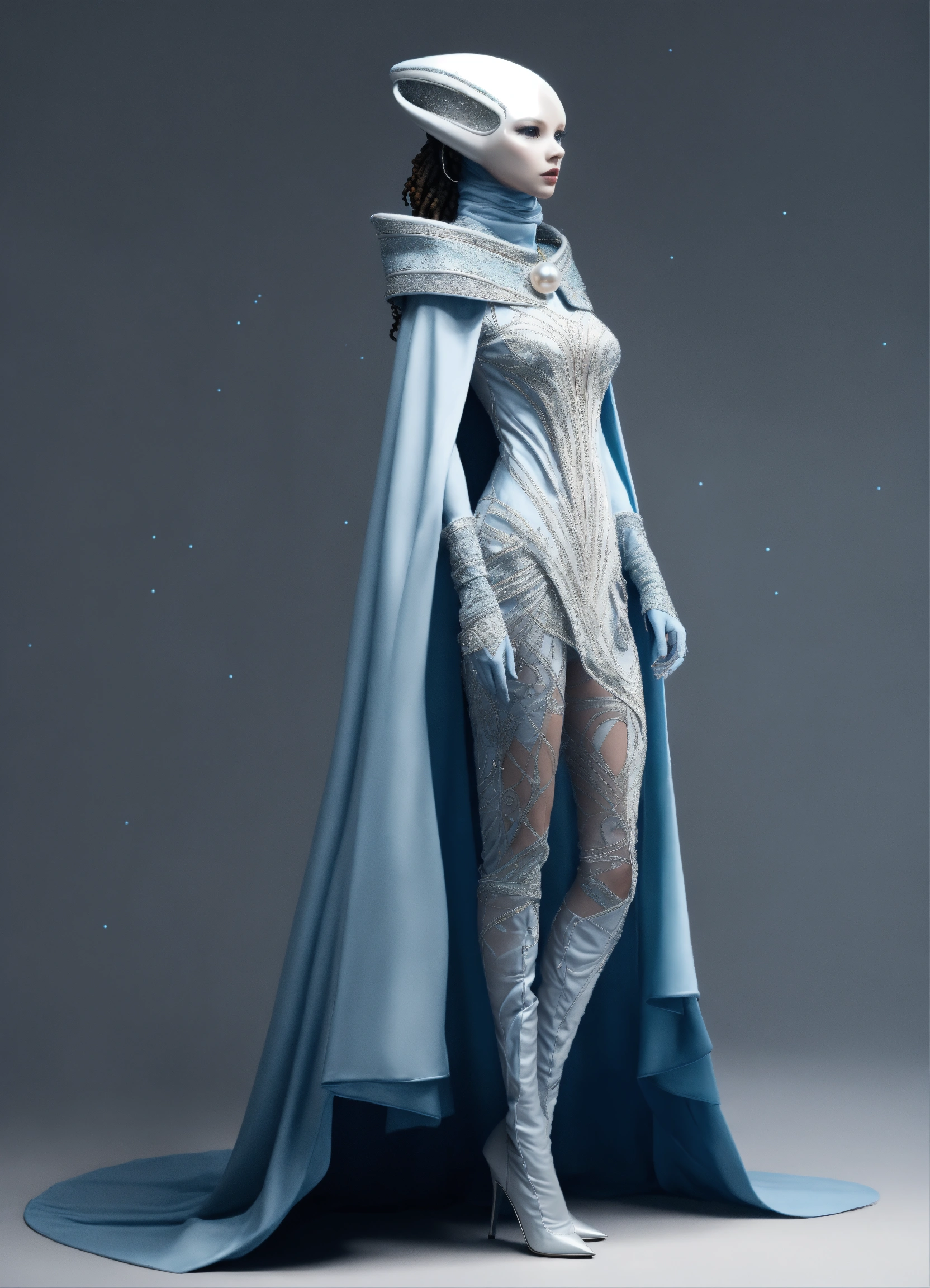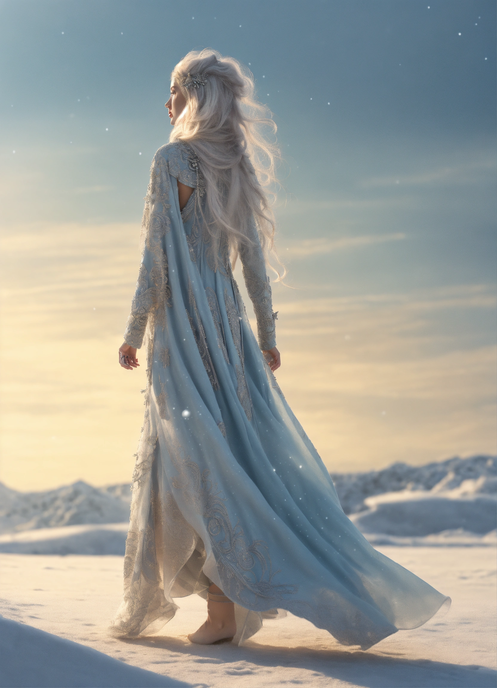 A alien, woman with a long beutiful dress, winter cape hippiestyle with rastahair, vibrand soft light blue and pearl white, silver decoreted clothings, full body wide shot, walking pose, side view, intricate, sharp_focus, concept_art, simple white backround