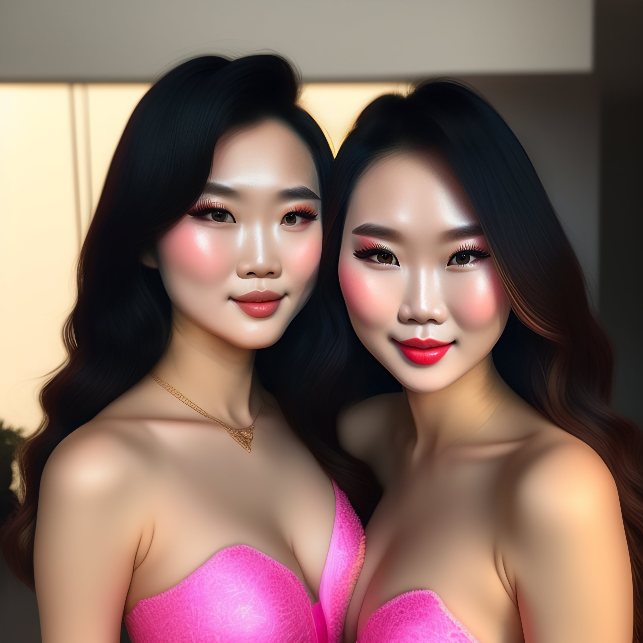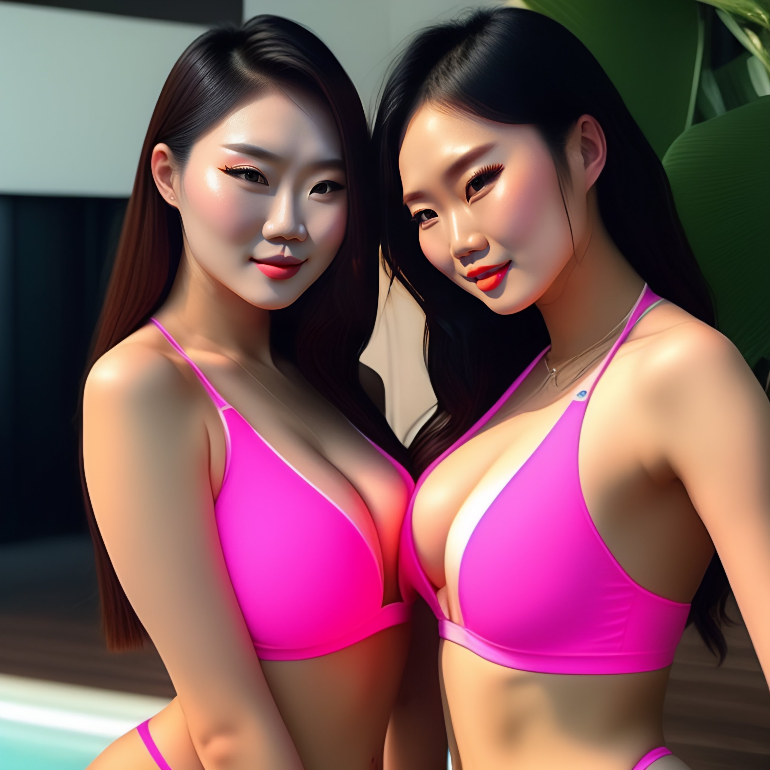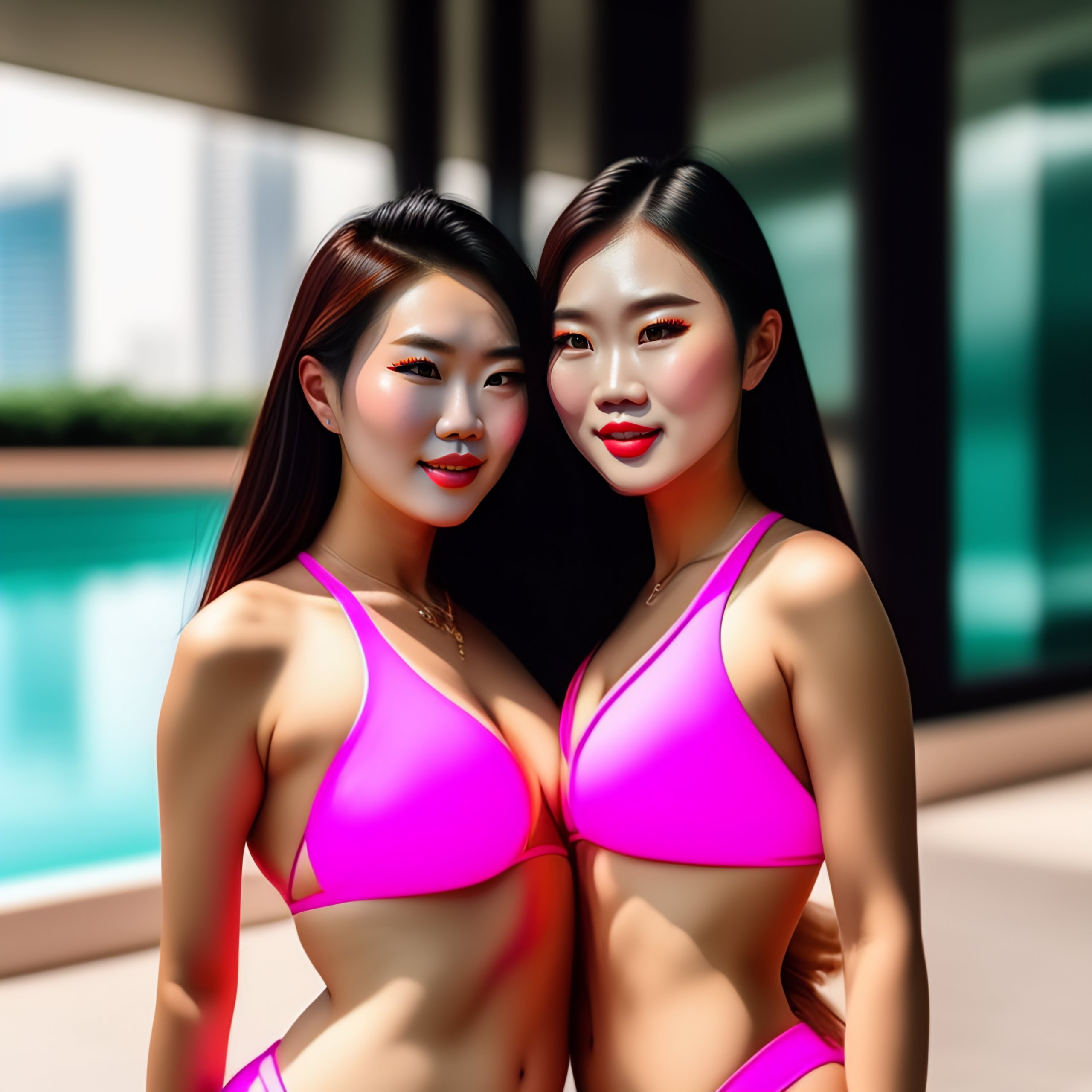 Female malay social media influencers in pink bikinis kissing each other, pretty, xmm, xiao mei mei, dramatic lighting, hyper realistic, photorealism, innocent looking, round faces, 18 years old, young, tetek besar