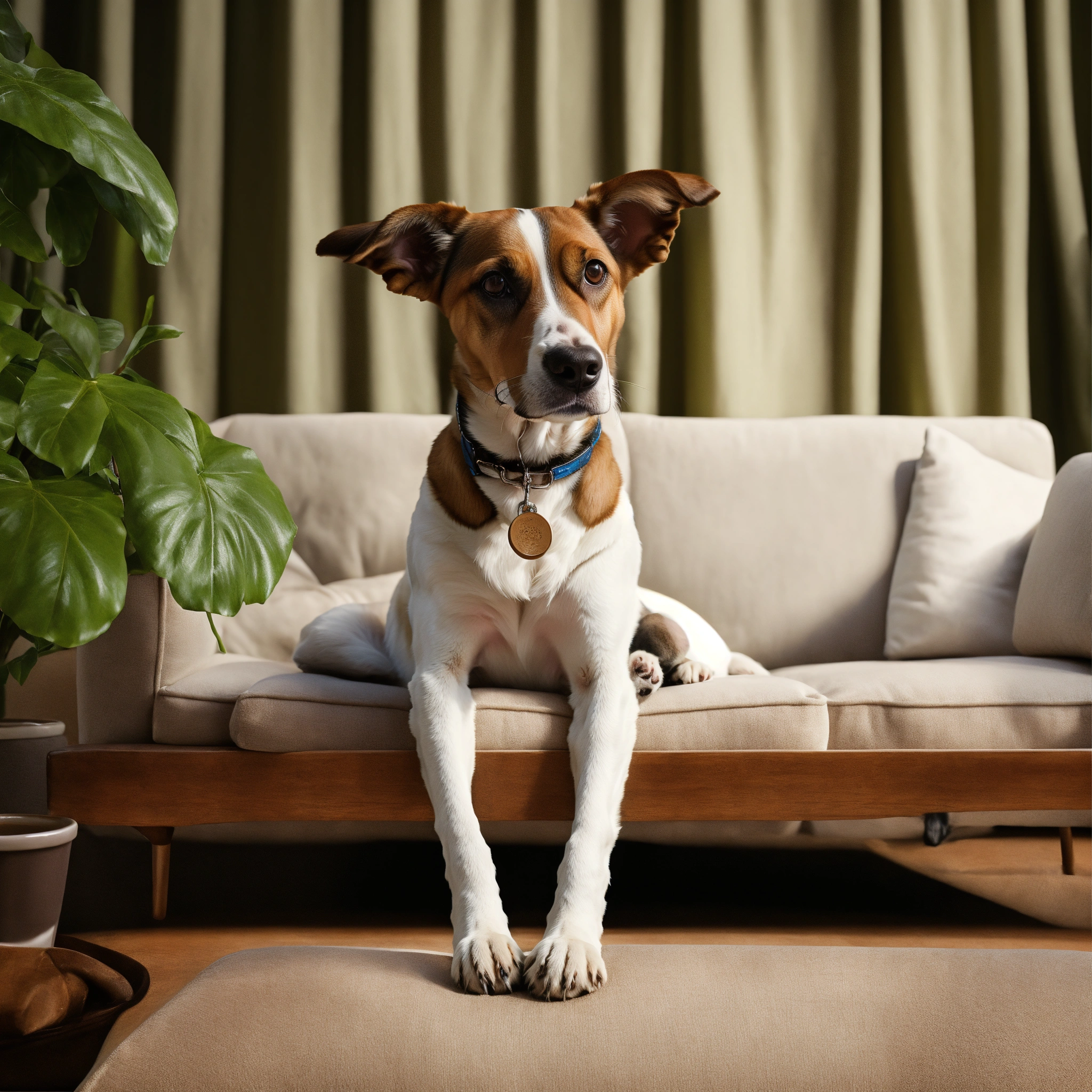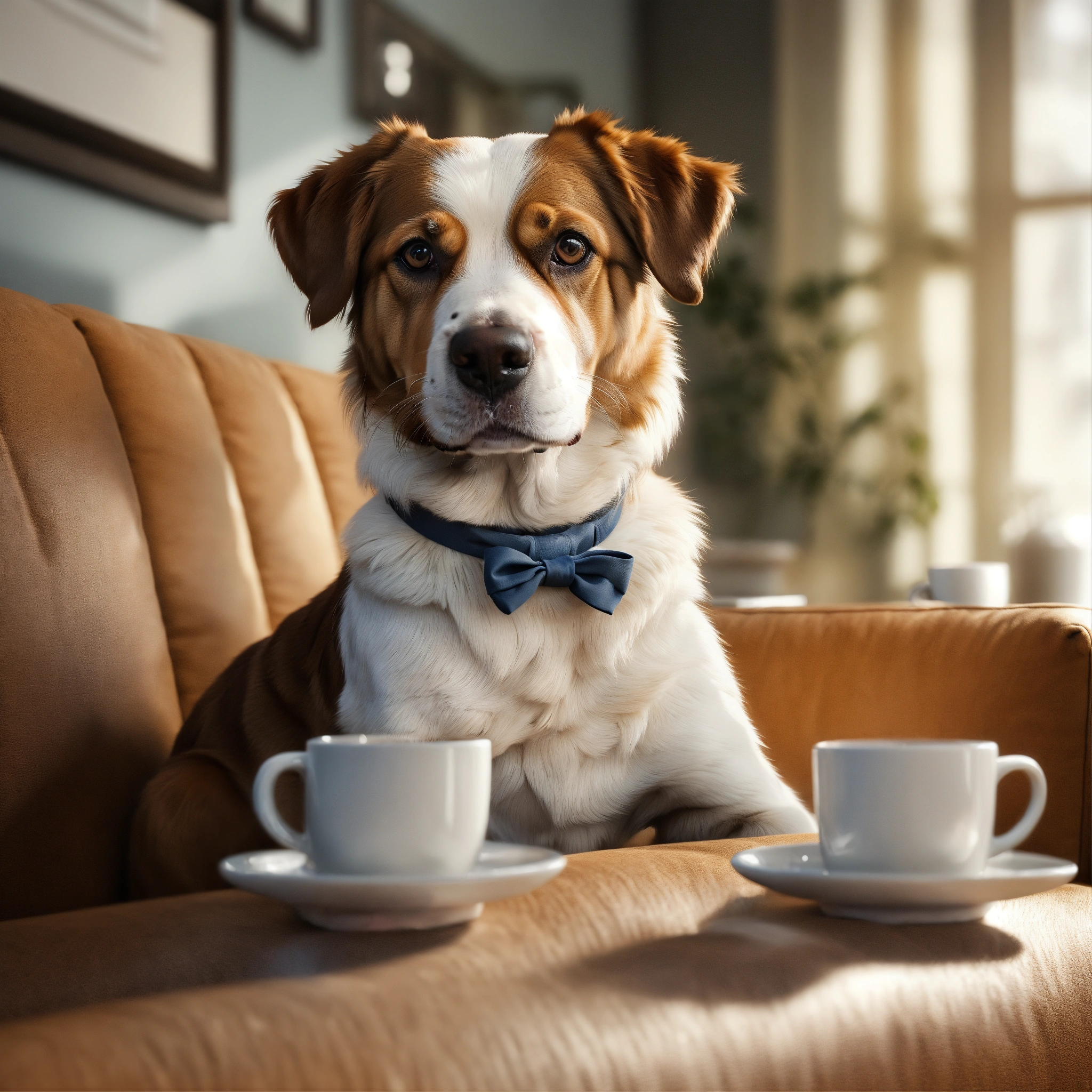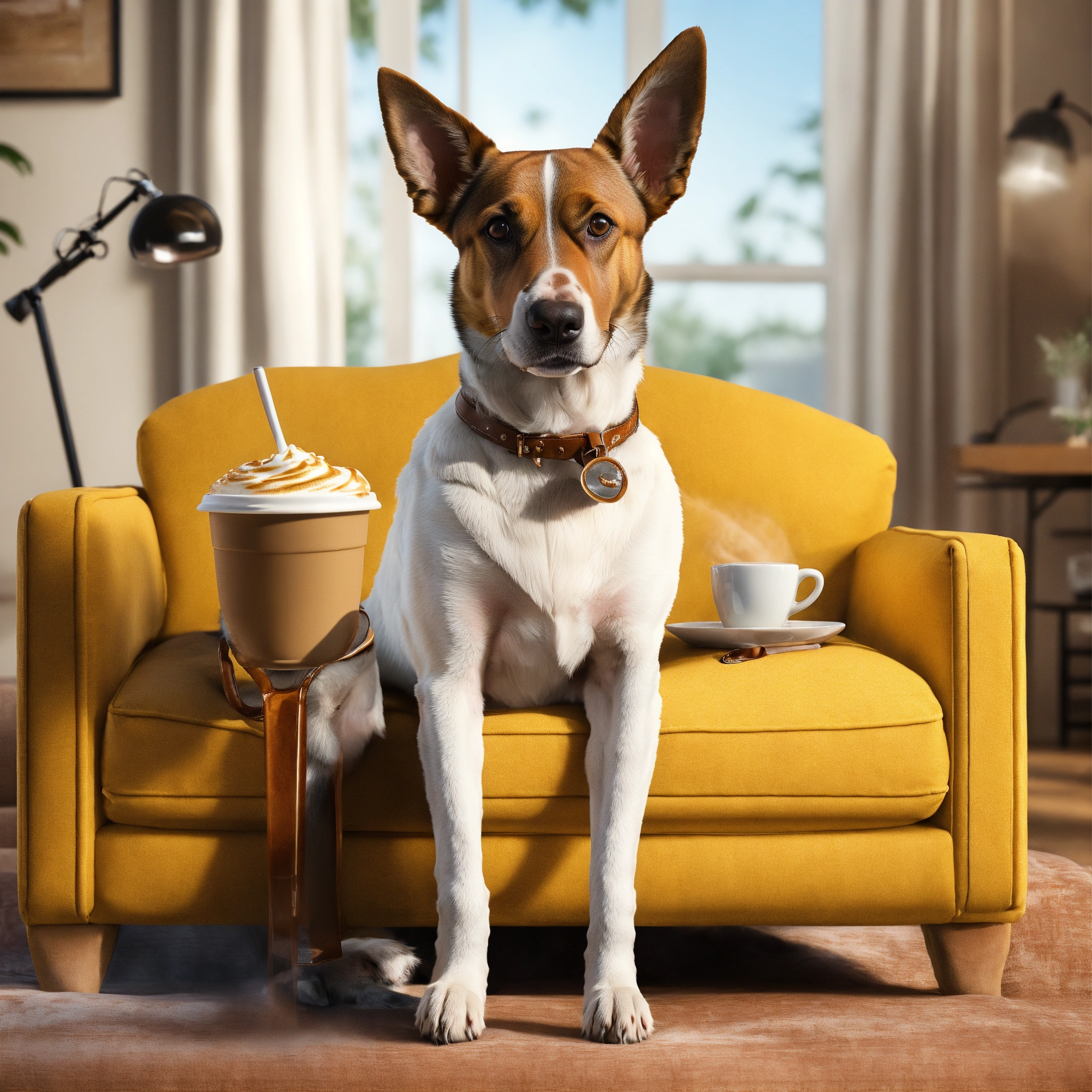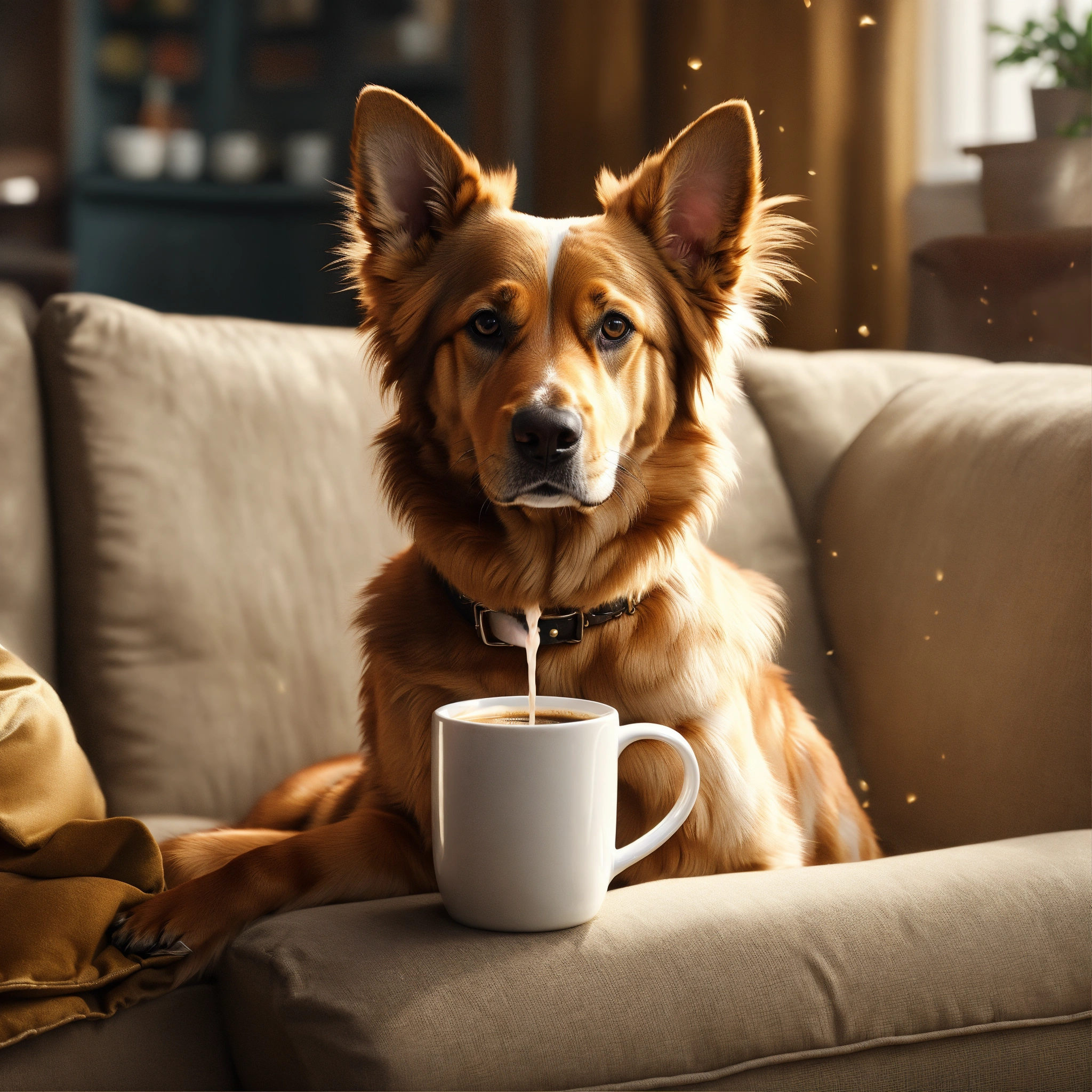 Photorealistic, a dog drinking coffee, seated on a sofa, with legs crossed, in a white mug, 8k, ultra realistic, photorealistic