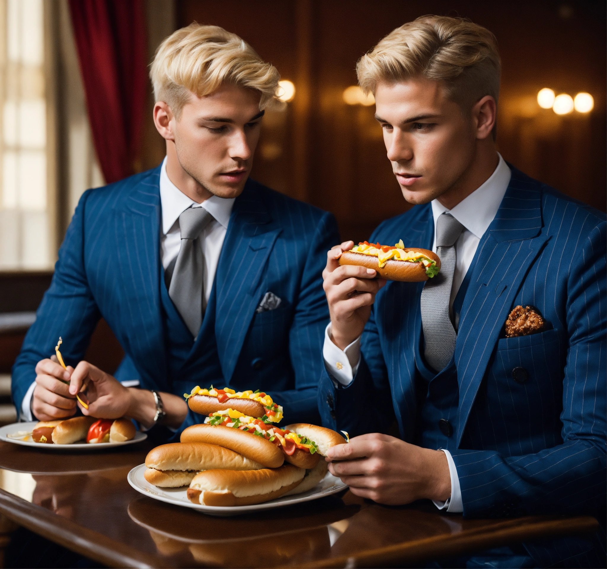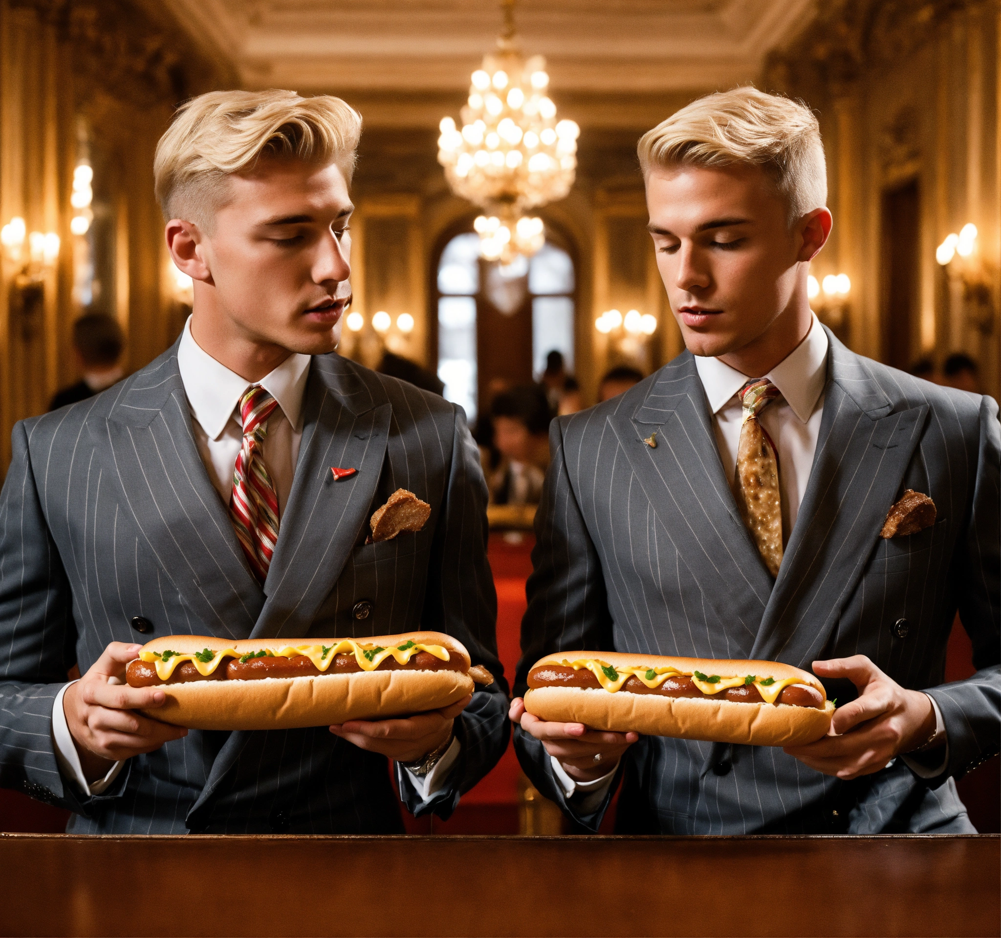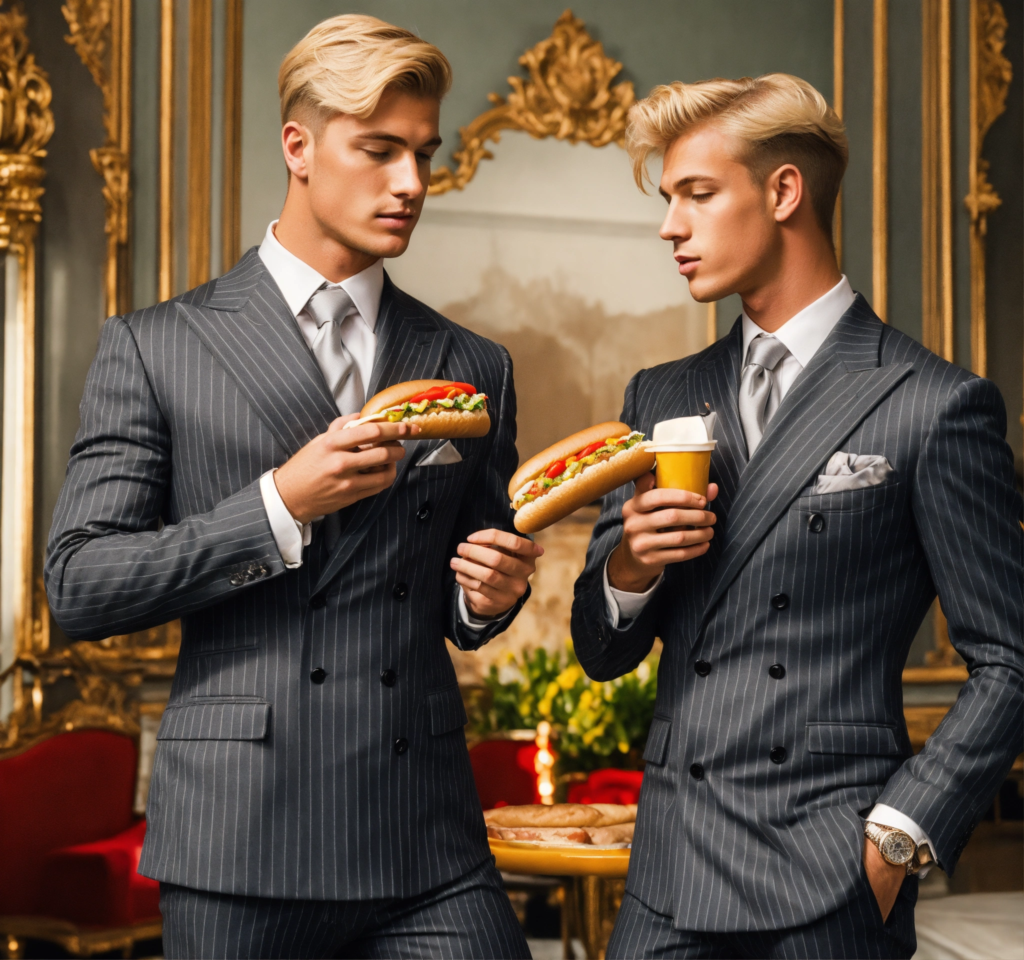 Two young male blonde businessmen in grey pistripe double breasted suit, club tie eating a hot dog in a palace
