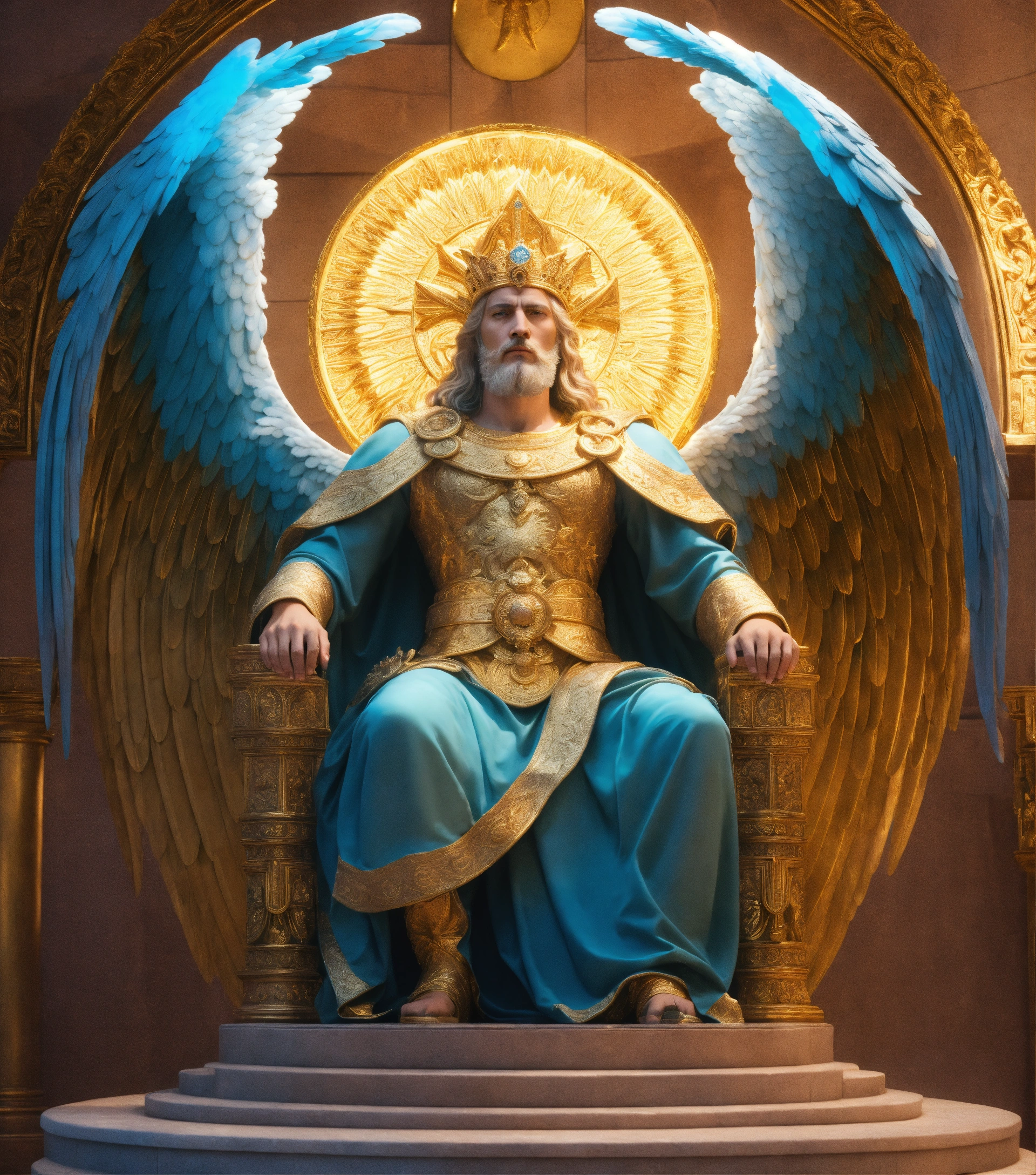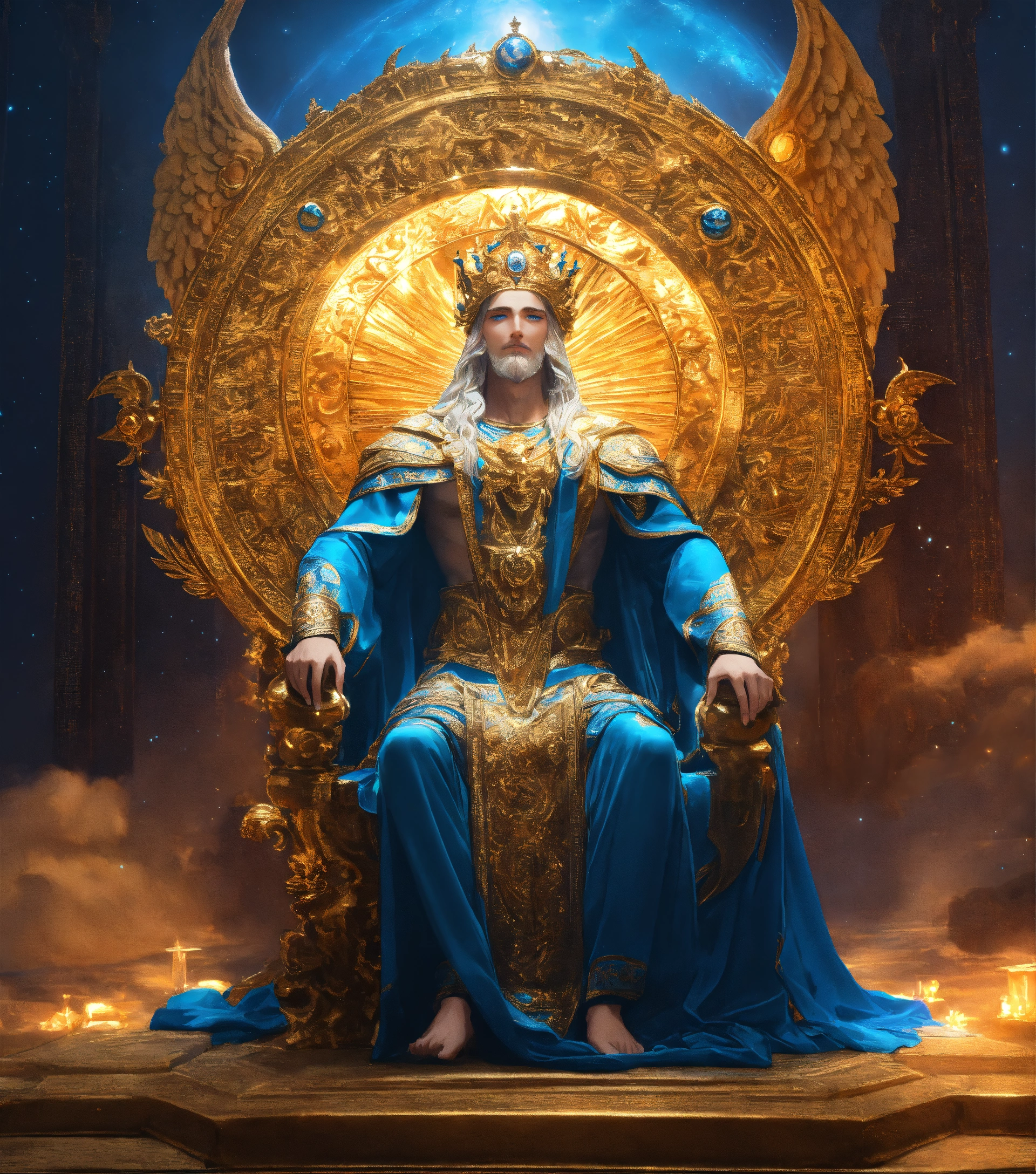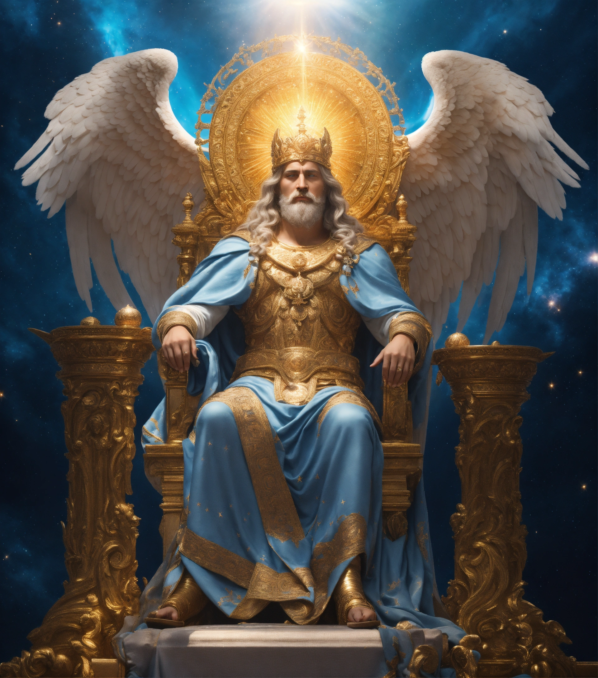 Celestial god, most high, imposing, sovereign, powerful, seated on his throne, majestic, with power surrounding him, displaying his infinite power, countenance with gentle, calm, and kind emotion, blue eyes, real image, angels worshiping around him, ultra-realistic, photography, 8k, ultra definition