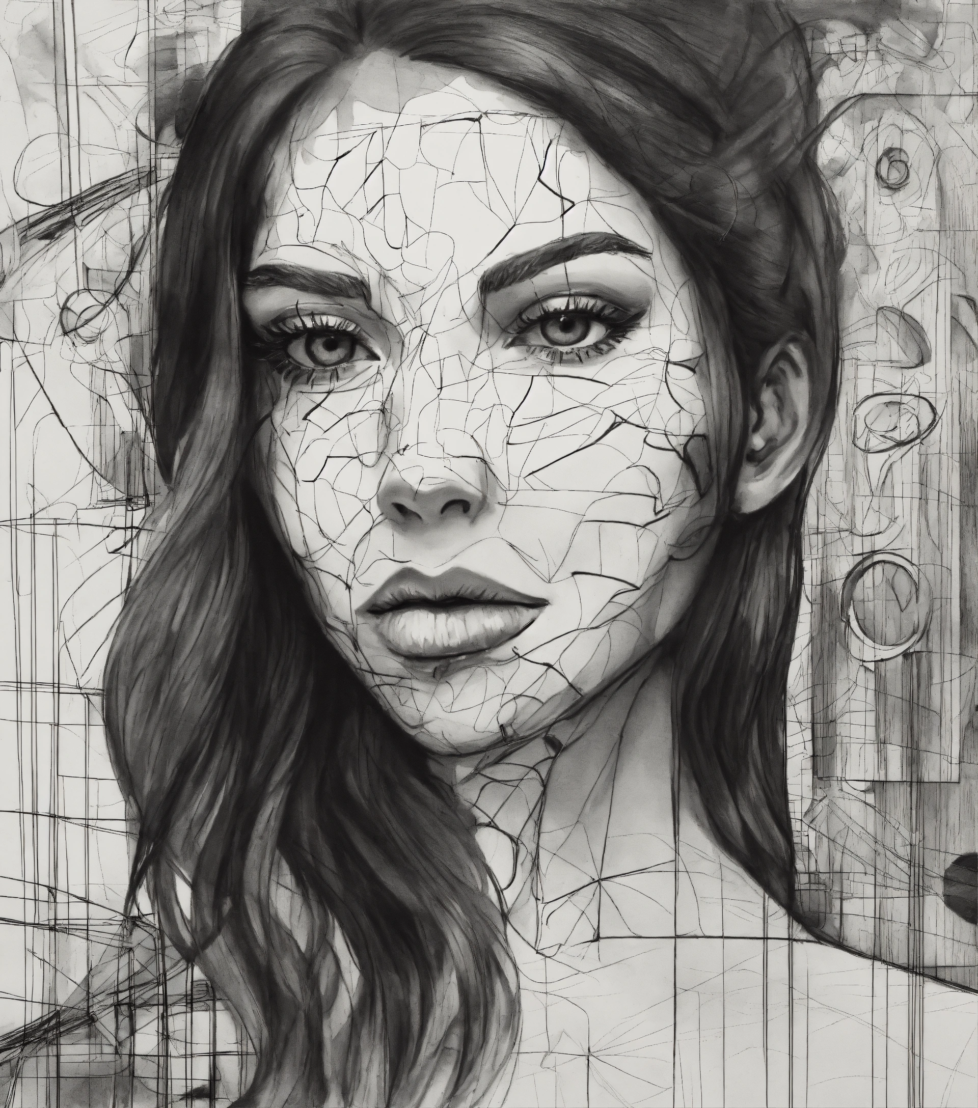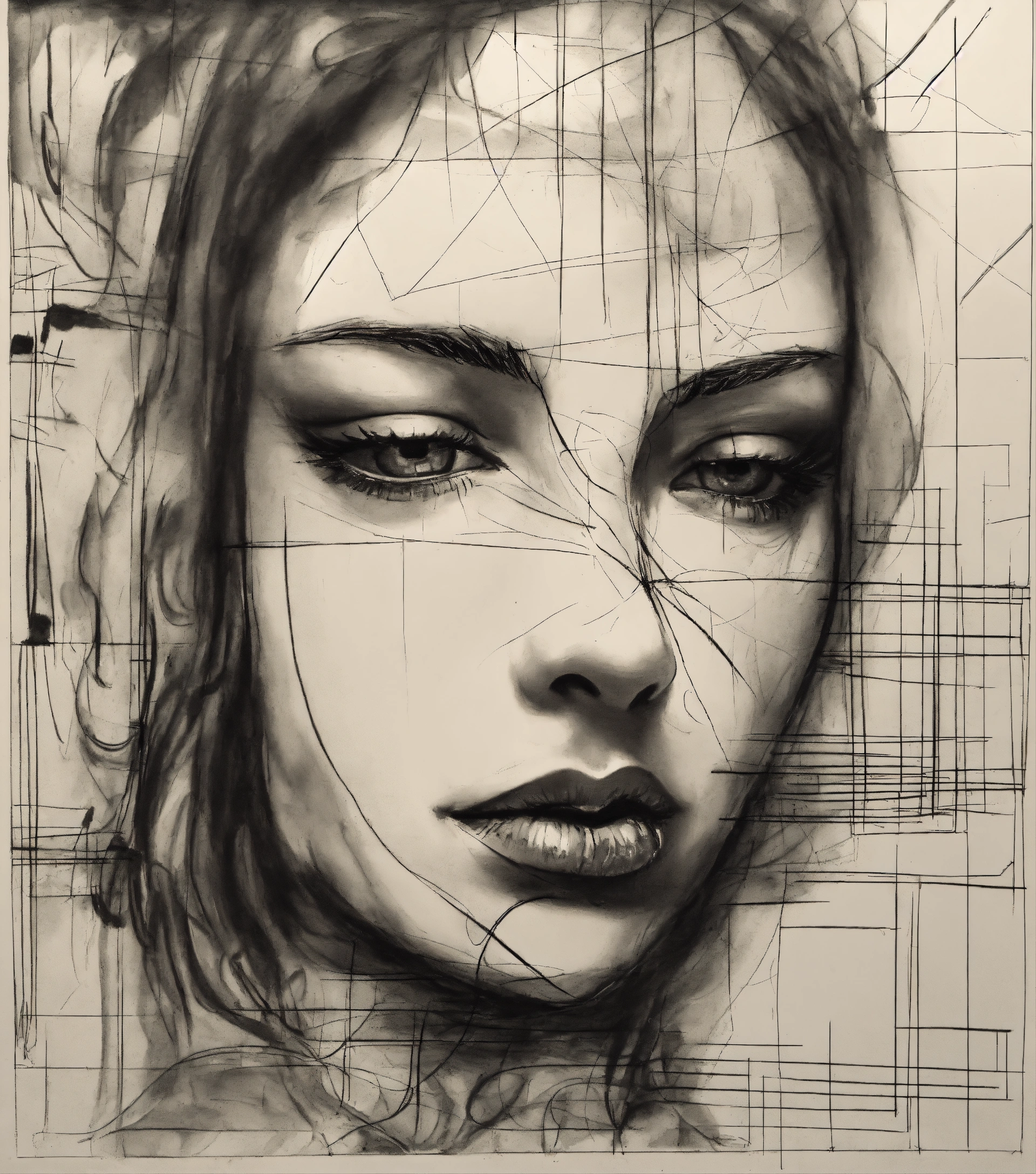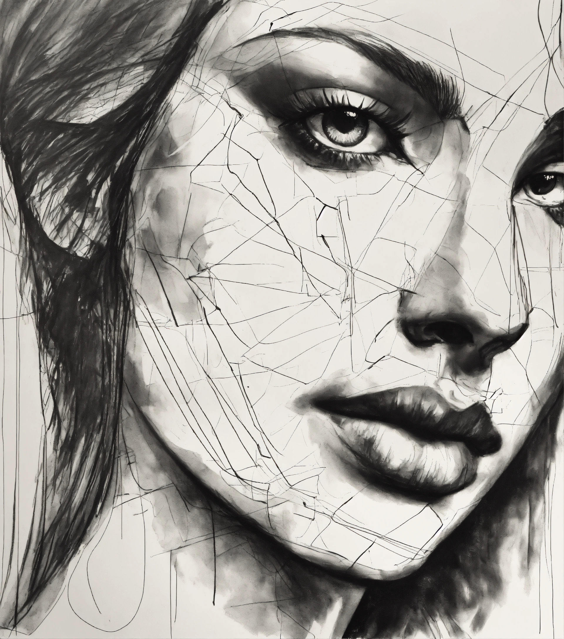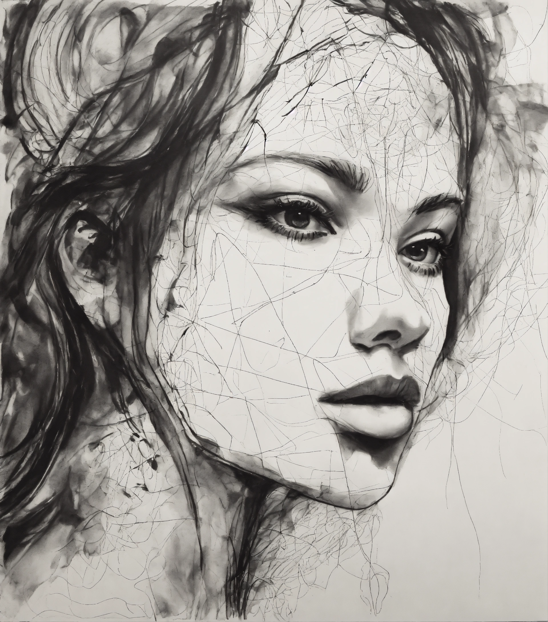 A black and white drawing of a woman's face, an abstract drawing behance contest winner, figurativism, biomorphic, outlined art, academic art