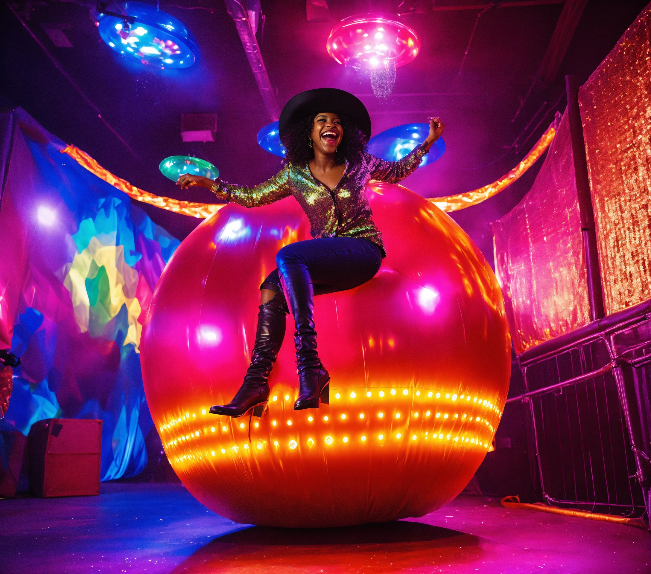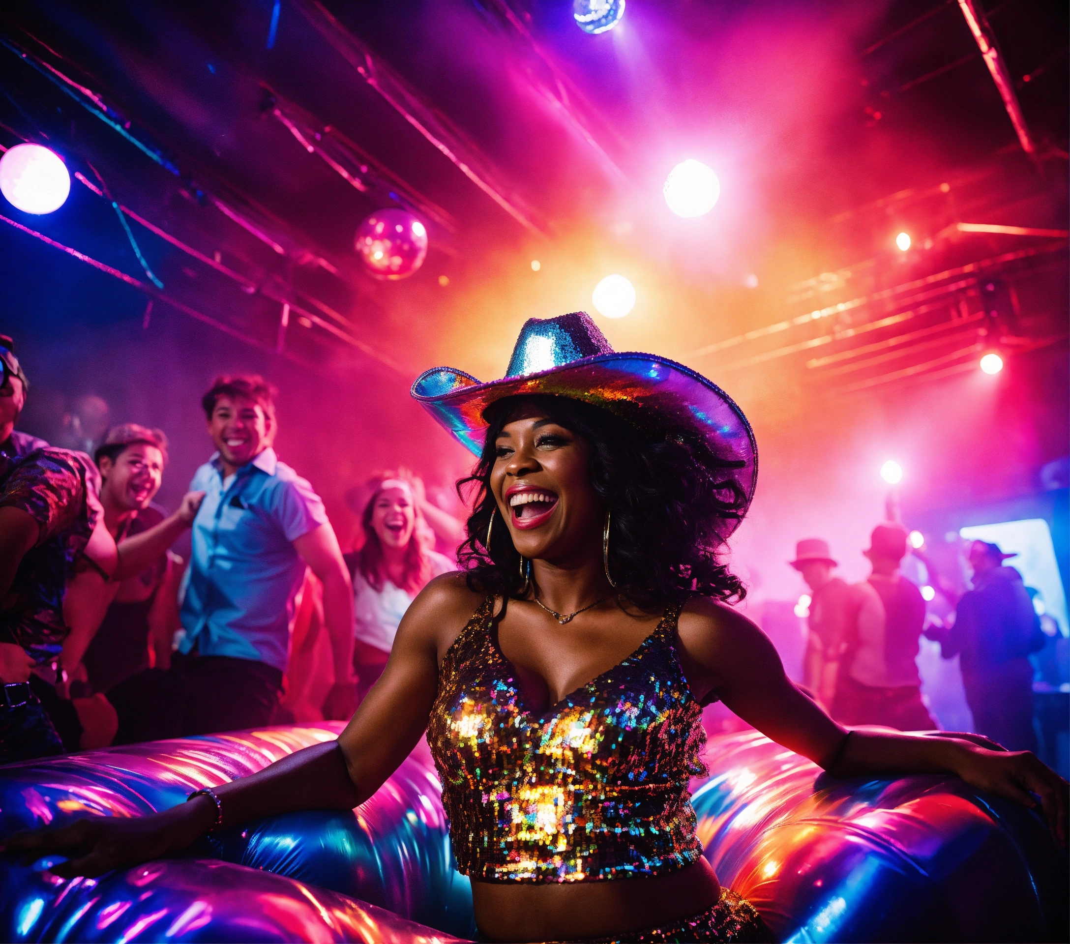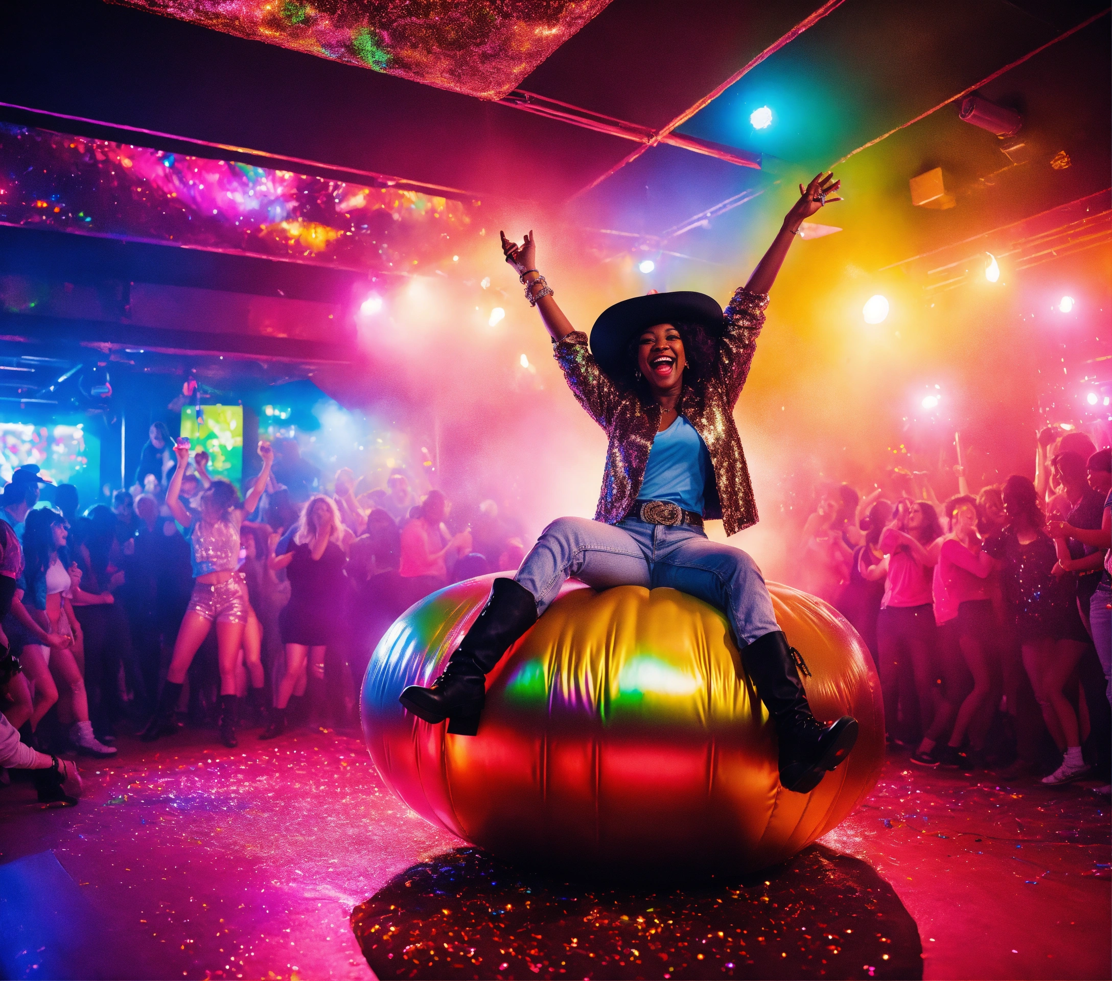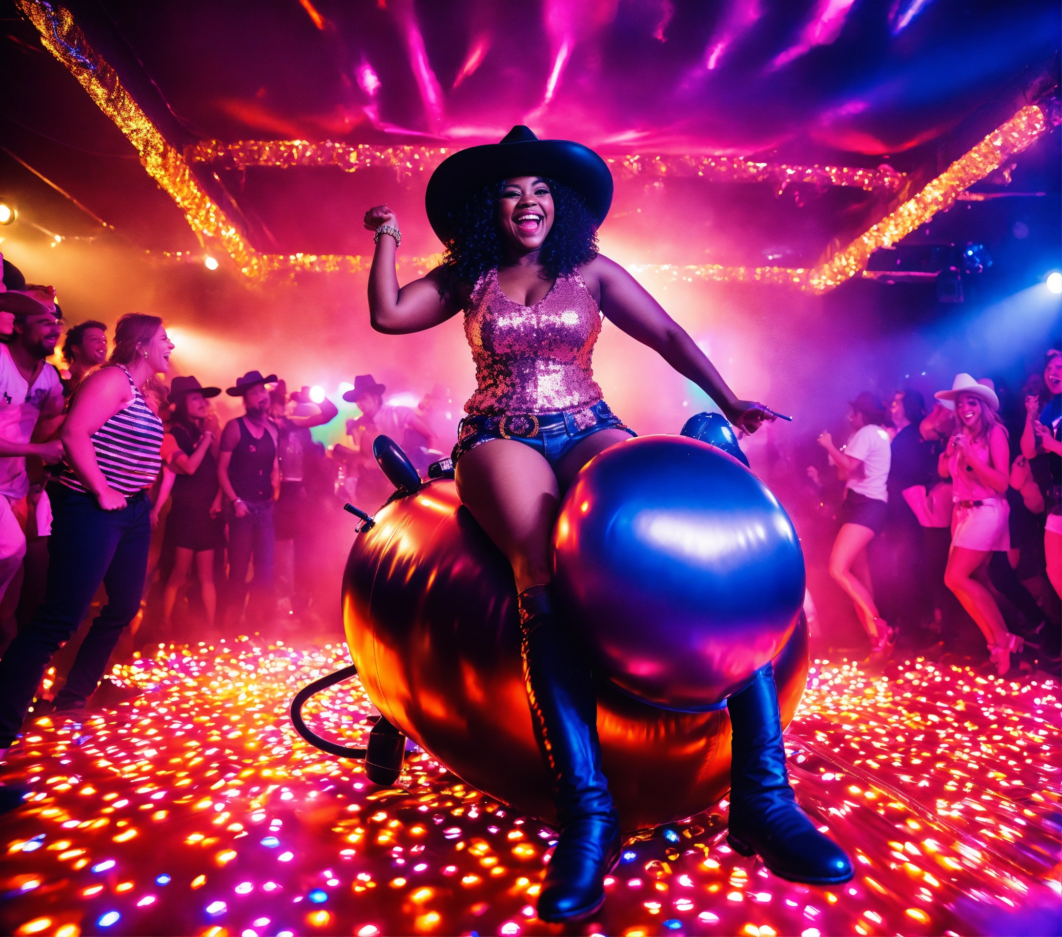 Laughing and excited dark dark complexioned black woman wearing an iridescent sequined cowboy hat riding a mechanical bull inside of an inflatable barricade in a disco club with abstract expressionism rendition of the people cheering her on from outside the barricade, a center large disco ball is spotlighting the bull riding area, vignette cinematic lighting, colorful strobe lighting accent castings, painting