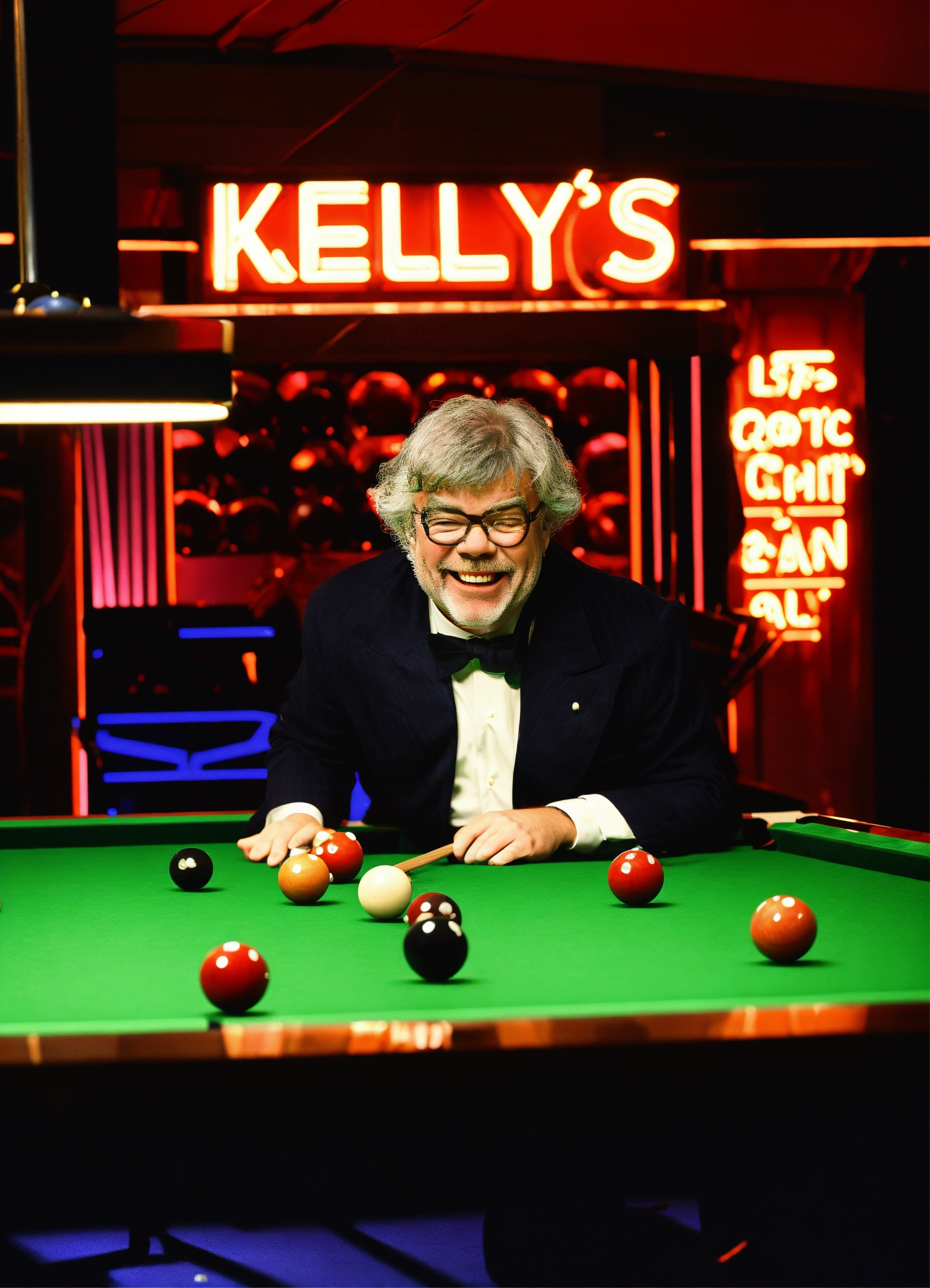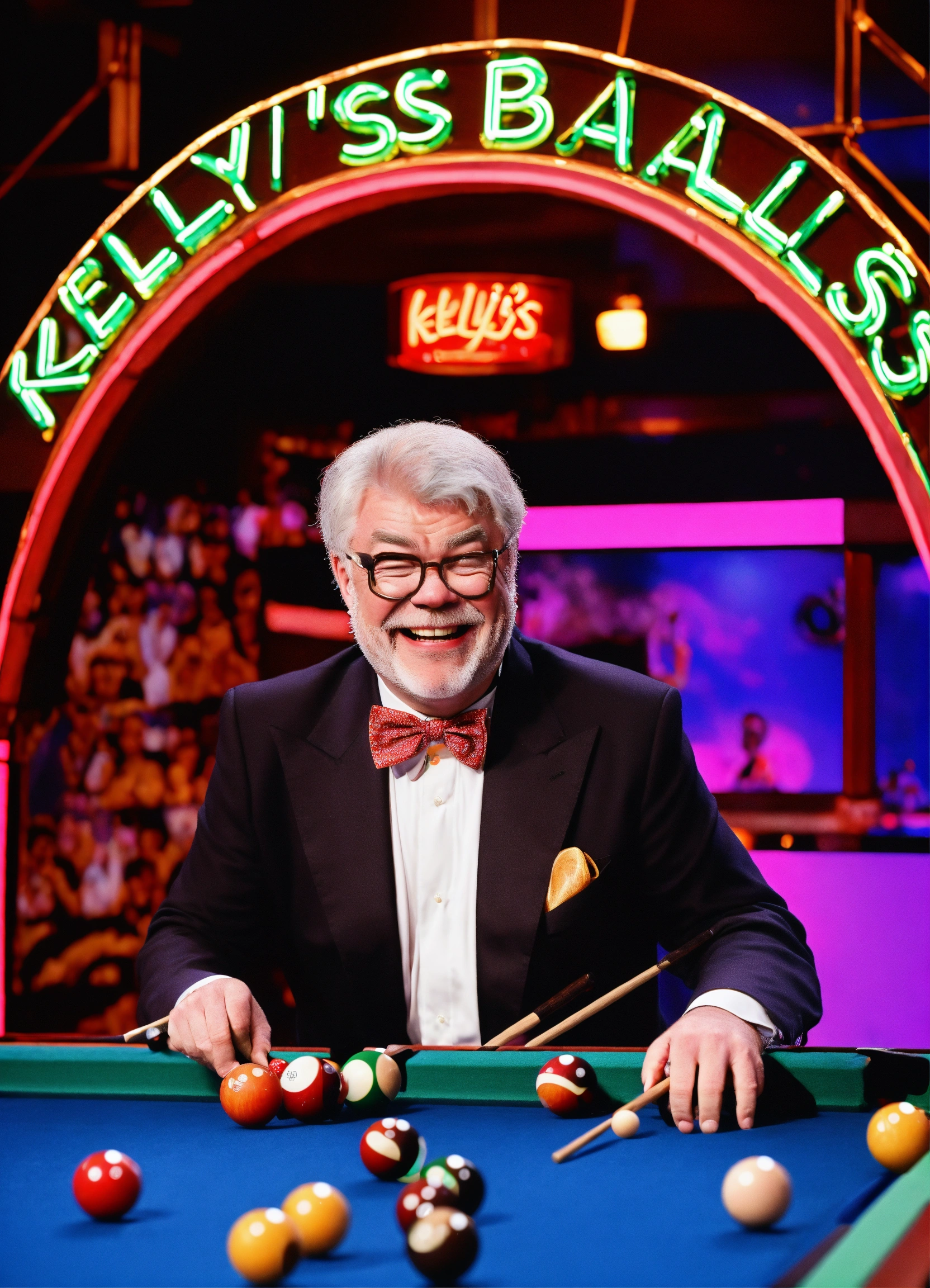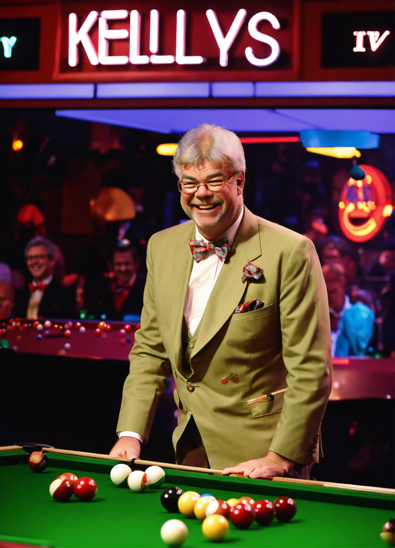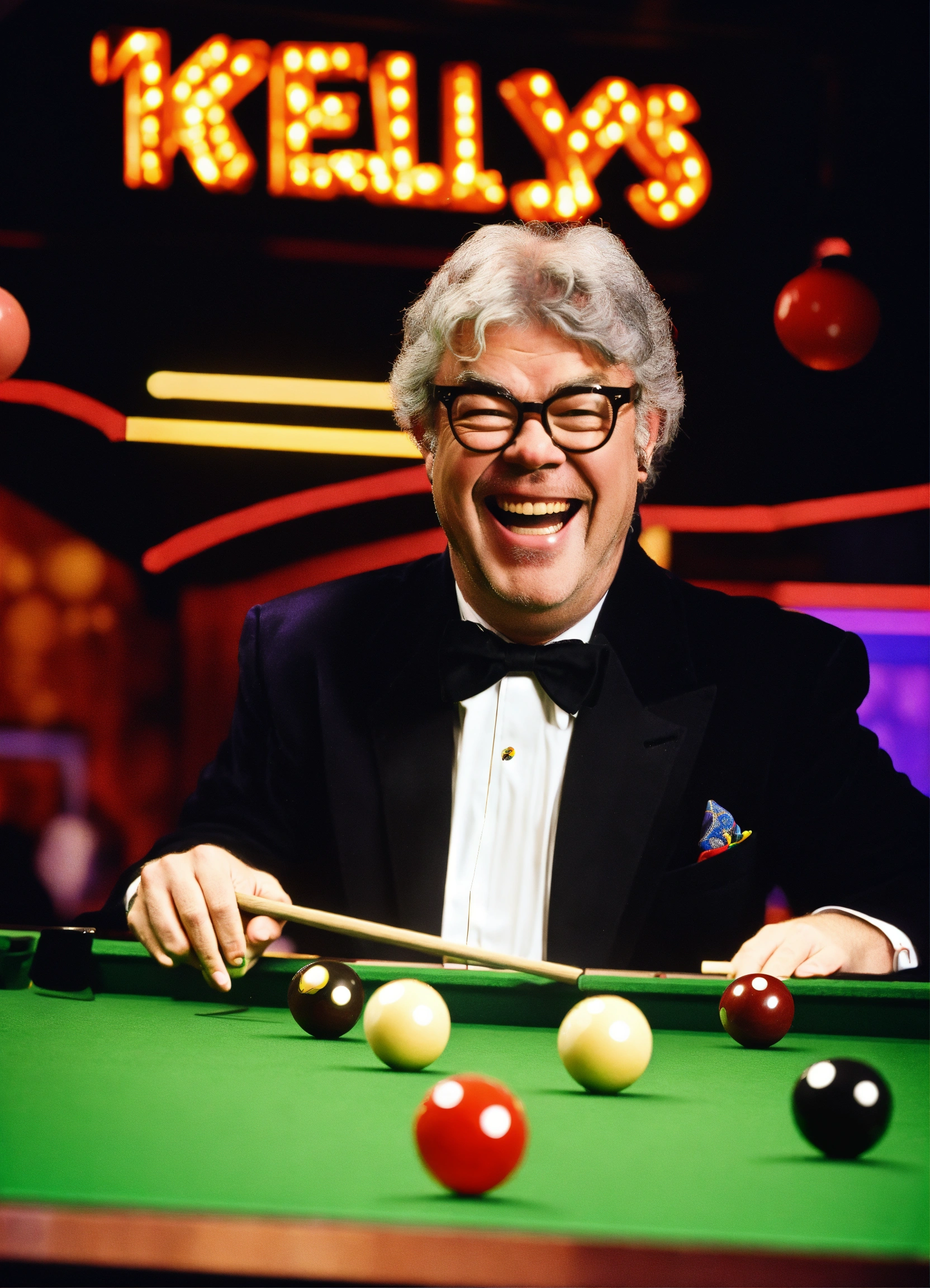 Tv gameshow being filmed in studio, matthew kelly wearing oversized upside down glasses, enormous oversized bow tie, playing snooker with a tiny short snooker cue, laughing. neon sign "kelly's balls", comedy. itv logo bottom right