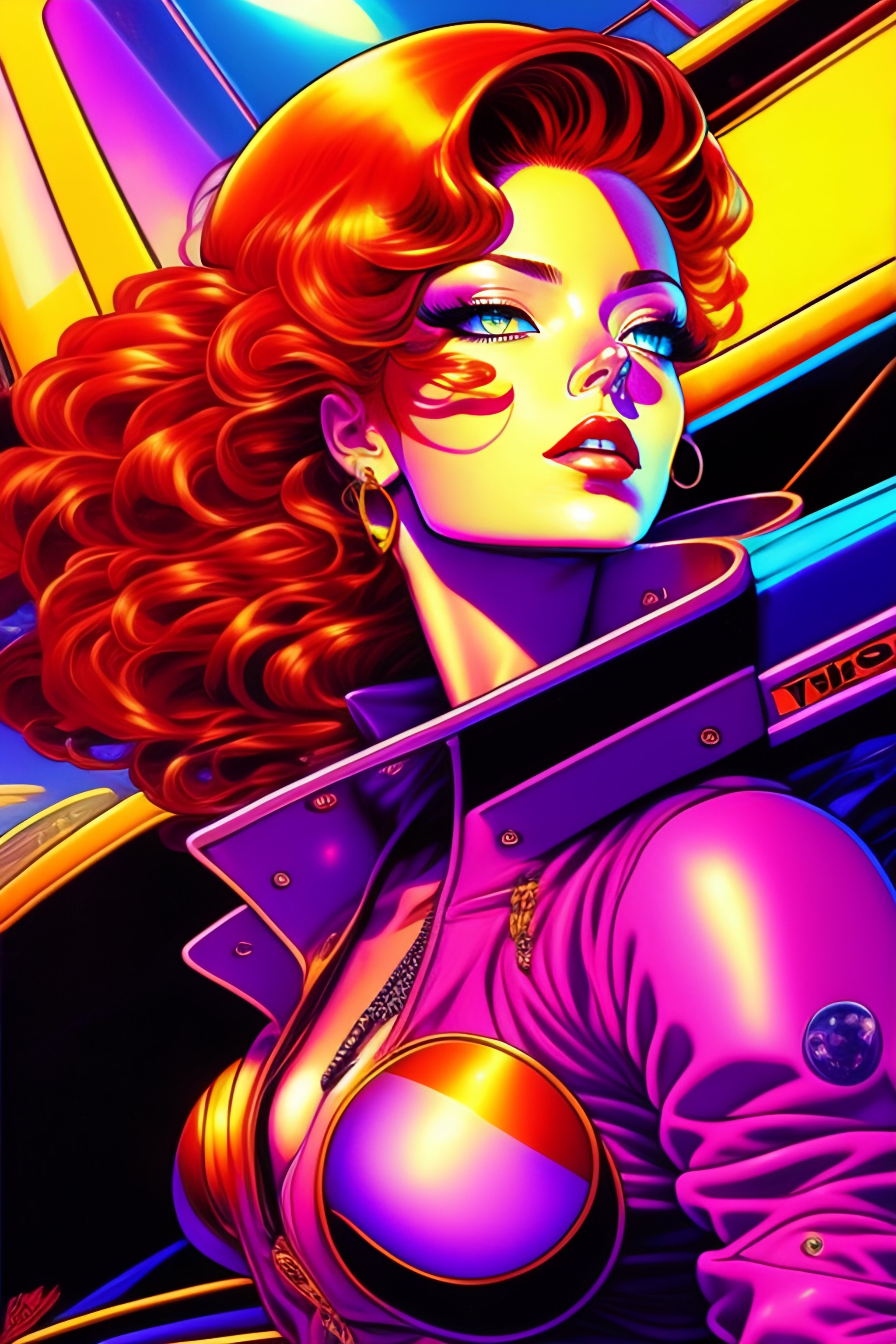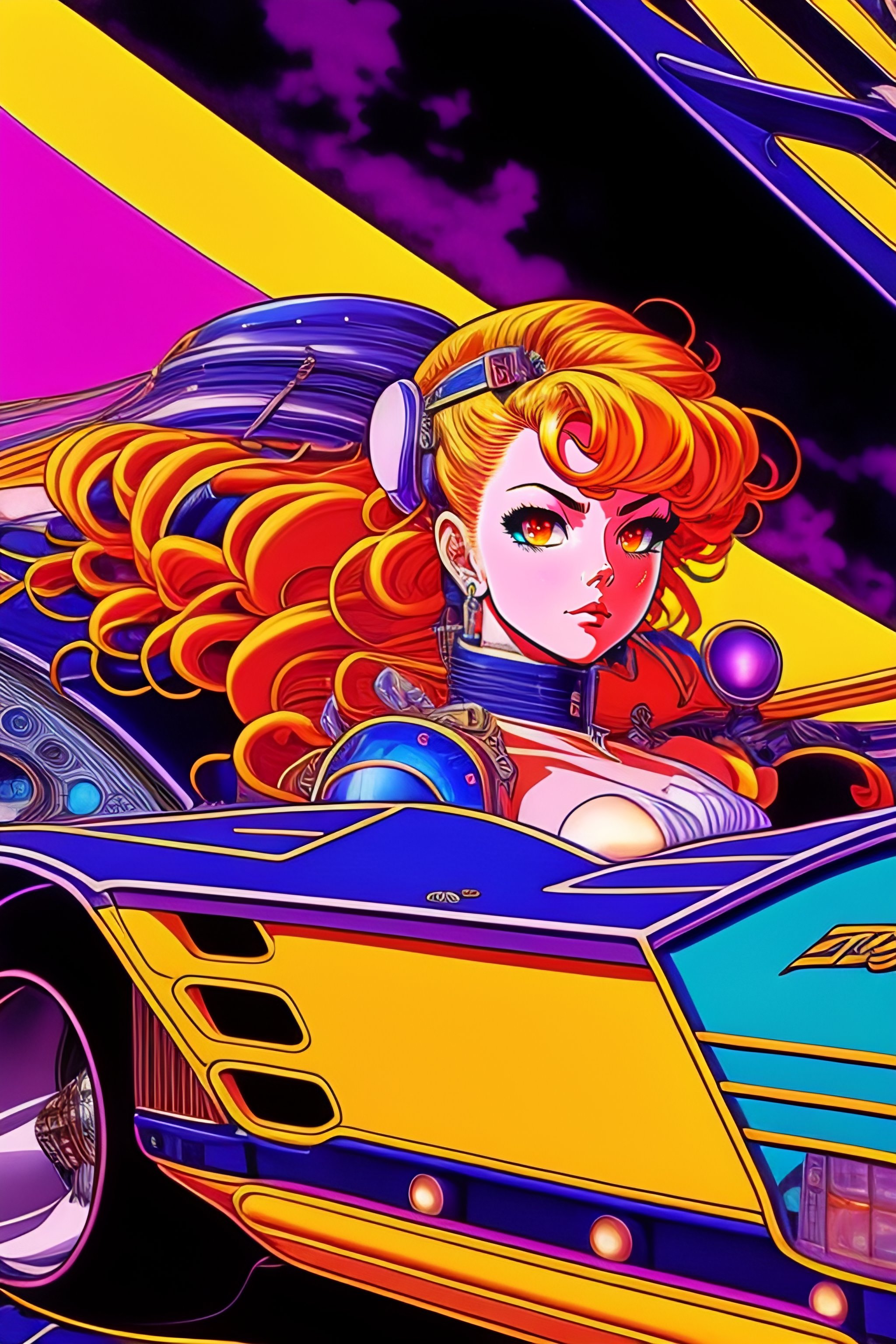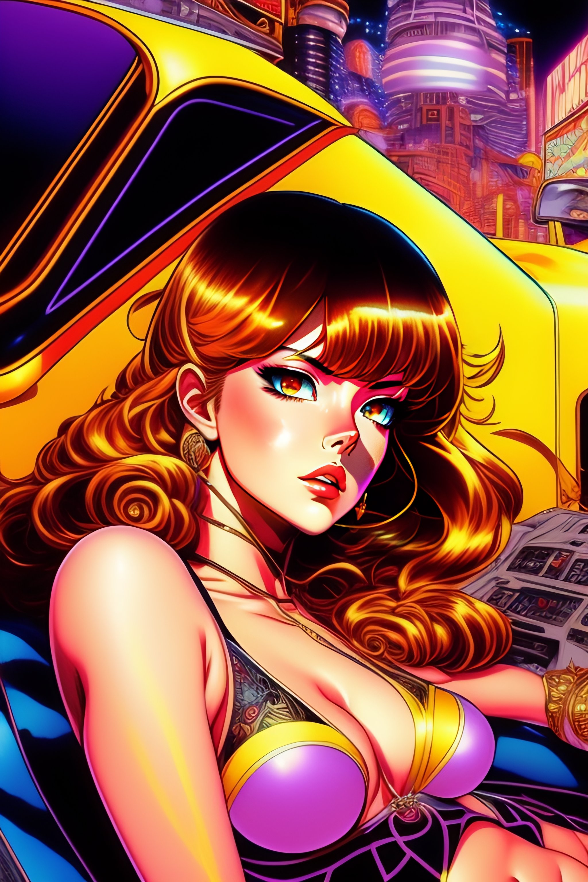Vintage 90's anime style. cluttered truck interior; emma stone as a pilot; by hajime sorayama, greg tocchini, virgil finlay, sci-fi, colors, neon lights. line art, sitting on a couch.