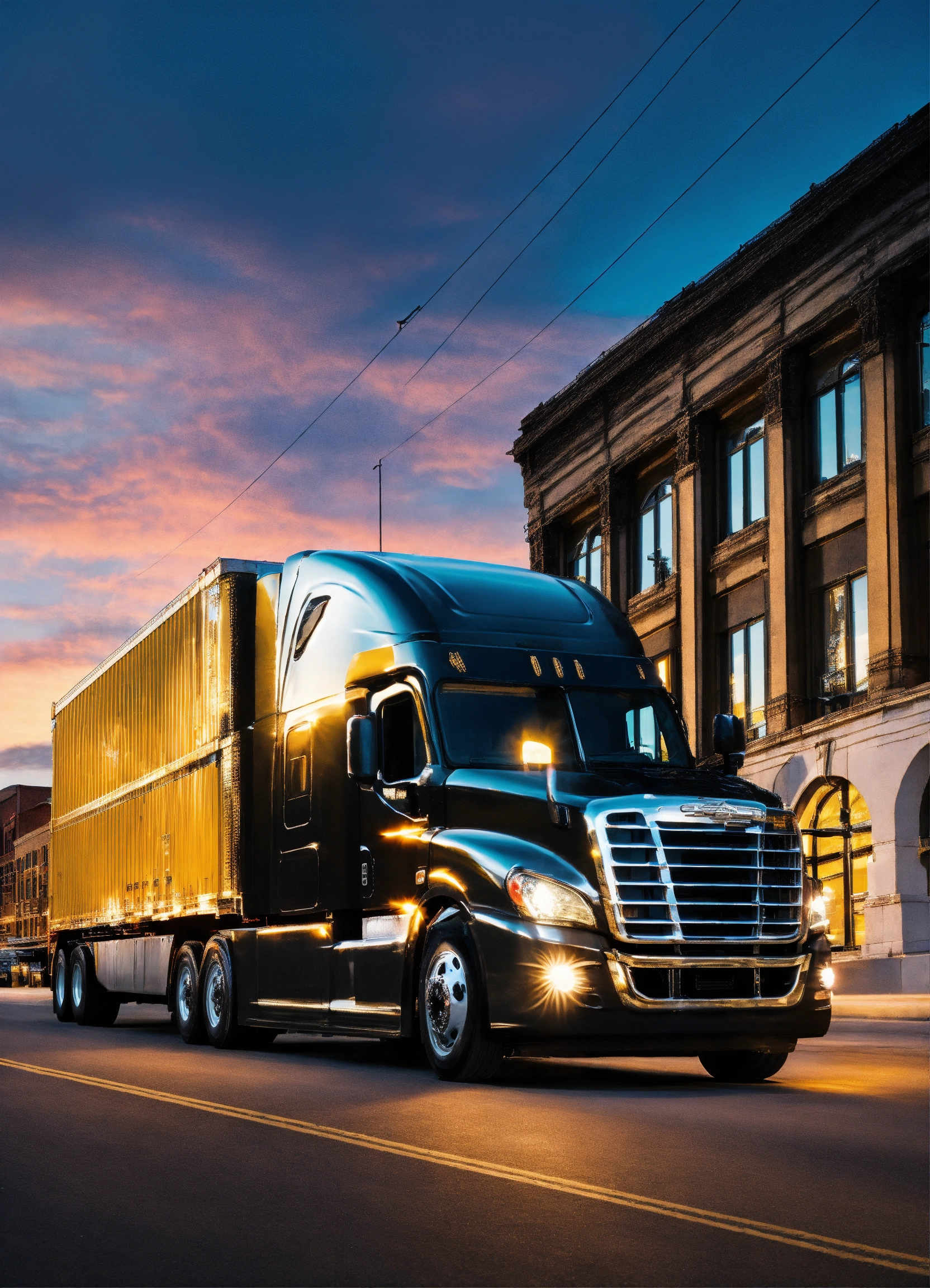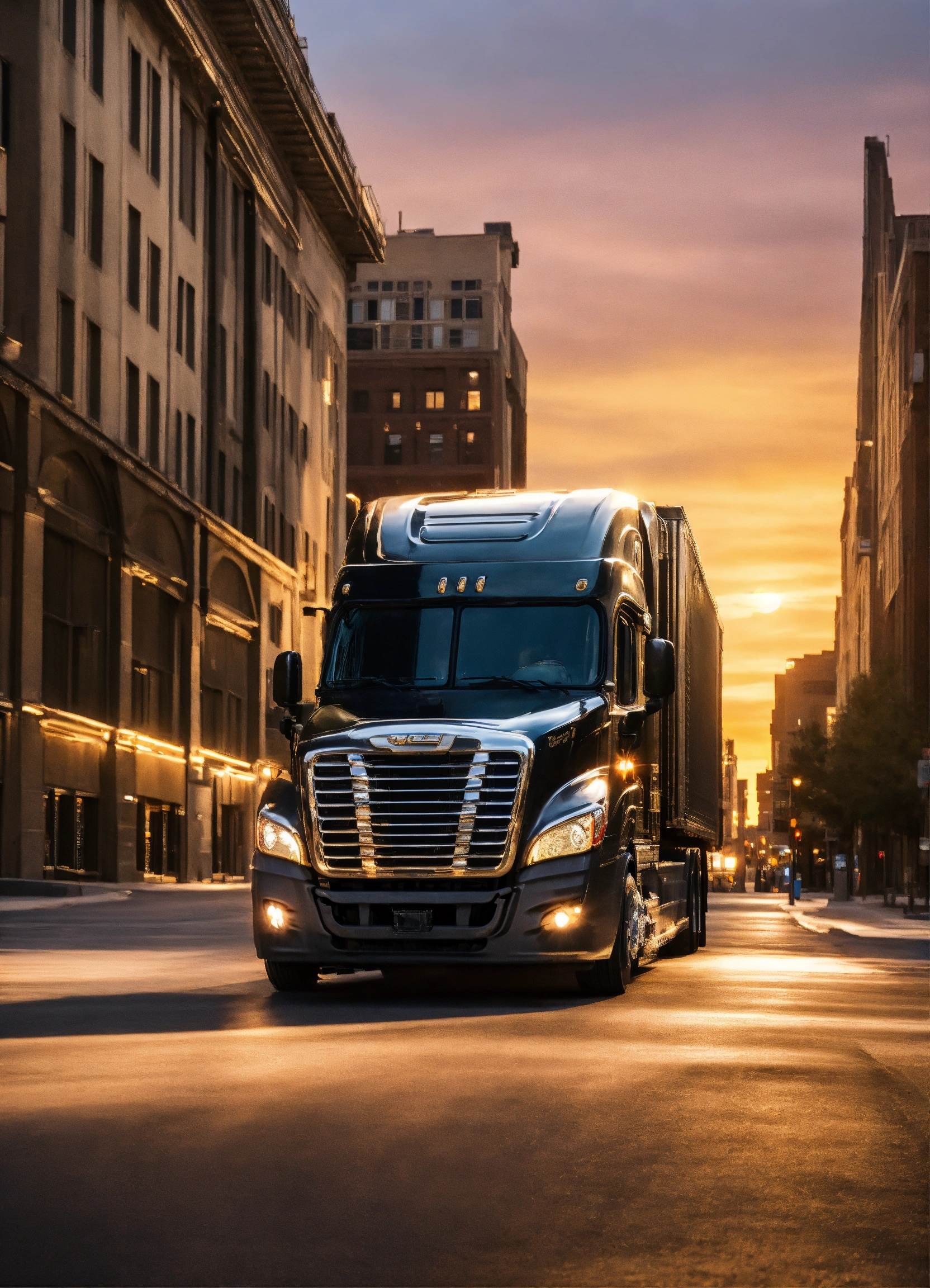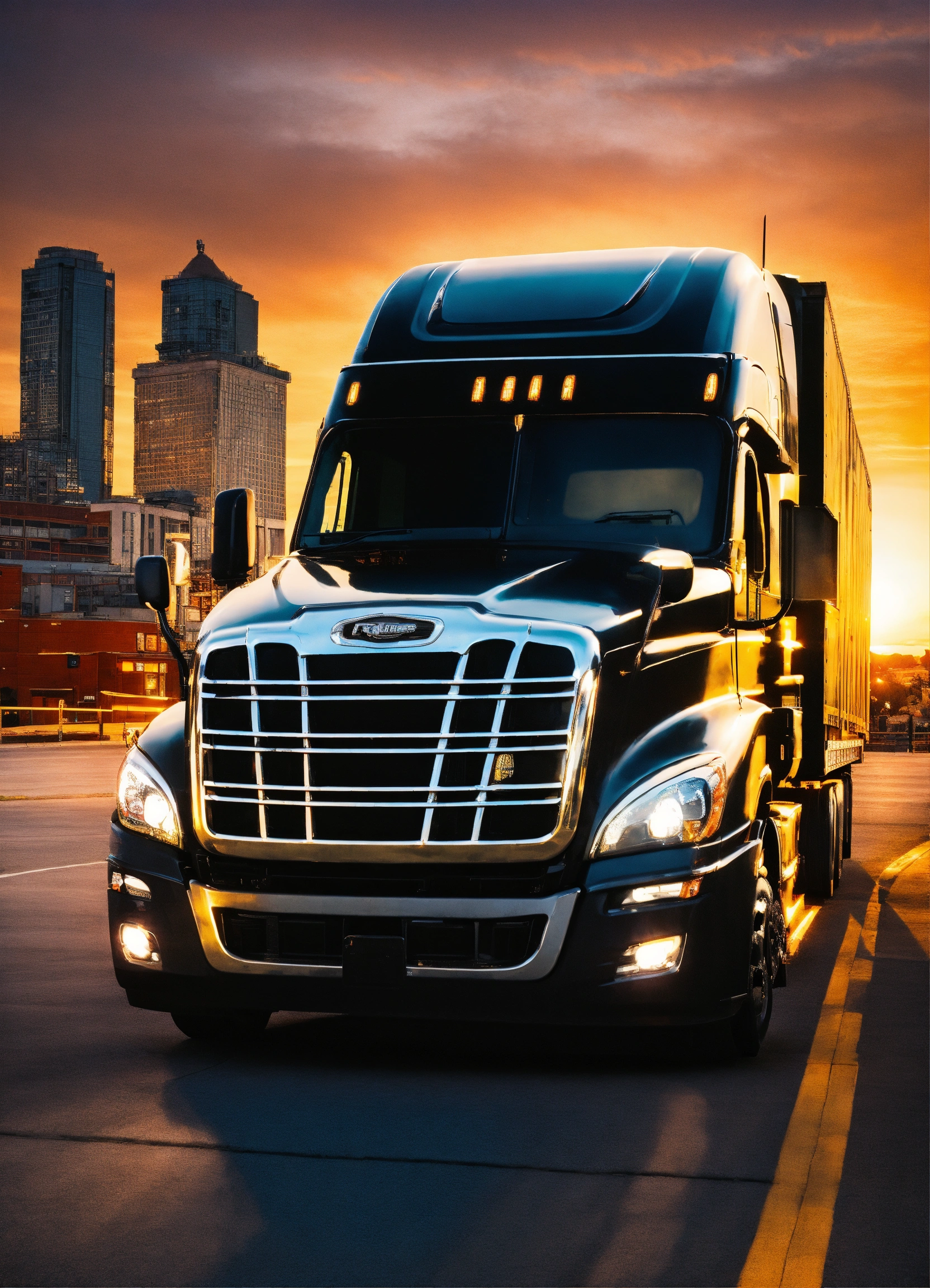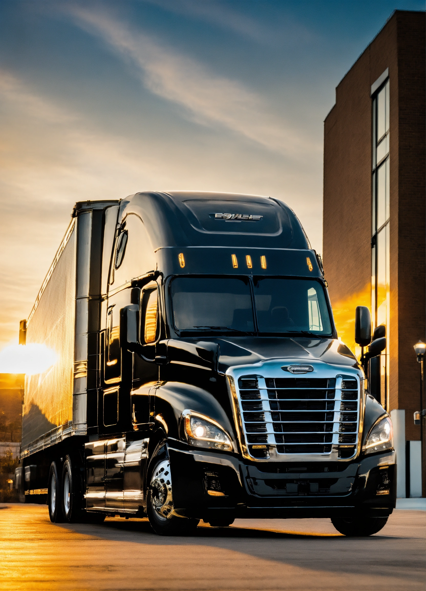 2023 freightliner cascadia black with gold trim downtown background with sunset landscape