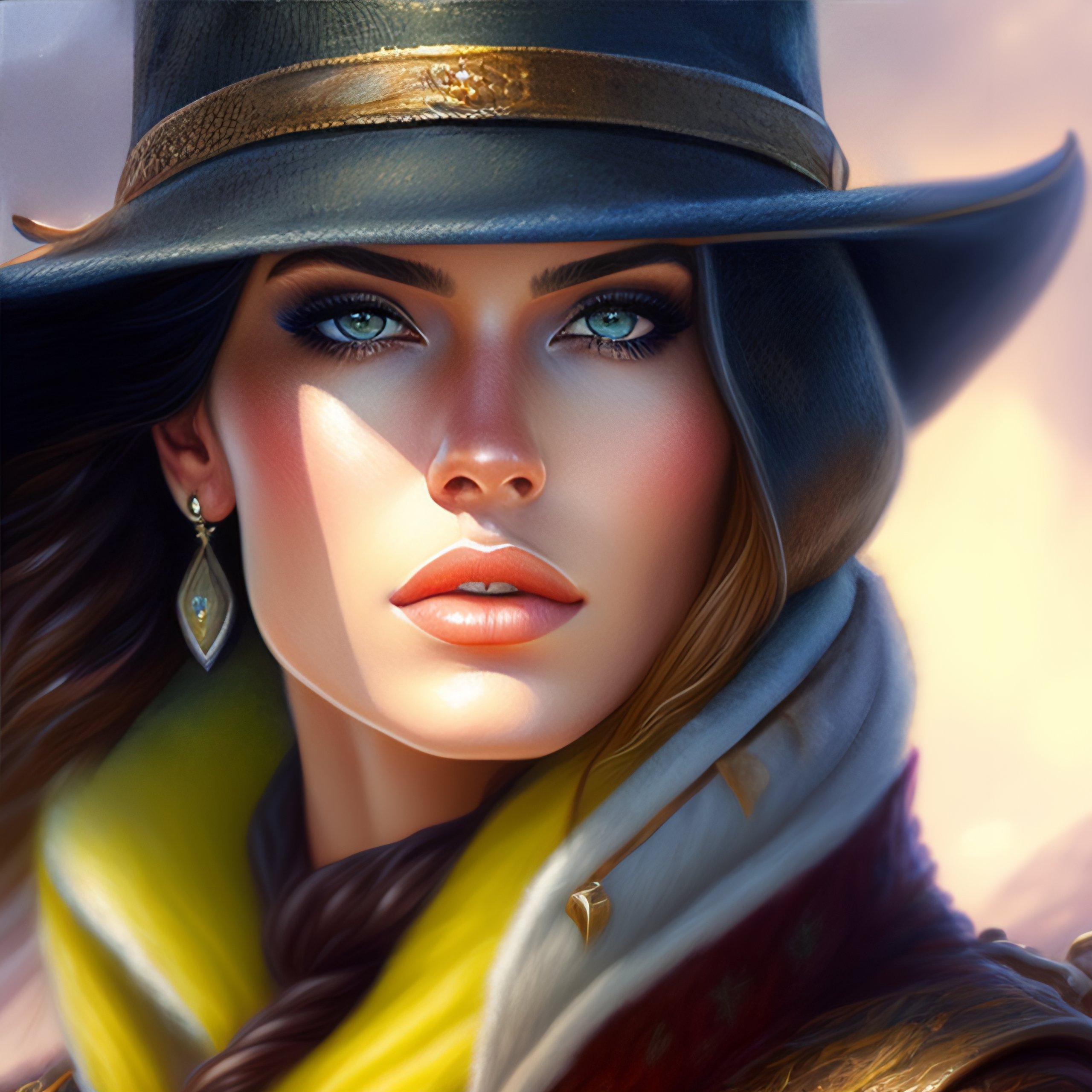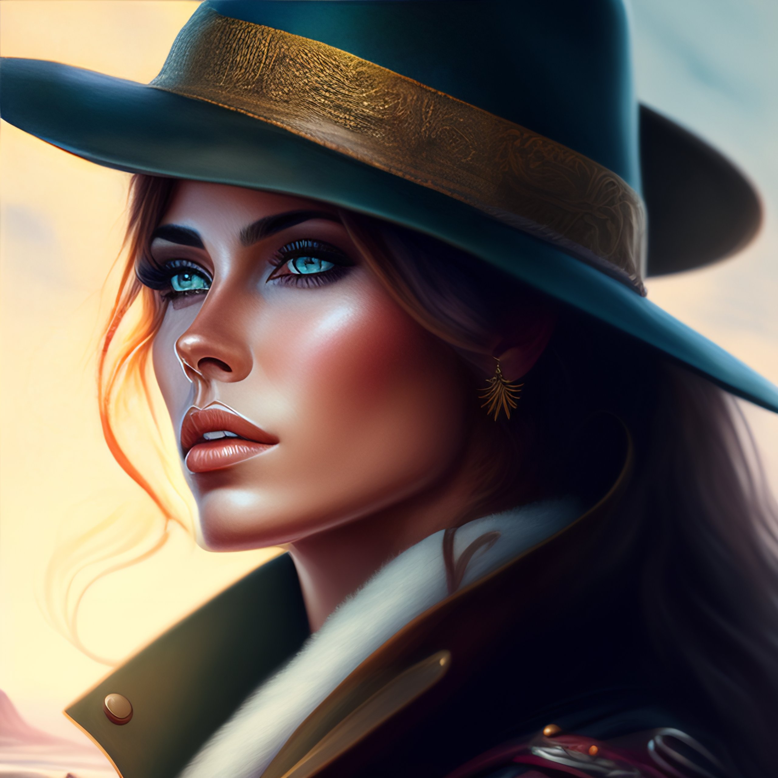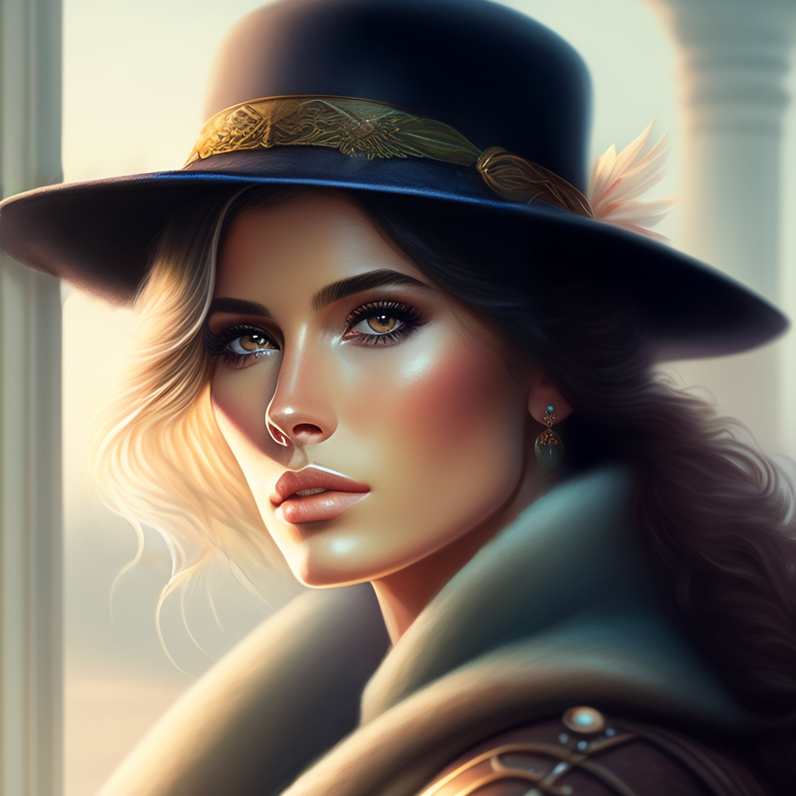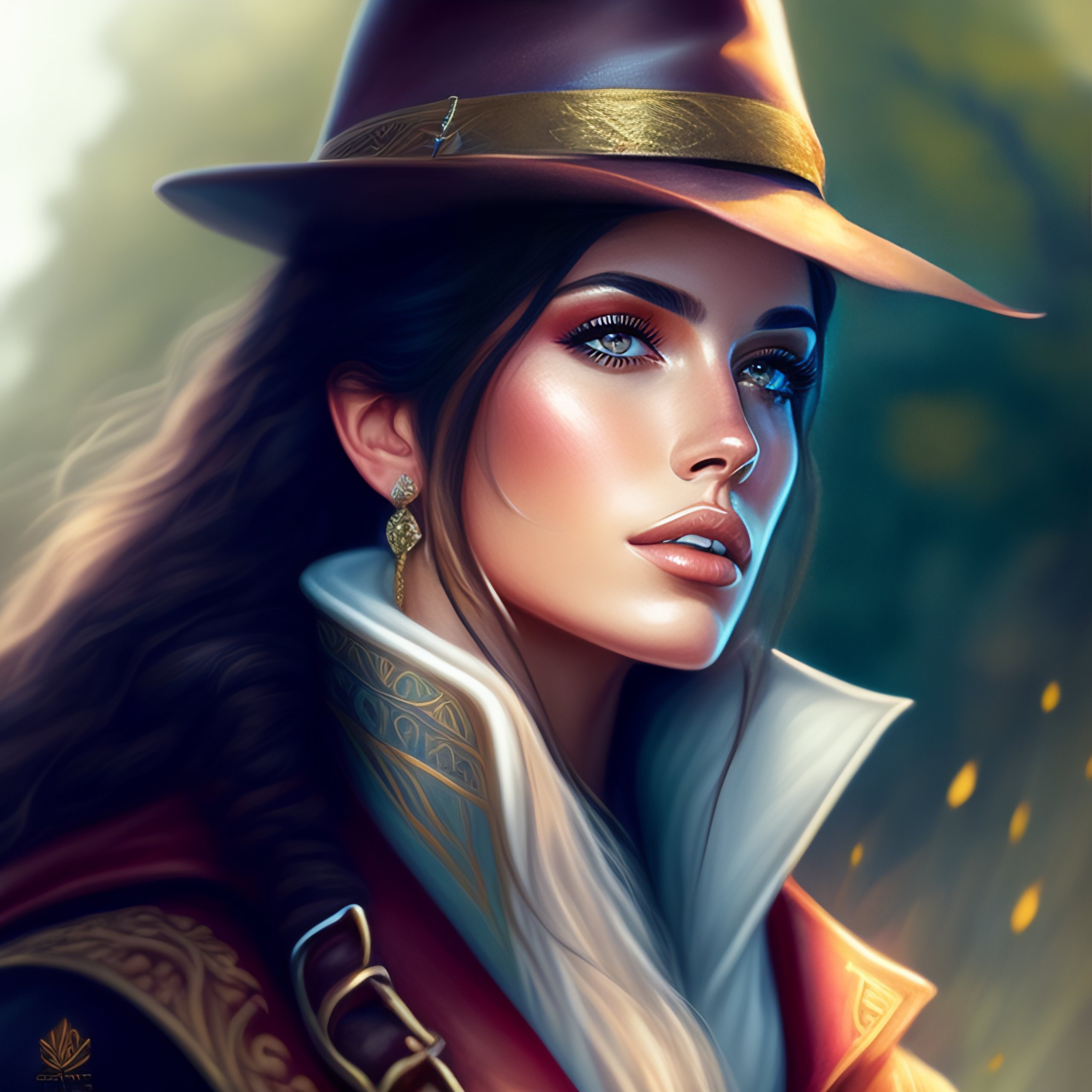 Detailed illustration, pastel sketch, female adventurer, hispanic, fantasy, long coat, hat, focus intense eyes